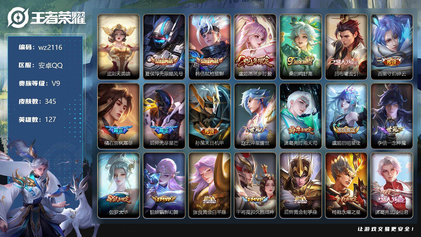 【游戏多多】 【可二次实名】【wz2116】安卓Q-V9-尊贵铂金IV段位-127英雄-345皮肤-2典藏-0珍品无双-0无双-0珍品传说-24传说-98史诗 【英雄全皮】:橘右京全皮,钟馗全皮 【荣耀典藏】:武则天英雄,夏侯惇无限飓风号,韩信弑枪猎影 【传说皮肤】:虞姬愿照岁时盈,桑启鸣野蒿,吕布曦玄引,百里守约碎云,橘右京枫霜尽,后羿无尽星芒,孙策末日机甲,赵云淬星耀世,诸葛亮时雨天司,虞姬启明星使,李信一念神魔,伽罗太华,貂蝉猫影幻舞,张良黄金白羊座,干将莫邪久胜战神,后羿黄金射手座,杨戬永曜之星,诸葛亮武陵仙君,孙尚香末日机甲,宫本武藏地狱之眼,孙悟空地狱火,吕布天魔缭乱,武则天海洋之心,狄仁杰超时空战士 【限定皮肤】:白起狰,大乔绒语心约,虞姬夏日便利店,狄仁杰阴阳师,赵云皇家上将,赵云引擎之心,墨子神迹守卫,妲己时之奇旅,嬴政白昼王子,孙尚香蔷薇恋人,鲁班七号狮舞东方,庄周高山流水,高渐离玩趣恶龙,阿轲迷踪丽影,钟无艳超时空战士,扁鹊奇幻香踪,白起夜都怪侠,芈月重明,芈月幻夜卜梦,吕布天魔缭乱,吕布猎兽之王,周瑜赤莲之焰,元歌云间偶戏,元歌无心,夏侯惇朔风刀,夏侯惇匿光决锋者,甄姬游园惊梦,甄姬落雪兰心,曹操烛龙,典韦穷奇,典韦蓝屏警告,马可波罗逐梦之星,马可波罗暗影游猎,马可波罗山海玄木吟,狄仁杰魔术师,狄仁杰万华元夜,达摩星际陆战队,达摩沙漠行僧,项羽海滩派对,老夫子醍醐杖,老夫子航海奇遇记,关羽冰锋战神,程咬金演武夺筹,刘邦夺宝奇兵,韩信飞衡,王昭君午后时光,兰陵王驯魔猎人,兰陵王金庭之子,橘右京枫霜尽,亚瑟潮玩骑士王,孙悟空孙行者,牛魔御旌,后羿圣弓游侠,后羿无尽星芒,李元芳银河之约,李元芳云中旅人,虞姬启明星使,钟馗神迹守卫,钟馗驱傩正仪,杨玉环遇见飞天,杨戬永曜之星,杨戬潮玩骑兵,女娲朔望之晖,干将莫邪冰霜恋舞曲,干将莫邪胡桃夹子,干将莫邪真爱魔法,雅典娜单词大作战,雅典娜黎明之约,蔡文姬繁星吟游,太乙真人饕餮,鬼谷子原初探秘者,鬼谷子五谷丰年,诸葛亮武陵仙君,诸葛亮时雨天司,黄忠火炮绅士,铠青龙志,苏烈千军破阵,百里玄策原初追逐者,百里守约朱雀志,弈星混沌棋,梦奇顽趣,沈梦溪星空之诺,沈梦溪大漠名商,明世隐疑决卦,明世隐吟游魔法,裴擒虎李小龙,裴擒虎擒涛扼浪,狂铁御狮,狂铁电玩高手,米莱狄御霄,米莱狄胡桃异想国,云中君纤云弄巧,伽罗太华,盾山御銮,猪八戒西部大镖客,上官婉儿梁祝,嫦娥拒霜思,嫦娥暖冬兔眠,西施玲珑珍味,蒙犽狂想玩偶喵,鲁班大师探海日志,桑启海盐诗旅,暃星界游侠,戈娅驭风魔法,张良古海寻踪,蒙犽百解令,高渐离燃音魔法,妲己灵卜魔法,鬼谷子天穹祈灯,伽罗琥珀纪元,吕布曦玄引,沈梦溪龙舞盛年,刘邦剑破天穹,程咬金群星魔术团,刘备异域游侠,周瑜熔金海岸 【年限皮肤】:百里守约朱雀志,铠青龙志,杨戬永曜之星,诸葛亮时雨天司,伽罗太华,韩信飞衡,马可波罗山海玄木吟 【赛季限定】:白起狰,芈月重明,夏侯惇朔风刀,曹操烛龙,典韦穷奇,狄仁杰万华元夜,达摩沙漠行僧,老夫子醍醐杖,程咬金演武夺筹,兰陵王金庭之子,张良古海寻踪,牛魔御旌,李元芳云中旅人,钟馗驱傩正仪,雅典娜黎明之约,太乙真人饕餮,鬼谷子原初探秘者,苏烈千军破阵,百里玄策原初追逐者,弈星混沌棋,梦奇顽趣,沈梦溪大漠名商,明世隐疑决卦,裴擒虎擒涛扼浪,狂铁御狮,米莱狄御霄,盾山御銮,鲁班大师探海日志,桑启海盐诗旅,鬼谷子天穹祈灯,刘邦剑破天穹 【战令限定】:墨子神迹守卫,虞姬夏日便利店,嬴政白昼王子,鲁班七号狮舞东方,阿轲迷踪丽影,钟无艳超时空战士,扁鹊奇幻香踪,白起夜都怪侠,芈月幻夜卜梦,吕布猎兽之王,周瑜赤莲之焰,元歌云间偶戏,甄姬落雪兰心,典韦蓝屏警告,马可波罗暗影游猎,达摩星际陆战队,老夫子航海奇遇记,刘邦夺宝奇兵,王昭君午后时光,兰陵王驯魔猎人,亚瑟潮玩骑士王,后羿圣弓游侠,李元芳银河之约,钟馗神迹守卫,杨戬潮玩骑兵,女娲朔望之晖,干将莫邪真爱魔法,雅典娜单词大作战,黄忠火炮绅士,沈梦溪星空之诺,明世隐吟游魔法,狂铁电玩高手,米莱狄胡桃异想国,猪八戒西部大镖客,嫦娥暖冬兔眠,西施玲珑珍味,蒙犽狂想玩偶喵,暃星界游侠,戈娅驭风魔法,高渐离燃音魔法,妲己灵卜魔法 【史诗皮肤】:鲁班七号电玩小子,项羽苍穹之光,露娜紫霞仙子,阿轲暗夜猫娘,赵云皇家上将,赵云未来纪元,貂蝉圣诞恋歌,甄姬冰雪圆舞曲,王昭君偶像歌手,狄仁杰魔术师,廉颇地狱岩魂,宫本武藏鬼剑武藏,孙尚香蔷薇恋人,孙尚香水果甜心,嬴政暗夜贵公子,嬴政摇滚巨星,妲己魅力维加斯,妲己女仆咖啡,墨子龙骑士,墨子金属风暴,吕布圣诞狂欢,曹操幽灵船长,李白千年之狐,吕布末日机甲,张飞乱世虎臣,关羽冰锋战神,赵云引擎之心,花木兰水晶猎龙者,刘邦德古拉伯爵,夏侯惇乘风破浪,小乔缤纷独角兽,兰陵王暗隐猎兽者,诸葛亮黄金分割