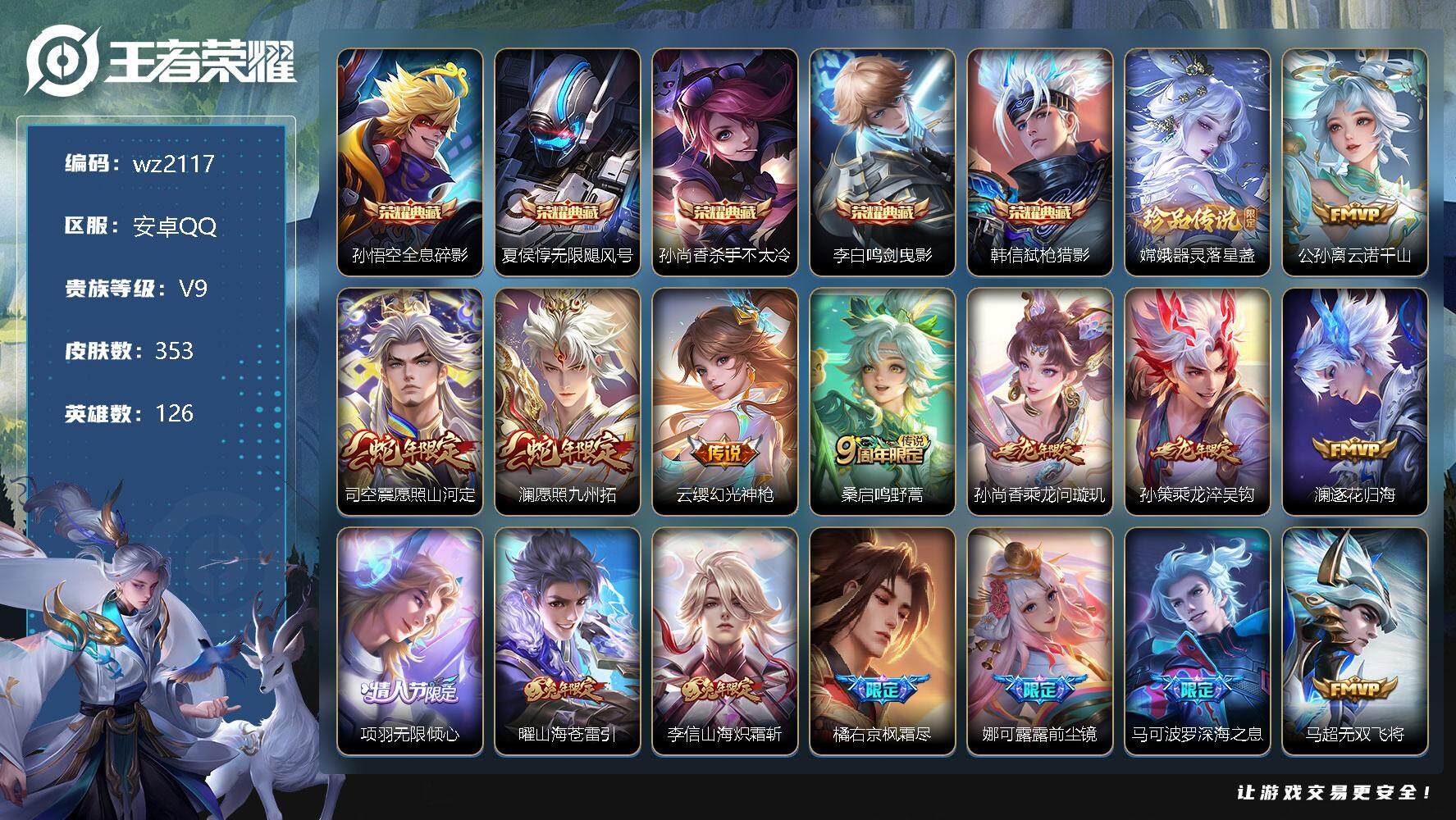 【游戏多多】 【可二次实名】【wz2117】安卓Q-V9-永恒钻石II段位-126英雄-353皮肤-5典藏-0珍品无双-0无双-1珍品传说-38传说-100史诗 【英雄全皮】:达摩全皮,娜可露露全皮,橘右京全皮,鬼谷子全皮,李信全皮,蒙恬全皮,司空震全皮,赵怀真全皮,空空儿全皮,影全皮 【荣耀典藏】:孙悟空全息碎影,夏侯惇无限飓风号,孙尚香杀手不太冷,李白鸣剑曳影,韩信弑枪猎影 【珍品传说】:嫦娥器灵落星盏 【传说皮肤】:公孙离云诺千山,司空震愿照山河定,澜愿照九州拓,云缨幻光神枪,桑启鸣野蒿,孙尚香乘龙问璇玑,孙策乘龙淬吴钩,澜逐花归海,项羽无限倾心,曜山海苍雷引,李信山海炽霜斩,橘右京枫霜尽,娜可露露前尘镜,马可波罗深海之息,马超无双飞将,孙策挚爱之约,孙策末日机甲,曜李逍遥 ,周瑜音你心动,小乔音你心动,公孙离祈雪灵祝,诸葛亮时雨天司,铠绛天战甲,镜炽阳神光,虞姬启明星使,孙悟空零号赤焰,李信一念神魔,刘备时之恋人,干将莫邪久胜战神,达摩黄金狮子座,花木兰冠军飞将,梦奇胖达荣荣,后羿黄金射手座,貂蝉仲夏夜之梦,孙尚香末日机甲,宫本武藏地狱之眼,孙悟空地狱火,狄仁杰超时空战士 【限定皮肤】:姜子牙天穹之誓,狄仁杰阴阳师,赵云皇家上将,赵云百木心枪,墨子神迹守卫,鲁班七号乒乒小将,高渐离玩趣恶龙,阿轲迷踪丽影,钟无艳超时空战士,吕布御风骁将,元歌云间偶戏,元歌无心,甄姬落雪兰心,马可波罗深海之息,狄仁杰魔术师,狄仁杰万华元夜,达摩星际陆战队,达摩沙漠行僧,项羽海滩派对,项羽无限倾心,老夫子醍醐杖,老夫子航海奇遇记,关羽冰锋战神,程咬金演武夺筹,韩信逐梦之影,王昭君午后时光,兰陵王金庭之子,娜可露露前尘镜,橘右京枫霜尽,亚瑟潮玩骑士王,孙悟空大圣娶亲,孙悟空零号赤焰,李元芳云中旅人,虞姬启明星使,钟馗驱傩正仪,雅典娜单词大作战,鬼谷子原初探秘者,鬼谷子五谷丰年,诸葛亮时雨天司,铠青龙志,苏烈千军破阵,百里玄策原初追逐者,弈星混沌棋,梦奇顽趣,公孙离蜜橘之夏,公孙离祈雪灵祝,沈梦溪星空之诺,沈梦溪大漠名商,明世隐疑决卦,裴擒虎天狼狩猎者,裴擒虎李小龙,裴擒虎擒涛扼浪,狂铁电玩高手,米莱狄胡桃异想国,云中君纤云弄巧,李信山海炽霜斩,伽罗天狼溯光者,孙策挚爱之约,上官婉儿梁祝,嫦娥拒霜思,曜李逍遥 ,曜山海苍雷引,西施玲珑珍味,蒙犽狂想玩偶喵,鲁班大师探海日志,桑启海盐诗旅,戈娅驭风魔法,艾琳女武神,艾琳流音漫舞,赵怀真鹤归松栖,司空震地狱燃心,阿古朵江河有灵,张良古海寻踪,蒙犽百解令,蒙恬荣光圣徽,高渐离燃音魔法,妲己灵卜魔法,鬼谷子天穹祈灯,姬小满妄想食味,孙尚香乘龙问璇玑,孙策乘龙淬吴钩,沈梦溪龙舞盛年,刘邦剑破天穹,程咬金群星魔术团,镜青焰无极,项羽苍威无极,周瑜熔金海岸 【年限皮肤】:铠青龙志,公孙离祈雪灵祝,吕布御风骁将,诸葛亮时雨天司,李信山海炽霜斩,曜山海苍雷引,孙尚香乘龙问璇玑,孙策乘龙淬吴钩 【赛季限定】:狄仁杰万华元夜,达摩沙漠行僧,老夫子醍醐杖,程咬金演武夺筹,兰陵王金庭之子,张良古海寻踪,李元芳云中旅人,钟馗驱傩正仪,鬼谷子原初探秘者,苏烈千军破阵,百里玄策原初追逐者,弈星混沌棋,梦奇顽趣,沈梦溪大漠名商,明世隐疑决卦,裴擒虎擒涛扼浪,鲁班大师探海日志,桑启海盐诗旅,鬼谷子天穹祈灯,蒙恬荣光圣徽,刘邦剑破天穹,姜子牙天穹之誓 【战令限定】:墨子神迹守卫,阿轲迷踪丽影,钟无艳超时空战士,元歌云间偶戏,甄姬落雪兰心,达摩星际陆战队,老夫子航海奇遇记,王昭君午后时光,艾琳流音漫舞,亚瑟潮玩骑士王,雅典娜单词大作战,沈梦溪星空之诺,狂铁电玩高手,米莱狄胡桃异想国,西施玲珑珍味,蒙犽狂想玩偶喵,司空震地狱燃心,戈娅驭风魔法,高渐离燃音魔法,妲己灵卜魔法,镜青焰无极,项羽苍威无极 【史诗皮肤】:鲁班七号电玩小子,项羽苍穹之光,露娜紫霞仙子,阿轲暗夜猫娘,赵云皇家上将,赵云未来纪元,貂蝉圣诞恋歌,甄姬冰雪圆舞曲,王昭君偶像歌手,狄仁杰魔术师,廉颇地狱岩魂,宫本武藏鬼剑武藏,孙尚香水果甜心,嬴政暗夜贵公子,嬴政摇滚巨星,妲己魅力维加斯,妲己女仆咖啡,墨子龙骑士,墨子金属风暴,吕布圣诞狂欢,刘禅绅士熊喵,曹操幽灵船长,李白千年之狐,吕布末日机甲,张飞乱世虎臣,关羽冰锋战神,花木兰水晶猎龙者,刘邦德古拉伯爵,韩信逐梦之影,夏侯惇乘风破浪,小乔缤纷独角兽,兰陵王暗隐猎兽者,亚瑟心灵战警,安琪拉心灵骇客,百里守约特工魅影,铠曙光守护者,蔡文姬舞动绿茵,刘禅天才门将,公孙离蜜橘之夏,李元芳逐浪之夏,程咬金功夫厨神,白起星夜王子,阿轲节奏热浪,孙策猫狗日记,铠青龙志,孙悟空大圣娶亲,伽罗箭羽风息,裴擒虎天狼狩猎者,狄仁杰鹰眼统帅,上官婉儿梁祝,娜可露露晚萤,不知火舞魅语,阿轲迷踪丽影,橘右京修罗,蒙犽狂想玩偶喵,百里玄策原初追逐者,裴擒虎李小龙,云中君纤云弄