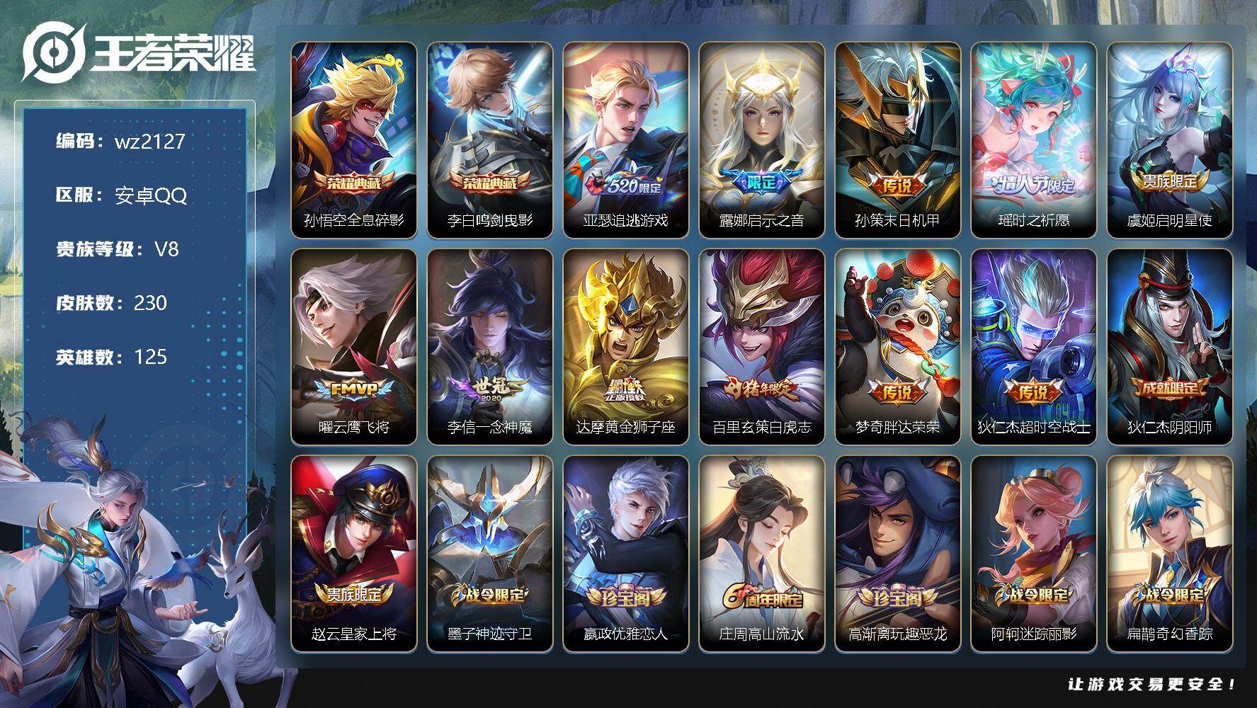 【游戏多多】 【可二次实名】【wz2127】安卓Q-V8-至尊星耀III段位-125英雄-230皮肤-2典藏-0珍品无双-0无双-0珍品传说-11传说-81史诗 【荣耀典藏】:孙悟空全息碎影,李白鸣剑曳影 【传说皮肤】:亚瑟追逃游戏,露娜启示之音,孙策末日机甲,瑶时之祈愿,虞姬启明星使,曜云鹰飞将,李信一念神魔,达摩黄金狮子座,百里玄策白虎志,梦奇胖达荣荣,狄仁杰超时空战士 【限定皮肤】:狄仁杰阴阳师,赵云皇家上将,墨子神迹守卫,嬴政优雅恋人,庄周高山流水,高渐离玩趣恶龙,阿轲迷踪丽影,扁鹊奇幻香踪,白起夜都怪侠,芈月幻夜卜梦,元歌云间偶戏,甄姬女儿国国王,马可波罗暗影游猎,狄仁杰魔术师,狄仁杰万华元夜,达摩星际陆战队,达摩沙漠行僧,项羽海滩派对,老夫子醍醐杖,老夫子航海奇遇记,关羽冰锋战神,程咬金演武夺筹,露娜一生所爱,露娜启示之音,刘邦夺宝奇兵,王昭君午后时光,兰陵王金庭之子,花木兰青春决赛季,亚瑟潮玩骑士王,亚瑟追逃游戏,孙悟空孙行者,后羿圣弓游侠,李元芳云中旅人,虞姬启明星使,钟馗驱傩正仪,杨戬潮玩骑兵,干将莫邪真爱魔法,雅典娜单词大作战,雅典娜黎明之约,蔡文姬繁星吟游,鬼谷子原初探秘者,黄忠火炮绅士,苏烈千军破阵,百里玄策白虎志,百里玄策原初追逐者,弈星混沌棋,梦奇顽趣,沈梦溪大漠名商,明世隐疑决卦,明世隐吟游魔法,裴擒虎李小龙,裴擒虎擒涛扼浪,狂铁电玩高手,米莱狄胡桃异想国,瑶时之祈愿,云中君纤云弄巧,云中君时之祈愿,猪八戒西部大镖客,猪八戒猪悟能,嫦娥拒霜思,蒙犽狂想玩偶喵,鲁班大师探海日志,桑启海盐诗旅,蒙恬荣光圣徽,鬼谷子天穹祈灯,鲁班七号蔬乡物语,李元芳蔬乡物语,刘邦剑破天穹 【年限皮肤】:百里玄策白虎志,马超神威 【赛季限定】:狄仁杰万华元夜,达摩沙漠行僧,老夫子醍醐杖,程咬金演武夺筹,兰陵王金庭之子,李元芳云中旅人,钟馗驱傩正仪,雅典娜黎明之约,鬼谷子原初探秘者,苏烈千军破阵,百里玄策原初追逐者,弈星混沌棋,梦奇顽趣,沈梦溪大漠名商,明世隐疑决卦,裴擒虎擒涛扼浪,鲁班大师探海日志,桑启海盐诗旅,鬼谷子天穹祈灯,蒙恬荣光圣徽,刘邦剑破天穹 【战令限定】:墨子神迹守卫,阿轲迷踪丽影,扁鹊奇幻香踪,白起夜都怪侠,芈月幻夜卜梦,元歌云间偶戏,马可波罗暗影游猎,达摩星际陆战队,老夫子航海奇遇记,刘邦夺宝奇兵,王昭君午后时光,亚瑟潮玩骑士王,后羿圣弓游侠,杨戬潮玩骑兵,干将莫邪真爱魔法,雅典娜单词大作战,黄忠火炮绅士,明世隐吟游魔法,狂铁电玩高手,米莱狄胡桃异想国,猪八戒西部大镖客,蒙犽狂想玩偶喵,鲁班七号蔬乡物语,李元芳蔬乡物语 【史诗皮肤】:鲁班七号电玩小子,项羽苍穹之光,露娜紫霞仙子,阿轲暗夜猫娘,赵云皇家上将,赵云未来纪元,貂蝉圣诞恋歌,甄姬冰雪圆舞曲,王昭君偶像歌手,狄仁杰魔术师,廉颇地狱岩魂,宫本武藏鬼剑武藏,孙尚香水果甜心,嬴政优雅恋人,嬴政暗夜贵公子,妲己魅力维加斯,妲己女仆咖啡,墨子龙骑士,墨子金属风暴,吕布圣诞狂欢,刘禅绅士熊喵,曹操幽灵船长,吕布末日机甲,张飞乱世虎臣,韩信白龙吟,关羽冰锋战神,花木兰水晶猎龙者,夏侯惇乘风破浪,兰陵王暗隐猎兽者,诸葛亮黄金分割率,亚瑟心灵战警,雅典娜冰冠公主,花木兰青春决赛季,百里守约特工魅影,刘禅天才门将,李元芳逐浪之夏,白起星夜王子,阿轲节奏热浪,孙策猫狗日记,大乔猫狗日记,露娜一生所爱,狄仁杰鹰眼统帅,蔡文姬繁星吟游,娜可露露晚萤,不知火舞魅语,阿轲迷踪丽影,橘右京修罗,马超神威,马可波罗暗影游猎,蒙犽狂想玩偶喵,百里玄策原初追逐者,裴擒虎李小龙,云中君纤云弄巧,元歌云间偶戏,米莱狄胡桃异想国,百里玄策热力回旋,老夫子航海奇遇记,干将莫邪真爱魔法,钟馗乐园奇幻夜,孙悟空孙行者,猪八戒猪悟能,庄周高山流水,嫦娥拒霜思,黄忠火炮绅士,雅典娜黎明之约,甄姬女儿国国王,云中君时之祈愿,夏洛特永昼,澜赏金猎手,明世隐吟游魔法,狂铁电玩高手,梦奇顽趣,扁鹊奇幻香踪,刘禅电玩爆裂旋风,蒙恬荣光圣徽,鲁班七号蔬乡物语,牛魔星界战将,狂铁龙之律动,黄忠百相守梦,西施织梦人,公孙离涂山容容 【其他皮肤】:项羽海滩派对,韩信教廷特使,韩信街头霸王,露娜哥特玫瑰,阿轲爱心护理,达摩大发明家,赵云忍炎影,白起白色死神,扁鹊化身博士,宫本武藏未来纪元,安琪拉玩偶对对碰,孙膑天使之翼,典韦黄金武士,亚瑟死亡骑士,达摩拳王,花木兰兔女郎,张飞五福同心,甄姬花好人间,刘备万事如意,狄仁杰阴阳师,刘备汉昭烈帝,关羽龙腾万里,墨子进击墨子号,钟无艳海滩丽影,宫本武藏霸王丸,狂铁命运角斗场,老夫子功夫老勺,牛魔制霸全明星,孙尚香沉稳之力,诸葛亮掌控之力,李白敏锐之力,鬼谷子幻乐之宴,苏烈坚韧之力,大乔守护之力,项羽科学大爆炸,明世隐虹云星官,小乔丁香结,吕布野性能量,高渐离玩趣恶龙,沈梦溪鲨炮海盗猫,弈星混沌棋,哪吒
