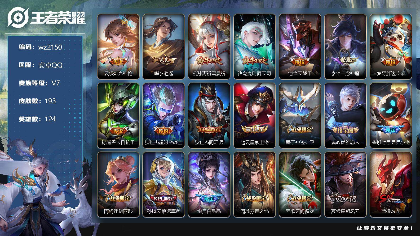 【游戏多多】 【可二次实名】【wz2150】安卓Q-V7-最强王者段位-124英雄-193皮肤-0典藏-0珍品无双-0无双-0珍品传说-9传说-58史诗 【传说皮肤】:云缨幻光神枪,曜李逍遥 ,公孙离祈雪灵祝,诸葛亮时雨天司,铠绛天战甲,李信一念神魔,梦奇胖达荣荣,孙尚香末日机甲,狄仁杰超时空战士 【限定皮肤】:狄仁杰阴阳师,赵云皇家上将,墨子神迹守卫,嬴政优雅恋人,鲁班七号乒乒小将,阿轲迷踪丽影,孙膑天狼运算者,芈月白晶晶,周瑜赤莲之焰,元歌云间偶戏,夏侯惇朔风刀,曹操烛龙,马可波罗逐梦之星,狄仁杰魔术师,狄仁杰万华元夜,达摩星际陆战队,达摩沙漠行僧,项羽海滩派对,老夫子醍醐杖,老夫子航海奇遇记,关羽冰锋战神,程咬金演武夺筹,刘邦夺宝奇兵,韩信傲雪梅枪,兰陵王驯魔猎人,亚瑟潮玩骑士王,牛魔御旌,李元芳银河之约,李元芳云中旅人,虞姬霸王别姬,钟馗驱傩正仪,杨玉环遇见飞天,干将莫邪冰霜恋舞曲,雅典娜单词大作战,蔡文姬奇迹圣诞,东皇太一逐梦之光,鬼谷子原初探秘者,诸葛亮时雨天司,弈星混沌棋,公孙离祈雪灵祝,沈梦溪星空之诺,明世隐疑决卦,裴擒虎李小龙,狂铁御狮,米莱狄御霄,米莱狄胡桃异想国,云中君纤云弄巧,伽罗天狼溯光者,盾山御銮,上官婉儿梁祝,嫦娥暖冬兔眠,曜李逍遥 ,蒙犽狂想玩偶喵,桑启海盐诗旅,暃星界游侠,张良古海寻踪,鬼谷子天穹祈灯,周瑜熔金海岸 【年限皮肤】:公孙离祈雪灵祝,诸葛亮时雨天司,马超神威 【赛季限定】:夏侯惇朔风刀,曹操烛龙,狄仁杰万华元夜,达摩沙漠行僧,老夫子醍醐杖,程咬金演武夺筹,张良古海寻踪,牛魔御旌,李元芳云中旅人,钟馗驱傩正仪,鬼谷子原初探秘者,弈星混沌棋,明世隐疑决卦,狂铁御狮,米莱狄御霄,盾山御銮,桑启海盐诗旅,鬼谷子天穹祈灯 【战令限定】:墨子神迹守卫,阿轲迷踪丽影,周瑜赤莲之焰,元歌云间偶戏,达摩星际陆战队,老夫子航海奇遇记,刘邦夺宝奇兵,兰陵王驯魔猎人,亚瑟潮玩骑士王,李元芳银河之约,雅典娜单词大作战,沈梦溪星空之诺,米莱狄胡桃异想国,嫦娥暖冬兔眠,蒙犽狂想玩偶喵,暃星界游侠 【史诗皮肤】:鲁班七号电玩小子,赵云皇家上将,赵云未来纪元,貂蝉圣诞恋歌,甄姬冰雪圆舞曲,王昭君偶像歌手,狄仁杰魔术师,宫本武藏鬼剑武藏,孙尚香水果甜心,嬴政优雅恋人,嬴政摇滚巨星,妲己魅力维加斯,妲己女仆咖啡,墨子金属风暴,曹操幽灵船长,李白千年之狐,吕布末日机甲,张飞乱世虎臣,韩信白龙吟,虞姬霸王别姬,关羽冰锋战神,花木兰水晶猎龙者,刘邦德古拉伯爵,夏侯惇乘风破浪,小乔缤纷独角兽,马可波罗逐梦之星,亚瑟心灵战警,雅典娜冰冠公主,百里守约特工魅影,李元芳逐浪之夏,程咬金功夫厨神,白起星夜王子,阿轲节奏热浪,杨玉环遇见飞天,东皇太一逐梦之光,蔡文姬奇迹圣诞,孙策猫狗日记,干将莫邪冰霜恋舞曲,伽罗箭羽风息,狄仁杰鹰眼统帅,兰陵王驯魔猎人,上官婉儿梁祝,李元芳银河之约,阿轲迷踪丽影,马超神威,蒙犽狂想玩偶喵,裴擒虎李小龙,云中君纤云弄巧,孙膑天狼运算者,元歌云间偶戏,芈月白晶晶,米莱狄胡桃异想国,老夫子航海奇遇记,伽罗天狼溯光者,鲁班七号乒乒小将,韩信傲雪梅枪,暃星界游侠,黄忠百相守梦 【其他皮肤】:项羽海滩派对,韩信教廷特使,韩信街头霸王,露娜哥特玫瑰,阿轲爱心护理,达摩大发明家,白起白色死神,武则天东方不败,扁鹊化身博士,宫本武藏未来纪元,孙膑天使之翼,姜子牙时尚教父,妲己少女阿狸,典韦黄金武士,亚瑟死亡骑士,达摩拳王,花木兰兔女郎,张飞五福同心,甄姬花好人间,刘备万事如意,宫本武藏万象初新,后羿阿尔法小队,狄仁杰阴阳师,刘备汉昭烈帝,关羽龙腾万里,墨子进击墨子号,钟无艳海滩丽影,宫本武藏霸王丸,曹操烛龙,老夫子功夫老勺,李白敏锐之力,鬼谷子幻乐之宴,狂铁御狮,安琪拉如懿,苏烈坚韧之力,大乔守护之力,米莱狄御霄,明世隐虹云星官,庄周奇妙博物学,牛魔御旌,小乔丁香结,吕布野性能量,盾山御銮,孙膑归虚梦演,沈梦溪鲨炮海盗猫,姜子牙炽热元素使,夏侯惇朔风刀,周瑜赤莲之焰,沈梦溪星空之诺,弈星混沌棋,哪吒次元突破,明世隐疑决卦,刘邦夺宝奇兵,盾山圆桌骑士,老夫子醍醐杖,廉颇无尽征程,鬼谷子原初探秘者,雅典娜单词大作战,狄仁杰万华元夜,亚瑟潮玩骑士王,刘禅秘密基地,杨戬次元傲视,露娜瓷语鉴心,达摩星际陆战队,程咬金演武夺筹,张良缤纷绘卷,盘古重装意志,钟馗驱傩正仪,墨子神迹守卫,鲁班大师乓乓大师,典韦铁甲之心,达摩沙漠行僧,程咬金无双福将,刘邦虎啸剑宗,李元芳云中旅人,桑启海盐诗旅,嫦娥暖冬兔眠,海月幻泉雾影,猪八戒潮玩探月行,牛魔牛运亨通,莱西奥西部游侠,张良古海寻踪,鬼谷子天穹祈灯,廉颇功夫炙烤,周瑜熔金海岸,东皇太一噬灭天穹,苍苍林狼骑,太乙真人谧流熔炉,典韦铁骨偃魂,西施雪境奇遇,姜子牙星梦巡礼,钟馗虚灵犬护,苏烈春野闲踪,张良灵野札记,钟无艳