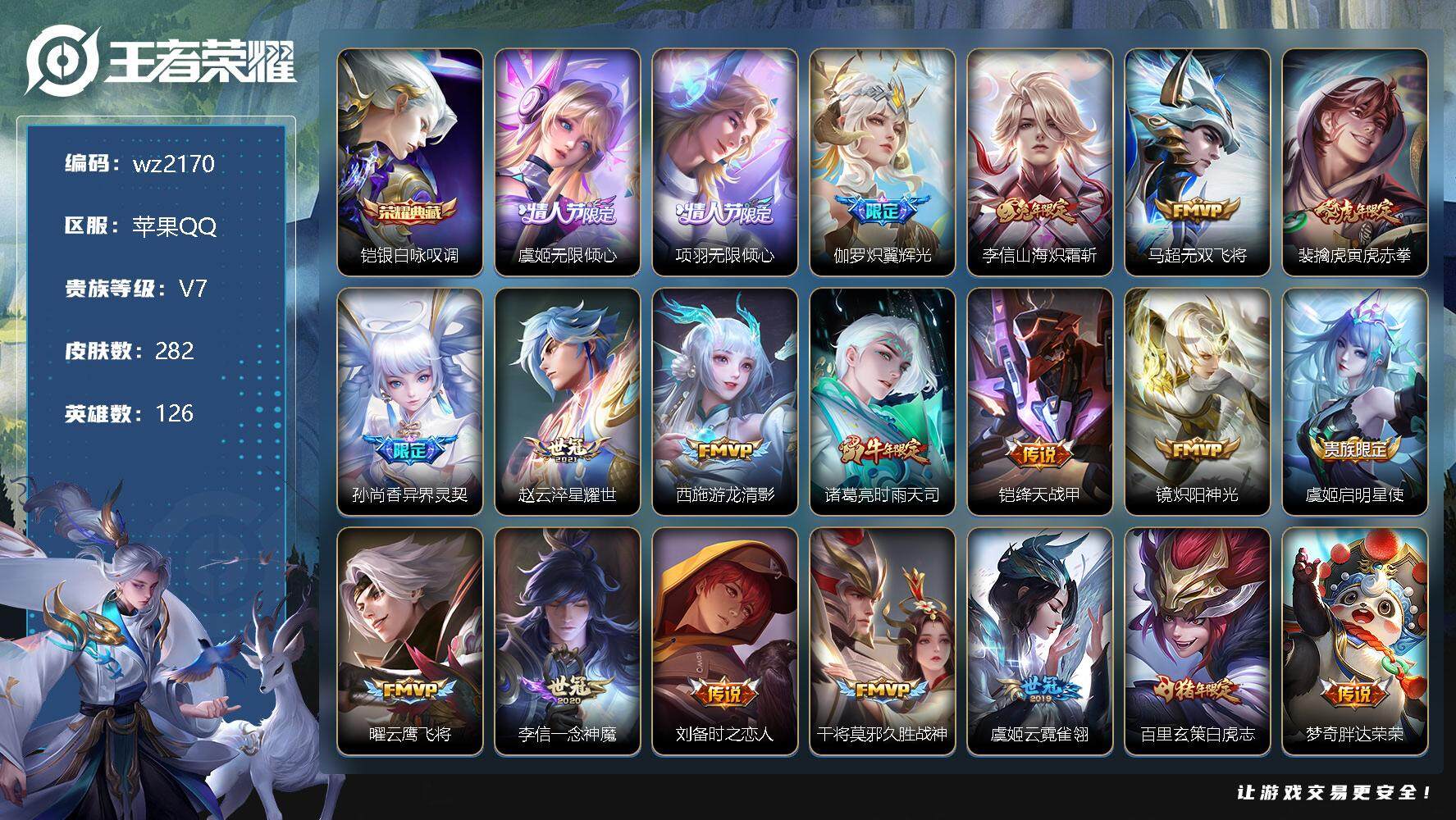 【游戏多多】 【可二次实名】【wz2170】苹果Q-V7-最强王者段位-126英雄-282皮肤-1典藏-0珍品无双-0无双-0珍品传说-27传说-90史诗 【英雄全皮】:鬼谷子全皮,李信全皮 【荣耀典藏】:铠银白咏叹调 【传说皮肤】:虞姬无限倾心,项羽无限倾心,伽罗炽翼辉光,李信山海炽霜斩,马超无双飞将,裴擒虎寅虎赤拳,孙尚香异界灵契,赵云淬星耀世,西施游龙清影,诸葛亮时雨天司,铠绛天战甲,镜炽阳神光,虞姬启明星使,曜云鹰飞将,李信一念神魔,刘备时之恋人,干将莫邪久胜战神,虞姬云霓雀翎,百里玄策白虎志,梦奇胖达荣荣,后羿黄金射手座,貂蝉仲夏夜之梦,李白凤求凰,孙尚香末日机甲,宫本武藏地狱之眼,孙悟空地狱火,狄仁杰超时空战士 【限定皮肤】:白起狰,狄仁杰阴阳师,虞姬凯尔特女王,赵云皇家上将,赵云引擎之心,墨子神迹守卫,嬴政优雅恋人,嬴政白昼王子,孙尚香蔷薇恋人,孙尚香异界灵契,庄周高山流水,高渐离玩趣恶龙,芈月重明,吕布猎兽之王,元歌云间偶戏,元歌无心,夏侯惇朔风刀,甄姬游园惊梦,曹操烛龙,典韦穷奇,典韦蓝屏警告,马可波罗逐梦之星,马可波罗山海玄木吟,狄仁杰魔术师,狄仁杰万华元夜,达摩星际陆战队,达摩沙漠行僧,项羽海滩派对,项羽无限倾心,老夫子醍醐杖,老夫子航海奇遇记,关羽冰锋战神,程咬金演武夺筹,韩信逐梦之影,韩信飞衡,韩信傲雪梅枪,王昭君凤凰于飞,兰陵王金庭之子,花木兰青春决赛季,亚瑟潮玩骑士王,孙悟空至尊宝,孙悟空大圣娶亲,牛魔御旌,后羿圣弓游侠,李元芳云中旅人,虞姬启明星使,虞姬无限倾心,钟馗驱傩正仪,女娲朔望之晖,干将莫邪冰霜恋舞曲,干将莫邪真爱魔法,雅典娜黎明之约,太乙真人饕餮,鬼谷子原初探秘者,鬼谷子五谷丰年,诸葛亮时雨天司,苏烈千军破阵,百里玄策白虎志,百里玄策原初追逐者,百里守约朱雀志,弈星混沌棋,梦奇顽趣,公孙离蜜橘之夏,沈梦溪大漠名商,明世隐疑决卦,裴擒虎李小龙,裴擒虎寅虎赤拳,裴擒虎擒涛扼浪,狂铁御狮,米莱狄御霄,米莱狄胡桃异想国,云中君纤云弄巧,李信山海炽霜斩,伽罗天狼溯光者,伽罗炽翼辉光,盾山御銮,上官婉儿梁祝,嫦娥拒霜思,鲁班大师探海日志,桑启海盐诗旅,张良古海寻踪,蒙恬荣光圣徽,鬼谷子天穹祈灯 【年限皮肤】:百里玄策白虎志,百里守约朱雀志,裴擒虎寅虎赤拳,王昭君凤凰于飞,李白凤求凰,诸葛亮时雨天司,韩信飞衡,马超神威,马可波罗山海玄木吟,李信山海炽霜斩,伽罗炽翼辉光 【赛季限定】:白起狰,芈月重明,夏侯惇朔风刀,曹操烛龙,典韦穷奇,狄仁杰万华元夜,达摩沙漠行僧,老夫子醍醐杖,程咬金演武夺筹,兰陵王金庭之子,张良古海寻踪,牛魔御旌,李元芳云中旅人,虞姬凯尔特女王,钟馗驱傩正仪,雅典娜黎明之约,太乙真人饕餮,鬼谷子原初探秘者,苏烈千军破阵,百里玄策原初追逐者,弈星混沌棋,梦奇顽趣,沈梦溪大漠名商,明世隐疑决卦,裴擒虎擒涛扼浪,狂铁御狮,米莱狄御霄,盾山御銮,鲁班大师探海日志,桑启海盐诗旅,鬼谷子天穹祈灯,蒙恬荣光圣徽 【战令限定】:墨子神迹守卫,嬴政白昼王子,吕布猎兽之王,元歌云间偶戏,典韦蓝屏警告,达摩星际陆战队,老夫子航海奇遇记,亚瑟潮玩骑士王,后羿圣弓游侠,女娲朔望之晖,干将莫邪真爱魔法,米莱狄胡桃异想国 【史诗皮肤】:鲁班七号电玩小子,项羽苍穹之光,露娜紫霞仙子,阿轲暗夜猫娘,赵云皇家上将,赵云未来纪元,貂蝉圣诞恋歌,甄姬冰雪圆舞曲,狄仁杰魔术师,廉颇地狱岩魂,宫本武藏鬼剑武藏,孙尚香蔷薇恋人,孙尚香水果甜心,嬴政优雅恋人,嬴政暗夜贵公子,嬴政摇滚巨星,妲己魅力维加斯,妲己女仆咖啡,墨子龙骑士,墨子金属风暴,吕布圣诞狂欢,刘禅绅士熊喵,曹操幽灵船长,吕布末日机甲,张飞乱世虎臣,韩信白龙吟,关羽冰锋战神,王昭君凤凰于飞,孙悟空至尊宝,赵云引擎之心,花木兰水晶猎龙者,刘邦德古拉伯爵,韩信逐梦之影,夏侯惇乘风破浪,小乔缤纷独角兽,兰陵王暗隐猎兽者,诸葛亮黄金分割率,甄姬游园惊梦,马可波罗逐梦之星,安琪拉心灵骇客,花木兰青春决赛季,百里守约特工魅影,铠曙光守护者,蔡文姬舞动绿茵,公孙离蜜橘之夏,李元芳逐浪之夏,白起星夜王子,阿轲节奏热浪,嬴政白昼王子,孙策猫狗日记,大乔猫狗日记,百里守约朱雀志,干将莫邪冰霜恋舞曲,孙悟空大圣娶亲,典韦蓝屏警告,狄仁杰鹰眼统帅,公孙离无限星赏官,上官婉儿梁祝,娜可露露晚萤,韩信飞衡,不知火舞魅语,橘右京修罗,瑶遇见神鹿,马超神威,孙尚香时之恋人,百里玄策原初追逐者,裴擒虎李小龙,云中君纤云弄巧,元歌云间偶戏,米莱狄胡桃异想国,西施诗语江南,老夫子航海奇遇记,伽罗天狼溯光者,干将莫邪真爱魔法,钟馗乐园奇幻夜,庄周高山流水,司马懿暗渊魔法,嫦娥拒霜思,雅典娜黎明之约,韩信傲雪梅枪,夏洛特永昼,澜赏金猎手,鬼谷子五谷丰年,元歌无心,梦奇顽趣,马可波罗山海玄木吟,蒙恬荣光圣徽,狂铁龙之律动,黄忠百相守