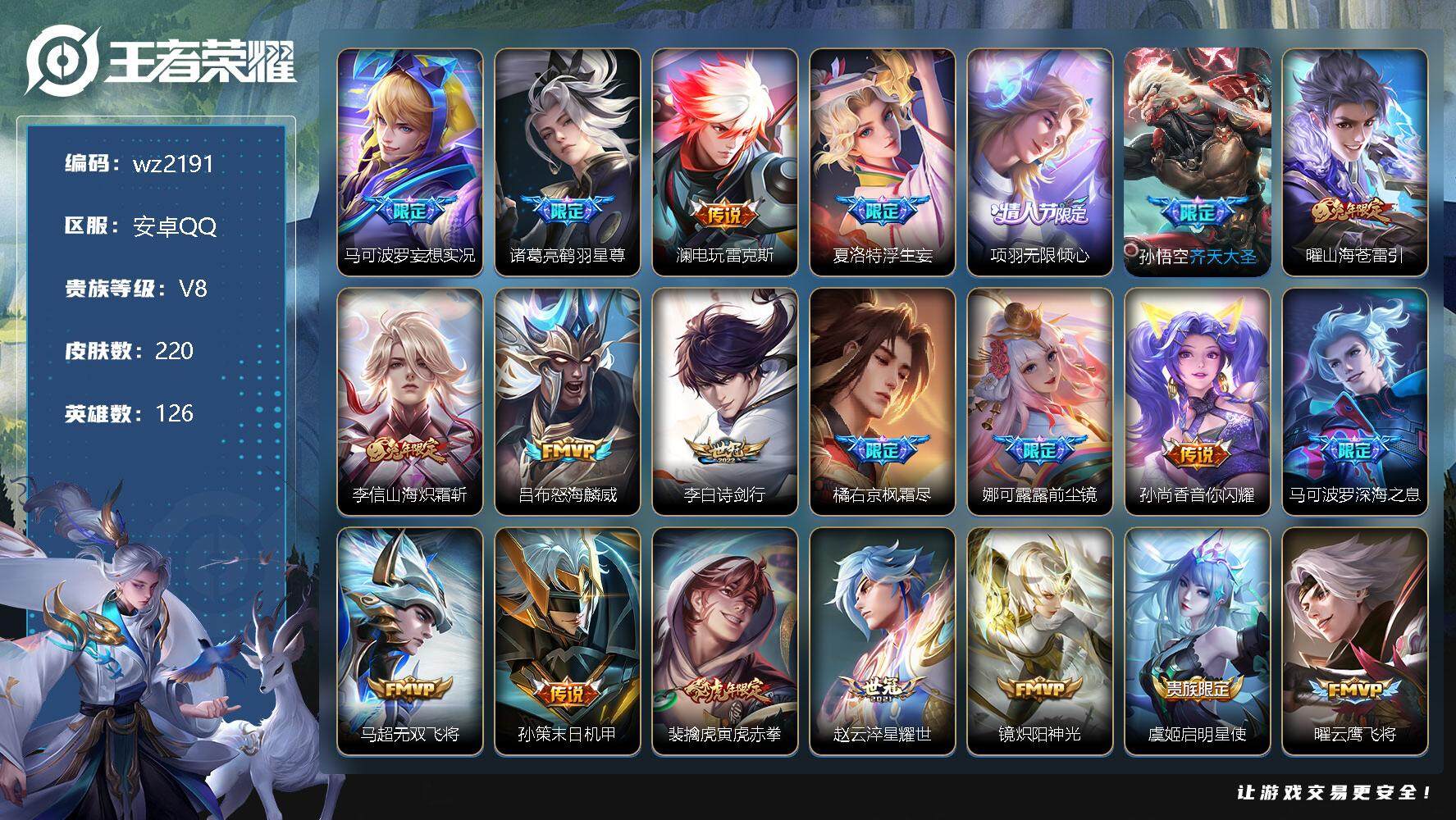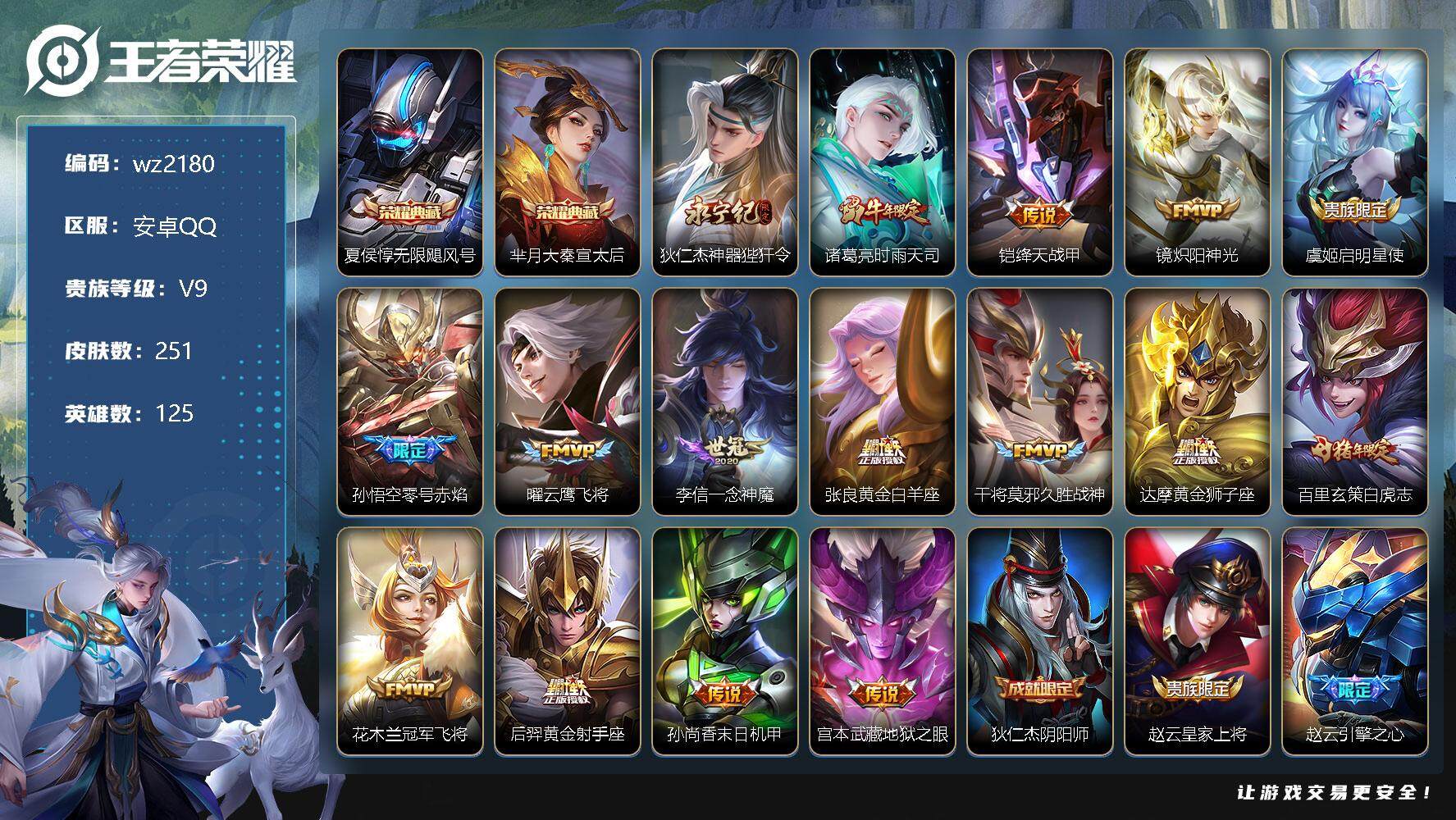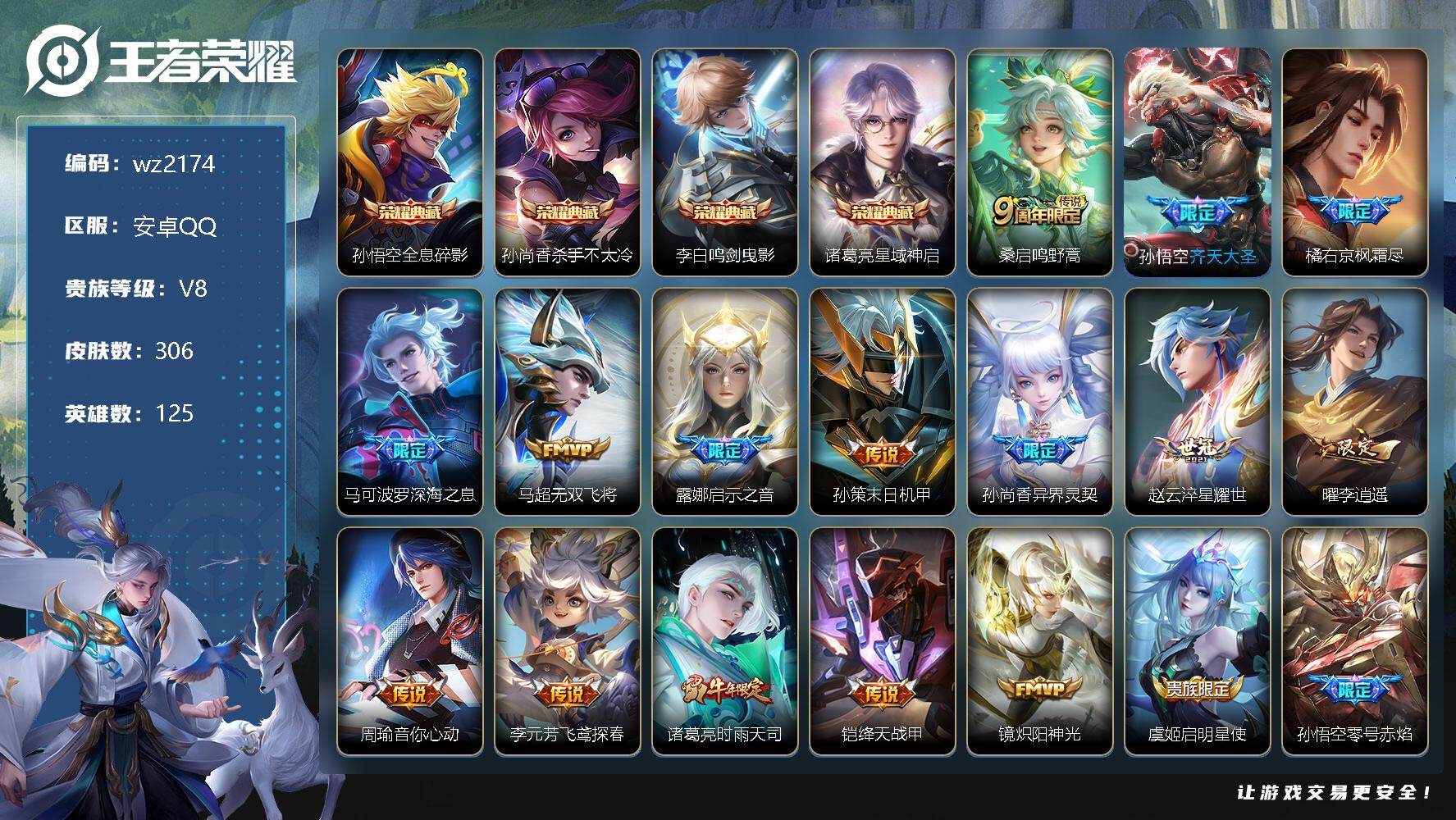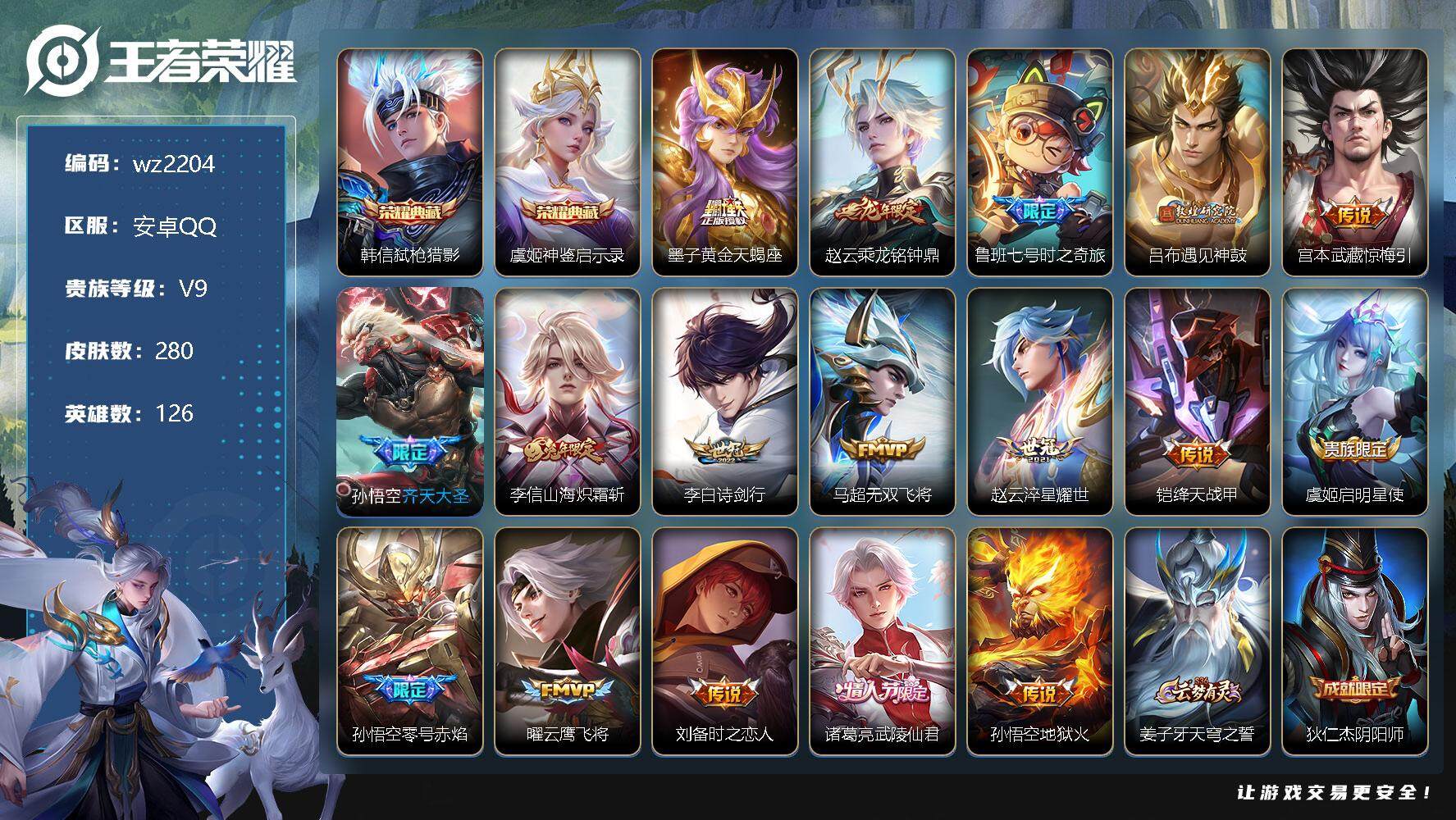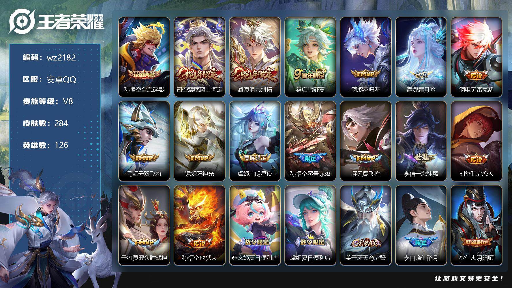 【游戏多多】 【可二次实名】【wz2182】安卓Q-V8-至尊星耀IV段位-126英雄-284皮肤-1典藏-0珍品无双-0无双-0珍品传说-15传说-83史诗 【英雄全皮】:蒙恬全皮,澜全皮,司空震全皮,戈娅全皮,影全皮 【荣耀典藏】:孙悟空全息碎影 【传说皮肤】:司空震愿照山河定,澜愿照九州拓,桑启鸣野蒿,澜逐花归海,露娜霜月吟,澜电玩雷克斯,马超无双飞将,镜炽阳神光,虞姬启明星使,孙悟空零号赤焰,曜云鹰飞将,李信一念神魔,刘备时之恋人,干将莫邪久胜战神,孙悟空地狱火 【限定皮肤】:蔡文姬夏日便利店,虞姬夏日便利店,姜子牙天穹之誓,李白谪仙醉月,狄仁杰阴阳师,赵云皇家上将,赵云百木心枪,高渐离玩趣恶龙,扁鹊奇幻香踪,白起夜都怪侠,芈月幻夜卜梦,元歌无心,狄仁杰魔术师,狄仁杰万华元夜,达摩沙漠行僧,项羽海滩派对,韩信飞衡,韩信傲雪梅枪,兰陵王金庭之子,孙悟空美猴王,孙悟空零号赤焰,后羿圣弓游侠,李元芳云中旅人,虞姬启明星使,杨戬潮玩骑兵,女娲朔望之晖,鬼谷子原初探秘者,鬼谷子五谷丰年,黄忠火炮绅士,苏烈千军破阵,百里玄策原初追逐者,梦奇顽趣,沈梦溪大漠名商,明世隐吟游魔法,裴擒虎李小龙,裴擒虎擒涛扼浪,云中君纤云弄巧,嫦娥暖冬兔眠,西施玲珑珍味,鲁班大师探海日志,桑启海盐诗旅,暃星界游侠,戈娅驭风魔法,艾琳流音漫舞,司空震地狱燃心,阿古朵江河有灵,张良古海寻踪,蒙犽百解令,蒙恬荣光圣徽,高渐离燃音魔法,妲己灵卜魔法,鬼谷子天穹祈灯,伽罗琥珀纪元,姬小满妄想食味,沈梦溪龙舞盛年,鲁班七号蔬乡物语,李元芳蔬乡物语,刘邦剑破天穹,程咬金群星魔术团,镜青焰无极,项羽苍威无极,刘备异域游侠,周瑜熔金海岸 【年限皮肤】:孙悟空美猴王,韩信飞衡 【赛季限定】:狄仁杰万华元夜,达摩沙漠行僧,兰陵王金庭之子,张良古海寻踪,李元芳云中旅人,鬼谷子原初探秘者,苏烈千军破阵,百里玄策原初追逐者,梦奇顽趣,沈梦溪大漠名商,裴擒虎擒涛扼浪,鲁班大师探海日志,桑启海盐诗旅,鬼谷子天穹祈灯,蒙恬荣光圣徽,刘邦剑破天穹,姜子牙天穹之誓 【战令限定】:蔡文姬夏日便利店,虞姬夏日便利店,扁鹊奇幻香踪,白起夜都怪侠,芈月幻夜卜梦,艾琳流音漫舞,后羿圣弓游侠,杨戬潮玩骑兵,女娲朔望之晖,黄忠火炮绅士,明世隐吟游魔法,嫦娥暖冬兔眠,西施玲珑珍味,司空震地狱燃心,暃星界游侠,戈娅驭风魔法,高渐离燃音魔法,妲己灵卜魔法,鲁班七号蔬乡物语,李元芳蔬乡物语,镜青焰无极,项羽苍威无极 【史诗皮肤】:露娜紫霞仙子,赵云皇家上将,赵云未来纪元,貂蝉圣诞恋歌,甄姬冰雪圆舞曲,王昭君偶像歌手,狄仁杰魔术师,廉颇地狱岩魂,宫本武藏鬼剑武藏,孙尚香水果甜心,嬴政暗夜贵公子,嬴政摇滚巨星,妲己魅力维加斯,妲己女仆咖啡,墨子龙骑士,墨子金属风暴,吕布圣诞狂欢,曹操幽灵船长,李白千年之狐,张飞乱世虎臣,花木兰水晶猎龙者,刘邦德古拉伯爵,夏侯惇乘风破浪,小乔缤纷独角兽,兰陵王暗隐猎兽者,诸葛亮黄金分割率,亚瑟心灵战警,百里守约特工魅影,铠曙光守护者,蔡文姬舞动绿茵,刘禅天才门将,李元芳逐浪之夏,程咬金功夫厨神,白起星夜王子,阿轲节奏热浪,孙策猫狗日记,伽罗箭羽风息,狄仁杰鹰眼统帅,韩信飞衡,大乔白蛇,不知火舞魅语,百里玄策原初追逐者,裴擒虎李小龙,云中君纤云弄巧,百里玄策热力回旋,杨戬天秀启明,钟馗乐园奇幻夜,司马懿暗渊魔法,黄忠火炮绅士,韩信傲雪梅枪,赵云百木心枪,澜赏金猎手,明世隐吟游魔法,貂蝉唤灵魅影,鬼谷子五谷丰年,元歌无心,梦奇顽趣,暃星界游侠,扁鹊奇幻香踪,刘禅电玩爆裂旋风,戈娅驭风魔法,司空震地狱燃心,阿古朵江河有灵,蒙犽百解令,妲己灵卜魔法,高渐离燃音魔法,蒙恬荣光圣徽,伽罗琥珀纪元,姬小满妄想食味,鲁班七号蔬乡物语,镜青焰无极,黄忠怒海争锋,蔡文姬夏日便利店,亚连破空之剑,马可波罗星界特工,李白谪仙醉月,百里守约百相守梦,牛魔星界战将,孙膑茶境仙,阿轲化蝶舞,狂铁龙之律动,扁鹊灵蛊蚀心,后羿石田雨龙,黄忠百相守梦 【其他皮肤】:项羽海滩派对,韩信教廷特使,韩信街头霸王,露娜哥特玫瑰,赵云忍炎影,芈月红桃皇后,白起白色死神,扁鹊化身博士,宫本武藏未来纪元,安琪拉玩偶对对碰,孙膑天使之翼,妲己少女阿狸,典韦黄金武士,亚瑟死亡骑士,孙悟空美猴王,花木兰兔女郎,甄姬花好人间,宫本武藏万象初新,狄仁杰阴阳师,刘备纽约教父,刘备汉昭烈帝,关羽龙腾万里,钟无艳海滩丽影,狂铁命运角斗场,老夫子功夫老勺,孙尚香沉稳之力,诸葛亮掌控之力,李白敏锐之力,鬼谷子幻乐之宴,苏烈坚韧之力,大乔守护之力,明世隐虹云星官,张良幽兰居士,女娲朔望之晖,小乔丁香结,吕布野性能量,高渐离玩趣恶龙,沈梦溪鲨炮海盗猫,姜子牙炽热元素使,哪吒次元突破,鲁班七号黑桃队长,狂铁特工战影,鬼谷子原初探秘者,狄仁杰万华元夜,刘禅秘密基地,张良缤纷绘卷,鲁班