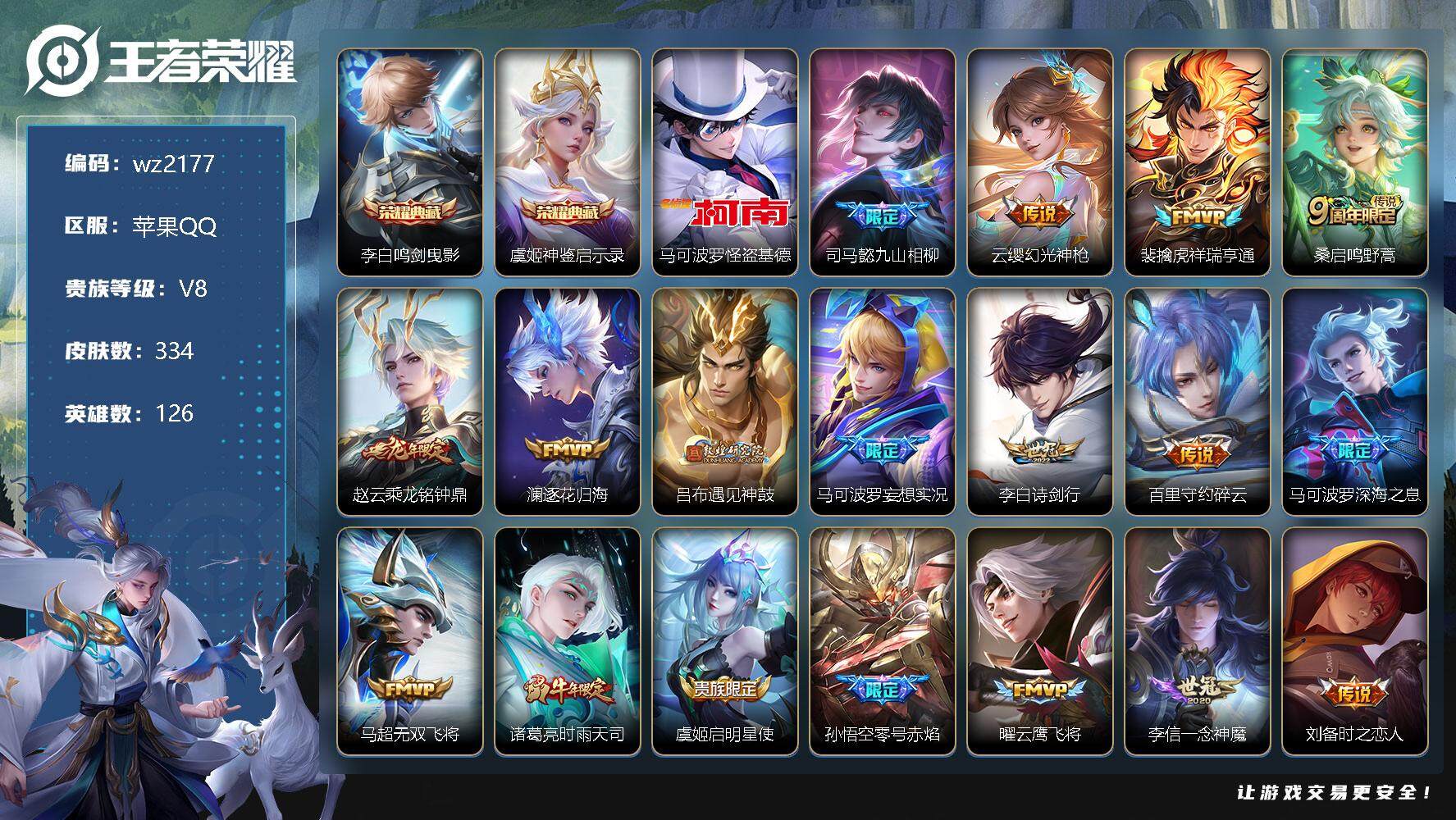 【游戏多多】 【可二次实名】【wz2177】苹果Q-V8-永恒钻石III段位-126英雄-334皮肤-2典藏-0珍品无双-0无双-1珍品传说-23传说-97史诗 【英雄全皮】:司马懿全皮,空空儿全皮,影全皮 【荣耀典藏】:李白鸣剑曳影,虞姬神鉴启示录 【珍品传说】:马可波罗怪盗基德 【传说皮肤】:司马懿九山相柳,云缨幻光神枪,裴擒虎祥瑞亨通,桑启鸣野蒿,赵云乘龙铭钟鼎,澜逐花归海,吕布遇见神鼓,马可波罗妄想实况,李白诗剑行,百里守约碎云,马可波罗深海之息,马超无双飞将,诸葛亮时雨天司,虞姬启明星使,孙悟空零号赤焰,曜云鹰飞将,李信一念神魔,刘备时之恋人,干将莫邪久胜战神,貂蝉仲夏夜之梦,孙尚香末日机甲,孙悟空地狱火,狄仁杰超时空战士 【限定皮肤】:白起狰,暃埋骨钱,蒙犽顽岩魄,蔡文姬夏日便利店,大乔绒语心约,虞姬夏日便利店,姜子牙天穹之誓,杨戬破阵退雄兵,李白谪仙醉月,狄仁杰阴阳师,赵云皇家上将,嬴政优雅恋人,孙尚香蔷薇恋人,钟无艳王者之锤,芈月重明,吕布御风骁将,吕布遇见神鼓,周瑜赤莲之焰,元歌云间偶戏,元歌无心,夏侯惇朔风刀,曹操烛龙,曹操天狼征服者,典韦穷奇,典韦岱宗,马可波罗暗影游猎,马可波罗深海之息,马可波罗山海玄木吟,马可波罗妄想实况,狄仁杰魔术师,狄仁杰万华元夜,达摩沙漠行僧,项羽海滩派对,老夫子醍醐杖,安琪拉魔法小厨娘,程咬金演武夺筹,韩信逐梦之影,韩信飞衡,亚瑟潮玩骑士王,孙悟空至尊宝,孙悟空零号赤焰,孙悟空孙行者,牛魔御旌,后羿辉光之辰,李元芳银河之约,李元芳云中旅人,虞姬启明星使,钟馗驱傩正仪,杨玉环遇见飞天,雅典娜黎明之约,太乙真人饕餮,鬼谷子原初探秘者,鬼谷子五谷丰年,诸葛亮时雨天司,百里玄策原初追逐者,弈星混沌棋,梦奇顽趣,沈梦溪星空之诺,明世隐疑决卦,裴擒虎李小龙,裴擒虎擒涛扼浪,狂铁御狮,米莱狄御霄,云中君纤云弄巧,盾山御銮,猪八戒西部大镖客,上官婉儿梁祝,嫦娥拒霜思,西施玲珑珍味,鲁班大师探海日志,桑启海盐诗旅,戈娅驭风魔法,艾琳流音漫舞,司空震地狱燃心,阿古朵江河有灵,张良古海寻踪,蒙犽百解令,蒙恬荣光圣徽,高渐离燃音魔法,妲己灵卜魔法,鬼谷子天穹祈灯,伽罗琥珀纪元,赵云乘龙铭钟鼎,沈梦溪龙舞盛年,刘邦剑破天穹,程咬金群星魔术团,镜青焰无极,项羽苍威无极,刘备异域游侠,芈月浮光幕影,周瑜熔金海岸 【年限皮肤】:后羿辉光之辰,吕布御风骁将,诸葛亮时雨天司,韩信飞衡,典韦岱宗,马可波罗山海玄木吟,赵云乘龙铭钟鼎 【赛季限定】:白起狰,芈月重明,夏侯惇朔风刀,曹操烛龙,典韦穷奇,狄仁杰万华元夜,达摩沙漠行僧,老夫子醍醐杖,程咬金演武夺筹,张良古海寻踪,牛魔御旌,李元芳云中旅人,钟馗驱傩正仪,雅典娜黎明之约,太乙真人饕餮,鬼谷子原初探秘者,百里玄策原初追逐者,弈星混沌棋,梦奇顽趣,明世隐疑决卦,裴擒虎擒涛扼浪,狂铁御狮,米莱狄御霄,盾山御銮,鲁班大师探海日志,桑启海盐诗旅,鬼谷子天穹祈灯,蒙恬荣光圣徽,刘邦剑破天穹,姜子牙天穹之誓 【战令限定】:蔡文姬夏日便利店,虞姬夏日便利店,周瑜赤莲之焰,元歌云间偶戏,马可波罗暗影游猎,艾琳流音漫舞,亚瑟潮玩骑士王,李元芳银河之约,沈梦溪星空之诺,猪八戒西部大镖客,西施玲珑珍味,司空震地狱燃心,戈娅驭风魔法,高渐离燃音魔法,妲己灵卜魔法,镜青焰无极,项羽苍威无极 【史诗皮肤】:鲁班七号电玩小子,项羽苍穹之光,露娜紫霞仙子,钟无艳王者之锤,赵云皇家上将,赵云未来纪元,貂蝉圣诞恋歌,甄姬冰雪圆舞曲,王昭君偶像歌手,狄仁杰魔术师,宫本武藏鬼剑武藏,孙尚香蔷薇恋人,孙尚香水果甜心,嬴政优雅恋人,嬴政摇滚巨星,妲己女仆咖啡,墨子金属风暴,吕布圣诞狂欢,刘禅绅士熊喵,曹操幽灵船长,李白千年之狐,安琪拉魔法小厨娘,张飞乱世虎臣,孙悟空至尊宝,花木兰水晶猎龙者,刘邦德古拉伯爵,韩信逐梦之影,夏侯惇乘风破浪,小乔缤纷独角兽,兰陵王暗隐猎兽者,诸葛亮黄金分割率,亚瑟心灵战警,雅典娜冰冠公主,安琪拉心灵骇客,后羿辉光之辰,百里守约特工魅影,铠曙光守护者,李元芳逐浪之夏,程咬金功夫厨神,白起星夜王子,阿轲节奏热浪,杨玉环遇见飞天,孙策猫狗日记,大乔猫狗日记,狄仁杰鹰眼统帅,上官婉儿梁祝,曹操天狼征服者,李元芳银河之约,韩信飞衡,典韦岱宗,小乔青蛇,橘右京修罗,马可波罗暗影游猎,百里玄策原初追逐者,裴擒虎李小龙,云中君纤云弄巧,元歌云间偶戏,吕布御风骁将,百里玄策热力回旋,杨戬天秀启明,孙悟空孙行者,司马懿暗渊魔法,嫦娥拒霜思,雅典娜黎明之约,夏洛特永昼,澜赏金猎手,鬼谷子五谷丰年,元歌无心,梦奇顽趣,马可波罗山海玄木吟,戈娅驭风魔法,莱西奥末日机甲,司空震地狱燃心,阿古朵江河有灵,蒙犽百解令,妲己灵卜魔法,高渐离燃音魔法,蒙恬荣光圣徽,伽罗琥珀纪元,镜青焰无极,黄忠怒海争锋,芈月浮光幕影,蔡文姬夏日便利店,蒙