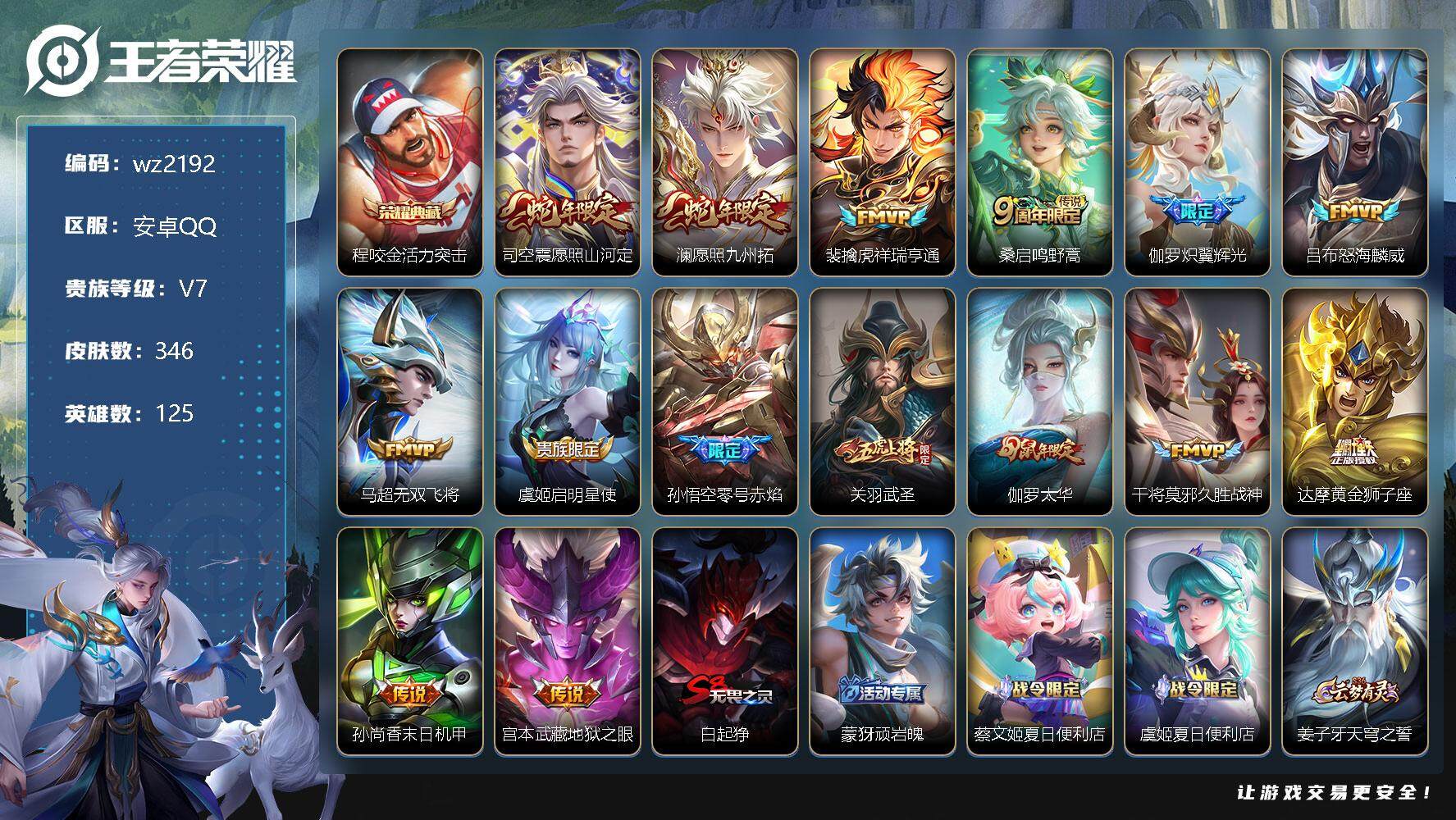 【游戏多多】 【可二次实名】【wz2192】安卓Q-V7-永恒钻石IV段位-125英雄-346皮肤-1典藏-0珍品无双-0无双-0珍品传说-15传说-98史诗 【英雄全皮】:狂铁全皮,鲁班大师全皮,金蝉全皮,戈娅全皮,空空儿全皮,影全皮 【荣耀典藏】:程咬金活力突击 【传说皮肤】:司空震愿照山河定,澜愿照九州拓,裴擒虎祥瑞亨通,桑启鸣野蒿,伽罗炽翼辉光,吕布怒海麟威,马超无双飞将,虞姬启明星使,孙悟空零号赤焰,关羽武圣,伽罗太华,干将莫邪久胜战神,达摩黄金狮子座,孙尚香末日机甲,宫本武藏地狱之眼 【限定皮肤】:白起狰,蒙犽顽岩魄,蔡文姬夏日便利店,虞姬夏日便利店,姜子牙天穹之誓,狄仁杰阴阳师,虞姬凯尔特女王,廉颇寅虎御盾,赵云皇家上将,墨子神迹守卫,嬴政优雅恋人,嬴政白昼王子,庄周蜃楼王,庄周高山流水,高渐离死亡摇滚,钟无艳王者之锤,钟无艳超时空战士,孙膑妖精王,孙膑天狼运算者,扁鹊炼金王,芈月重明,芈月幻夜卜梦,吕布猎兽之王,元歌云间偶戏,元歌无心,夏侯惇朔风刀,甄姬女儿国国王,甄姬游园惊梦,甄姬落雪兰心,曹操烛龙,典韦穷奇,马可波罗山海玄木吟,狄仁杰魔术师,狄仁杰万华元夜,达摩沙漠行僧,项羽海滩派对,老夫子圣诞老人,老夫子醍醐杖,老夫子航海奇遇记,关羽武圣,程咬金演武夺筹,露娜一生所爱,韩信傲雪梅枪,王昭君午后时光,兰陵王金庭之子,花木兰青春决赛季,亚瑟狮心王,亚瑟潮玩骑士王,孙悟空零号赤焰,牛魔御旌,后羿辉光之辰,后羿圣弓游侠,李元芳云中旅人,虞姬启明星使,钟馗驱傩正仪,杨玉环遇见飞天,杨玉环寅虎心曲,干将莫邪真爱魔法,雅典娜单词大作战,雅典娜黎明之约,蔡文姬奇迹圣诞,太乙真人饕餮,鬼谷子原初探秘者,鬼谷子五谷丰年,大乔白鹤梁神女,黄忠火炮绅士,苏烈千军破阵,百里玄策原初追逐者,弈星混沌棋,公孙离玉兔公主,沈梦溪大漠名商,沈梦溪匿光破解者,明世隐疑决卦,裴擒虎李小龙,裴擒虎擒涛扼浪,狂铁御狮,狂铁电玩高手,米莱狄御霄,伽罗太华,伽罗天狼溯光者,伽罗炽翼辉光,盾山御銮,上官婉儿梁祝,嫦娥拒霜思,嫦娥暖冬兔眠,西施玲珑珍味,蒙犽狂想玩偶喵,鲁班大师匿光启智者,鲁班大师探海日志,镜匿光追影者,桑启海盐诗旅,金蝉唐三藏,暃星界游侠,戈娅驭风魔法,艾琳女武神,阿古朵江河有灵,张良古海寻踪,裴擒虎梅西,蒙犽百解令,鬼谷子天穹祈灯,姬小满妄想食味,沈梦溪龙舞盛年,鲁班七号蔬乡物语,李元芳蔬乡物语,刘邦剑破天穹,程咬金群星魔术团,周瑜熔金海岸 【年限皮肤】:杨玉环寅虎心曲,廉颇寅虎御盾,后羿辉光之辰,伽罗太华,关羽武圣,马可波罗山海玄木吟,伽罗炽翼辉光 【赛季限定】:庄周蜃楼王,孙膑妖精王,扁鹊炼金王,白起狰,芈月重明,夏侯惇朔风刀,曹操烛龙,典韦穷奇,狄仁杰万华元夜,达摩沙漠行僧,老夫子醍醐杖,程咬金演武夺筹,兰陵王金庭之子,张良古海寻踪,亚瑟狮心王,牛魔御旌,李元芳云中旅人,虞姬凯尔特女王,钟馗驱傩正仪,雅典娜黎明之约,太乙真人饕餮,鬼谷子原初探秘者,苏烈千军破阵,百里玄策原初追逐者,弈星混沌棋,沈梦溪大漠名商,明世隐疑决卦,裴擒虎擒涛扼浪,狂铁御狮,米莱狄御霄,盾山御銮,鲁班大师探海日志,桑启海盐诗旅,鬼谷子天穹祈灯,刘邦剑破天穹,姜子牙天穹之誓 【战令限定】:墨子神迹守卫,蔡文姬夏日便利店,虞姬夏日便利店,嬴政白昼王子,钟无艳超时空战士,芈月幻夜卜梦,吕布猎兽之王,元歌云间偶戏,甄姬落雪兰心,老夫子航海奇遇记,王昭君午后时光,亚瑟潮玩骑士王,后羿圣弓游侠,干将莫邪真爱魔法,雅典娜单词大作战,黄忠火炮绅士,狂铁电玩高手,嫦娥暖冬兔眠,西施玲珑珍味,蒙犽狂想玩偶喵,暃星界游侠,戈娅驭风魔法,鲁班七号蔬乡物语,李元芳蔬乡物语 【史诗皮肤】:鲁班七号电玩小子,项羽苍穹之光,露娜紫霞仙子,钟无艳王者之锤,赵云皇家上将,貂蝉圣诞恋歌,老夫子圣诞老人,甄姬冰雪圆舞曲,王昭君偶像歌手,狄仁杰魔术师,廉颇地狱岩魂,宫本武藏鬼剑武藏,孙尚香水果甜心,嬴政优雅恋人,嬴政摇滚巨星,妲己魅力维加斯,妲己女仆咖啡,墨子金属风暴,吕布圣诞狂欢,刘禅绅士熊喵,曹操幽灵船长,李白千年之狐,吕布末日机甲,张飞乱世虎臣,花木兰水晶猎龙者,刘邦德古拉伯爵,夏侯惇乘风破浪,小乔缤纷独角兽,兰陵王暗隐猎兽者,诸葛亮黄金分割率,甄姬游园惊梦,亚瑟心灵战警,安琪拉心灵骇客,后羿辉光之辰,花木兰青春决赛季,百里守约特工魅影,蔡文姬舞动绿茵,裴擒虎梅西,刘禅天才门将,李元芳逐浪之夏,程咬金功夫厨神,白起星夜王子,阿轲节奏热浪,杨玉环遇见飞天,蔡文姬奇迹圣诞,嬴政白昼王子,孙策猫狗日记,大乔猫狗日记,露娜一生所爱,狄仁杰鹰眼统帅,上官婉儿梁祝,娜可露露晚萤,不知火舞魅语,蒙犽狂想玩偶喵,百里玄策原初追逐者,裴擒虎李小龙,孙膑天狼运算者,元歌云间偶戏,老夫子航海奇遇记,伽罗天狼溯光者,大乔白鹤梁神女,干将莫