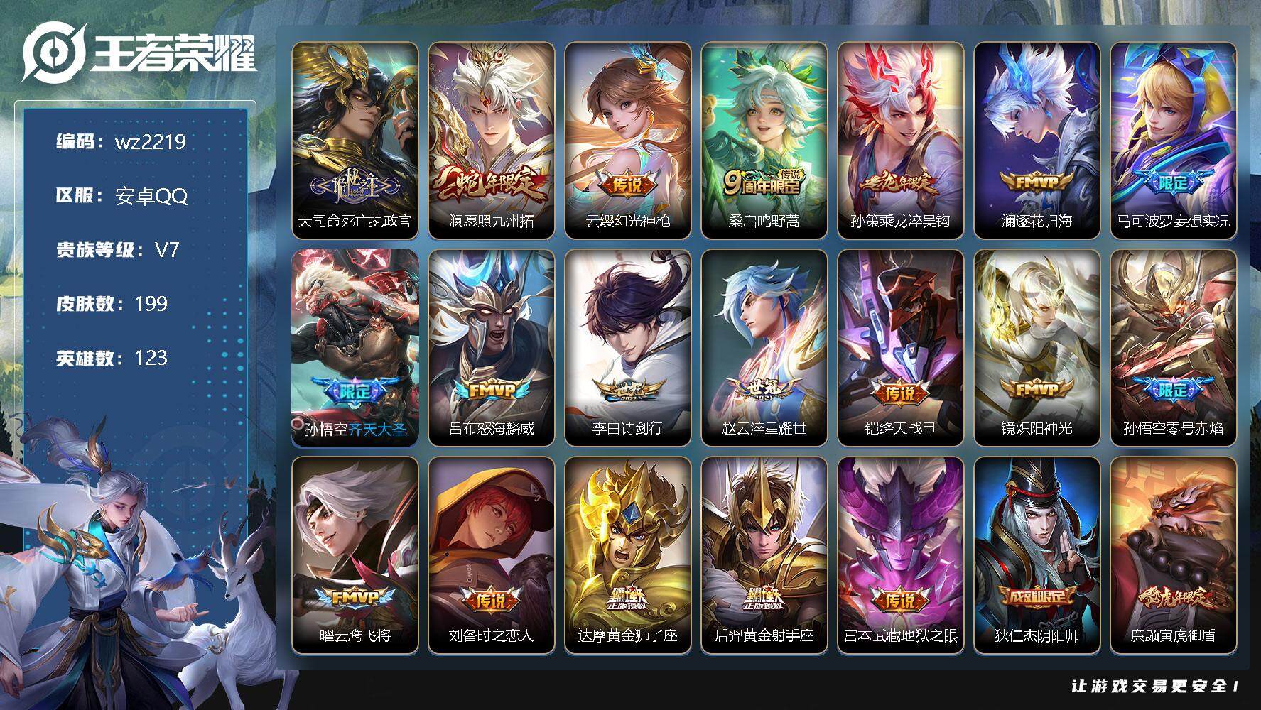 【游戏多多】 【可二次实名】【wz2219】安卓Q-V7-至尊星耀IV段位-123英雄-199皮肤-0典藏-0珍品无双-0无双-0珍品传说-19传说-58史诗 【英雄全皮】:空空儿全皮 【传说皮肤】:大司命死亡执政官,澜愿照九州拓,云缨幻光神枪,桑启鸣野蒿,孙策乘龙淬吴钩,澜逐花归海,马可波罗妄想实况,孙悟空齐天大圣,吕布怒海麟威,李白诗剑行,赵云淬星耀世,铠绛天战甲,镜炽阳神光,孙悟空零号赤焰,曜云鹰飞将,刘备时之恋人,达摩黄金狮子座,后羿黄金射手座,宫本武藏地狱之眼 【限定皮肤】:狄仁杰阴阳师,廉颇寅虎御盾,赵云皇家上将,赵云引擎之心,孙尚香蔷薇恋人,庄周高山流水,扁鹊奇幻香踪,元歌无心,典韦岱宗,马可波罗暗影游猎,马可波罗山海玄木吟,马可波罗妄想实况,狄仁杰魔术师,达摩沙漠行僧,项羽海滩派对,韩信飞衡,兰陵王金庭之子,孙悟空零号赤焰,孙悟空齐天大圣,后羿圣弓游侠,李元芳匿光侦查者,李元芳云中旅人,钟馗驱傩正仪,杨玉环寅虎心曲,杨戬潮玩骑兵,鬼谷子五谷丰年,铠青龙志,苏烈千军破阵,沈梦溪大漠名商,裴擒虎擒涛扼浪,嫦娥暖冬兔眠,西施玲珑珍味,鲁班大师探海日志,桑启海盐诗旅,暃星界游侠,戈娅驭风魔法,阿古朵江河有灵,张良古海寻踪,蒙恬荣光圣徽,高渐离燃音魔法,妲己灵卜魔法,鬼谷子天穹祈灯,孙策乘龙淬吴钩,沈梦溪龙舞盛年,刘邦剑破天穹 【年限皮肤】:铠青龙志,杨玉环寅虎心曲,廉颇寅虎御盾,韩信飞衡,典韦岱宗,马超神威,马可波罗山海玄木吟,孙策乘龙淬吴钩 【赛季限定】:达摩沙漠行僧,兰陵王金庭之子,张良古海寻踪,李元芳云中旅人,钟馗驱傩正仪,苏烈千军破阵,沈梦溪大漠名商,裴擒虎擒涛扼浪,鲁班大师探海日志,桑启海盐诗旅,鬼谷子天穹祈灯,蒙恬荣光圣徽,刘邦剑破天穹 【战令限定】:扁鹊奇幻香踪,马可波罗暗影游猎,后羿圣弓游侠,杨戬潮玩骑兵,嫦娥暖冬兔眠,西施玲珑珍味,暃星界游侠,戈娅驭风魔法,高渐离燃音魔法,妲己灵卜魔法 【史诗皮肤】:项羽苍穹之光,赵云皇家上将,甄姬冰雪圆舞曲,狄仁杰魔术师,廉颇地狱岩魂,宫本武藏鬼剑武藏,孙尚香蔷薇恋人,孙尚香水果甜心,嬴政暗夜贵公子,妲己魅力维加斯,妲己女仆咖啡,墨子金属风暴,刘禅绅士熊喵,李白千年之狐,赵云引擎之心,花木兰水晶猎龙者,小乔缤纷独角兽,兰陵王暗隐猎兽者,诸葛亮黄金分割率,安琪拉心灵骇客,百里守约特工魅影,白起星夜王子,铠青龙志,伽罗箭羽风息,狄仁杰鹰眼统帅,韩信飞衡,典韦岱宗,瑶遇见神鹿,马超神威,马可波罗暗影游猎,蒙犽龙鼓争鸣,钟馗乐园奇幻夜,庄周高山流水,杨玉环寅虎心曲,廉颇寅虎御盾,鬼谷子五谷丰年,元歌无心,暃星界游侠,马可波罗山海玄木吟,扁鹊奇幻香踪,刘禅电玩爆裂旋风,戈娅驭风魔法,李元芳匿光侦查者,阿古朵江河有灵,妲己灵卜魔法,高渐离燃音魔法,蒙恬荣光圣徽,马可波罗星界特工,牛魔星界战将,芈月瑰影绮梦,阿轲化蝶舞,刘禅鸭鸭历险记,狂铁龙之律动,扁鹊灵蛊蚀心,周瑜百相守梦,钟无艳戍鼓铭心,黄忠百相守梦,西施织梦人,公孙离涂山容容 【其他皮肤】:项羽海滩派对,芈月红桃皇后,白起白色死神,牛魔西部大镖客,扁鹊化身博士,安琪拉玩偶对对碰,孙膑天使之翼,妲己少女阿狸,典韦黄金武士,亚瑟死亡骑士,花木兰兔女郎,张飞五福同心,宫本武藏万象初新,后羿阿尔法小队,狄仁杰阴阳师,刘备纽约教父,刘备汉昭烈帝,关羽龙腾万里,钟无艳海滩丽影,王昭君幻想奇妙夜,狂铁命运角斗场,诸葛亮掌控之力,李白敏锐之力,明世隐虹云星官,小乔丁香结,吕布野性能量,沈梦溪鲨炮海盗猫,哪吒次元突破,盾山圆桌骑士,狂铁特工战影,刘禅秘密基地,露娜瓷语鉴心,钟馗驱傩正仪,苏烈千军破阵,后羿圣弓游侠,典韦铁甲之心,妲己紫罗兰之誓,达摩沙漠行僧,程咬金无双福将,兰陵王金庭之子,刘禅唤灵魔甲,沈梦溪大漠名商,李元芳云中旅人,桑启海盐诗旅,嫦娥暖冬兔眠,海月幻泉雾影,猪八戒潮玩探月行,牛魔牛运亨通,白起乐园追猎者,赵怀真太极少年,裴擒虎擒涛扼浪,杨戬潮玩骑兵,太乙真人劲辣红锅,莱西奥西部游侠,鲁班大师探海日志,西施玲珑珍味,姬小满零食大作战,李元芳妄想特派,张良古海寻踪,钟无艳聚星闪耀,海月王牌新星,亚连破局者,兰陵王幻夜行动,后羿完美运算,鬼谷子天穹祈灯,妲己灵卜魔法,朵莉亚金色潮汐,廉颇功夫炙烤,亚瑟鸿运当头,沈梦溪龙舞盛年,刘邦剑破天穹,东皇太一噬灭天穹,米莱狄怪诞之夜,干将莫邪雾都夜雨,苍苍林狼骑,太乙真人谧流熔炉,典韦铁骨偃魂,西施雪境奇遇,戈娅玫蓝誓约,刘备浪漫序章,钟馗虚灵犬护,沈梦溪鸭鸭历险记,阿古朵布丁狗之约,露娜命运加冕,雅典娜潮玩士官长,姬小满小满鸭,甄姬逆浪荇歌,孙策百相守梦,空空儿戏梦巡演,高渐离落日弦歌,莱西奥踏浪烽翎,鬼谷子克喵,鲁班七号木偶奇遇记,貂蝉异域舞娘,小乔万圣前夜,孙悟空西部大镖客,周瑜海军大将,刘禅英喵野望,夏侯