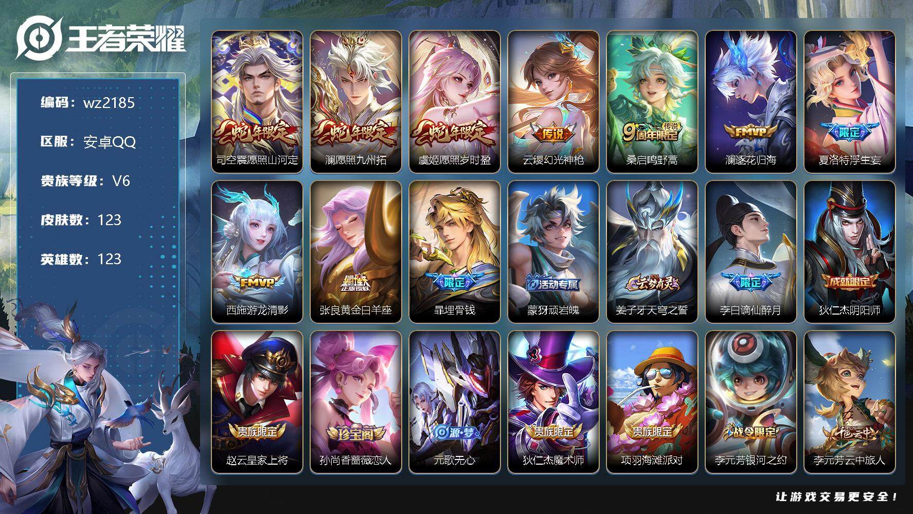 【游戏多多】 【可二次实名】【wz2185】安卓Q-V6-至尊星耀III段位-123英雄-123皮肤-0典藏-0珍品无双-0无双-0珍品传说-9传说-40史诗 【英雄全皮】:影全皮 【传说皮肤】:司空震愿照山河定,澜愿照九州拓,虞姬愿照岁时盈,云缨幻光神枪,桑启鸣野蒿,澜逐花归海,夏洛特浮生妄,西施游龙清影,张良黄金白羊座 【限定皮肤】:暃埋骨钱,蒙犽顽岩魄,姜子牙天穹之誓,李白谪仙醉月,狄仁杰阴阳师,赵云皇家上将,孙尚香蔷薇恋人,元歌无心,狄仁杰魔术师,项羽海滩派对,李元芳银河之约,李元芳云中旅人,鬼谷子五谷丰年,沈梦溪大漠名商,云中君纤云弄巧,鲁班大师探海日志,桑启海盐诗旅,夏洛特浮生妄,鬼谷子天穹祈灯,沈梦溪龙舞盛年 【赛季限定】:李元芳云中旅人,沈梦溪大漠名商,鲁班大师探海日志,桑启海盐诗旅,鬼谷子天穹祈灯,姜子牙天穹之誓 【战令限定】:李元芳银河之约 【史诗皮肤】:赵云皇家上将,貂蝉圣诞恋歌,狄仁杰魔术师,宫本武藏鬼剑武藏,孙尚香蔷薇恋人,孙尚香水果甜心,妲己魅力维加斯,曹操幽灵船长,张飞乱世虎臣,夏侯惇乘风破浪,小乔缤纷独角兽,兰陵王暗隐猎兽者,亚瑟心灵战警,安琪拉心灵骇客,蔡文姬舞动绿茵,李元芳逐浪之夏,程咬金功夫厨神,白起星夜王子,阿轲节奏热浪,狄仁杰鹰眼统帅,李元芳银河之约,云中君纤云弄巧,钟馗乐园奇幻夜,鬼谷子五谷丰年,元歌无心,蒙犽顽岩魄,暃埋骨钱,大司命东方月初,姬小满战舞者,亚连破空之剑,弈星炽弈燎原,马可波罗星界特工,李白谪仙醉月,艾琳陌上桑,孙膑茶境仙,赵怀真器灵浮梦炉,阿轲化蝶舞,刘禅鸭鸭历险记,狂铁龙之律动,老夫子藏狐褐绒 【其他皮肤】:项羽海滩派对,韩信街头霸王,露娜哥特玫瑰,白起白色死神,扁鹊化身博士,安琪拉玩偶对对碰,孙膑天使之翼,典韦黄金武士,亚瑟死亡骑士,达摩拳王,宫本武藏万象初新,后羿阿尔法小队,狄仁杰阴阳师,刘备汉昭烈帝,狂铁命运角斗场,老夫子功夫老勺,孙尚香沉稳之力,苏烈坚韧之力,鲁班七号黑桃队长,刘禅秘密基地,鲁班大师乓乓大师,程咬金无双福将,米莱狄契约魔法,沈梦溪大漠名商,蒙恬蔚蓝守将,李元芳云中旅人,桑启海盐诗旅,猪八戒潮玩探月行,赵怀真太极少年,莱西奥西部游侠,鲁班大师探海日志,曹操决胜大满贯,鬼谷子天穹祈灯,沈梦溪龙舞盛年,姜子牙天穹之誓,孙悟空神迹守卫,盘古敬我三分,东皇太一噬灭天穹,米莱狄怪诞之夜,干将莫邪雾都夜雨,吕布逐霄战戟,苍苍林狼骑,太乙真人谧流熔炉,典韦铁骨偃魂,马超访茗客,影魅影绮裳,西施雪境奇遇,东皇太一金福满堂,达摩爆裂喵拳,明世隐景韶洛都,戈娅玫蓝誓约,刘备浪漫序章,钟馗虚灵犬护,沈梦溪鸭鸭历险记,苏烈春野闲踪,张良灵野札记,哪吒罗小黑战记,亚瑟荣光之誓,张良罗小黑战记,鲁班七号木偶奇遇记,项羽帝国元帅,后羿精灵王,兰陵王隐刃,刘邦圣殿之光,马可波罗激情绿茵,苍维京掠夺者,太乙真人圆桌骑士,杨玉环霓裳曲,孙策海之征途,云中君荷鲁斯之眼,曜归虚梦演,马超幸存者,澜孤猎,云缨赤焰之缨 【内测皮肤】:孙尚香蔷薇恋人 【营地ID】:1796156807