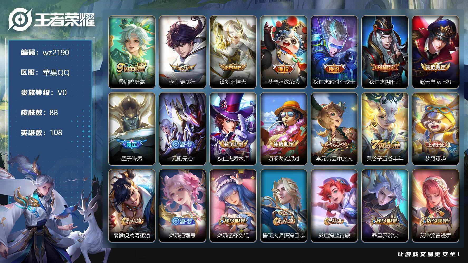 【游戏多多】 【可二次实名】【wz2190】苹果Q-V0-荣耀黄金IV段位-108英雄-88皮肤-0典藏-0珍品无双-0无双-0珍品传说-5传说-20史诗 【英雄全皮】:蒙恬全皮 【传说皮肤】:桑启鸣野蒿,李白诗剑行,镜炽阳神光,梦奇胖达荣荣,狄仁杰超时空战士 【限定皮肤】:狄仁杰阴阳师,赵云皇家上将,墨子降魔,元歌无心,狄仁杰魔术师,项羽海滩派对,李元芳云中旅人,鬼谷子五谷丰年,梦奇顽趣,裴擒虎擒涛扼浪,嫦娥拒霜思,嫦娥暖冬兔眠,鲁班大师探海日志,桑启海盐诗旅,暃星界游侠,艾琳流音漫舞,司空震地狱燃心,阿古朵江河有灵,张良古海寻踪,蒙犽百解令,蒙恬荣光圣徽,鬼谷子天穹祈灯 【赛季限定】:张良古海寻踪,李元芳云中旅人,梦奇顽趣,裴擒虎擒涛扼浪,鲁班大师探海日志,桑启海盐诗旅,鬼谷子天穹祈灯,蒙恬荣光圣徽 【战令限定】:艾琳流音漫舞,嫦娥暖冬兔眠,司空震地狱燃心,暃星界游侠 【史诗皮肤】:露娜紫霞仙子,赵云皇家上将,甄姬冰雪圆舞曲,狄仁杰魔术师,孙尚香水果甜心,妲己魅力维加斯,夏侯惇乘风破浪,刘禅天才门将,阿轲节奏热浪,公孙离无限星赏官,嫦娥拒霜思,鬼谷子五谷丰年,元歌无心,墨子降魔,梦奇顽趣,暃星界游侠,司空震地狱燃心,阿古朵江河有灵,蒙犽百解令,蒙恬荣光圣徽 【其他皮肤】:项羽海滩派对,韩信教廷特使,韩信街头霸王,赵云忍炎影,安琪拉玩偶对对碰,孙膑天使之翼,姜子牙时尚教父,妲己少女阿狸,典韦黄金武士,亚瑟死亡骑士,达摩拳王,宫本武藏万象初新,狄仁杰阴阳师,刘备纽约教父,老夫子功夫老勺,孙尚香沉稳之力,李白敏锐之力,孙膑归虚梦演,狂铁特工战影,鲁班大师乓乓大师,蒙恬蔚蓝守将,李元芳云中旅人,桑启海盐诗旅,嫦娥暖冬兔眠,海月幻泉雾影,裴擒虎擒涛扼浪,太乙真人劲辣红锅,莱西奥西部游侠,鲁班大师探海日志,艾琳流音漫舞,张良古海寻踪,钟无艳聚星闪耀,海月王牌新星,亚连破局者,后羿完美运算,程咬金暖冬絮语,鬼谷子天穹祈灯,苍苍林狼骑,貂蝉异域舞娘,花木兰剑舞者,狄仁杰锦衣卫,曹操超能战警,周瑜海军大将,后羿精灵王,马可波罗激情绿茵,苍维京掠夺者,黄忠芝加哥教父,铠龙域领主,百里玄策威尼斯狂欢,梦奇美梦成真,裴擒虎街头旋风,元歌午夜歌剧院,孙策海之征途,司马懿魇语军师,伽罗花见巫女,上官婉儿修竹墨客,曜归虚梦演,镜冰刃幻境,蒙恬秩序猎龙将,阿古朵熊喵少女,司空震启蛰,云缨赤焰之缨,桑启画中游 【内测皮肤】:狂铁特工战影 【营地ID】:1741823562