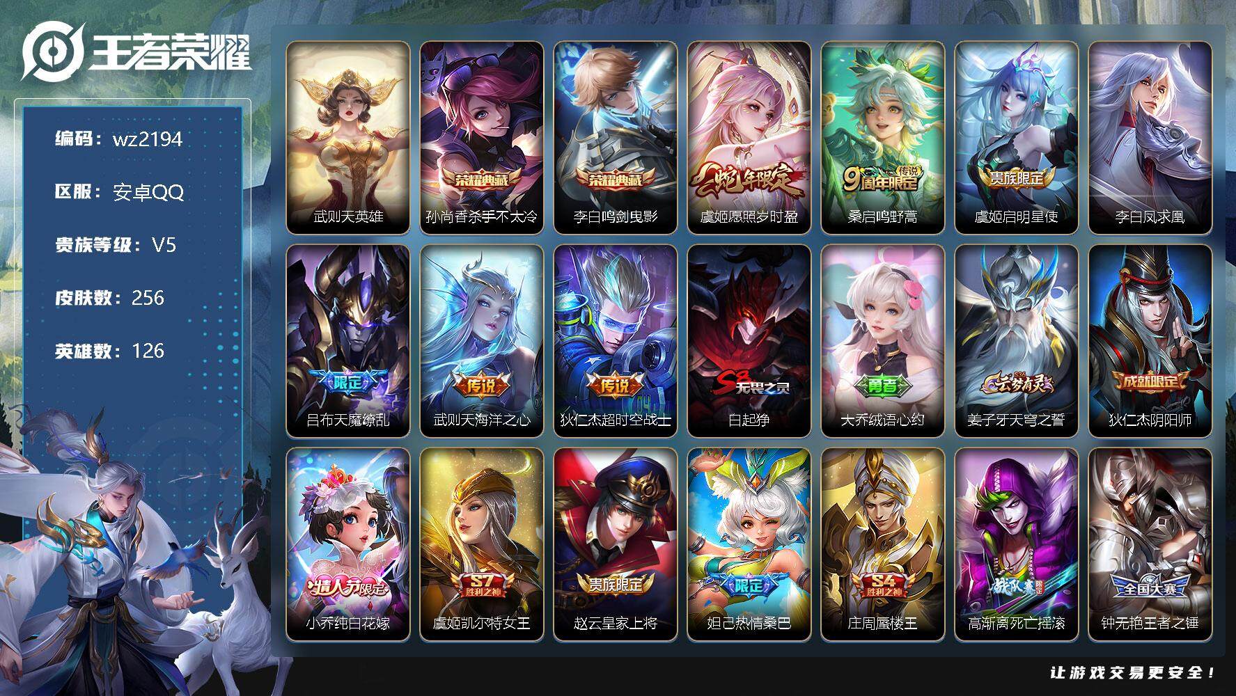 【游戏多多】 【可二次实名】【wz2194】安卓Q-V5-永恒钻石IV段位-126英雄-256皮肤-2典藏-0珍品无双-0无双-0珍品传说-7传说-56史诗 【荣耀典藏】:武则天英雄,孙尚香杀手不太冷,李白鸣剑曳影 【传说皮肤】:虞姬愿照岁时盈,桑启鸣野蒿,虞姬启明星使,李白凤求凰,吕布天魔缭乱,武则天海洋之心,狄仁杰超时空战士 【限定皮肤】:白起狰,大乔绒语心约,姜子牙天穹之誓,狄仁杰阴阳师,小乔纯白花嫁,虞姬凯尔特女王,赵云皇家上将,妲己热情桑巴,庄周蜃楼王,高渐离死亡摇滚,钟无艳王者之锤,孙膑妖精王,扁鹊炼金王,芈月重明,吕布天魔缭乱,夏侯惇朔风刀,甄姬游园惊梦,曹操烛龙,典韦穷奇,狄仁杰魔术师,狄仁杰万华元夜,达摩沙漠行僧,项羽海滩派对,老夫子醍醐杖,关羽冰锋战神,貂蝉逐梦之音,程咬金演武夺筹,兰陵王金庭之子,亚瑟狮心王,孙悟空美猴王,孙悟空至尊宝,牛魔御旌,李元芳云中旅人,虞姬启明星使,钟馗驱傩正仪,蔡文姬繁星吟游,太乙真人饕餮,鬼谷子原初探秘者,鬼谷子五谷丰年,苏烈千军破阵,百里玄策原初追逐者,弈星混沌棋,沈梦溪大漠名商,明世隐疑决卦,裴擒虎擒涛扼浪,狂铁御狮,米莱狄御霄,盾山御銮,上官婉儿梁祝,嫦娥拒霜思,桑启海盐诗旅,裴擒虎梅西,沈梦溪龙舞盛年,刘邦剑破天穹,关羽决胜骁骑,周瑜熔金海岸 【年限皮肤】:孙悟空美猴王,李白凤求凰 【赛季限定】:庄周蜃楼王,孙膑妖精王,扁鹊炼金王,白起狰,芈月重明,夏侯惇朔风刀,曹操烛龙,典韦穷奇,狄仁杰万华元夜,达摩沙漠行僧,老夫子醍醐杖,程咬金演武夺筹,兰陵王金庭之子,亚瑟狮心王,牛魔御旌,李元芳云中旅人,虞姬凯尔特女王,钟馗驱傩正仪,太乙真人饕餮,鬼谷子原初探秘者,苏烈千军破阵,百里玄策原初追逐者,弈星混沌棋,沈梦溪大漠名商,明世隐疑决卦,裴擒虎擒涛扼浪,狂铁御狮,米莱狄御霄,盾山御銮,桑启海盐诗旅,刘邦剑破天穹,姜子牙天穹之誓 【史诗皮肤】:项羽苍穹之光,露娜紫霞仙子,钟无艳王者之锤,赵云嘻哈天王,赵云皇家上将,貂蝉圣诞恋歌,甄姬冰雪圆舞曲,王昭君偶像歌手,狄仁杰魔术师,廉颇地狱岩魂,宫本武藏鬼剑武藏,孙尚香水果甜心,嬴政暗夜贵公子,嬴政摇滚巨星,妲己魅力维加斯,妲己女仆咖啡,吕布圣诞狂欢,刘禅绅士熊喵,小乔纯白花嫁,李白千年之狐,吕布末日机甲,妲己热情桑巴,张飞乱世虎臣,韩信白龙吟,关羽冰锋战神,貂蝉逐梦之音,孙悟空至尊宝,花木兰水晶猎龙者,小乔缤纷独角兽,兰陵王暗隐猎兽者,诸葛亮黄金分割率,甄姬游园惊梦,亚瑟心灵战警,雅典娜冰冠公主,安琪拉心灵骇客,百里守约特工魅影,铠曙光守护者,蔡文姬舞动绿茵,裴擒虎梅西,刘禅天才门将,李元芳逐浪之夏,程咬金功夫厨神,白起星夜王子,阿轲节奏热浪,大乔猫狗日记,狄仁杰鹰眼统帅,上官婉儿梁祝,蔡文姬繁星吟游,大乔白蛇,百里玄策原初追逐者,嫦娥拒霜思,鬼谷子五谷丰年,关羽决胜骁骑,亚连破空之剑,马可波罗星界特工,赵怀真器灵浮梦炉 【其他皮肤】:项羽海滩派对,韩信教廷特使,韩信街头霸王,露娜哥特玫瑰,阿轲致命风华,阿轲爱心护理,达摩大发明家,赵云白执事,赵云忍炎影,芈月红桃皇后,程咬金星际陆战队,程咬金爱与正义,白起白色死神,牛魔西部大镖客,扁鹊化身博士,庄周鲤鱼之梦,宫本武藏未来纪元,安琪拉玩偶对对碰,孙膑天使之翼,姜子牙时尚教父,妲己少女阿狸,典韦黄金武士,亚瑟死亡骑士,达摩拳王,孙悟空美猴王,花木兰兔女郎,甄姬花好人间,刘备万事如意,宫本武藏万象初新,亚瑟狮心王,后羿阿尔法小队,狄仁杰阴阳师,庄周蜃楼王,刘备纽约教父,高渐离死亡摇滚,孙膑妖精王,刘备汉昭烈帝,李元芳黑猫爱糖果,扁鹊炼金王,关羽龙腾万里,虞姬凯尔特女王,墨子进击墨子号,白起狰,钟无艳海滩丽影,太乙真人饕餮,宫本武藏霸王丸,曹操烛龙,王昭君幻想奇妙夜,芈月重明,狂铁命运角斗场,老夫子功夫老勺,牛魔制霸全明星,孙尚香沉稳之力,典韦穷奇,鬼谷子幻乐之宴,狂铁御狮,安琪拉如懿,大乔守护之力,项羽科学大爆炸,米莱狄御霄,明世隐虹云星官,张良幽兰居士,牛魔御旌,小乔丁香结,吕布野性能量,盾山御銮,孙膑归虚梦演,沈梦溪鲨炮海盗猫,姜子牙炽热元素使,夏侯惇朔风刀,弈星混沌棋,哪吒次元突破,鲁班七号黑桃队长,明世隐疑决卦,老夫子醍醐杖,鬼谷子原初探秘者,狄仁杰万华元夜,刘禅秘密基地,杨戬次元傲视,露娜瓷语鉴心,程咬金演武夺筹,钟馗驱傩正仪,鲁班大师乓乓大师,苏烈千军破阵,达摩沙漠行僧,程咬金无双福将,兰陵王金庭之子,沈梦溪大漠名商,李元芳云中旅人,桑启海盐诗旅,猪八戒潮玩探月行,裴擒虎擒涛扼浪,莱西奥西部游侠,曹操决胜大满贯,廉颇功夫炙烤,沈梦溪龙舞盛年,刘邦剑破天穹,姜子牙天穹之誓,周瑜熔金海岸,大乔绒语心约,孙悟空神迹守卫,盘古敬我三分,东皇太一噬灭天穹,亚瑟动物派对,太乙真人谧流熔炉,姜子牙星梦巡礼,少司缘灵