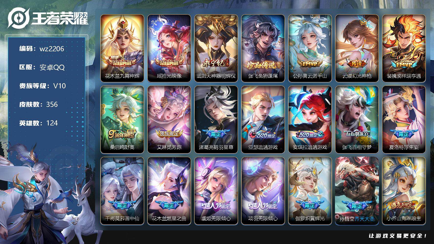 【游戏多多】 【可二次实名】【wz2206】安卓Q-V10-最强王者段位-124英雄-356皮肤-2典藏-0珍品无双-1无双-1珍品传说-41传说-108史诗 【英雄全皮】:橘右京全皮,张飞全皮,阿古朵全皮,夏洛特全皮,戈娅全皮,空空儿全皮,影全皮 【荣耀典藏】:花木兰九霄神辉,瑶拾光映像 【无双皮肤】:武则天神器明辉仪 【珍品传说】:张飞兔狲蓬尾 【传说皮肤】:公孙离云诺千山,云缨幻光神枪,裴擒虎祥瑞亨通,桑启鸣野蒿,艾琳觅芳踪,诸葛亮鹤羽星尊,亚瑟追逃游戏,安琪拉追逃游戏,张飞百相守梦,夏洛特浮生妄,干将莫邪画中仙,花木兰燃星之曲,虞姬无限倾心,项羽无限倾心,伽罗炽翼辉光,孙悟空齐天大圣,小乔山海琳琅生,曜山海苍雷引,李信山海炽霜斩,吕布怒海麟威,李白诗剑行,狄仁杰神器狴犴令,不知火舞绯月行,橘右京枫霜尽,后羿无尽星芒,马超无双飞将,孙策挚爱之约,露娜启示之音,瑶时之祈愿,孙尚香异界灵契,曜李逍遥 ,李元芳飞鸢探春,兰陵王默契交锋,镜炽阳神光,虞姬启明星使,孙悟空零号赤焰,曜云鹰飞将,貂蝉猫影幻舞,梦奇胖达荣荣,宫本武藏地狱之眼,狄仁杰超时空战士 【限定皮肤】:蒙犽顽岩魄,蔡文姬夏日便利店,虞姬夏日便利店,姜子牙天穹之誓,狄仁杰阴阳师,小乔山海琳琅生,赵云皇家上将,赵云龙胆,墨子降魔,妲己时之奇旅,孙尚香异界灵契,高渐离玩趣恶龙,阿轲迷踪丽影,钟无艳超时空战士,孙膑天狼运算者,扁鹊奇幻香踪,白起夜都怪侠,芈月幻夜卜梦,元歌无心,夏侯惇匿光决锋者,甄姬落雪兰心,马可波罗暗影游猎,马可波罗山海玄木吟,狄仁杰魔术师,狄仁杰神器狴犴令,达摩沙漠行僧,项羽海滩派对,项羽无限倾心,关羽百相守梦,安琪拉追逃游戏,露娜启示之音,王昭君午后时光,兰陵王默契交锋,兰陵王驯魔猎人,兰陵王金庭之子,花木兰默契交锋,花木兰燃星之曲,不知火舞绯月行,橘右京枫霜尽,亚瑟追逃游戏,孙悟空至尊宝,孙悟空零号赤焰,孙悟空孙行者,孙悟空齐天大圣,后羿无尽星芒,刘备百相守梦,张飞虎魄,张飞百相守梦,李元芳匿光侦查者,李元芳云中旅人,虞姬启明星使,虞姬无限倾心,杨戬潮玩骑兵,干将莫邪画中仙,鬼谷子五谷丰年,诸葛亮鹤羽星尊,大乔白鹤梁神女,黄忠烈魂,黄忠火炮绅士,铠青龙志,苏烈玄武志,沈梦溪大漠名商,沈梦溪匿光破解者,裴擒虎擒涛扼浪,狂铁电玩高手,瑶时之祈愿,瑶山海碧波行,云中君时之祈愿,李信山海炽霜斩,伽罗炽翼辉光,盾山梦圆繁星,孙策挚爱之约,上官婉儿梁祝,上官婉儿天狼绘梦者,上官婉儿神器万象笔,嫦娥暖冬兔眠,曜李逍遥 ,曜山海苍雷引,西施玲珑珍味,蒙犽狂想玩偶喵,鲁班大师探海日志,桑启海盐诗旅,夏洛特浮生妄,暃星界游侠,戈娅驭风魔法,阿古朵江河有灵,张良古海寻踪,艾琳觅芳踪,沈梦溪龙舞盛年,李元芳蔬乡物语,周瑜熔金海岸 【年限皮肤】:铠青龙志,苏烈玄武志,马超神威,黄忠烈魂,张飞虎魄,赵云龙胆,瑶山海碧波行,马可波罗山海玄木吟,李信山海炽霜斩,小乔山海琳琅生,曜山海苍雷引,伽罗炽翼辉光 【赛季限定】:达摩沙漠行僧,兰陵王金庭之子,张良古海寻踪,李元芳云中旅人,沈梦溪大漠名商,裴擒虎擒涛扼浪,鲁班大师探海日志,桑启海盐诗旅,姜子牙天穹之誓 【战令限定】:蔡文姬夏日便利店,虞姬夏日便利店,阿轲迷踪丽影,钟无艳超时空战士,扁鹊奇幻香踪,白起夜都怪侠,芈月幻夜卜梦,甄姬落雪兰心,马可波罗暗影游猎,王昭君午后时光,兰陵王驯魔猎人,杨戬潮玩骑兵,黄忠火炮绅士,狂铁电玩高手,嫦娥暖冬兔眠,西施玲珑珍味,蒙犽狂想玩偶喵,暃星界游侠,戈娅驭风魔法,李元芳蔬乡物语 【史诗皮肤】:鲁班七号电玩小子,阿轲暗夜猫娘,赵云皇家上将,赵云未来纪元,貂蝉圣诞恋歌,王昭君偶像歌手,狄仁杰魔术师,宫本武藏鬼剑武藏,孙尚香水果甜心,嬴政暗夜贵公子,嬴政摇滚巨星,妲己魅力维加斯,妲己女仆咖啡,墨子金属风暴,吕布圣诞狂欢,刘禅绅士熊喵,曹操幽灵船长,李白千年之狐,吕布末日机甲,张飞乱世虎臣,孙悟空至尊宝,花木兰水晶猎龙者,刘邦德古拉伯爵,夏侯惇乘风破浪,小乔缤纷独角兽,兰陵王暗隐猎兽者,亚瑟心灵战警,雅典娜冰冠公主,安琪拉心灵骇客,百里守约特工魅影,铠曙光守护者,刘禅天才门将,李元芳逐浪之夏,程咬金功夫厨神,白起星夜王子,阿轲节奏热浪,孙策猫狗日记,铠青龙志,苏烈玄武志,伽罗箭羽风息,狄仁杰鹰眼统帅,公孙离无限星赏官,兰陵王驯魔猎人,上官婉儿梁祝,不知火舞魅语,阿轲迷踪丽影,橘右京修罗,瑶遇见神鹿,马超神威,赵云龙胆,黄忠烈魂,孙尚香时之恋人,上官婉儿天狼绘梦者,马可波罗暗影游猎,张飞虎魄,蒙犽狂想玩偶喵,孙膑天狼运算者,花木兰默契交锋,百里玄策热力回旋,大乔白鹤梁神女,沈梦溪月团寄思,孙悟空孙行者,司马懿暗渊魔法,黄忠火炮绅士,云中君时之祈愿,夏洛特永昼,澜赏金猎手,艾琳奇遇舞章,夏侯惇匿光决锋者,貂蝉唤灵魅影,高渐离天秀音