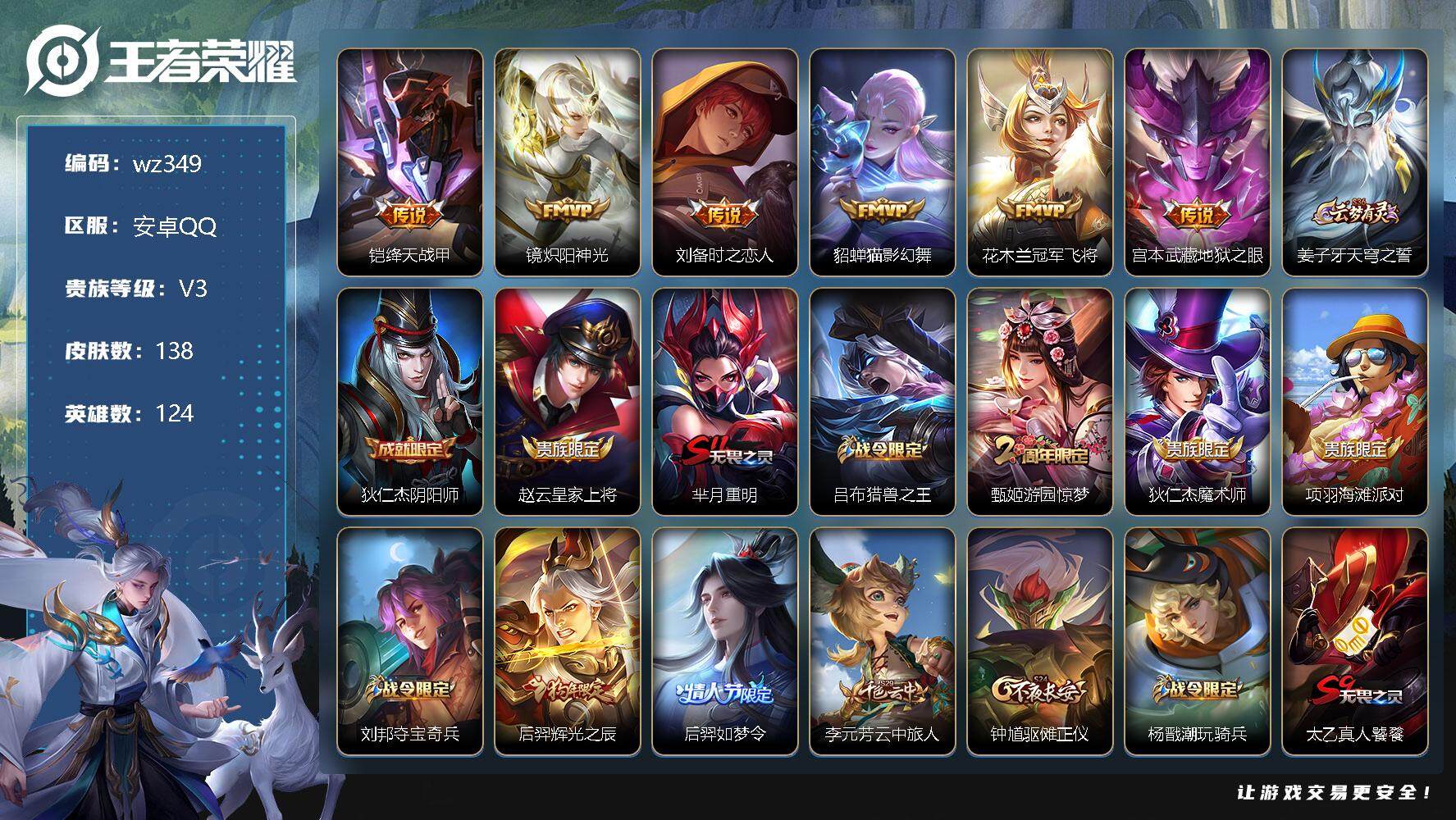 【游戏多多】 【可二次实名】【wz349】【商品标题】:安卓Q-V3-至尊星耀II段位-124英雄-138皮肤-0典藏-0珍品无双-0无双-0珍品传说-6传说-26史诗 【传说皮肤】:铠绛天战甲,镜炽阳神光,刘备时之恋人,貂蝉猫影幻舞,花木兰冠军飞将,宫本武藏地狱之眼 【限定皮肤】:姜子牙天穹之誓,狄仁杰阴阳师,赵云皇家上将,芈月重明,吕布猎兽之王,甄姬游园惊梦,狄仁杰魔术师,项羽海滩派对,刘邦夺宝奇兵,后羿辉光之辰,后羿如梦令,李元芳云中旅人,钟馗驱傩正仪,杨戬潮玩骑兵,太乙真人饕餮,鬼谷子五谷丰年,弈星混沌棋,沈梦溪星空之诺,明世隐疑决卦,裴擒虎擒涛扼浪,狂铁御狮,桑启海盐诗旅,鬼谷子天穹祈灯,沈梦溪龙舞盛年 【年限皮肤】:后羿辉光之辰 【赛季限定】:芈月重明,李元芳云中旅人,钟馗驱傩正仪,太乙真人饕餮,弈星混沌棋,明世隐疑决卦,裴擒虎擒涛扼浪,狂铁御狮,桑启海盐诗旅,鬼谷子天穹祈灯,姜子牙天穹之誓 【战令限定】:吕布猎兽之王,刘邦夺宝奇兵,杨戬潮玩骑兵,沈梦溪星空之诺 【史诗皮肤】:赵云皇家上将,赵云未来纪元,狄仁杰魔术师,孙尚香水果甜心,嬴政摇滚巨星,妲己魅力维加斯,妲己女仆咖啡,墨子金属风暴,吕布圣诞狂欢,曹操幽灵船长,李白千年之狐,花木兰水晶猎龙者,夏侯惇乘风破浪,小乔缤纷独角兽,甄姬游园惊梦,后羿辉光之辰,铠曙光守护者,程咬金功夫厨神,白起星夜王子,阿轲节奏热浪,孙策猫狗日记,狄仁杰鹰眼统帅,娜可露露晚萤,后羿如梦令,孙尚香时之恋人,鬼谷子五谷丰年 【其他皮肤】:项羽海滩派对,韩信教廷特使,露娜哥特玫瑰,阿轲爱心护理,赵云忍炎影,芈月红桃皇后,白起白色死神,扁鹊救世之瞳,安琪拉玩偶对对碰,姜子牙时尚教父,妲己少女阿狸,典韦黄金武士,亚瑟死亡骑士,达摩拳王,宫本武藏万象初新,后羿阿尔法小队,狄仁杰阴阳师,刘备纽约教父,刘备汉昭烈帝,钟无艳海滩丽影,太乙真人饕餮,王昭君幻想奇妙夜,芈月重明,狂铁命运角斗场,老夫子功夫老勺,诸葛亮掌控之力,狂铁御狮,吕布猎兽之王,小乔丁香结,沈梦溪星空之诺,弈星混沌棋,哪吒次元突破,明世隐疑决卦,刘邦夺宝奇兵,刘禅秘密基地,钟馗驱傩正仪,蒙恬蔚蓝守将,李元芳云中旅人,桑启海盐诗旅,猪八戒潮玩探月行,白起乐园追猎者,赵怀真太极少年,裴擒虎擒涛扼浪,杨戬潮玩骑兵,鬼谷子天穹祈灯,廉颇功夫炙烤,沈梦溪龙舞盛年,姜子牙天穹之誓,太乙真人谧流熔炉,姜子牙星梦巡礼,明世隐景韶洛都,戈娅玫蓝誓约,刘备浪漫序章,鲁班七号福禄兄弟,鲁班七号木偶奇遇记,项羽帝国元帅,老夫子潮流仙人,狄仁杰锦衣卫,曹操死神来了,曹操超能战警,张良一千零一夜,小乔万圣前夜,孙膑未来旅行,孙悟空西部大镖客,周瑜海军大将,后羿精灵王,刘禅英喵野望,兰陵王隐刃,李元芳特种部队,刘邦圣殿之光,虞姬加勒比小姐,蔡文姬蔷薇王座,夏侯惇战争骑士,雅典娜战争女神,苍维京掠夺者,杨戬埃及法老,太乙真人圆桌骑士,诸葛亮星航指挥官,东皇太一东海龙王,铠龙域领主,百里守约绝影神枪,百里玄策威尼斯狂欢,苏烈爱与和平,梦奇美梦成真,女娲尼罗河女神,明世隐占星师,公孙离花间舞,裴擒虎街头旋风,孙策海之征途,伽罗花见巫女,沈梦溪棒球奇才,李信灼热之刃,嫦娥露花倒影,盘古创世神祝,瑶森,马超幸存者,西施归虚梦演,鲁班大师归虚梦演,蒙犽归虚梦演,镜冰刃幻境,蒙恬秩序猎龙将,阿古朵熊喵少女,澜孤猎,司空震启蛰,云缨赤焰之缨,暃碧珀绯影 【营地ID】:545823290