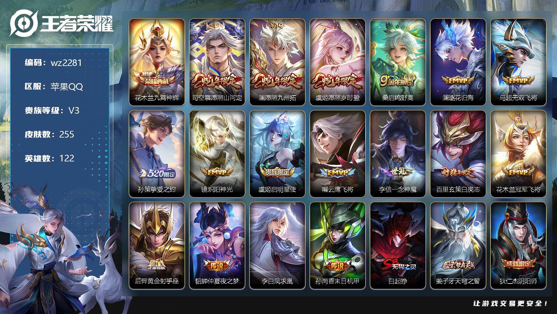 【游戏多多】 【可二次实名】【wz2281】苹果Q-V3-至尊星耀IV段位-122英雄-255皮肤-1典藏-0珍品无双-0无双-0珍品传说-17传说-76史诗 【荣耀典藏】:花木兰九霄神辉 【传说皮肤】:司空震愿照山河定,澜愿照九州拓,虞姬愿照岁时盈,桑启鸣野蒿,澜逐花归海,马超无双飞将,孙策挚爱之约,镜炽阳神光,虞姬启明星使,曜云鹰飞将,李信一念神魔,百里玄策白虎志,花木兰冠军飞将,后羿黄金射手座,貂蝉仲夏夜之梦,李白凤求凰,孙尚香末日机甲 【限定皮肤】:白起狰,姜子牙天穹之誓,狄仁杰阴阳师,虞姬凯尔特女王,赵云皇家上将,墨子神迹守卫,妲己时之彼端,嬴政白昼王子,孙尚香蔷薇恋人,鲁班七号狮舞东方,庄周高山流水,阿轲迷踪丽影,扁鹊炼金王,白起夜都怪侠,芈月重明,吕布猎兽之王,周瑜赤莲之焰,元歌云间偶戏,元歌无心,夏侯惇朔风刀,曹操烛龙,典韦穷奇,典韦蓝屏警告,马可波罗暗影游猎,狄仁杰魔术师,狄仁杰万华元夜,项羽海滩派对,老夫子醍醐杖,老夫子航海奇遇记,程咬金演武夺筹,刘邦夺宝奇兵,韩信逐梦之影,韩信飞衡,兰陵王驯魔猎人,兰陵王金庭之子,亚瑟潮玩骑士王,牛魔御旌,李元芳银河之约,李元芳云中旅人,虞姬启明星使,钟馗神迹守卫,钟馗驱傩正仪,杨玉环遇见飞天,女娲朔望之晖,雅典娜单词大作战,雅典娜黎明之约,太乙真人饕餮,鬼谷子原初探秘者,鬼谷子五谷丰年,百里玄策白虎志,百里玄策原初追逐者,弈星混沌棋,沈梦溪星空之诺,沈梦溪大漠名商,明世隐疑决卦,裴擒虎李小龙,裴擒虎擒涛扼浪,狂铁御狮,米莱狄御霄,云中君纤云弄巧,伽罗天狼溯光者,盾山御銮,孙策挚爱之约,猪八戒西部大镖客,上官婉儿梁祝,蒙犽狂想玩偶喵,鲁班大师探海日志,桑启海盐诗旅,阿古朵江河有灵,张良古海寻踪,裴擒虎梅西,蒙恬荣光圣徽,鬼谷子天穹祈灯,姬小满妄想食味,刘邦剑破天穹,程咬金群星魔术团 【年限皮肤】:百里玄策白虎志,李白凤求凰,韩信飞衡,马超神威 【赛季限定】:扁鹊炼金王,白起狰,芈月重明,夏侯惇朔风刀,曹操烛龙,典韦穷奇,狄仁杰万华元夜,老夫子醍醐杖,程咬金演武夺筹,兰陵王金庭之子,张良古海寻踪,牛魔御旌,李元芳云中旅人,虞姬凯尔特女王,钟馗驱傩正仪,雅典娜黎明之约,太乙真人饕餮,鬼谷子原初探秘者,百里玄策原初追逐者,弈星混沌棋,沈梦溪大漠名商,明世隐疑决卦,裴擒虎擒涛扼浪,狂铁御狮,米莱狄御霄,盾山御銮,鲁班大师探海日志,桑启海盐诗旅,鬼谷子天穹祈灯,蒙恬荣光圣徽,刘邦剑破天穹,姜子牙天穹之誓 【战令限定】:墨子神迹守卫,嬴政白昼王子,鲁班七号狮舞东方,阿轲迷踪丽影,白起夜都怪侠,吕布猎兽之王,周瑜赤莲之焰,元歌云间偶戏,典韦蓝屏警告,马可波罗暗影游猎,老夫子航海奇遇记,刘邦夺宝奇兵,兰陵王驯魔猎人,亚瑟潮玩骑士王,李元芳银河之约,钟馗神迹守卫,女娲朔望之晖,雅典娜单词大作战,沈梦溪星空之诺,猪八戒西部大镖客,蒙犽狂想玩偶喵 【史诗皮肤】:项羽苍穹之光,露娜紫霞仙子,阿轲暗夜猫娘,赵云皇家上将,赵云未来纪元,貂蝉圣诞恋歌,甄姬冰雪圆舞曲,王昭君偶像歌手,狄仁杰魔术师,廉颇地狱岩魂,宫本武藏鬼剑武藏,孙尚香蔷薇恋人,孙尚香水果甜心,妲己魅力维加斯,妲己女仆咖啡,墨子龙骑士,墨子金属风暴,吕布圣诞狂欢,刘禅绅士熊喵,曹操幽灵船长,李白千年之狐,吕布末日机甲,张飞乱世虎臣,韩信白龙吟,花木兰水晶猎龙者,刘邦德古拉伯爵,韩信逐梦之影,夏侯惇乘风破浪,小乔缤纷独角兽,兰陵王暗隐猎兽者,诸葛亮黄金分割率,亚瑟心灵战警,雅典娜冰冠公主,百里守约特工魅影,铠曙光守护者,蔡文姬舞动绿茵,裴擒虎梅西,刘禅天才门将,李元芳逐浪之夏,程咬金功夫厨神,白起星夜王子,杨玉环遇见飞天,嬴政白昼王子,典韦蓝屏警告,鲁班七号狮舞东方,狄仁杰鹰眼统帅,公孙离无限星赏官,兰陵王驯魔猎人,上官婉儿梁祝,李元芳银河之约,韩信飞衡,妲己时之彼端,不知火舞魅语,阿轲迷踪丽影,橘右京修罗,马超神威,马可波罗暗影游猎,蒙犽狂想玩偶喵,百里玄策原初追逐者,裴擒虎李小龙,云中君纤云弄巧,元歌云间偶戏,老夫子航海奇遇记,伽罗天狼溯光者,庄周高山流水,雅典娜黎明之约,夏洛特永昼,鬼谷子五谷丰年,元歌无心,刘禅电玩爆裂旋风,阿古朵江河有灵,蒙恬荣光圣徽,姬小满妄想食味,牛魔星界战将,赵怀真器灵浮梦炉,阿轲化蝶舞 【其他皮肤】:项羽海滩派对,韩信教廷特使,韩信街头霸王,露娜哥特玫瑰,阿轲爱心护理,达摩大发明家,赵云白执事,赵云忍炎影,程咬金星际陆战队,白起白色死神,武则天东方不败,扁鹊化身博士,安琪拉玩偶对对碰,孙膑天使之翼,妲己少女阿狸,典韦黄金武士,达摩拳王,花木兰兔女郎,张飞五福同心,甄姬花好人间,狄仁杰阴阳师,刘备纽约教父,扁鹊炼金王,关羽龙腾万里,虞姬凯尔特女王,白起狰,钟无艳海滩丽影,太乙真人饕餮,宫本武藏霸王丸,曹操烛龙,王昭君幻想奇妙夜,芈