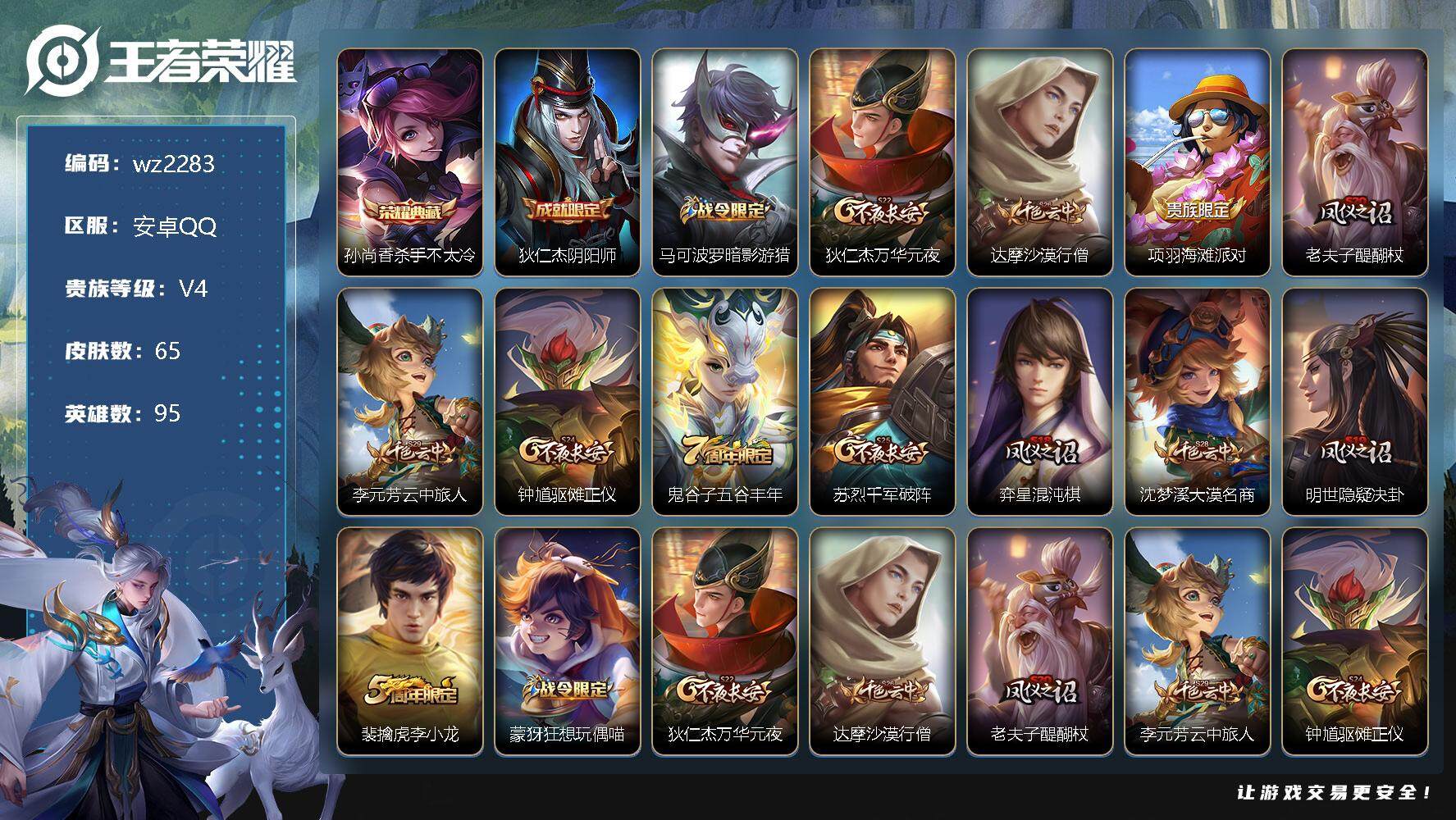 【游戏多多】 【可二次实名】【wz2283】安卓Q-V4-永恒钻石IV段位-95英雄-65皮肤-1典藏-0珍品无双-0无双-0珍品传说-0传说-21史诗 【荣耀典藏】:孙尚香杀手不太冷 【限定皮肤】:狄仁杰阴阳师,马可波罗暗影游猎,狄仁杰万华元夜,达摩沙漠行僧,项羽海滩派对,老夫子醍醐杖,李元芳云中旅人,钟馗驱傩正仪,鬼谷子五谷丰年,苏烈千军破阵,弈星混沌棋,沈梦溪大漠名商,明世隐疑决卦,裴擒虎李小龙,蒙犽狂想玩偶喵 【赛季限定】:狄仁杰万华元夜,达摩沙漠行僧,老夫子醍醐杖,李元芳云中旅人,钟馗驱傩正仪,苏烈千军破阵,弈星混沌棋,沈梦溪大漠名商,明世隐疑决卦 【战令限定】:马可波罗暗影游猎,蒙犽狂想玩偶喵 【史诗皮肤】:廉颇地狱岩魂,嬴政摇滚巨星,妲己魅力维加斯,花木兰水晶猎龙者,小乔缤纷独角兽,安琪拉心灵骇客,百里守约特工魅影,蔡文姬舞动绿茵,大乔猫狗日记,狄仁杰鹰眼统帅,马可波罗暗影游猎,蒙犽狂想玩偶喵,裴擒虎李小龙,鬼谷子五谷丰年,孙膑茶境仙,阿轲化蝶舞,刘禅鸭鸭历险记,狂铁龙之律动,后羿石田雨龙,黄忠百相守梦,公孙离涂山容容 【其他皮肤】:项羽海滩派对,韩信教廷特使,芈月红桃皇后,妲己少女阿狸,典韦黄金武士,亚瑟死亡骑士,达摩拳王,狄仁杰阴阳师,刘备汉昭烈帝,关羽龙腾万里,老夫子功夫老勺,孙尚香沉稳之力,小乔丁香结,弈星混沌棋,明世隐疑决卦,老夫子醍醐杖,狂铁特工战影,狄仁杰万华元夜,钟馗驱傩正仪,苏烈千军破阵,达摩沙漠行僧,沈梦溪大漠名商,李元芳云中旅人,猪八戒潮玩探月行,莱西奥西部游侠,太乙真人谧流熔炉,马超访茗客,钟馗虚灵犬护,沈梦溪鸭鸭历险记,姬小满小满鸭,白起死霸装,甄姬逆浪荇歌,庄周锦麟游梦,莱西奥踏浪烽翎,张良罗小黑战记,张良一千零一夜,苍维京掠夺者,哪吒三太子,铠龙域领主,女娲尼罗河女神,孙策海之征途,伽罗花见巫女,上官婉儿修竹墨客 【内测皮肤】:狂铁特工战影 【营地ID】:528957284