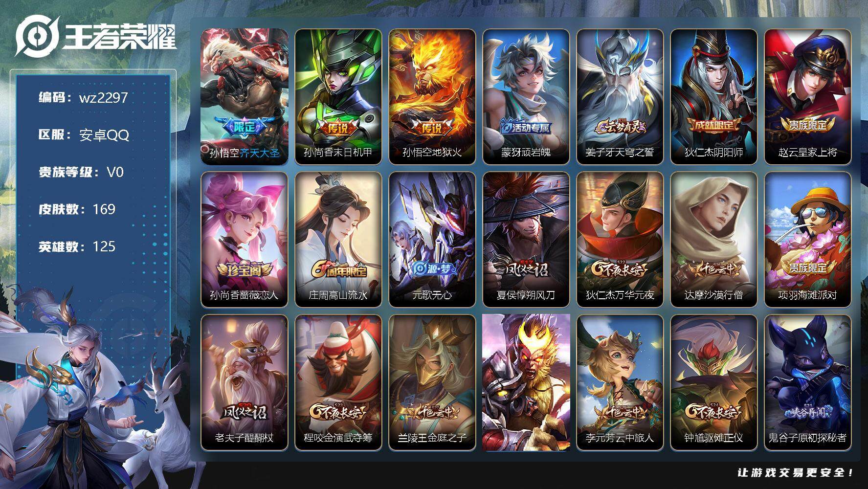 【游戏多多】 【可二次实名】【wz2297】安卓Q-V0-尊贵铂金III段位-125英雄-169皮肤-0典藏-0珍品无双-0无双-0珍品传说-3传说-25史诗 【传说皮肤】:孙悟空齐天大圣,孙尚香末日机甲,孙悟空地狱火 【限定皮肤】:蒙犽顽岩魄,姜子牙天穹之誓,狄仁杰阴阳师,赵云皇家上将,孙尚香蔷薇恋人,庄周高山流水,元歌无心,夏侯惇朔风刀,狄仁杰万华元夜,达摩沙漠行僧,项羽海滩派对,老夫子醍醐杖,程咬金演武夺筹,兰陵王金庭之子,孙悟空齐天大圣,李元芳云中旅人,钟馗驱傩正仪,鬼谷子原初探秘者,鬼谷子五谷丰年,苏烈千军破阵,弈星混沌棋,沈梦溪大漠名商,明世隐疑决卦,裴擒虎擒涛扼浪,盾山御銮,上官婉儿梁祝,上官婉儿天狼绘梦者,鲁班大师探海日志,桑启海盐诗旅,艾琳女武神,张良古海寻踪,鬼谷子天穹祈灯,沈梦溪龙舞盛年,刘邦剑破天穹,程咬金群星魔术团,周瑜熔金海岸 【赛季限定】:夏侯惇朔风刀,狄仁杰万华元夜,达摩沙漠行僧,老夫子醍醐杖,程咬金演武夺筹,兰陵王金庭之子,张良古海寻踪,李元芳云中旅人,钟馗驱傩正仪,鬼谷子原初探秘者,苏烈千军破阵,弈星混沌棋,沈梦溪大漠名商,明世隐疑决卦,裴擒虎擒涛扼浪,盾山御銮,鲁班大师探海日志,桑启海盐诗旅,鬼谷子天穹祈灯,刘邦剑破天穹,姜子牙天穹之誓 【史诗皮肤】:赵云皇家上将,赵云未来纪元,甄姬冰雪圆舞曲,宫本武藏鬼剑武藏,孙尚香蔷薇恋人,孙尚香水果甜心,嬴政摇滚巨星,妲己魅力维加斯,妲己女仆咖啡,墨子金属风暴,吕布圣诞狂欢,张飞乱世虎臣,花木兰水晶猎龙者,夏侯惇乘风破浪,兰陵王暗隐猎兽者,铠曙光守护者,孙策猫狗日记,狄仁杰鹰眼统帅,上官婉儿梁祝,上官婉儿天狼绘梦者,庄周高山流水,澜赏金猎手,鬼谷子五谷丰年,元歌无心,蒙犽顽岩魄 【其他皮肤】:项羽海滩派对,韩信教廷特使,韩信街头霸王,露娜哥特玫瑰,阿轲爱心护理,达摩大发明家,赵云白执事,赵云忍炎影,芈月红桃皇后,艾琳女武神,扁鹊化身博士,扁鹊救世之瞳,宫本武藏未来纪元,安琪拉玩偶对对碰,姜子牙时尚教父,妲己少女阿狸,典韦黄金武士,亚瑟死亡骑士,花木兰兔女郎,张飞五福同心,甄姬花好人间,刘备万事如意,宫本武藏万象初新,后羿阿尔法小队,狄仁杰阴阳师,刘备纽约教父,关羽龙腾万里,钟无艳海滩丽影,老夫子功夫老勺,孙尚香沉稳之力,诸葛亮掌控之力,李白敏锐之力,鬼谷子幻乐之宴,明世隐虹云星官,吕布野性能量,盾山御銮,孙膑归虚梦演,沈梦溪鲨炮海盗猫,姜子牙炽热元素使,夏侯惇朔风刀,弈星混沌棋,哪吒次元突破,明世隐疑决卦,盾山圆桌骑士,老夫子醍醐杖,狂铁特工战影,鬼谷子原初探秘者,狄仁杰万华元夜,刘禅秘密基地,程咬金演武夺筹,张良缤纷绘卷,钟馗驱傩正仪,鲁班大师乓乓大师,苏烈千军破阵,达摩沙漠行僧,程咬金无双福将,兰陵王金庭之子,刘禅唤灵魔甲,沈梦溪大漠名商,李元芳云中旅人,桑启海盐诗旅,海月幻泉雾影,猪八戒潮玩探月行,裴擒虎擒涛扼浪,太乙真人劲辣红锅,鲁班大师探海日志,李元芳妄想特派,哪吒热血海滩,张良古海寻踪,后羿完美运算,鬼谷子天穹祈灯,嫦娥漠中幻影,廉颇功夫炙烤,沈梦溪龙舞盛年,钟无艳春野之旅,刘邦剑破天穹,程咬金群星魔术团,大司命暗都幽影,貂蝉长夏之忆,姜子牙天穹之誓,周瑜熔金海岸,东皇太一噬灭天穹,干将莫邪雾都夜雨,苍苍林狼骑,典韦铁骨偃魂,姜子牙星梦巡礼,钟馗虚灵犬护,苏烈春野闲踪,白起死霸装,鲁班七号福禄兄弟,鲁班七号木偶奇遇记,高渐离金属狂潮,项羽帝国元帅,露娜绯红之刃,钟无艳生化警戒,貂蝉异域舞娘,花木兰剑舞者,老夫子潮流仙人,王昭君精灵公主,狄仁杰锦衣卫,曹操超能战警,张良一千零一夜,小乔万圣前夜,孙悟空西部大镖客,周瑜海军大将,兰陵王隐刃,李白范海辛,钟馗地府判官,李元芳特种部队,虞姬加勒比小姐,关羽天启骑士,蔡文姬蔷薇王座,夏侯惇战争骑士,马可波罗激情绿茵,诸葛亮星航指挥官,黄忠芝加哥教父,东皇太一东海龙王,铠龙域领主,百里守约绝影神枪,梦奇美梦成真,公孙离花间舞,裴擒虎街头旋风,弈星踏雪寻梅,米莱狄精准探案法,孙策海之征途,司马懿魇语军师,盾山极冰防御线,伽罗花见巫女,沈梦溪棒球奇才,李信灼热之刃,上官婉儿修竹墨客,嫦娥露花倒影,猪八戒年年有余,曜归虚梦演,马超幸存者,蒙犽归虚梦演,阿古朵熊喵少女,澜孤猎,司空震启蛰,云缨赤焰之缨,暃碧珀绯影 【内测皮肤】:孙尚香蔷薇恋人,艾琳女武神,狂铁特工战影 【营地ID】:1707372741