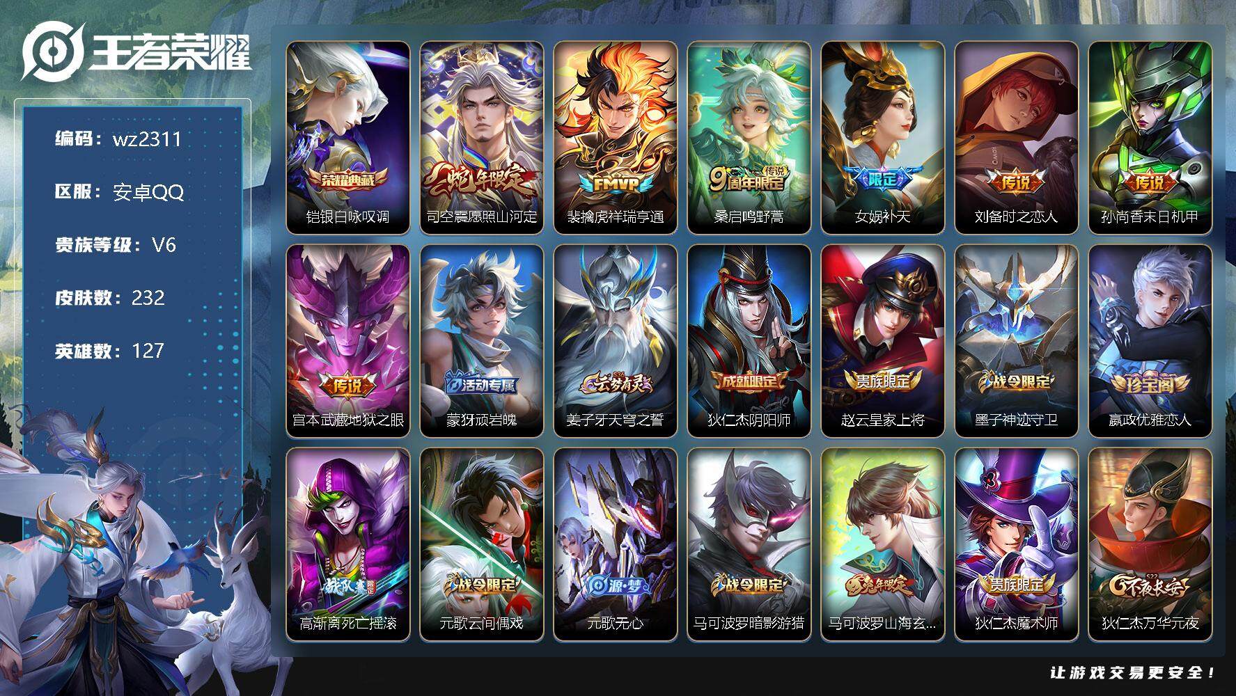 【游戏多多】 【可二次实名】【wz2311】安卓Q-V6-至尊星耀II段位-127英雄-232皮肤-1典藏-0珍品无双-0无双-0珍品传说-7传说-59史诗 【英雄全皮】:鬼谷子全皮,蒙恬全皮 【荣耀典藏】:铠银白咏叹调 【传说皮肤】:司空震愿照山河定,裴擒虎祥瑞亨通,桑启鸣野蒿,女娲补天,刘备时之恋人,孙尚香末日机甲,宫本武藏地狱之眼 【限定皮肤】:蒙犽顽岩魄,姜子牙天穹之誓,狄仁杰阴阳师,赵云皇家上将,墨子神迹守卫,嬴政优雅恋人,高渐离死亡摇滚,元歌云间偶戏,元歌无心,马可波罗暗影游猎,马可波罗山海玄木吟,狄仁杰魔术师,狄仁杰万华元夜,达摩沙漠行僧,项羽海滩派对,老夫子醍醐杖,老夫子航海奇遇记,程咬金演武夺筹,兰陵王金庭之子,亚瑟潮玩骑士王,后羿圣弓游侠,李元芳银河之约,李元芳云中旅人,钟馗驱傩正仪,女娲朔望之晖,女娲补天,干将莫邪真爱魔法,雅典娜黎明之约,鬼谷子原初探秘者,鬼谷子五谷丰年,苏烈千军破阵,百里玄策原初追逐者,弈星混沌棋,梦奇顽趣,沈梦溪星空之诺,沈梦溪大漠名商,明世隐疑决卦,裴擒虎擒涛扼浪,云中君纤云弄巧,嫦娥拒霜思,嫦娥暖冬兔眠,鲁班大师探海日志,桑启海盐诗旅,暃星界游侠,艾琳女武神,张良古海寻踪,蒙恬荣光圣徽,高渐离燃音魔法,鬼谷子天穹祈灯,姬小满妄想食味,沈梦溪龙舞盛年,刘邦剑破天穹 【年限皮肤】:马可波罗山海玄木吟 【赛季限定】:狄仁杰万华元夜,达摩沙漠行僧,老夫子醍醐杖,程咬金演武夺筹,兰陵王金庭之子,张良古海寻踪,李元芳云中旅人,钟馗驱傩正仪,雅典娜黎明之约,鬼谷子原初探秘者,苏烈千军破阵,百里玄策原初追逐者,弈星混沌棋,梦奇顽趣,沈梦溪大漠名商,明世隐疑决卦,裴擒虎擒涛扼浪,鲁班大师探海日志,桑启海盐诗旅,鬼谷子天穹祈灯,蒙恬荣光圣徽,刘邦剑破天穹,姜子牙天穹之誓 【战令限定】:墨子神迹守卫,元歌云间偶戏,马可波罗暗影游猎,老夫子航海奇遇记,亚瑟潮玩骑士王,后羿圣弓游侠,李元芳银河之约,女娲朔望之晖,干将莫邪真爱魔法,沈梦溪星空之诺,嫦娥暖冬兔眠,暃星界游侠,高渐离燃音魔法 【史诗皮肤】:项羽苍穹之光,赵云皇家上将,赵云未来纪元,甄姬冰雪圆舞曲,狄仁杰魔术师,廉颇地狱岩魂,宫本武藏鬼剑武藏,孙尚香水果甜心,嬴政优雅恋人,妲己魅力维加斯,妲己女仆咖啡,墨子金属风暴,吕布圣诞狂欢,曹操幽灵船长,李白千年之狐,吕布末日机甲,张飞乱世虎臣,花木兰水晶猎龙者,刘邦德古拉伯爵,夏侯惇乘风破浪,兰陵王暗隐猎兽者,诸葛亮黄金分割率,雅典娜冰冠公主,安琪拉心灵骇客,百里守约特工魅影,铠曙光守护者,刘禅天才门将,李元芳逐浪之夏,白起星夜王子,孙策猫狗日记,伽罗箭羽风息,狄仁杰鹰眼统帅,李元芳银河之约,橘右京修罗,马可波罗暗影游猎,百里玄策原初追逐者,云中君纤云弄巧,元歌云间偶戏,蒙犽龙鼓争鸣,老夫子航海奇遇记,干将莫邪真爱魔法,嫦娥拒霜思,雅典娜黎明之约,夏洛特永昼,澜赏金猎手,鬼谷子五谷丰年,元歌无心,梦奇顽趣,暃星界游侠,马可波罗山海玄木吟,高渐离燃音魔法,蒙恬荣光圣徽,姬小满妄想食味,蒙犽顽岩魄,牛魔星界战将,孙膑茶境仙,狂铁龙之律动,黄忠百相守梦,公孙离涂山容容 【其他皮肤】:项羽海滩派对,韩信教廷特使,韩信街头霸王,露娜哥特玫瑰,达摩大发明家,赵云白执事,赵云忍炎影,芈月红桃皇后,艾琳女武神,程咬金爱与正义,白起白色死神,牛魔西部大镖客,扁鹊化身博士,扁鹊救世之瞳,孙膑天使之翼,妲己少女阿狸,典韦黄金武士,亚瑟死亡骑士,达摩拳王,花木兰兔女郎,张飞五福同心,刘备万事如意,宫本武藏万象初新,后羿阿尔法小队,狄仁杰阴阳师,刘备纽约教父,高渐离死亡摇滚,刘备汉昭烈帝,关羽龙腾万里,墨子进击墨子号,钟无艳海滩丽影,王昭君幻想奇妙夜,狂铁命运角斗场,老夫子功夫老勺,孙尚香沉稳之力,诸葛亮掌控之力,李白敏锐之力,鬼谷子幻乐之宴,苏烈坚韧之力,明世隐虹云星官,庄周奇妙博物学,女娲朔望之晖,吕布野性能量,孙膑归虚梦演,沈梦溪鲨炮海盗猫,姜子牙炽热元素使,沈梦溪星空之诺,弈星混沌棋,哪吒次元突破,明世隐疑决卦,盾山圆桌骑士,老夫子醍醐杖,狂铁特工战影,鬼谷子原初探秘者,狄仁杰万华元夜,亚瑟潮玩骑士王,刘禅秘密基地,程咬金演武夺筹,张良缤纷绘卷,钟馗驱傩正仪,墨子神迹守卫,鲁班大师乓乓大师,苏烈千军破阵,后羿圣弓游侠,典韦铁甲之心,马可波罗潮玩牛仔,达摩沙漠行僧,程咬金无双福将,刘邦虎啸剑宗,兰陵王金庭之子,刘禅唤灵魔甲,沈梦溪大漠名商,蒙犽胡桃狂想曲,蒙恬蔚蓝守将,李元芳云中旅人,戈娅危途狂花,刘备潮玩造梦师,桑启海盐诗旅,嫦娥暖冬兔眠,海月幻泉雾影,猪八戒潮玩探月行,白起乐园追猎者,裴擒虎擒涛扼浪,鲁班大师探海日志,姬小满零食大作战,李元芳妄想特派,哪吒热血海滩,张良古海寻踪,鬼谷子天穹祈灯,廉颇功夫炙烤,沈梦溪龙舞盛年,刘邦剑破天穹,大司命