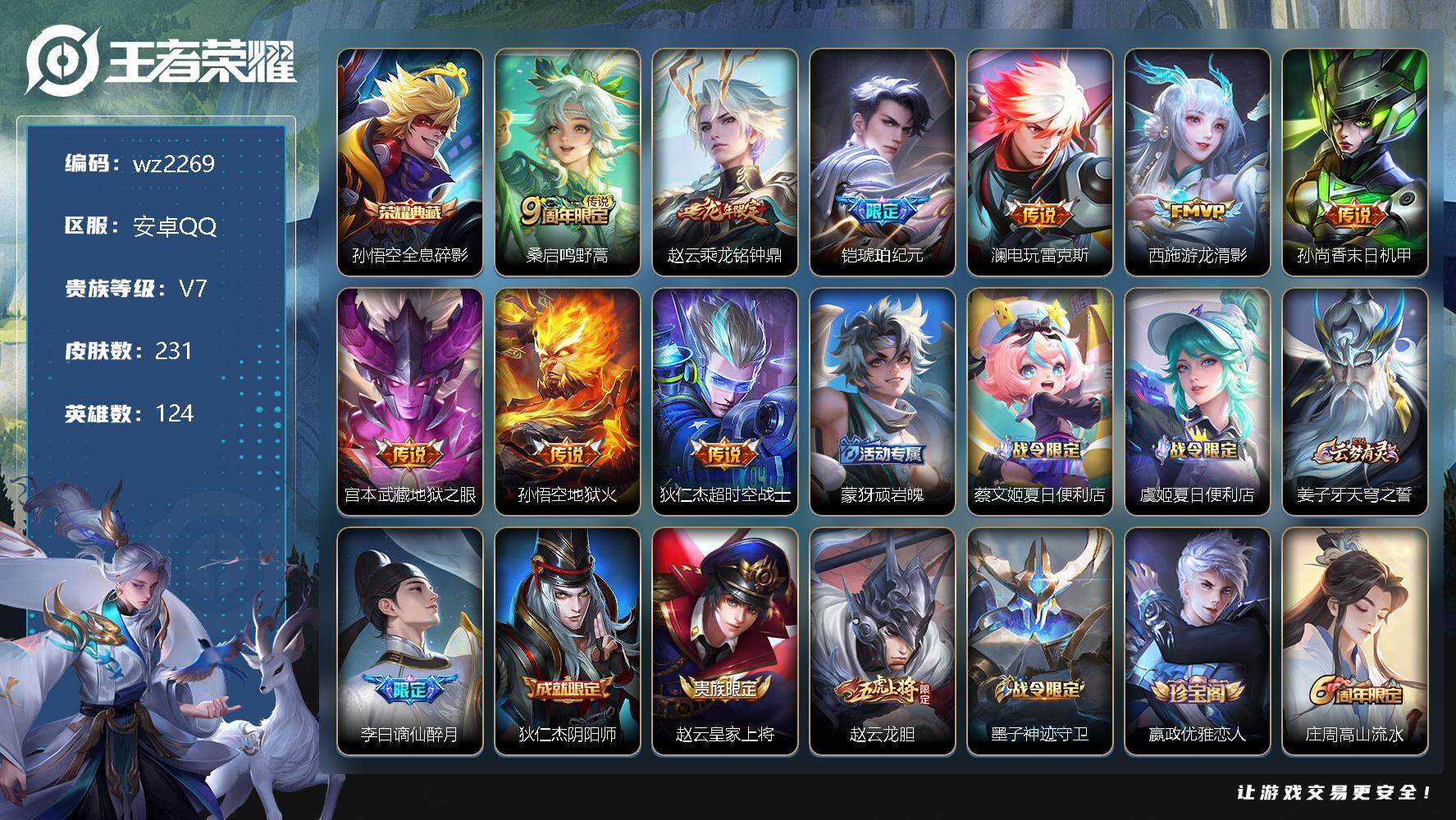 【游戏多多】 【可二次实名】【wz2269】安卓Q-V7-荣耀黄金II段位-124英雄-231皮肤-1典藏-0珍品无双-0无双-0珍品传说-9传说-61史诗 【荣耀典藏】:孙悟空全息碎影 【传说皮肤】:桑启鸣野蒿,赵云乘龙铭钟鼎,铠琥珀纪元,澜电玩雷克斯,西施游龙清影,孙尚香末日机甲,宫本武藏地狱之眼,孙悟空地狱火,狄仁杰超时空战士 【限定皮肤】:蒙犽顽岩魄,蔡文姬夏日便利店,虞姬夏日便利店,姜子牙天穹之誓,李白谪仙醉月,狄仁杰阴阳师,赵云皇家上将,赵云龙胆,墨子神迹守卫,嬴政优雅恋人,庄周高山流水,芈月重明,吕布猎兽之王,周瑜赤莲之焰,夏侯惇朔风刀,典韦穷奇,狄仁杰魔术师,狄仁杰万华元夜,项羽海滩派对,老夫子醍醐杖,老夫子航海奇遇记,程咬金演武夺筹,韩信逐梦之影,韩信飞衡,兰陵王驯魔猎人,孙悟空至尊宝,孙悟空孙行者,牛魔御旌,后羿圣弓游侠,李元芳匿光侦查者,李元芳云中旅人,钟馗驱傩正仪,干将莫邪真爱魔法,雅典娜黎明之约,鬼谷子原初探秘者,苏烈千军破阵,百里玄策原初追逐者,弈星混沌棋,明世隐疑决卦,裴擒虎李小龙,裴擒虎擒涛扼浪,狂铁御狮,云中君纤云弄巧,伽罗天狼溯光者,盾山御銮,上官婉儿梁祝,嫦娥拒霜思,西施玲珑珍味,鲁班大师探海日志,戈娅驭风魔法,艾琳女武神,艾琳流音漫舞,司空震地狱燃心,阿古朵江河有灵,张良古海寻踪,蒙犽百解令,蒙恬荣光圣徽,高渐离燃音魔法,妲己灵卜魔法,鬼谷子天穹祈灯,铠琥珀纪元,赵云乘龙铭钟鼎,沈梦溪龙舞盛年,鲁班七号蔬乡物语,李元芳蔬乡物语,刘邦剑破天穹,镜青焰无极,项羽苍威无极,刘备异域游侠 【年限皮肤】:韩信飞衡,赵云龙胆,赵云乘龙铭钟鼎 【赛季限定】:芈月重明,夏侯惇朔风刀,典韦穷奇,狄仁杰万华元夜,老夫子醍醐杖,程咬金演武夺筹,张良古海寻踪,牛魔御旌,李元芳云中旅人,钟馗驱傩正仪,雅典娜黎明之约,鬼谷子原初探秘者,苏烈千军破阵,百里玄策原初追逐者,弈星混沌棋,明世隐疑决卦,裴擒虎擒涛扼浪,狂铁御狮,盾山御銮,鲁班大师探海日志,鬼谷子天穹祈灯,蒙恬荣光圣徽,刘邦剑破天穹,姜子牙天穹之誓 【战令限定】:墨子神迹守卫,蔡文姬夏日便利店,虞姬夏日便利店,吕布猎兽之王,周瑜赤莲之焰,老夫子航海奇遇记,兰陵王驯魔猎人,艾琳流音漫舞,后羿圣弓游侠,干将莫邪真爱魔法,西施玲珑珍味,司空震地狱燃心,戈娅驭风魔法,高渐离燃音魔法,妲己灵卜魔法,鲁班七号蔬乡物语,李元芳蔬乡物语,镜青焰无极,项羽苍威无极 【史诗皮肤】:露娜紫霞仙子,赵云皇家上将,赵云未来纪元,貂蝉圣诞恋歌,甄姬冰雪圆舞曲,王昭君偶像歌手,狄仁杰魔术师,宫本武藏鬼剑武藏,孙尚香水果甜心,嬴政优雅恋人,嬴政摇滚巨星,墨子龙骑士,墨子金属风暴,吕布圣诞狂欢,吕布末日机甲,张飞乱世虎臣,孙悟空至尊宝,花木兰水晶猎龙者,刘邦德古拉伯爵,韩信逐梦之影,夏侯惇乘风破浪,小乔缤纷独角兽,兰陵王暗隐猎兽者,诸葛亮黄金分割率,雅典娜冰冠公主,百里守约特工魅影,刘禅天才门将,李元芳逐浪之夏,程咬金功夫厨神,白起星夜王子,孙策猫狗日记,伽罗箭羽风息,狄仁杰鹰眼统帅,兰陵王驯魔猎人,上官婉儿梁祝,娜可露露晚萤,韩信飞衡,赵云龙胆,百里玄策原初追逐者,裴擒虎李小龙,云中君纤云弄巧,老夫子航海奇遇记,伽罗天狼溯光者,干将莫邪真爱魔法,孙悟空孙行者,庄周高山流水,嫦娥拒霜思,雅典娜黎明之约,戈娅驭风魔法,李元芳匿光侦查者,司空震地狱燃心,阿古朵江河有灵,蒙犽百解令,妲己灵卜魔法,高渐离燃音魔法,蒙恬荣光圣徽,鲁班七号蔬乡物语,镜青焰无极,蔡文姬夏日便利店,蒙犽顽岩魄,亚连破空之剑,李白谪仙醉月 【其他皮肤】:项羽海滩派对,韩信教廷特使,韩信街头霸王,露娜哥特玫瑰,达摩大发明家,赵云忍炎影,芈月红桃皇后,艾琳女武神,白起白色死神,扁鹊化身博士,宫本武藏未来纪元,安琪拉玩偶对对碰,妲己少女阿狸,典韦黄金武士,亚瑟死亡骑士,达摩拳王,花木兰兔女郎,张飞五福同心,甄姬花好人间,刘备万事如意,宫本武藏万象初新,狄仁杰阴阳师,刘备纽约教父,刘备汉昭烈帝,关羽龙腾万里,钟无艳海滩丽影,宫本武藏霸王丸,王昭君幻想奇妙夜,芈月重明,狂铁命运角斗场,老夫子功夫老勺,典韦穷奇,诸葛亮掌控之力,李白敏锐之力,鬼谷子幻乐之宴,狂铁御狮,苏烈坚韧之力,吕布猎兽之王,明世隐虹云星官,牛魔御旌,小乔丁香结,吕布野性能量,盾山御銮,孙膑归虚梦演,沈梦溪鲨炮海盗猫,姜子牙炽热元素使,夏侯惇朔风刀,周瑜赤莲之焰,弈星混沌棋,哪吒次元突破,鲁班七号黑桃队长,明世隐疑决卦,盾山圆桌骑士,老夫子醍醐杖,狂铁特工战影,鬼谷子原初探秘者,狄仁杰万华元夜,刘禅秘密基地,露娜瓷语鉴心,程咬金演武夺筹,张良缤纷绘卷,钟馗驱傩正仪,墨子神迹守卫,鲁班大师乓乓大师,苏烈千军破阵,后羿圣弓游侠,典韦铁甲之心,程咬金无双福将,刘邦虎啸剑宗,蒙恬蔚蓝守将,李元芳云中