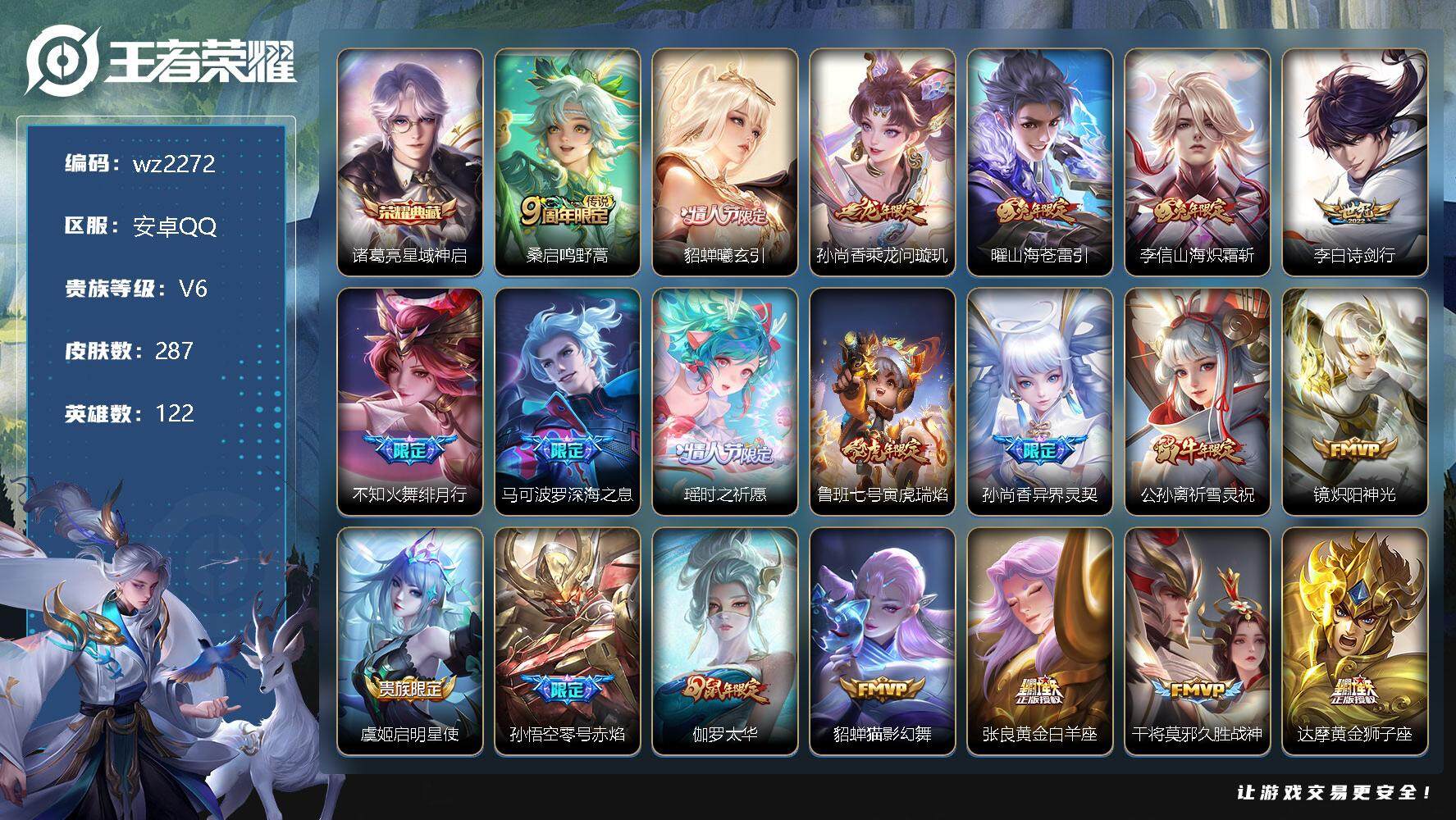 【游戏多多】 【可二次实名】【wz2272】安卓Q-V6-尊贵铂金II段位-122英雄-287皮肤-1典藏-0珍品无双-0无双-0珍品传说-24传说-90史诗 【荣耀典藏】:诸葛亮星域神启 【传说皮肤】:桑启鸣野蒿,貂蝉曦玄引,孙尚香乘龙问璇玑,曜山海苍雷引,李信山海炽霜斩,李白诗剑行,不知火舞绯月行,马可波罗深海之息,瑶时之祈愿,鲁班七号寅虎瑞焰,孙尚香异界灵契,公孙离祈雪灵祝,镜炽阳神光,虞姬启明星使,孙悟空零号赤焰,伽罗太华,貂蝉猫影幻舞,张良黄金白羊座,干将莫邪久胜战神,达摩黄金狮子座,后羿黄金射手座,貂蝉仲夏夜之梦,孙尚香末日机甲,狄仁杰超时空战士 【限定皮肤】:狄仁杰阴阳师,廉颇寅虎御盾,赵云皇家上将,赵云百木心枪,墨子神迹守卫,妲己时之彼端,孙尚香异界灵契,鲁班七号狮舞东方,鲁班七号寅虎瑞焰,庄周高山流水,钟无艳超时空战士,孙膑天狼运算者,白起夜都怪侠,芈月白晶晶,芈月幻夜卜梦,元歌云间偶戏,元歌无心,夏侯惇朔风刀,夏侯惇匿光决锋者,甄姬落雪兰心,马可波罗逐梦之星,马可波罗暗影游猎,马可波罗深海之息,马可波罗山海玄木吟,狄仁杰魔术师,狄仁杰万华元夜,达摩星际陆战队,达摩沙漠行僧,项羽海滩派对,老夫子醍醐杖,老夫子航海奇遇记,程咬金演武夺筹,韩信飞衡,王昭君午后时光,兰陵王金庭之子,花木兰默契交锋,不知火舞绯月行,亚瑟潮玩骑士王,孙悟空至尊宝,孙悟空零号赤焰,牛魔御旌,李元芳银河之约,李元芳云中旅人,虞姬霸王别姬,虞姬启明星使,钟馗神迹守卫,钟馗驱傩正仪,干将莫邪胡桃夹子,雅典娜单词大作战,雅典娜黎明之约,蔡文姬繁星吟游,鬼谷子原初探秘者,鬼谷子五谷丰年,黄忠火炮绅士,苏烈千军破阵,百里玄策原初追逐者,百里守约朱雀志,弈星混沌棋,梦奇顽趣,公孙离祈雪灵祝,公孙离玉兔公主,沈梦溪星空之诺,沈梦溪大漠名商,明世隐疑决卦,明世隐吟游魔法,裴擒虎天狼狩猎者,裴擒虎李小龙,裴擒虎擒涛扼浪,狂铁电玩高手,米莱狄胡桃异想国,瑶时之祈愿,云中君纤云弄巧,李信山海炽霜斩,伽罗太华,盾山御銮,猪八戒西部大镖客,猪八戒猪悟能,上官婉儿梁祝,上官婉儿天狼绘梦者,上官婉儿神器万象笔,嫦娥拒霜思,嫦娥暖冬兔眠,曜山海苍雷引,蒙犽狂想玩偶喵,鲁班大师探海日志,镜匿光追影者,桑启海盐诗旅,暃星界游侠,艾琳女武神,张良古海寻踪,蒙恬荣光圣徽,高渐离燃音魔法,妲己灵卜魔法,鬼谷子天穹祈灯,伽罗琥珀纪元,孙尚香乘龙问璇玑,貂蝉曦玄引,李元芳蔬乡物语,周瑜熔金海岸 【年限皮肤】:百里守约朱雀志,鲁班七号寅虎瑞焰,廉颇寅虎御盾,公孙离祈雪灵祝,伽罗太华,韩信飞衡,马可波罗山海玄木吟,李信山海炽霜斩,曜山海苍雷引,孙尚香乘龙问璇玑 【赛季限定】:夏侯惇朔风刀,狄仁杰万华元夜,达摩沙漠行僧,老夫子醍醐杖,程咬金演武夺筹,兰陵王金庭之子,张良古海寻踪,牛魔御旌,李元芳云中旅人,钟馗驱傩正仪,雅典娜黎明之约,鬼谷子原初探秘者,苏烈千军破阵,百里玄策原初追逐者,弈星混沌棋,梦奇顽趣,沈梦溪大漠名商,明世隐疑决卦,裴擒虎擒涛扼浪,盾山御銮,鲁班大师探海日志,桑启海盐诗旅,鬼谷子天穹祈灯,蒙恬荣光圣徽 【战令限定】:墨子神迹守卫,鲁班七号狮舞东方,钟无艳超时空战士,白起夜都怪侠,芈月幻夜卜梦,元歌云间偶戏,甄姬落雪兰心,马可波罗暗影游猎,达摩星际陆战队,老夫子航海奇遇记,王昭君午后时光,亚瑟潮玩骑士王,李元芳银河之约,钟馗神迹守卫,雅典娜单词大作战,黄忠火炮绅士,沈梦溪星空之诺,明世隐吟游魔法,狂铁电玩高手,米莱狄胡桃异想国,猪八戒西部大镖客,嫦娥暖冬兔眠,蒙犽狂想玩偶喵,暃星界游侠,高渐离燃音魔法,妲己灵卜魔法,李元芳蔬乡物语 【史诗皮肤】:露娜紫霞仙子,阿轲暗夜猫娘,赵云皇家上将,赵云未来纪元,貂蝉圣诞恋歌,甄姬冰雪圆舞曲,王昭君偶像歌手,狄仁杰魔术师,廉颇地狱岩魂,宫本武藏鬼剑武藏,孙尚香水果甜心,妲己女仆咖啡,墨子金属风暴,吕布圣诞狂欢,曹操幽灵船长,李白千年之狐,虞姬霸王别姬,孙悟空至尊宝,花木兰水晶猎龙者,刘邦德古拉伯爵,小乔缤纷独角兽,兰陵王暗隐猎兽者,诸葛亮黄金分割率,马可波罗逐梦之星,亚瑟心灵战警,安琪拉心灵骇客,蔡文姬舞动绿茵,李元芳逐浪之夏,程咬金功夫厨神,白起星夜王子,阿轲节奏热浪,孙策猫狗日记,百里守约朱雀志,裴擒虎天狼狩猎者,鲁班七号狮舞东方,狄仁杰鹰眼统帅,公孙离无限星赏官,上官婉儿梁祝,蔡文姬繁星吟游,李元芳银河之约,娜可露露晚萤,韩信飞衡,妲己时之彼端,小乔青蛇,不知火舞魅语,橘右京修罗,瑶遇见神鹿,上官婉儿天狼绘梦者,马可波罗暗影游猎,蒙犽狂想玩偶喵,百里玄策原初追逐者,裴擒虎李小龙,云中君纤云弄巧,孙膑天狼运算者,元歌云间偶戏,芈月白晶晶,花木兰默契交锋,米莱狄胡桃异想国,西施诗语江南,百里玄策热力回旋,老夫子航海奇遇记,猪八戒猪悟能,庄周高山流水,司马懿