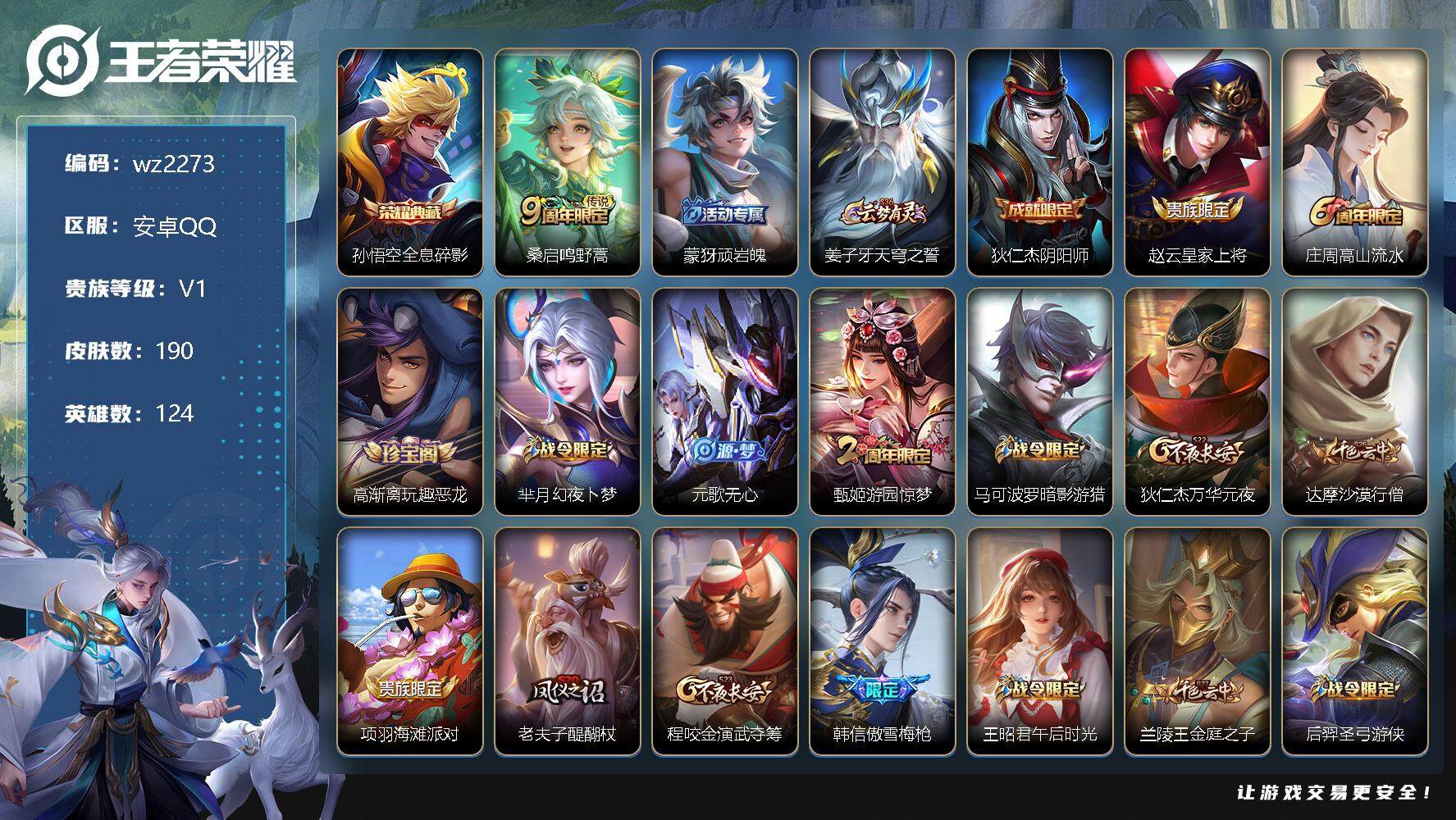 【游戏多多】 【可二次实名】【wz2273】安卓Q-V1-最强王者段位-124英雄-190皮肤-1典藏-0珍品无双-0无双-0珍品传说-1传说-58史诗 【荣耀典藏】:孙悟空全息碎影 【传说皮肤】:桑启鸣野蒿 【限定皮肤】:蒙犽顽岩魄,姜子牙天穹之誓,狄仁杰阴阳师,赵云皇家上将,庄周高山流水,高渐离玩趣恶龙,芈月幻夜卜梦,元歌无心,甄姬游园惊梦,马可波罗暗影游猎,狄仁杰万华元夜,达摩沙漠行僧,项羽海滩派对,老夫子醍醐杖,程咬金演武夺筹,韩信傲雪梅枪,王昭君午后时光,兰陵王金庭之子,后羿圣弓游侠,李元芳云中旅人,钟馗驱傩正仪,干将莫邪真爱魔法,雅典娜黎明之约,蔡文姬繁星吟游,鬼谷子原初探秘者,鬼谷子五谷丰年,黄忠火炮绅士,苏烈千军破阵,百里玄策原初追逐者,梦奇顽趣,沈梦溪大漠名商,明世隐疑决卦,裴擒虎李小龙,裴擒虎擒涛扼浪,狂铁电玩高手,上官婉儿梁祝,嫦娥拒霜思,鲁班大师探海日志,桑启海盐诗旅,阿古朵江河有灵,张良古海寻踪,蒙恬荣光圣徽,鬼谷子天穹祈灯,姬小满妄想食味,沈梦溪龙舞盛年,刘邦剑破天穹,程咬金群星魔术团,镜青焰无极,项羽苍威无极,周瑜熔金海岸 【赛季限定】:狄仁杰万华元夜,达摩沙漠行僧,老夫子醍醐杖,程咬金演武夺筹,兰陵王金庭之子,张良古海寻踪,李元芳云中旅人,钟馗驱傩正仪,雅典娜黎明之约,鬼谷子原初探秘者,苏烈千军破阵,百里玄策原初追逐者,梦奇顽趣,沈梦溪大漠名商,明世隐疑决卦,裴擒虎擒涛扼浪,鲁班大师探海日志,桑启海盐诗旅,鬼谷子天穹祈灯,蒙恬荣光圣徽,刘邦剑破天穹,姜子牙天穹之誓 【战令限定】:芈月幻夜卜梦,马可波罗暗影游猎,王昭君午后时光,后羿圣弓游侠,干将莫邪真爱魔法,黄忠火炮绅士,狂铁电玩高手,镜青焰无极,项羽苍威无极 【史诗皮肤】:露娜紫霞仙子,赵云皇家上将,赵云未来纪元,貂蝉圣诞恋歌,甄姬冰雪圆舞曲,王昭君偶像歌手,廉颇地狱岩魂,宫本武藏鬼剑武藏,孙尚香水果甜心,嬴政摇滚巨星,妲己魅力维加斯,妲己女仆咖啡,墨子金属风暴,吕布圣诞狂欢,刘禅绅士熊喵,李白千年之狐,花木兰水晶猎龙者,兰陵王暗隐猎兽者,诸葛亮黄金分割率,甄姬游园惊梦,雅典娜冰冠公主,安琪拉心灵骇客,百里守约特工魅影,铠曙光守护者,蔡文姬舞动绿茵,刘禅天才门将,李元芳逐浪之夏,程咬金功夫厨神,白起星夜王子,孙策猫狗日记,狄仁杰鹰眼统帅,上官婉儿梁祝,蔡文姬繁星吟游,马可波罗暗影游猎,百里玄策原初追逐者,裴擒虎李小龙,蒙犽龙鼓争鸣,干将莫邪真爱魔法,沈梦溪月团寄思,庄周高山流水,嫦娥拒霜思,黄忠火炮绅士,雅典娜黎明之约,韩信傲雪梅枪,狂铁电玩高手,鬼谷子五谷丰年,元歌无心,梦奇顽趣,阿古朵江河有灵,蒙恬荣光圣徽,姬小满妄想食味,镜青焰无极,蒙犽顽岩魄,姬小满战舞者,牛魔星界战将,孙膑茶境仙,阿轲化蝶舞,后羿石田雨龙 【其他皮肤】:项羽海滩派对,韩信教廷特使,韩信街头霸王,露娜哥特玫瑰,赵云白执事,赵云忍炎影,白起白色死神,扁鹊救世之瞳,宫本武藏未来纪元,妲己少女阿狸,典韦黄金武士,亚瑟死亡骑士,达摩拳王,花木兰兔女郎,张飞五福同心,甄姬花好人间,刘备万事如意,狄仁杰阴阳师,关羽龙腾万里,钟无艳海滩丽影,王昭君幻想奇妙夜,牛魔制霸全明星,孙尚香沉稳之力,诸葛亮掌控之力,李白敏锐之力,苏烈坚韧之力,明世隐虹云星官,小乔丁香结,吕布野性能量,孙膑归虚梦演,高渐离玩趣恶龙,沈梦溪鲨炮海盗猫,姜子牙炽热元素使,哪吒次元突破,明世隐疑决卦,盾山圆桌骑士,老夫子醍醐杖,狂铁特工战影,廉颇无尽征程,鬼谷子原初探秘者,狄仁杰万华元夜,程咬金演武夺筹,张良缤纷绘卷,钟馗驱傩正仪,鲁班大师乓乓大师,苏烈千军破阵,后羿圣弓游侠,典韦铁甲之心,马可波罗潮玩牛仔,达摩沙漠行僧,芈月幻夜卜梦,刘邦虎啸剑宗,兰陵王金庭之子,刘禅唤灵魔甲,王昭君午后时光,沈梦溪大漠名商,蒙恬蔚蓝守将,李元芳云中旅人,戈娅危途狂花,刘备潮玩造梦师,桑启海盐诗旅,海月幻泉雾影,猪八戒潮玩探月行,牛魔牛运亨通,白起乐园追猎者,赵怀真太极少年,裴擒虎擒涛扼浪,太乙真人劲辣红锅,莱西奥西部游侠,鲁班大师探海日志,姬小满零食大作战,张良古海寻踪,鬼谷子天穹祈灯,海诺时空谍影,朵莉亚金色潮汐,沈梦溪龙舞盛年,刘邦剑破天穹,程咬金群星魔术团,项羽苍威无极,姜子牙天穹之誓,周瑜熔金海岸,干将莫邪雾都夜雨,吕布逐霄战戟,苍苍林狼骑,太乙真人谧流熔炉,马超访茗客,西施雪境奇遇,姜子牙星梦巡礼,少司缘灵卦秘语,戈娅玫蓝誓约,刘备浪漫序章,苏烈春野闲踪,张良灵野札记,阿古朵布丁狗之约,露娜命运加冕,露娜绯红之刃,貂蝉异域舞娘,老夫子潮流仙人,王昭君精灵公主,狄仁杰锦衣卫,孙悟空西部大镖客,李白范海辛,李元芳特种部队,虞姬加勒比小姐,夏侯惇战争骑士,马可波罗激情绿茵,太乙真人圆桌骑士,诸葛亮星航指挥官,黄忠芝加哥教父,干将莫邪第七人偶,铠龙域领