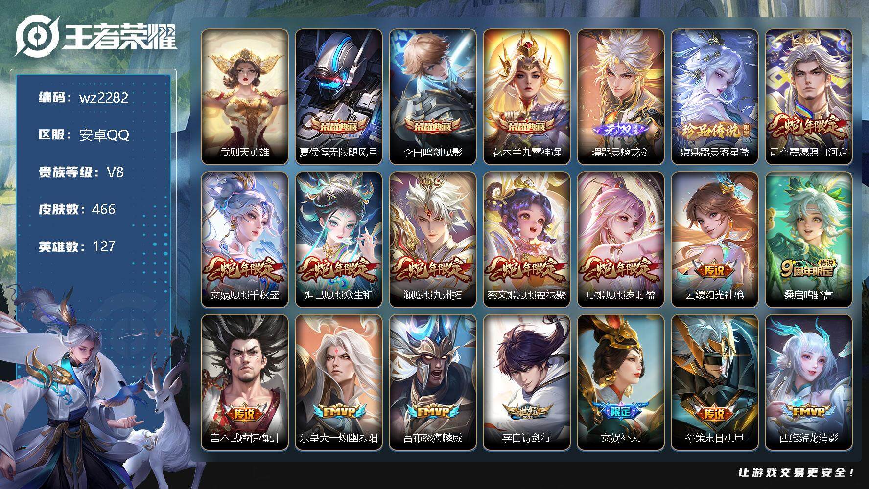 【游戏多多】 【可二次实名】【wz2282】安卓Q-V8-永恒钻石I段位-127英雄-466皮肤-3典藏-0珍品无双-1无双-1珍品传说-36传说-150史诗 【英雄全皮】:达摩全皮,刘邦全皮,女娲全皮,太乙真人全皮,鬼谷子全皮,盾山全皮,猪八戒全皮,嫦娥全皮,蒙犽全皮,司空震全皮,空空儿全皮,影全皮 【荣耀典藏】:武则天英雄,夏侯惇无限飓风号,李白鸣剑曳影,花木兰九霄神辉 【无双皮肤】:曜器灵螭龙剑 【珍品传说】:嫦娥器灵落星盏 【传说皮肤】:司空震愿照山河定,女娲愿照千秋盛,妲己愿照众生和,澜愿照九州拓,蔡文姬愿照福禄聚,虞姬愿照岁时盈,云缨幻光神枪,桑启鸣野蒿,宫本武藏惊梅引,东皇太一灼幽烈阳,吕布怒海麟威,李白诗剑行,女娲补天,孙策末日机甲,西施游龙清影,曜李逍遥 ,铠绛天战甲,虞姬启明星使,孙悟空零号赤焰,曜云鹰飞将,李信一念神魔,刘备时之恋人,貂蝉猫影幻舞,张良黄金白羊座,干将莫邪久胜战神,虞姬云霓雀翎,达摩黄金狮子座,花木兰冠军飞将,梦奇胖达荣荣,后羿黄金射手座,孙尚香末日机甲,宫本武藏地狱之眼,孙悟空地狱火,吕布天魔缭乱,武则天海洋之心,狄仁杰超时空战士 【限定皮肤】:白起狰,蒙犽顽岩魄,蔡文姬夏日便利店,大乔绒语心约,虞姬夏日便利店,姜子牙天穹之誓,杨戬破阵退雄兵,狄仁杰阴阳师,赵云皇家上将,赵云引擎之心,赵云龙胆,墨子神迹守卫,墨子降魔,妲己时之奇旅,嬴政白昼王子,鲁班七号狮舞东方,鲁班七号乒乒小将,庄周高山流水,高渐离死亡摇滚,高渐离玩趣恶龙,阿轲迷踪丽影,钟无艳超时空战士,扁鹊奇幻香踪,白起夜都怪侠,芈月重明,芈月白晶晶,芈月幻夜卜梦,吕布天魔缭乱,吕布猎兽之王,周瑜赤莲之焰,元歌云间偶戏,元歌无心,夏侯惇朔风刀,甄姬女儿国国王,甄姬游园惊梦,甄姬落雪兰心,曹操烛龙,典韦穷奇,典韦蓝屏警告,马可波罗暗影游猎,马可波罗山海玄木吟,狄仁杰魔术师,狄仁杰万华元夜,达摩星际陆战队,达摩沙漠行僧,项羽海滩派对,项羽霸王别姬,老夫子醍醐杖,老夫子航海奇遇记,关羽冰锋战神,程咬金演武夺筹,刘邦夺宝奇兵,韩信飞衡,王昭君凤凰于飞,王昭君午后时光,兰陵王驯魔猎人,兰陵王金庭之子,花木兰青春决赛季,花木兰默契交锋,亚瑟潮玩骑士王,孙悟空美猴王,孙悟空至尊宝,孙悟空大圣娶亲,孙悟空零号赤焰,孙悟空孙行者,牛魔御旌,后羿如梦令,后羿圣弓游侠,李元芳银河之约,李元芳云中旅人,虞姬启明星使,钟馗神迹守卫,钟馗驱傩正仪,杨玉环遇见飞天,杨戬潮玩骑兵,女娲朔望之晖,女娲补天,干将莫邪真爱魔法,雅典娜单词大作战,雅典娜黎明之约,蔡文姬繁星吟游,太乙真人饕餮,太乙真人华丽摇滚,鬼谷子原初探秘者,鬼谷子五谷丰年,黄忠火炮绅士,铠青龙志,苏烈千军破阵,百里玄策原初追逐者,弈星混沌棋,梦奇顽趣,沈梦溪星空之诺,沈梦溪大漠名商,明世隐疑决卦,明世隐吟游魔法,裴擒虎李小龙,裴擒虎擒涛扼浪,狂铁御狮,狂铁电玩高手,米莱狄御霄,米莱狄胡桃异想国,瑶山海碧波行,云中君纤云弄巧,伽罗天狼溯光者,盾山御銮,盾山梦圆繁星,猪八戒西部大镖客,猪八戒猪悟能,上官婉儿梁祝,嫦娥如梦令,嫦娥拒霜思,嫦娥暖冬兔眠,曜李逍遥 ,西施玲珑珍味,蒙犽狂想玩偶喵,鲁班大师探海日志,镜匿光追影者,桑启海盐诗旅,暃星界游侠,戈娅驭风魔法,艾琳女武神,艾琳流音漫舞,司空震地狱燃心,阿古朵江河有灵,张良古海寻踪,蒙犽百解令,高渐离燃音魔法,妲己灵卜魔法,鬼谷子天穹祈灯,伽罗琥珀纪元,姬小满妄想食味,沈梦溪龙舞盛年,鲁班七号蔬乡物语,李元芳蔬乡物语,刘邦剑破天穹,镜青焰无极,项羽苍威无极,刘备异域游侠,周瑜熔金海岸 【年限皮肤】:铠青龙志,孙悟空美猴王,王昭君凤凰于飞,韩信飞衡,赵云龙胆,瑶山海碧波行,马可波罗山海玄木吟 【赛季限定】:白起狰,芈月重明,夏侯惇朔风刀,曹操烛龙,典韦穷奇,狄仁杰万华元夜,达摩沙漠行僧,老夫子醍醐杖,程咬金演武夺筹,兰陵王金庭之子,张良古海寻踪,牛魔御旌,李元芳云中旅人,钟馗驱傩正仪,雅典娜黎明之约,太乙真人饕餮,鬼谷子原初探秘者,苏烈千军破阵,百里玄策原初追逐者,弈星混沌棋,梦奇顽趣,沈梦溪大漠名商,明世隐疑决卦,裴擒虎擒涛扼浪,狂铁御狮,米莱狄御霄,盾山御銮,鲁班大师探海日志,桑启海盐诗旅,鬼谷子天穹祈灯,刘邦剑破天穹,姜子牙天穹之誓 【战令限定】:墨子神迹守卫,蔡文姬夏日便利店,虞姬夏日便利店,嬴政白昼王子,鲁班七号狮舞东方,阿轲迷踪丽影,钟无艳超时空战士,扁鹊奇幻香踪,白起夜都怪侠,芈月幻夜卜梦,吕布猎兽之王,周瑜赤莲之焰,元歌云间偶戏,甄姬落雪兰心,典韦蓝屏警告,马可波罗暗影游猎,达摩星际陆战队,老夫子航海奇遇记,刘邦夺宝奇兵,王昭君午后时光,兰陵王驯魔猎人,艾琳流音漫舞,亚瑟潮玩骑士王,后羿圣弓游侠,李元芳银河之约,钟馗神迹守卫,杨戬潮玩骑兵,女娲朔望之晖,干将莫邪真爱