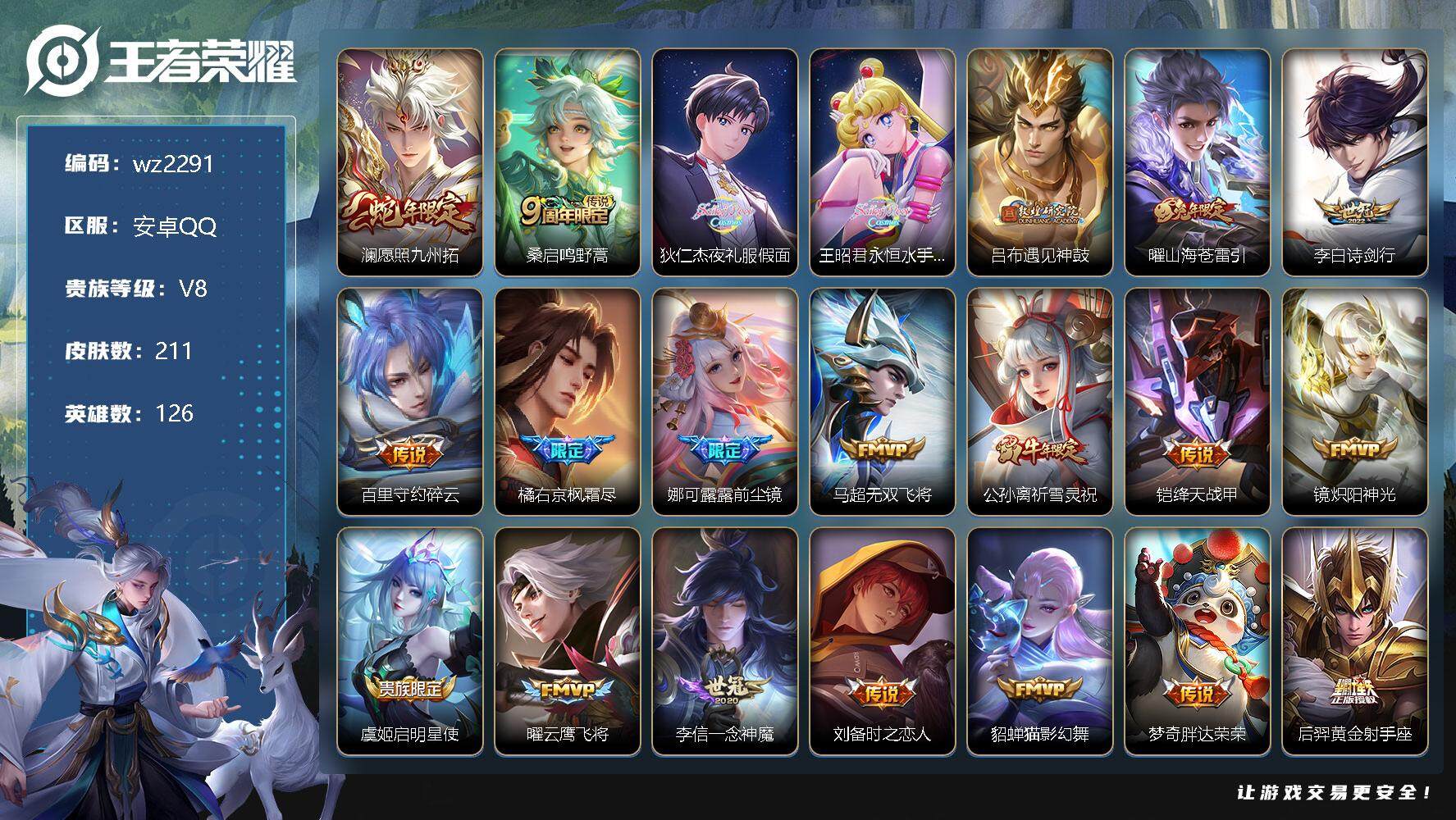 【游戏多多】 【可二次实名】【wz2291】安卓Q-V8-最强王者段位-126英雄-211皮肤-0典藏-0珍品无双-0无双-0珍品传说-22传说-57史诗 【英雄全皮】:娜可露露全皮,鲁班大师全皮,蒙恬全皮 【传说皮肤】:澜愿照九州拓,桑启鸣野蒿,狄仁杰夜礼服假面,王昭君永恒水手月亮,吕布遇见神鼓,曜山海苍雷引,李白诗剑行,百里守约碎云,橘右京枫霜尽,娜可露露前尘镜,马超无双飞将,公孙离祈雪灵祝,铠绛天战甲,镜炽阳神光,虞姬启明星使,曜云鹰飞将,李信一念神魔,刘备时之恋人,貂蝉猫影幻舞,梦奇胖达荣荣,后羿黄金射手座,宫本武藏地狱之眼 【限定皮肤】:狄仁杰阴阳师,赵云皇家上将,钟无艳超时空战士,吕布遇见神鼓,元歌无心,甄姬落雪兰心,马可波罗山海玄木吟,狄仁杰魔术师,项羽海滩派对,程咬金演武夺筹,王昭君午后时光,娜可露露前尘镜,橘右京枫霜尽,孙悟空孙行者,李元芳云中旅人,虞姬启明星使,钟馗驱傩正仪,鬼谷子五谷丰年,公孙离祈雪灵祝,沈梦溪大漠名商,裴擒虎天狼狩猎者,裴擒虎擒涛扼浪,狂铁电玩高手,云中君纤云弄巧,上官婉儿梁祝,嫦娥如梦令,嫦娥拒霜思,嫦娥暖冬兔眠,曜山海苍雷引,西施至美乘鲤谣,鲁班大师匿光启智者,鲁班大师探海日志,桑启海盐诗旅,暃星界游侠,艾琳流音漫舞,司空震地狱燃心,阿古朵江河有灵,张良古海寻踪,王昭君永恒水手月亮,狄仁杰夜礼服假面,蒙犽百解令,蒙恬荣光圣徽,姬小满妄想食味,刘邦剑破天穹,程咬金群星魔术团 【年限皮肤】:公孙离祈雪灵祝,马可波罗山海玄木吟,曜山海苍雷引 【赛季限定】:程咬金演武夺筹,张良古海寻踪,李元芳云中旅人,钟馗驱傩正仪,沈梦溪大漠名商,裴擒虎擒涛扼浪,鲁班大师探海日志,桑启海盐诗旅,蒙恬荣光圣徽,刘邦剑破天穹 【战令限定】:钟无艳超时空战士,甄姬落雪兰心,王昭君午后时光,艾琳流音漫舞,狂铁电玩高手,嫦娥暖冬兔眠,司空震地狱燃心,暃星界游侠 【史诗皮肤】:赵云皇家上将,赵云未来纪元,貂蝉圣诞恋歌,甄姬冰雪圆舞曲,狄仁杰魔术师,廉颇地狱岩魂,宫本武藏鬼剑武藏,孙尚香水果甜心,嬴政暗夜贵公子,嬴政摇滚巨星,妲己魅力维加斯,妲己女仆咖啡,墨子金属风暴,刘禅绅士熊喵,曹操幽灵船长,吕布末日机甲,花木兰水晶猎龙者,刘邦德古拉伯爵,夏侯惇乘风破浪,小乔缤纷独角兽,兰陵王暗隐猎兽者,诸葛亮黄金分割率,雅典娜冰冠公主,安琪拉心灵骇客,铠曙光守护者,蔡文姬舞动绿茵,刘禅天才门将,程咬金功夫厨神,阿轲节奏热浪,孙策猫狗日记,伽罗箭羽风息,裴擒虎天狼狩猎者,狄仁杰鹰眼统帅,上官婉儿梁祝,娜可露露晚萤,嫦娥如梦令,不知火舞魅语,云中君纤云弄巧,孙悟空孙行者,司马懿暗渊魔法,嫦娥拒霜思,狂铁电玩高手,鲁班大师匿光启智者,钟无艳超时空战士,弈星滕王阁序,鬼谷子五谷丰年,元歌无心,暃星界游侠,马可波罗山海玄木吟,司空震地狱燃心,阿古朵江河有灵,西施至美乘鲤谣,蒙犽百解令,蒙恬荣光圣徽,姬小满妄想食味,周瑜百相守梦,黄忠百相守梦 【其他皮肤】:项羽海滩派对,韩信教廷特使,韩信街头霸王,阿轲爱心护理,赵云白执事,白起白色死神,武则天东方不败,宫本武藏未来纪元,安琪拉玩偶对对碰,姜子牙时尚教父,妲己少女阿狸,典韦黄金武士,亚瑟死亡骑士,甄姬花好人间,刘备万事如意,宫本武藏万象初新,后羿阿尔法小队,狄仁杰阴阳师,刘备纽约教父,刘备汉昭烈帝,关羽龙腾万里,王昭君幻想奇妙夜,孙尚香沉稳之力,诸葛亮掌控之力,李白敏锐之力,鬼谷子幻乐之宴,苏烈坚韧之力,大乔守护之力,明世隐虹云星官,小乔丁香结,吕布野性能量,沈梦溪鲨炮海盗猫,姜子牙炽热元素使,哪吒次元突破,盾山圆桌骑士,刘禅秘密基地,露娜瓷语鉴心,程咬金演武夺筹,张良缤纷绘卷,钟馗驱傩正仪,鲁班大师乓乓大师,王昭君午后时光,沈梦溪大漠名商,蒙恬蔚蓝守将,甄姬落雪兰心,李元芳云中旅人,戈娅危途狂花,刘备潮玩造梦师,桑启海盐诗旅,嫦娥暖冬兔眠,海月幻泉雾影,猪八戒潮玩探月行,牛魔牛运亨通,白起乐园追猎者,赵怀真太极少年,裴擒虎擒涛扼浪,太乙真人劲辣红锅,莱西奥西部游侠,鲁班大师探海日志,姬小满零食大作战,李元芳妄想特派,艾琳流音漫舞,张良古海寻踪,钟无艳聚星闪耀,亚连破局者,兰陵王幻夜行动,曹操决胜大满贯,刘邦剑破天穹,程咬金群星魔术团,大司命暗都幽影,盘古敬我三分,东皇太一噬灭天穹,太乙真人谧流熔炉,达摩爆裂喵拳,少司缘灵卦秘语,戈娅玫蓝誓约,刘备浪漫序章,钟馗虚灵犬护,苏烈春野闲踪,张良灵野札记,阿古朵布丁狗之约,露娜命运加冕,姬小满小满鸭,白起死霸装,甄姬逆浪荇歌,孙策百相守梦,莱西奥踏浪烽翎,鲁班七号木偶奇遇记,貂蝉异域舞娘,花木兰剑舞者,王昭君精灵公主,曹操超能战警,小乔万圣前夜,孙悟空西部大镖客,兰陵王隐刃,蔡文姬蔷薇王座,马可波罗激情绿茵,太乙真人圆桌骑士,哪吒三太子,诸葛亮星航指挥官,大乔伊势巫女,东皇