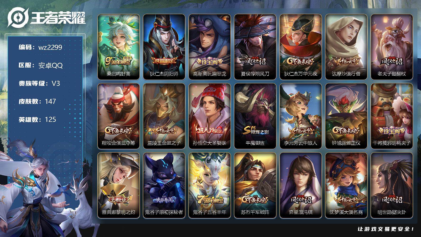 【游戏多多】 【可二次实名】【wz2299】安卓Q-V3-最强王者段位-125英雄-147皮肤-0典藏-0珍品无双-0无双-0珍品传说-1传说-34史诗 【传说皮肤】:桑启鸣野蒿 【限定皮肤】:狄仁杰阴阳师,高渐离玩趣恶龙,夏侯惇朔风刀,狄仁杰万华元夜,达摩沙漠行僧,老夫子醍醐杖,程咬金演武夺筹,兰陵王金庭之子,孙悟空大圣娶亲,牛魔御旌,李元芳云中旅人,钟馗驱傩正仪,干将莫邪胡桃夹子,雅典娜黎明之约,鬼谷子原初探秘者,鬼谷子五谷丰年,苏烈千军破阵,弈星混沌棋,沈梦溪大漠名商,明世隐疑决卦,裴擒虎李小龙,裴擒虎擒涛扼浪,云中君纤云弄巧,猪八戒猪悟能,上官婉儿梁祝,鲁班大师探海日志,桑启海盐诗旅,阿古朵江河有灵,张良古海寻踪,蒙犽百解令,鬼谷子天穹祈灯 【赛季限定】:夏侯惇朔风刀,狄仁杰万华元夜,达摩沙漠行僧,老夫子醍醐杖,程咬金演武夺筹,兰陵王金庭之子,张良古海寻踪,牛魔御旌,李元芳云中旅人,钟馗驱傩正仪,雅典娜黎明之约,鬼谷子原初探秘者,苏烈千军破阵,弈星混沌棋,沈梦溪大漠名商,明世隐疑决卦,裴擒虎擒涛扼浪,鲁班大师探海日志,桑启海盐诗旅,鬼谷子天穹祈灯 【史诗皮肤】:赵云未来纪元,貂蝉圣诞恋歌,甄姬冰雪圆舞曲,王昭君偶像歌手,宫本武藏鬼剑武藏,孙尚香水果甜心,嬴政摇滚巨星,妲己魅力维加斯,妲己女仆咖啡,墨子金属风暴,吕布圣诞狂欢,张飞乱世虎臣,夏侯惇乘风破浪,小乔缤纷独角兽,兰陵王暗隐猎兽者,诸葛亮黄金分割率,百里守约特工魅影,刘禅天才门将,李元芳逐浪之夏,孙策猫狗日记,孙悟空大圣娶亲,狄仁杰鹰眼统帅,上官婉儿梁祝,裴擒虎李小龙,云中君纤云弄巧,猪八戒猪悟能,雅典娜黎明之约,鬼谷子五谷丰年,阿古朵江河有灵,蒙犽百解令,狂铁龙之律动,扁鹊灵蛊蚀心,黄忠百相守梦,公孙离涂山容容 【其他皮肤】:韩信教廷特使,韩信街头霸王,露娜哥特玫瑰,达摩大发明家,赵云白执事,赵云忍炎影,芈月红桃皇后,白起白色死神,武则天东方不败,扁鹊化身博士,扁鹊救世之瞳,安琪拉玩偶对对碰,孙膑天使之翼,妲己少女阿狸,典韦黄金武士,亚瑟死亡骑士,达摩拳王,花木兰兔女郎,张飞五福同心,甄姬花好人间,刘备万事如意,宫本武藏万象初新,后羿阿尔法小队,狄仁杰阴阳师,钟无艳海滩丽影,宫本武藏霸王丸,老夫子功夫老勺,孙尚香沉稳之力,鬼谷子幻乐之宴,苏烈坚韧之力,明世隐虹云星官,牛魔御旌,孙膑归虚梦演,高渐离玩趣恶龙,沈梦溪鲨炮海盗猫,姜子牙炽热元素使,夏侯惇朔风刀,弈星混沌棋,哪吒次元突破,明世隐疑决卦,老夫子醍醐杖,狂铁特工战影,鬼谷子原初探秘者,狄仁杰万华元夜,刘禅秘密基地,程咬金演武夺筹,张良缤纷绘卷,钟馗驱傩正仪,鲁班大师乓乓大师,苏烈千军破阵,干将莫邪胡桃夹子,达摩沙漠行僧,程咬金无双福将,兰陵王金庭之子,沈梦溪大漠名商,蒙恬蔚蓝守将,李元芳云中旅人,桑启海盐诗旅,海月幻泉雾影,猪八戒潮玩探月行,裴擒虎擒涛扼浪,太乙真人劲辣红锅,鲁班大师探海日志,李元芳妄想特派,张良古海寻踪,后羿完美运算,鬼谷子天穹祈灯,海诺时空谍影,廉颇功夫炙烤,大司命暗都幽影,东皇太一噬灭天穹,苍苍林狼骑,太乙真人谧流熔炉,典韦铁骨偃魂,西施雪境奇遇,姜子牙星梦巡礼,明世隐景韶洛都,钟馗虚灵犬护,阿古朵布丁狗之约,露娜命运加冕,白起死霸装,甄姬逆浪荇歌,莱西奥踏浪烽翎,鬼谷子克喵,哪吒罗小黑战记,亚瑟荣光之誓,张良罗小黑战记,貂蝉异域舞娘,王昭君精灵公主,狄仁杰锦衣卫,李元芳特种部队,诸葛亮星航指挥官,干将莫邪第七人偶,铠龙域领主,百里守约绝影神枪,百里玄策威尼斯狂欢,女娲尼罗河女神,明世隐占星师,裴擒虎街头旋风,元歌午夜歌剧院,伽罗花见巫女,李信灼热之刃,上官婉儿修竹墨客,瑶森,曜归虚梦演,镜冰刃幻境,阿古朵熊喵少女,澜孤猎,司空震启蛰,云缨赤焰之缨,金蝉前尘,暃碧珀绯影 【内测皮肤】:高渐离玩趣恶龙,狂铁特工战影,干将莫邪胡桃夹子 【营地ID】:534701965