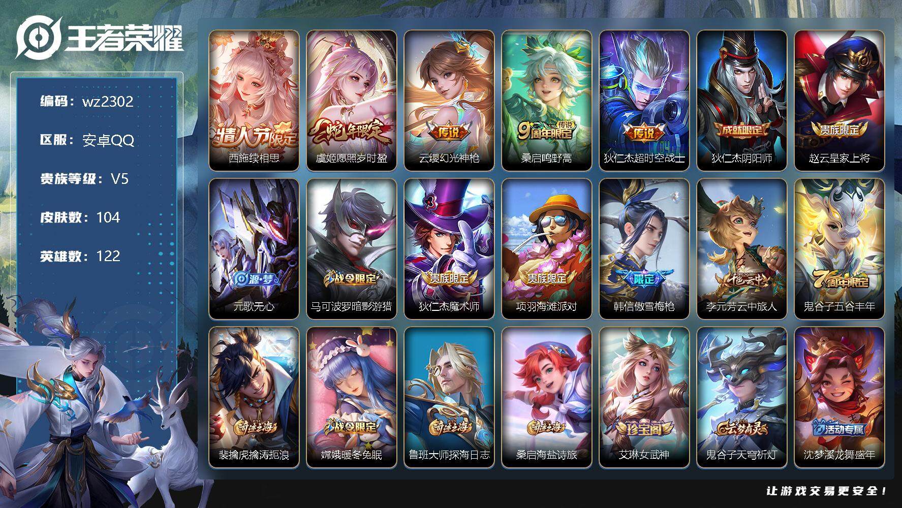 【游戏多多】 【可二次实名】【wz2302】安卓Q-V5-永恒钻石IV段位-122英雄-104皮肤-0典藏-0珍品无双-0无双-0珍品传说-5传说-33史诗 【英雄全皮】:影全皮 【传说皮肤】:西施续相思,虞姬愿照岁时盈,云缨幻光神枪,桑启鸣野蒿,狄仁杰超时空战士 【限定皮肤】:狄仁杰阴阳师,赵云皇家上将,元歌无心,马可波罗暗影游猎,狄仁杰魔术师,项羽海滩派对,韩信傲雪梅枪,李元芳云中旅人,鬼谷子五谷丰年,裴擒虎擒涛扼浪,嫦娥暖冬兔眠,鲁班大师探海日志,桑启海盐诗旅,艾琳女武神,鬼谷子天穹祈灯,沈梦溪龙舞盛年,刘邦剑破天穹,程咬金群星魔术团 【赛季限定】:李元芳云中旅人,裴擒虎擒涛扼浪,鲁班大师探海日志,桑启海盐诗旅,鬼谷子天穹祈灯,刘邦剑破天穹 【战令限定】:马可波罗暗影游猎,嫦娥暖冬兔眠 【史诗皮肤】:赵云皇家上将,赵云未来纪元,甄姬冰雪圆舞曲,王昭君偶像歌手,狄仁杰魔术师,宫本武藏鬼剑武藏,孙尚香水果甜心,妲己魅力维加斯,墨子金属风暴,吕布圣诞狂欢,吕布末日机甲,花木兰水晶猎龙者,刘邦德古拉伯爵,夏侯惇乘风破浪,小乔缤纷独角兽,兰陵王暗隐猎兽者,雅典娜冰冠公主,安琪拉心灵骇客,白起星夜王子,阿轲节奏热浪,狄仁杰鹰眼统帅,橘右京修罗,马可波罗暗影游猎,西施诗语江南,韩信傲雪梅枪,夏洛特永昼,鬼谷子五谷丰年,元歌无心,百里守约百相守梦,孙膑茶境仙,姬小满飞车小橘子,白起苍鳞隐世,赵怀真器灵浮梦炉 【其他皮肤】:项羽海滩派对,露娜哥特玫瑰,阿轲爱心护理,赵云忍炎影,艾琳女武神,白起白色死神,扁鹊化身博士,宫本武藏未来纪元,安琪拉玩偶对对碰,典韦黄金武士,亚瑟死亡骑士,狄仁杰阴阳师,刘备汉昭烈帝,关羽龙腾万里,诸葛亮掌控之力,明世隐虹云星官,姜子牙炽热元素使,蒙恬蔚蓝守将,李元芳云中旅人,桑启海盐诗旅,嫦娥暖冬兔眠,裴擒虎擒涛扼浪,太乙真人劲辣红锅,鲁班大师探海日志,姬小满零食大作战,李元芳妄想特派,后羿完美运算,鬼谷子天穹祈灯,海诺时空谍影,嫦娥漠中幻影,沈梦溪龙舞盛年,钟无艳春野之旅,刘邦剑破天穹,程咬金群星魔术团,东皇太一噬灭天穹,老夫子百相守梦,干将莫邪雾都夜雨,苍苍林狼骑,太乙真人谧流熔炉,典韦铁骨偃魂,马超访茗客,影魅影绮裳,西施雪境奇遇,少司缘灵卦秘语,明世隐景韶洛都,戈娅玫蓝誓约,刘备浪漫序章,钟馗虚灵犬护,阿古朵布丁狗之约,项羽帝国元帅,曹操超能战警,孙悟空西部大镖客,虞姬加勒比小姐,关羽天启骑士,马可波罗激情绿茵,东皇太一东海龙王,铠龙域领主,百里守约绝影神枪,孙策海之征途,伽罗花见巫女,李信灼热之刃,盘古创世神祝,马超幸存者,蒙恬秩序猎龙将,司空震启蛰,暃碧珀绯影 【内测皮肤】:艾琳女武神 【营地ID】:1785700348