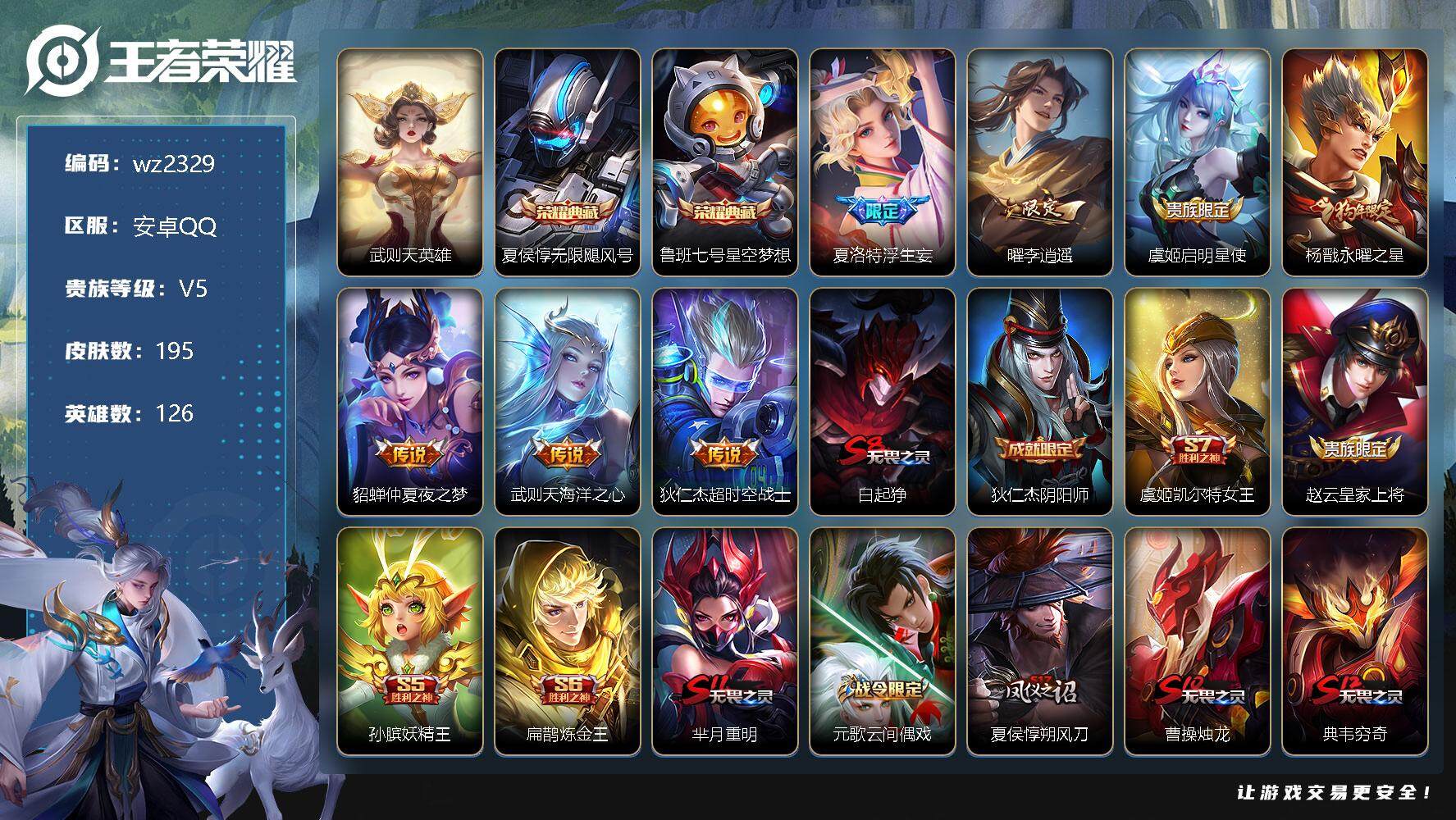 【游戏多多】 【可二次实名】【wz2329】安卓Q-V5-永恒钻石II段位-126英雄-195皮肤-2典藏-0珍品无双-0无双-0珍品传说-7传说-32史诗 【荣耀典藏】:武则天英雄,夏侯惇无限飓风号,鲁班七号星空梦想 【传说皮肤】:夏洛特浮生妄,曜李逍遥 ,虞姬启明星使,杨戬永曜之星,貂蝉仲夏夜之梦,武则天海洋之心,狄仁杰超时空战士 【限定皮肤】:白起狰,狄仁杰阴阳师,虞姬凯尔特女王,赵云皇家上将,孙膑妖精王,扁鹊炼金王,芈月重明,元歌云间偶戏,夏侯惇朔风刀,曹操烛龙,典韦穷奇,马可波罗逐梦之星,马可波罗暗影游猎,狄仁杰魔术师,狄仁杰万华元夜,达摩星际陆战队,项羽海滩派对,老夫子醍醐杖,程咬金演武夺筹,花木兰青春决赛季,亚瑟狮心王,亚瑟潮玩骑士王,孙悟空至尊宝,牛魔御旌,虞姬霸王别姬,虞姬启明星使,钟馗驱傩正仪,杨玉环遇见飞天,杨戬永曜之星,雅典娜单词大作战,太乙真人饕餮,鬼谷子原初探秘者,苏烈千军破阵,百里玄策原初追逐者,弈星混沌棋,明世隐疑决卦,裴擒虎李小龙,狂铁御狮,米莱狄御霄,米莱狄胡桃异想国,盾山御銮,猪八戒西部大镖客,上官婉儿梁祝,曜李逍遥 ,蒙犽狂想玩偶喵,夏洛特浮生妄,艾琳女武神,裴擒虎梅西 【年限皮肤】:杨戬永曜之星 【赛季限定】:孙膑妖精王,扁鹊炼金王,白起狰,芈月重明,夏侯惇朔风刀,曹操烛龙,典韦穷奇,狄仁杰万华元夜,老夫子醍醐杖,程咬金演武夺筹,亚瑟狮心王,牛魔御旌,虞姬凯尔特女王,钟馗驱傩正仪,太乙真人饕餮,鬼谷子原初探秘者,苏烈千军破阵,百里玄策原初追逐者,弈星混沌棋,明世隐疑决卦,狂铁御狮,米莱狄御霄,盾山御銮 【战令限定】:元歌云间偶戏,马可波罗暗影游猎,达摩星际陆战队,亚瑟潮玩骑士王,雅典娜单词大作战,米莱狄胡桃异想国,猪八戒西部大镖客,蒙犽狂想玩偶喵 【史诗皮肤】:鲁班七号电玩小子,赵云皇家上将,甄姬冰雪圆舞曲,王昭君偶像歌手,狄仁杰魔术师,宫本武藏鬼剑武藏,孙尚香水果甜心,嬴政摇滚巨星,墨子金属风暴,吕布圣诞狂欢,刘禅绅士熊喵,李白千年之狐,虞姬霸王别姬,孙悟空至尊宝,小乔缤纷独角兽,兰陵王暗隐猎兽者,诸葛亮黄金分割率,马可波罗逐梦之星,亚瑟心灵战警,花木兰青春决赛季,铠曙光守护者,裴擒虎梅西,杨玉环遇见飞天,狄仁杰鹰眼统帅,上官婉儿梁祝,橘右京修罗,马可波罗暗影游猎,蒙犽狂想玩偶喵,百里玄策原初追逐者,裴擒虎李小龙,元歌云间偶戏,米莱狄胡桃异想国 【其他皮肤】:项羽海滩派对,韩信教廷特使,韩信街头霸王,阿轲爱心护理,达摩大发明家,赵云白执事,赵云忍炎影,艾琳女武神,程咬金爱与正义,白起白色死神,牛魔西部大镖客,武则天东方不败,扁鹊化身博士,庄周鲤鱼之梦,宫本武藏未来纪元,安琪拉玩偶对对碰,孙膑天使之翼,姜子牙时尚教父,妲己少女阿狸,典韦黄金武士,亚瑟死亡骑士,花木兰兔女郎,张飞五福同心,甄姬花好人间,刘备万事如意,宫本武藏万象初新,亚瑟狮心王,后羿阿尔法小队,狄仁杰阴阳师,孙膑妖精王,扁鹊炼金王,关羽龙腾万里,虞姬凯尔特女王,墨子进击墨子号,白起狰,钟无艳海滩丽影,太乙真人饕餮,宫本武藏霸王丸,曹操烛龙,王昭君幻想奇妙夜,芈月重明,老夫子功夫老勺,孙尚香沉稳之力,典韦穷奇,鬼谷子幻乐之宴,狂铁御狮,苏烈坚韧之力,大乔守护之力,米莱狄御霄,明世隐虹云星官,牛魔御旌,吕布野性能量,盾山御銮,孙膑归虚梦演,沈梦溪鲨炮海盗猫,姜子牙炽热元素使,夏侯惇朔风刀,弈星混沌棋,哪吒次元突破,明世隐疑决卦,盾山圆桌骑士,老夫子醍醐杖,猪八戒西部大镖客,廉颇无尽征程,鬼谷子原初探秘者,雅典娜单词大作战,狄仁杰万华元夜,亚瑟潮玩骑士王,刘禅秘密基地,达摩星际陆战队,程咬金演武夺筹,钟馗驱傩正仪,苏烈千军破阵,程咬金无双福将,猪八戒潮玩探月行,廉颇功夫炙烤,干将莫邪雾都夜雨,太乙真人谧流熔炉,姜子牙星梦巡礼,明世隐景韶洛都,戈娅玫蓝誓约,钟馗虚灵犬护,苏烈春野闲踪,张良灵野札记,白起死霸装,甄姬逆浪荇歌,庄周锦麟游梦,莱西奥踏浪烽翎,鲁班七号木偶奇遇记,高渐离金属狂潮,项羽帝国元帅,露娜绯红之刃,貂蝉异域舞娘,花木兰剑舞者,老夫子潮流仙人,王昭君精灵公主,曹操死神来了,曹操超能战警,张良一千零一夜,孙膑未来旅行,孙悟空西部大镖客,周瑜海军大将,后羿精灵王,兰陵王隐刃,李白范海辛,钟馗地府判官,李元芳特种部队,刘邦圣殿之光,虞姬加勒比小姐,关羽天启骑士,蔡文姬蔷薇王座,夏侯惇战争骑士,雅典娜战争女神,马可波罗激情绿茵,苍维京掠夺者,太乙真人圆桌骑士,诸葛亮星航指挥官,黄忠芝加哥教父,大乔伊势巫女,东皇太一东海龙王,干将莫邪第七人偶,鬼谷子阿摩司公爵,铠龙域领主,百里守约绝影神枪,百里玄策威尼斯狂欢,苏烈爱与和平,梦奇美梦成真,女娲尼罗河女神,明世隐占星师,公孙离花间舞,杨玉环霓裳曲,弈星踏雪寻梅,米莱狄精准探案法,元歌午夜歌剧院,孙策