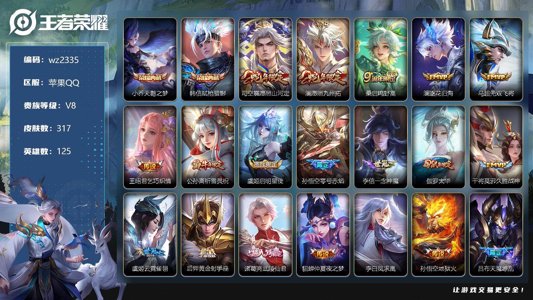 【游戏多多】 【可二次实名】【wz2335】苹果Q-V8-最强王者段位-125英雄-317皮肤-2典藏-0珍品无双-0无双-0珍品传说-20传说-97史诗 【英雄全皮】:钟馗全皮,蒙恬全皮,司空震全皮 【荣耀典藏】:小乔天鹅之梦,韩信弑枪猎影 【传说皮肤】:司空震愿照山河定,澜愿照九州拓,桑启鸣野蒿,澜逐花归海,马超无双飞将,王昭君乞巧织情,公孙离祈雪灵祝,虞姬启明星使,孙悟空零号赤焰,李信一念神魔,伽罗太华,干将莫邪久胜战神,虞姬云霓雀翎,后羿黄金射手座,诸葛亮武陵仙君,貂蝉仲夏夜之梦,李白凤求凰,孙悟空地狱火,吕布天魔缭乱,狄仁杰超时空战士 【限定皮肤】:白起狰,狄仁杰阴阳师,虞姬凯尔特女王,赵云皇家上将,赵云引擎之心,赵云龙胆,墨子神迹守卫,嬴政白昼王子,孙尚香蔷薇恋人,鲁班七号狮舞东方,庄周高山流水,高渐离玩趣恶龙,芈月重明,吕布天魔缭乱,吕布猎兽之王,周瑜赤莲之焰,元歌云间偶戏,元歌无心,夏侯惇朔风刀,甄姬游园惊梦,曹操烛龙,曹操天狼征服者,典韦穷奇,典韦蓝屏警告,马可波罗暗影游猎,马可波罗山海玄木吟,狄仁杰魔术师,狄仁杰万华元夜,达摩星际陆战队,达摩沙漠行僧,项羽海滩派对,老夫子醍醐杖,老夫子航海奇遇记,程咬金演武夺筹,韩信逐梦之影,韩信飞衡,兰陵王驯魔猎人,兰陵王金庭之子,花木兰青春决赛季,亚瑟潮玩骑士王,孙悟空至尊宝,孙悟空大圣娶亲,孙悟空零号赤焰,牛魔御旌,后羿如梦令,李元芳银河之约,李元芳云中旅人,虞姬启明星使,钟馗神迹守卫,钟馗驱傩正仪,杨玉环遇见飞天,女娲朔望之晖,雅典娜单词大作战,雅典娜黎明之约,蔡文姬繁星吟游,太乙真人饕餮,鬼谷子原初探秘者,鬼谷子五谷丰年,诸葛亮武陵仙君,铠青龙志,苏烈千军破阵,百里玄策原初追逐者,百里守约朱雀志,弈星混沌棋,梦奇顽趣,公孙离蜜橘之夏,公孙离祈雪灵祝,沈梦溪星空之诺,沈梦溪大漠名商,明世隐疑决卦,裴擒虎李小龙,裴擒虎擒涛扼浪,狂铁御狮,米莱狄御霄,米莱狄胡桃异想国,云中君纤云弄巧,伽罗太华,盾山御銮,猪八戒西部大镖客,上官婉儿梁祝,嫦娥如梦令,嫦娥拒霜思,蒙犽狂想玩偶喵,鲁班大师探海日志,桑启海盐诗旅,艾琳女武神,艾琳流音漫舞,司空震地狱燃心,阿古朵江河有灵,张良古海寻踪,蒙犽百解令,蒙恬荣光圣徽,鬼谷子天穹祈灯,刘邦剑破天穹,程咬金群星魔术团,周瑜熔金海岸 【年限皮肤】:百里守约朱雀志,铠青龙志,李白凤求凰,公孙离祈雪灵祝,伽罗太华,韩信飞衡,马超神威,赵云龙胆,马可波罗山海玄木吟 【赛季限定】:白起狰,芈月重明,夏侯惇朔风刀,曹操烛龙,典韦穷奇,狄仁杰万华元夜,达摩沙漠行僧,老夫子醍醐杖,程咬金演武夺筹,兰陵王金庭之子,张良古海寻踪,牛魔御旌,李元芳云中旅人,虞姬凯尔特女王,钟馗驱傩正仪,雅典娜黎明之约,太乙真人饕餮,鬼谷子原初探秘者,苏烈千军破阵,百里玄策原初追逐者,弈星混沌棋,梦奇顽趣,沈梦溪大漠名商,明世隐疑决卦,裴擒虎擒涛扼浪,狂铁御狮,米莱狄御霄,盾山御銮,鲁班大师探海日志,桑启海盐诗旅,鬼谷子天穹祈灯,蒙恬荣光圣徽,刘邦剑破天穹 【战令限定】:墨子神迹守卫,嬴政白昼王子,鲁班七号狮舞东方,吕布猎兽之王,周瑜赤莲之焰,元歌云间偶戏,典韦蓝屏警告,马可波罗暗影游猎,达摩星际陆战队,老夫子航海奇遇记,兰陵王驯魔猎人,艾琳流音漫舞,亚瑟潮玩骑士王,李元芳银河之约,钟馗神迹守卫,女娲朔望之晖,雅典娜单词大作战,沈梦溪星空之诺,米莱狄胡桃异想国,猪八戒西部大镖客,蒙犽狂想玩偶喵,司空震地狱燃心 【史诗皮肤】:鲁班七号电玩小子,露娜紫霞仙子,赵云皇家上将,赵云未来纪元,甄姬冰雪圆舞曲,王昭君偶像歌手,狄仁杰魔术师,廉颇地狱岩魂,宫本武藏鬼剑武藏,孙尚香蔷薇恋人,孙尚香水果甜心,嬴政摇滚巨星,妲己魅力维加斯,妲己女仆咖啡,墨子金属风暴,吕布圣诞狂欢,刘禅绅士熊喵,曹操幽灵船长,李白千年之狐,吕布末日机甲,张飞乱世虎臣,韩信白龙吟,孙悟空至尊宝,赵云引擎之心,花木兰水晶猎龙者,刘邦德古拉伯爵,韩信逐梦之影,夏侯惇乘风破浪,小乔缤纷独角兽,兰陵王暗隐猎兽者,诸葛亮黄金分割率,甄姬游园惊梦,亚瑟心灵战警,雅典娜冰冠公主,安琪拉心灵骇客,花木兰青春决赛季,百里守约特工魅影,铠曙光守护者,刘禅天才门将,公孙离蜜橘之夏,李元芳逐浪之夏,程咬金功夫厨神,白起星夜王子,杨玉环遇见飞天,嬴政白昼王子,孙策猫狗日记,大乔猫狗日记,铠青龙志,百里守约朱雀志,孙悟空大圣娶亲,典韦蓝屏警告,伽罗箭羽风息,鲁班七号狮舞东方,狄仁杰鹰眼统帅,公孙离无限星赏官,兰陵王驯魔猎人,上官婉儿梁祝,曹操天狼征服者,蔡文姬繁星吟游,李元芳银河之约,娜可露露晚萤,韩信飞衡,嫦娥如梦令,后羿如梦令,不知火舞魅语,橘右京修罗,瑶遇见神鹿,马超神威,赵云龙胆,孙尚香时之恋人,马可波罗暗影游猎,蒙犽狂想玩偶喵,百里玄策原初追逐者,裴擒虎李小