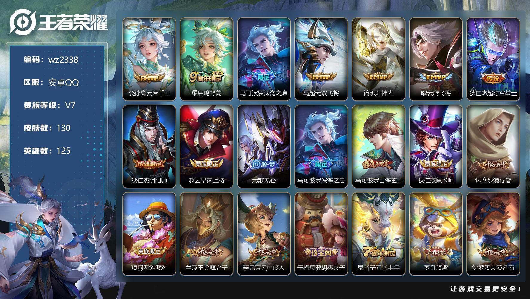 【游戏多多】 【可二次实名】【wz2338】安卓Q-V7-最强王者段位-125英雄-130皮肤-0典藏-0珍品无双-0无双-0珍品传说-7传说-31史诗 【传说皮肤】:公孙离云诺千山,桑启鸣野蒿,马可波罗深海之息,马超无双飞将,镜炽阳神光,曜云鹰飞将,狄仁杰超时空战士 【限定皮肤】:狄仁杰阴阳师,赵云皇家上将,元歌无心,马可波罗深海之息,马可波罗山海玄木吟,狄仁杰魔术师,达摩沙漠行僧,项羽海滩派对,兰陵王金庭之子,李元芳云中旅人,干将莫邪胡桃夹子,鬼谷子五谷丰年,梦奇顽趣,沈梦溪大漠名商,裴擒虎天狼狩猎者,裴擒虎擒涛扼浪,鲁班大师探海日志,桑启海盐诗旅,张良古海寻踪,鬼谷子天穹祈灯,刘邦剑破天穹 【年限皮肤】:马可波罗山海玄木吟 【赛季限定】:达摩沙漠行僧,兰陵王金庭之子,张良古海寻踪,李元芳云中旅人,梦奇顽趣,沈梦溪大漠名商,裴擒虎擒涛扼浪,鲁班大师探海日志,桑启海盐诗旅,鬼谷子天穹祈灯,刘邦剑破天穹 【史诗皮肤】:露娜紫霞仙子,赵云皇家上将,貂蝉圣诞恋歌,王昭君偶像歌手,狄仁杰魔术师,廉颇地狱岩魂,宫本武藏鬼剑武藏,嬴政摇滚巨星,妲己魅力维加斯,曹操幽灵船长,李白千年之狐,张飞乱世虎臣,花木兰水晶猎龙者,夏侯惇乘风破浪,雅典娜冰冠公主,李元芳逐浪之夏,白起星夜王子,孙策猫狗日记,伽罗箭羽风息,裴擒虎天狼狩猎者,狄仁杰鹰眼统帅,娜可露露晚萤,孙尚香时之恋人,司马懿暗渊魔法,澜赏金猎手,鬼谷子五谷丰年,元歌无心,梦奇顽趣,马可波罗山海玄木吟,狂铁龙之律动,黄忠百相守梦 【其他皮肤】:项羽海滩派对,韩信教廷特使,阿轲爱心护理,赵云忍炎影,白起白色死神,牛魔西部大镖客,宫本武藏未来纪元,安琪拉玩偶对对碰,孙膑天使之翼,妲己少女阿狸,亚瑟死亡骑士,花木兰兔女郎,张飞五福同心,宫本武藏万象初新,后羿阿尔法小队,狄仁杰阴阳师,刘备纽约教父,关羽龙腾万里,墨子进击墨子号,狂铁命运角斗场,孙尚香沉稳之力,诸葛亮掌控之力,吕布野性能量,沈梦溪鲨炮海盗猫,干将莫邪胡桃夹子,达摩沙漠行僧,兰陵王金庭之子,沈梦溪大漠名商,蒙恬蔚蓝守将,李元芳云中旅人,桑启海盐诗旅,猪八戒潮玩探月行,牛魔牛运亨通,白起乐园追猎者,裴擒虎擒涛扼浪,太乙真人劲辣红锅,莱西奥西部游侠,鲁班大师探海日志,张良古海寻踪,后羿完美运算,鬼谷子天穹祈灯,海诺时空谍影,刘邦剑破天穹,东皇太一噬灭天穹,苍苍林狼骑,太乙真人谧流熔炉,典韦铁骨偃魂,姜子牙星梦巡礼,钟馗虚灵犬护,苏烈春野闲踪,张良灵野札记,阿古朵布丁狗之约,露娜命运加冕,姬小满小满鸭,甄姬逆浪荇歌,鬼谷子克喵,哪吒罗小黑战记,亚瑟荣光之誓,鲁班七号福禄兄弟,露娜绯红之刃,钟无艳生化警戒,花木兰剑舞者,老夫子潮流仙人,狄仁杰锦衣卫,小乔万圣前夜,孙悟空西部大镖客,李元芳特种部队,虞姬加勒比小姐,关羽天启骑士,夏侯惇战争骑士,马可波罗激情绿茵,杨戬埃及法老,太乙真人圆桌骑士,黄忠芝加哥教父,铠龙域领主,百里守约绝影神枪,裴擒虎街头旋风,元歌午夜歌剧院,伽罗花见巫女,李信灼热之刃,盘古创世神祝,瑶森,曜归虚梦演,马超幸存者,镜冰刃幻境,蒙恬秩序猎龙将,阿古朵熊喵少女,澜孤猎,司空震启蛰,云缨赤焰之缨,金蝉前尘,暃碧珀绯影 【内测皮肤】:干将莫邪胡桃夹子 【营地ID】:1824279024