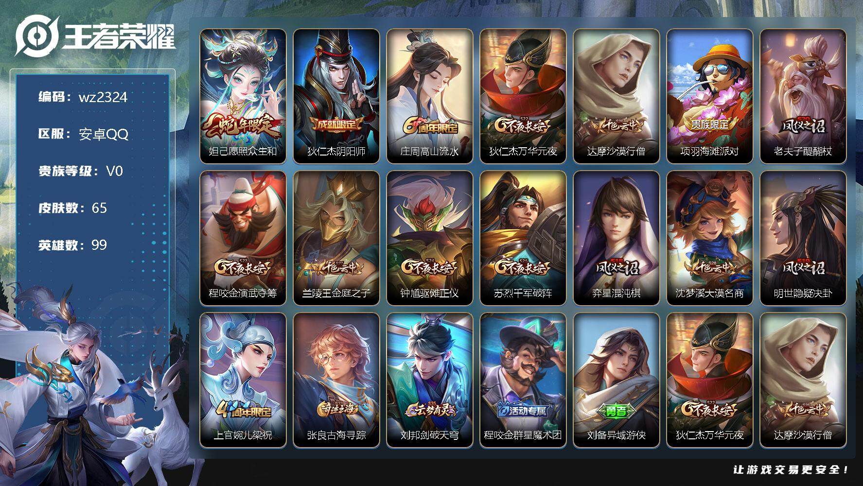 【游戏多多】 【可二次实名】【wz2324】安卓Q-V0-荣耀黄金III段位-99英雄-65皮肤-0典藏-0珍品无双-0无双-0珍品传说-1传说-7史诗 【传说皮肤】:妲己愿照众生和 【限定皮肤】:狄仁杰阴阳师,庄周高山流水,狄仁杰万华元夜,达摩沙漠行僧,项羽海滩派对,老夫子醍醐杖,程咬金演武夺筹,兰陵王金庭之子,钟馗驱傩正仪,苏烈千军破阵,弈星混沌棋,沈梦溪大漠名商,明世隐疑决卦,上官婉儿梁祝,张良古海寻踪,刘邦剑破天穹,程咬金群星魔术团,刘备异域游侠 【赛季限定】:狄仁杰万华元夜,达摩沙漠行僧,老夫子醍醐杖,程咬金演武夺筹,兰陵王金庭之子,张良古海寻踪,钟馗驱傩正仪,苏烈千军破阵,弈星混沌棋,沈梦溪大漠名商,明世隐疑决卦,刘邦剑破天穹 【史诗皮肤】:宫本武藏鬼剑武藏,妲己女仆咖啡,墨子金属风暴,铠曙光守护者,狄仁杰鹰眼统帅,上官婉儿梁祝,庄周高山流水 【其他皮肤】:项羽海滩派对,露娜哥特玫瑰,达摩大发明家,赵云忍炎影,安琪拉玩偶对对碰,亚瑟死亡骑士,狄仁杰阴阳师,刘备纽约教父,弈星混沌棋,鲁班七号黑桃队长,明世隐疑决卦,老夫子醍醐杖,狂铁特工战影,狄仁杰万华元夜,刘禅秘密基地,程咬金演武夺筹,张良缤纷绘卷,钟馗驱傩正仪,鲁班大师乓乓大师,苏烈千军破阵,达摩沙漠行僧,兰陵王金庭之子,沈梦溪大漠名商,刘备潮玩造梦师,猪八戒潮玩探月行,张良古海寻踪,后羿完美运算,刘邦剑破天穹,程咬金群星魔术团,刘备异域游侠,貂蝉长夏之忆,太乙真人谧流熔炉,鲁班七号木偶奇遇记,高渐离金属狂潮,貂蝉异域舞娘,老夫子潮流仙人,孙膑未来旅行,孙悟空西部大镖客,妲己仙境爱丽丝,后羿精灵王,李元芳特种部队,诸葛亮星航指挥官,铠龙域领主,百里玄策威尼斯狂欢,苏烈爱与和平,女娲尼罗河女神,公孙离花间舞,弈星踏雪寻梅,孙策海之征途,伽罗花见巫女,李信灼热之刃,盘古创世神祝,瑶森,镜冰刃幻境,蒙恬秩序猎龙将,司空震启蛰,云缨赤焰之缨 【内测皮肤】:狂铁特工战影 【营地ID】:1869091346