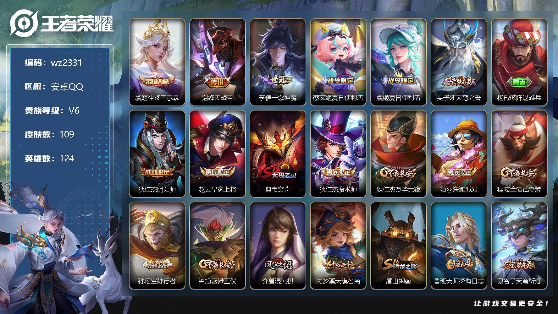 【游戏多多】 【可二次实名】【wz2331】安卓Q-V6-至尊星耀IV段位-124英雄-109皮肤-1典藏-0珍品无双-0无双-0珍品传说-2传说-27史诗 【荣耀典藏】:虞姬神鉴启示录 【传说皮肤】:铠绛天战甲,李信一念神魔 【限定皮肤】:蔡文姬夏日便利店,虞姬夏日便利店,姜子牙天穹之誓,杨戬破阵退雄兵,狄仁杰阴阳师,赵云皇家上将,典韦穷奇,狄仁杰魔术师,狄仁杰万华元夜,项羽海滩派对,程咬金演武夺筹,孙悟空孙行者,钟馗驱傩正仪,弈星混沌棋,沈梦溪大漠名商,盾山御銮,鲁班大师探海日志,鬼谷子天穹祈灯,鲁班七号蔬乡物语,李元芳蔬乡物语,刘邦剑破天穹,上官婉儿群星魔术团,程咬金群星魔术团,镜青焰无极,项羽苍威无极,刘备异域游侠,周瑜熔金海岸 【赛季限定】:典韦穷奇,狄仁杰万华元夜,程咬金演武夺筹,钟馗驱傩正仪,弈星混沌棋,沈梦溪大漠名商,盾山御銮,鲁班大师探海日志,鬼谷子天穹祈灯,刘邦剑破天穹,姜子牙天穹之誓 【战令限定】:蔡文姬夏日便利店,虞姬夏日便利店,鲁班七号蔬乡物语,李元芳蔬乡物语,镜青焰无极,项羽苍威无极 【史诗皮肤】:赵云皇家上将,赵云未来纪元,狄仁杰魔术师,廉颇地狱岩魂,宫本武藏鬼剑武藏,孙尚香水果甜心,妲己魅力维加斯,妲己女仆咖啡,吕布圣诞狂欢,张飞乱世虎臣,夏侯惇乘风破浪,小乔缤纷独角兽,兰陵王暗隐猎兽者,安琪拉心灵骇客,李元芳逐浪之夏,孙策猫狗日记,大乔猫狗日记,伽罗箭羽风息,狄仁杰鹰眼统帅,孙悟空孙行者,鲁班七号蔬乡物语,上官婉儿群星魔术团,镜青焰无极,黄忠怒海争锋,蔡文姬夏日便利店,狂铁龙之律动,周瑜百相守梦 【其他皮肤】:项羽海滩派对,韩信教廷特使,阿轲爱心护理,程咬金星际陆战队,扁鹊化身博士,安琪拉玩偶对对碰,姜子牙时尚教父,妲己少女阿狸,亚瑟死亡骑士,花木兰兔女郎,张飞五福同心,刘备万事如意,宫本武藏万象初新,狄仁杰阴阳师,关羽龙腾万里,钟无艳海滩丽影,王昭君幻想奇妙夜,孙尚香沉稳之力,典韦穷奇,诸葛亮掌控之力,明世隐虹云星官,张良幽兰居士,吕布野性能量,盾山御銮,姜子牙炽热元素使,弈星混沌棋,狄仁杰万华元夜,程咬金演武夺筹,盘古重装意志,钟馗驱傩正仪,鲁班大师乓乓大师,妲己紫罗兰之誓,米莱狄契约魔法,沈梦溪大漠名商,刘备潮玩造梦师,猪八戒潮玩探月行,鲁班大师探海日志,后羿完美运算,鬼谷子天穹祈灯,海诺时空谍影,李元芳蔬乡物语,扁鹊无尽旅途,刘邦剑破天穹,盘古经纬探寻者,程咬金群星魔术团,项羽苍威无极,大司命暗都幽影,刘备异域游侠,杨戬破阵退雄兵,姜子牙天穹之誓,周瑜熔金海岸,虞姬夏日便利店,孙悟空神迹守卫,太乙真人谧流熔炉,东皇太一金福满堂,甄姬逆浪荇歌,孙策百相守梦,鬼谷子克喵,桑启青衿临川,哪吒罗小黑战记,亚瑟荣光之誓,张良罗小黑战记,狄仁杰锦衣卫,曹操超能战警,孙悟空西部大镖客,后羿精灵王,兰陵王隐刃,李元芳特种部队,马可波罗激情绿茵,诸葛亮星航指挥官,黄忠芝加哥教父,苏烈爱与和平,公孙离花间舞,裴擒虎街头旋风,弈星踏雪寻梅,伽罗花见巫女,李信灼热之刃,上官婉儿修竹墨客,蒙恬秩序猎龙将 【营地ID】:1822912991