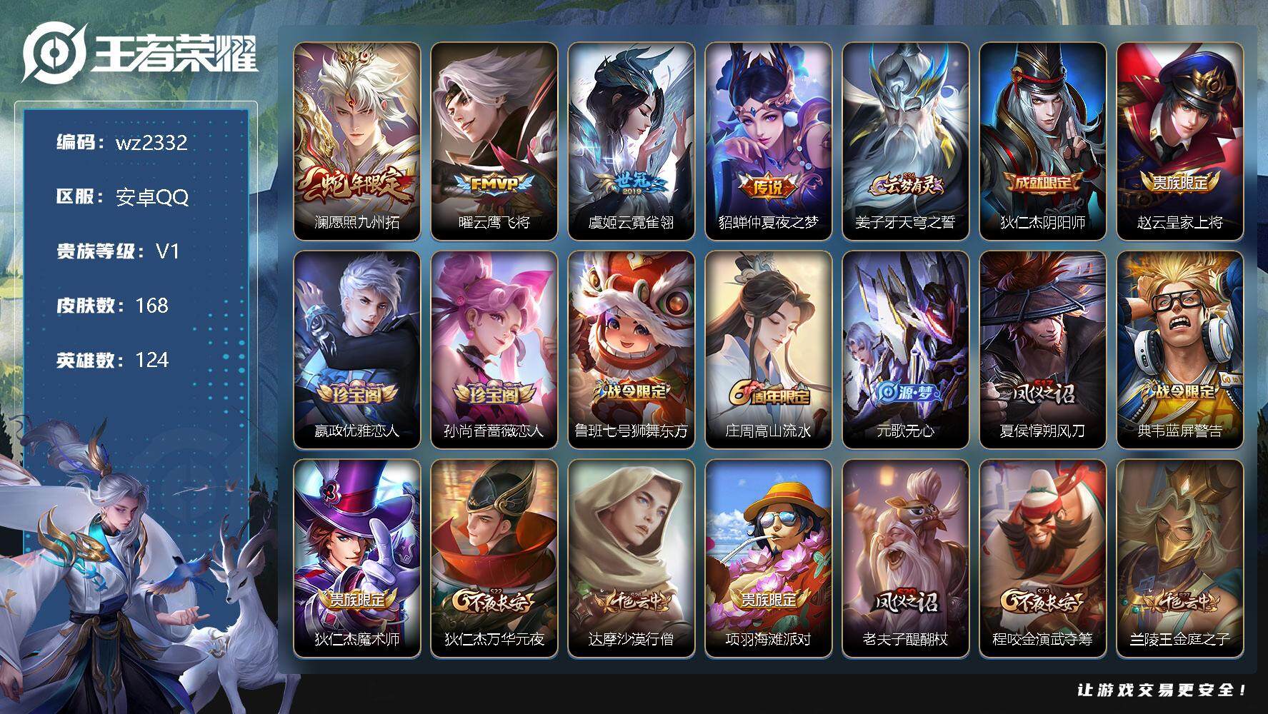 【游戏多多】 【可二次实名】【wz2332】安卓Q-V1-荣耀黄金III段位-124英雄-168皮肤-0典藏-0珍品无双-0无双-0珍品传说-4传说-30史诗 【传说皮肤】:澜愿照九州拓,曜云鹰飞将,虞姬云霓雀翎,貂蝉仲夏夜之梦 【限定皮肤】:姜子牙天穹之誓,狄仁杰阴阳师,赵云皇家上将,嬴政优雅恋人,孙尚香蔷薇恋人,鲁班七号狮舞东方,庄周高山流水,元歌无心,夏侯惇朔风刀,典韦蓝屏警告,狄仁杰魔术师,狄仁杰万华元夜,达摩沙漠行僧,项羽海滩派对,老夫子醍醐杖,程咬金演武夺筹,兰陵王金庭之子,孙悟空至尊宝,牛魔御旌,李元芳云中旅人,钟馗神迹守卫,钟馗驱傩正仪,杨玉环遇见飞天,女娲朔望之晖,雅典娜单词大作战,鬼谷子原初探秘者,鬼谷子五谷丰年,苏烈千军破阵,弈星混沌棋,沈梦溪大漠名商,明世隐疑决卦,裴擒虎李小龙,裴擒虎擒涛扼浪,狂铁御狮,米莱狄御霄,云中君纤云弄巧,伽罗天狼溯光者,盾山御銮,上官婉儿梁祝,嫦娥拒霜思,蒙犽狂想玩偶喵,鲁班大师探海日志,桑启海盐诗旅 【赛季限定】:夏侯惇朔风刀,狄仁杰万华元夜,达摩沙漠行僧,老夫子醍醐杖,程咬金演武夺筹,兰陵王金庭之子,牛魔御旌,李元芳云中旅人,钟馗驱傩正仪,鬼谷子原初探秘者,苏烈千军破阵,弈星混沌棋,沈梦溪大漠名商,明世隐疑决卦,裴擒虎擒涛扼浪,狂铁御狮,米莱狄御霄,盾山御銮,鲁班大师探海日志,桑启海盐诗旅,姜子牙天穹之誓 【战令限定】:鲁班七号狮舞东方,典韦蓝屏警告,钟馗神迹守卫,女娲朔望之晖,雅典娜单词大作战,蒙犽狂想玩偶喵 【史诗皮肤】:露娜紫霞仙子,赵云皇家上将,赵云未来纪元,狄仁杰魔术师,宫本武藏鬼剑武藏,孙尚香蔷薇恋人,孙尚香水果甜心,嬴政优雅恋人,墨子金属风暴,吕布末日机甲,张飞乱世虎臣,孙悟空至尊宝,刘邦德古拉伯爵,雅典娜冰冠公主,杨玉环遇见飞天,孙策猫狗日记,典韦蓝屏警告,鲁班七号狮舞东方,狄仁杰鹰眼统帅,上官婉儿梁祝,孙尚香时之恋人,蒙犽狂想玩偶喵,裴擒虎李小龙,云中君纤云弄巧,伽罗天狼溯光者,庄周高山流水,嫦娥拒霜思,鬼谷子五谷丰年,元歌无心,阿轲化蝶舞 【其他皮肤】:项羽海滩派对,韩信教廷特使,韩信街头霸王,达摩大发明家,赵云忍炎影,程咬金星际陆战队,白起白色死神,扁鹊化身博士,安琪拉玩偶对对碰,妲己少女阿狸,典韦黄金武士,亚瑟死亡骑士,花木兰兔女郎,甄姬花好人间,后羿阿尔法小队,狄仁杰阴阳师,刘备纽约教父,刘备汉昭烈帝,关羽龙腾万里,钟无艳海滩丽影,宫本武藏霸王丸,孙尚香沉稳之力,诸葛亮掌控之力,李白敏锐之力,狂铁御狮,苏烈坚韧之力,大乔守护之力,项羽科学大爆炸,米莱狄御霄,明世隐虹云星官,庄周奇妙博物学,牛魔御旌,女娲朔望之晖,小乔丁香结,吕布野性能量,钟馗神迹守卫,盾山御銮,沈梦溪鲨炮海盗猫,姜子牙炽热元素使,夏侯惇朔风刀,弈星混沌棋,哪吒次元突破,鲁班七号黑桃队长,明世隐疑决卦,盾山圆桌骑士,老夫子醍醐杖,鬼谷子原初探秘者,雅典娜单词大作战,狄仁杰万华元夜,刘禅秘密基地,杨戬次元傲视,露娜瓷语鉴心,程咬金演武夺筹,钟馗驱傩正仪,鲁班大师乓乓大师,苏烈千军破阵,典韦铁甲之心,妲己紫罗兰之誓,达摩沙漠行僧,兰陵王金庭之子,刘禅唤灵魔甲,沈梦溪大漠名商,李元芳云中旅人,刘备潮玩造梦师,桑启海盐诗旅,海月幻泉雾影,猪八戒潮玩探月行,赵怀真太极少年,裴擒虎擒涛扼浪,鲁班大师探海日志,后羿完美运算,廉颇功夫炙烤,大司命暗都幽影,貂蝉长夏之忆,姜子牙天穹之誓,盘古敬我三分,亚瑟动物派对,干将莫邪雾都夜雨,吕布逐霄战戟,苍苍林狼骑,东皇太一金福满堂,达摩爆裂喵拳,少司缘灵卦秘语,小乔秘证寻踪,高渐离金属狂潮,露娜绯红之刃,貂蝉异域舞娘,花木兰剑舞者,狄仁杰锦衣卫,曹操超能战警,孙膑未来旅行,孙悟空西部大镖客,周瑜海军大将,后羿精灵王,刘禅英喵野望,李白范海辛,钟馗地府判官,李元芳特种部队,刘邦圣殿之光,虞姬加勒比小姐,关羽天启骑士,蔡文姬蔷薇王座,夏侯惇战争骑士,雅典娜战争女神,马可波罗激情绿茵,苍维京掠夺者,哪吒三太子,诸葛亮星航指挥官,黄忠芝加哥教父,大乔伊势巫女,东皇太一东海龙王,干将莫邪第七人偶,铠龙域领主,百里守约绝影神枪,百里玄策威尼斯狂欢,苏烈爱与和平,明世隐占星师,公孙离花间舞,杨玉环霓裳曲,裴擒虎街头旋风,司马懿魇语军师,李信灼热之刃,嫦娥露花倒影,猪八戒年年有余,云中君荷鲁斯之眼,曜归虚梦演,马超幸存者,西施归虚梦演,蒙恬秩序猎龙将,阿古朵熊喵少女,澜孤猎,司空震启蛰,云缨赤焰之缨,金蝉前尘 【内测皮肤】:孙尚香蔷薇恋人,嬴政优雅恋人 【营地ID】:50379145