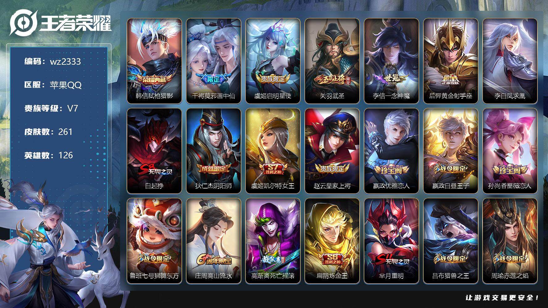 【游戏多多】 【可二次实名】【wz2333】苹果Q-V7-至尊星耀II段位-126英雄-261皮肤-1典藏-0珍品无双-0无双-0珍品传说-6传说-65史诗 【英雄全皮】:鬼谷子全皮,空空儿全皮 【荣耀典藏】:韩信弑枪猎影 【传说皮肤】:干将莫邪画中仙,虞姬启明星使,关羽武圣,李信一念神魔,后羿黄金射手座,李白凤求凰 【限定皮肤】:白起狰,狄仁杰阴阳师,虞姬凯尔特女王,赵云皇家上将,嬴政优雅恋人,嬴政白昼王子,孙尚香蔷薇恋人,鲁班七号狮舞东方,庄周高山流水,高渐离死亡摇滚,扁鹊炼金王,芈月重明,吕布猎兽之王,周瑜赤莲之焰,夏侯惇朔风刀,甄姬游园惊梦,曹操烛龙,典韦穷奇,典韦蓝屏警告,马可波罗逐梦之星,马可波罗山海玄木吟,狄仁杰魔术师,狄仁杰万华元夜,达摩沙漠行僧,项羽海滩派对,老夫子圣诞老人,老夫子醍醐杖,关羽冰锋战神,关羽武圣,程咬金演武夺筹,兰陵王驯魔猎人,兰陵王金庭之子,孙悟空至尊宝,牛魔御旌,李元芳云中旅人,虞姬启明星使,钟馗神迹守卫,钟馗驱傩正仪,杨玉环遇见飞天,女娲朔望之晖,干将莫邪画中仙,雅典娜黎明之约,太乙真人饕餮,鬼谷子原初探秘者,鬼谷子五谷丰年,苏烈千军破阵,百里玄策原初追逐者,弈星混沌棋,梦奇顽趣,沈梦溪大漠名商,明世隐疑决卦,裴擒虎擒涛扼浪,狂铁御狮,米莱狄御霄,盾山御銮,上官婉儿梁祝,鲁班大师探海日志,桑启海盐诗旅,阿古朵江河有灵,张良古海寻踪,蒙恬荣光圣徽,鬼谷子天穹祈灯,沈梦溪龙舞盛年,刘邦剑破天穹 【年限皮肤】:李白凤求凰,关羽武圣,马可波罗山海玄木吟 【赛季限定】:扁鹊炼金王,白起狰,芈月重明,夏侯惇朔风刀,曹操烛龙,典韦穷奇,狄仁杰万华元夜,达摩沙漠行僧,老夫子醍醐杖,程咬金演武夺筹,兰陵王金庭之子,张良古海寻踪,牛魔御旌,李元芳云中旅人,虞姬凯尔特女王,钟馗驱傩正仪,雅典娜黎明之约,太乙真人饕餮,鬼谷子原初探秘者,苏烈千军破阵,百里玄策原初追逐者,弈星混沌棋,梦奇顽趣,沈梦溪大漠名商,明世隐疑决卦,裴擒虎擒涛扼浪,狂铁御狮,米莱狄御霄,盾山御銮,鲁班大师探海日志,桑启海盐诗旅,鬼谷子天穹祈灯,蒙恬荣光圣徽,刘邦剑破天穹 【战令限定】:嬴政白昼王子,鲁班七号狮舞东方,吕布猎兽之王,周瑜赤莲之焰,典韦蓝屏警告,兰陵王驯魔猎人,钟馗神迹守卫,女娲朔望之晖 【史诗皮肤】:项羽苍穹之光,露娜紫霞仙子,阿轲暗夜猫娘,赵云皇家上将,赵云未来纪元,貂蝉圣诞恋歌,老夫子圣诞老人,甄姬冰雪圆舞曲,王昭君偶像歌手,狄仁杰魔术师,廉颇地狱岩魂,宫本武藏鬼剑武藏,孙尚香蔷薇恋人,孙尚香水果甜心,嬴政优雅恋人,嬴政摇滚巨星,妲己魅力维加斯,妲己女仆咖啡,墨子金属风暴,吕布圣诞狂欢,曹操幽灵船长,李白千年之狐,张飞乱世虎臣,韩信白龙吟,关羽冰锋战神,孙悟空至尊宝,花木兰水晶猎龙者,诸葛亮黄金分割率,甄姬游园惊梦,马可波罗逐梦之星,亚瑟心灵战警,安琪拉心灵骇客,百里守约特工魅影,蔡文姬舞动绿茵,李元芳逐浪之夏,程咬金功夫厨神,白起星夜王子,阿轲节奏热浪,杨玉环遇见飞天,嬴政白昼王子,典韦蓝屏警告,伽罗箭羽风息,鲁班七号狮舞东方,狄仁杰鹰眼统帅,公孙离无限星赏官,兰陵王驯魔猎人,上官婉儿梁祝,小乔青蛇,橘右京修罗,百里玄策原初追逐者,蒙犽龙鼓争鸣,庄周高山流水,雅典娜黎明之约,鬼谷子五谷丰年,梦奇顽趣,马可波罗山海玄木吟,阿古朵江河有灵,蒙恬荣光圣徽,亚连破空之剑,刘禅鸭鸭历险记,狂铁龙之律动,黄忠百相守梦,西施织梦人,弈星守夜人,公孙离涂山容容 【其他皮肤】:项羽海滩派对,韩信教廷特使,韩信街头霸王,露娜哥特玫瑰,阿轲爱心护理,达摩大发明家,赵云忍炎影,芈月红桃皇后,程咬金爱与正义,白起白色死神,牛魔西部大镖客,扁鹊化身博士,宫本武藏未来纪元,孙膑天使之翼,姜子牙时尚教父,妲己少女阿狸,典韦黄金武士,亚瑟死亡骑士,达摩拳王,花木兰兔女郎,张飞五福同心,甄姬花好人间,刘备万事如意,宫本武藏万象初新,后羿阿尔法小队,狄仁杰阴阳师,刘备纽约教父,高渐离死亡摇滚,刘备汉昭烈帝,扁鹊炼金王,关羽龙腾万里,虞姬凯尔特女王,墨子进击墨子号,白起狰,钟无艳海滩丽影,太乙真人饕餮,曹操烛龙,王昭君幻想奇妙夜,芈月重明,狂铁命运角斗场,老夫子功夫老勺,孙尚香沉稳之力,典韦穷奇,诸葛亮掌控之力,李白敏锐之力,鬼谷子幻乐之宴,狂铁御狮,安琪拉如懿,项羽科学大爆炸,米莱狄御霄,吕布猎兽之王,明世隐虹云星官,庄周奇妙博物学,牛魔御旌,女娲朔望之晖,小乔丁香结,吕布野性能量,钟馗神迹守卫,盾山御銮,孙膑归虚梦演,沈梦溪鲨炮海盗猫,姜子牙炽热元素使,夏侯惇朔风刀,周瑜赤莲之焰,弈星混沌棋,哪吒次元突破,明世隐疑决卦,盾山圆桌骑士,老夫子醍醐杖,狂铁特工战影,鬼谷子原初探秘者,狄仁杰万华元夜,刘禅秘密基地,露娜瓷语鉴心,程咬金演武夺筹,张良缤纷绘卷,盘古重装意志,钟馗驱傩正仪,