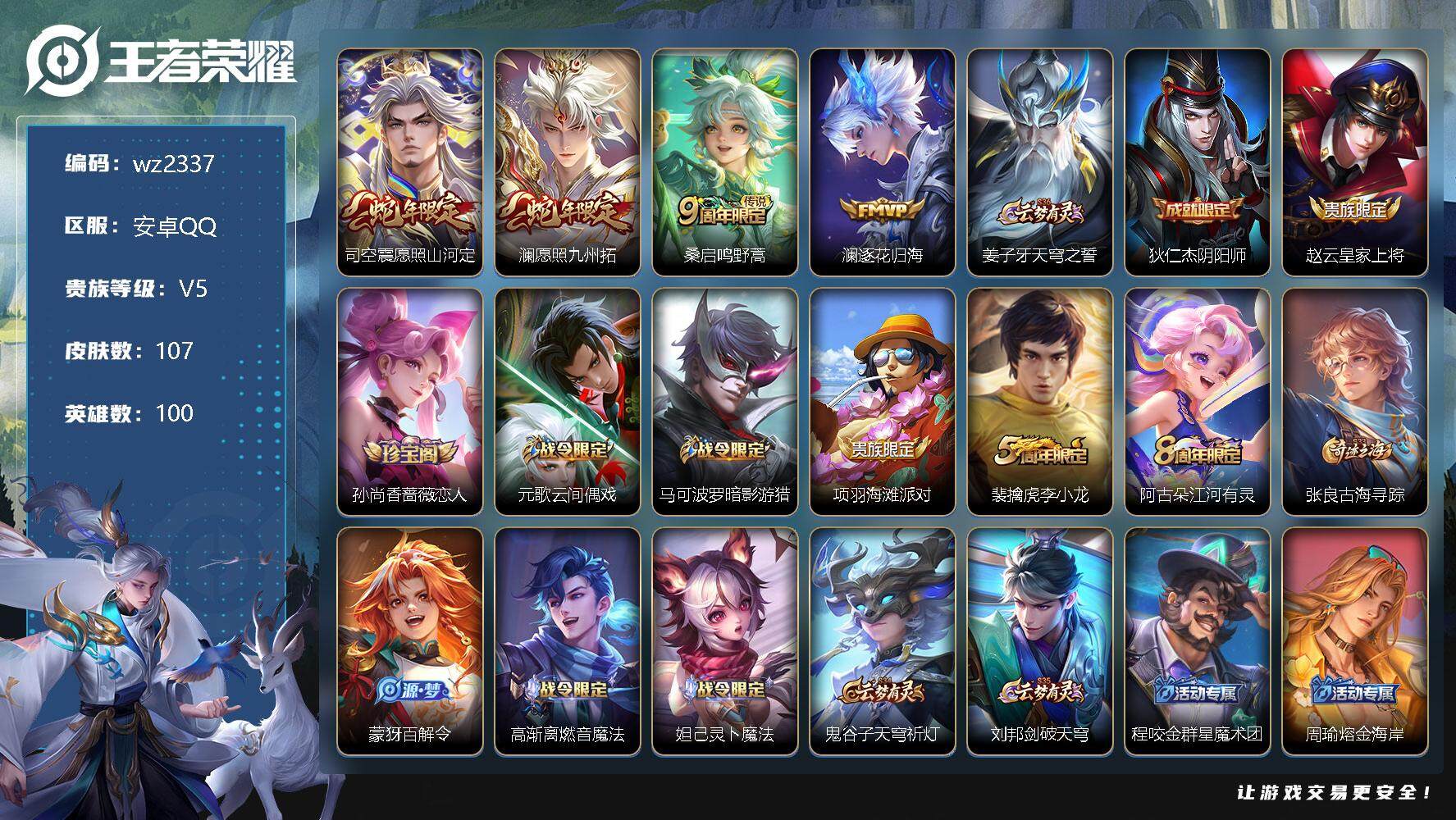 【游戏多多】 【可二次实名】【wz2337】安卓Q-V5-最强王者段位-100英雄-107皮肤-0典藏-0珍品无双-0无双-0珍品传说-4传说-30史诗 【传说皮肤】:司空震愿照山河定,澜愿照九州拓,桑启鸣野蒿,澜逐花归海 【限定皮肤】:姜子牙天穹之誓,狄仁杰阴阳师,赵云皇家上将,孙尚香蔷薇恋人,元歌云间偶戏,马可波罗暗影游猎,项羽海滩派对,裴擒虎李小龙,阿古朵江河有灵,张良古海寻踪,蒙犽百解令,高渐离燃音魔法,妲己灵卜魔法,鬼谷子天穹祈灯,刘邦剑破天穹,程咬金群星魔术团,周瑜熔金海岸 【赛季限定】:张良古海寻踪,鬼谷子天穹祈灯,刘邦剑破天穹,姜子牙天穹之誓 【战令限定】:元歌云间偶戏,马可波罗暗影游猎,高渐离燃音魔法,妲己灵卜魔法 【史诗皮肤】:露娜紫霞仙子,赵云皇家上将,甄姬冰雪圆舞曲,宫本武藏鬼剑武藏,孙尚香蔷薇恋人,妲己魅力维加斯,吕布圣诞狂欢,曹操幽灵船长,吕布末日机甲,花木兰水晶猎龙者,夏侯惇乘风破浪,小乔缤纷独角兽,雅典娜冰冠公主,孙策猫狗日记,伽罗箭羽风息,狄仁杰鹰眼统帅,马可波罗暗影游猎,裴擒虎李小龙,元歌云间偶戏,阿古朵江河有灵,蒙犽百解令,妲己灵卜魔法,高渐离燃音魔法,孙膑茶境仙,赵怀真器灵浮梦炉,狂铁龙之律动,周瑜百相守梦,云缨赞萌露比,黄忠百相守梦,弈星守夜人,公孙离涂山容容 【其他皮肤】:项羽海滩派对,韩信街头霸王,露娜哥特玫瑰,达摩大发明家,赵云白执事,赵云忍炎影,宫本武藏未来纪元,安琪拉玩偶对对碰,妲己少女阿狸,典韦黄金武士,亚瑟死亡骑士,达摩拳王,狄仁杰阴阳师,刘备纽约教父,关羽龙腾万里,王昭君幻想奇妙夜,老夫子功夫老勺,李白敏锐之力,哪吒次元突破,狂铁特工战影,盘古重装意志,典韦铁甲之心,猪八戒潮玩探月行,张良古海寻踪,后羿完美运算,鬼谷子天穹祈灯,妲己灵卜魔法,廉颇功夫炙烤,刘邦剑破天穹,程咬金群星魔术团,姜子牙天穹之誓,周瑜熔金海岸,东皇太一噬灭天穹,干将莫邪雾都夜雨,苍苍林狼骑,太乙真人谧流熔炉,典韦铁骨偃魂,马超访茗客,西施雪境奇遇,明世隐景韶洛都,戈娅玫蓝誓约,钟馗虚灵犬护,苏烈春野闲踪,张良灵野札记,阿古朵布丁狗之约,露娜命运加冕,姬小满小满鸭,白起死霸装,甄姬逆浪荇歌,孙策百相守梦,庄周锦麟游梦,莱西奥踏浪烽翎,鬼谷子克喵,哪吒罗小黑战记,亚瑟荣光之誓,曹操超能战警,后羿精灵王,关羽天启骑士,马可波罗激情绿茵,苍维京掠夺者,杨戬埃及法老,太乙真人圆桌骑士,诸葛亮星航指挥官,百里守约绝影神枪,元歌午夜歌剧院,司马懿魇语军师,李信灼热之刃,猪八戒年年有余,盘古创世神祝,曜归虚梦演,澜孤猎,司空震启蛰,暃碧珀绯影 【内测皮肤】:孙尚香蔷薇恋人,狂铁特工战影 【营地ID】:1761844612
