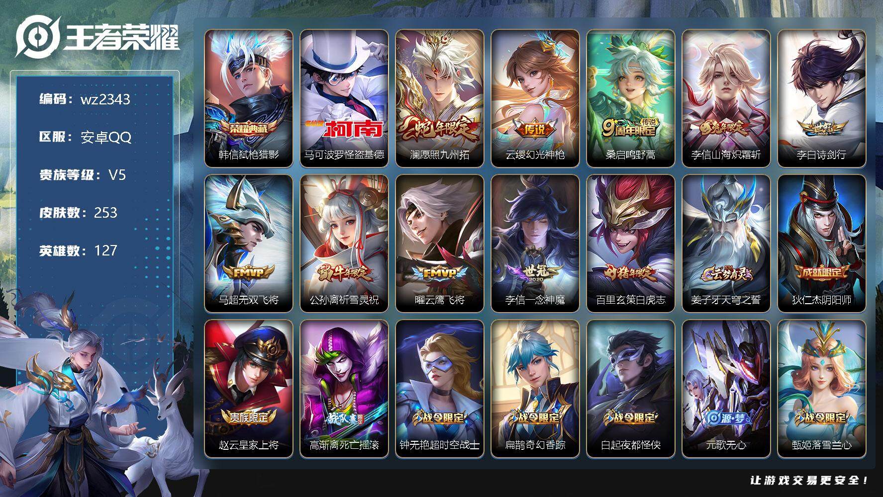 【游戏多多】 【可二次实名】【wz2343】安卓Q-V5-永恒钻石I段位-127英雄-253皮肤-1典藏-0珍品无双-0无双-1珍品传说-10传说-73史诗 【英雄全皮】:鬼谷子全皮,李信全皮,戈娅全皮 【荣耀典藏】:韩信弑枪猎影 【珍品传说】:马可波罗怪盗基德 【传说皮肤】:澜愿照九州拓,云缨幻光神枪,桑启鸣野蒿,李信山海炽霜斩,李白诗剑行,马超无双飞将,公孙离祈雪灵祝,曜云鹰飞将,李信一念神魔,百里玄策白虎志 【限定皮肤】:姜子牙天穹之誓,狄仁杰阴阳师,赵云皇家上将,高渐离死亡摇滚,钟无艳超时空战士,扁鹊奇幻香踪,白起夜都怪侠,元歌无心,甄姬落雪兰心,典韦岱宗,马可波罗山海玄木吟,狄仁杰魔术师,狄仁杰万华元夜,达摩沙漠行僧,项羽海滩派对,老夫子醍醐杖,程咬金演武夺筹,韩信飞衡,王昭君午后时光,兰陵王金庭之子,孙悟空孙行者,李元芳云中旅人,杨戬潮玩骑兵,干将莫邪胡桃夹子,鬼谷子原初探秘者,鬼谷子五谷丰年,苏烈千军破阵,百里玄策白虎志,百里玄策原初追逐者,梦奇顽趣,公孙离祈雪灵祝,沈梦溪大漠名商,明世隐吟游魔法,裴擒虎李小龙,裴擒虎擒涛扼浪,狂铁电玩高手,米莱狄御霄,云中君纤云弄巧,李信山海炽霜斩,上官婉儿梁祝,西施玲珑珍味,鲁班大师探海日志,桑启海盐诗旅,戈娅驭风魔法,艾琳流音漫舞,司空震地狱燃心,阿古朵江河有灵,张良古海寻踪,蒙犽百解令,蒙恬荣光圣徽,鬼谷子天穹祈灯,姬小满妄想食味,鲁班七号蔬乡物语,李元芳蔬乡物语,刘邦剑破天穹,程咬金群星魔术团 【年限皮肤】:百里玄策白虎志,公孙离祈雪灵祝,韩信飞衡,典韦岱宗,马可波罗山海玄木吟,李信山海炽霜斩 【赛季限定】:狄仁杰万华元夜,达摩沙漠行僧,老夫子醍醐杖,程咬金演武夺筹,兰陵王金庭之子,张良古海寻踪,李元芳云中旅人,鬼谷子原初探秘者,苏烈千军破阵,百里玄策原初追逐者,梦奇顽趣,沈梦溪大漠名商,裴擒虎擒涛扼浪,米莱狄御霄,鲁班大师探海日志,桑启海盐诗旅,鬼谷子天穹祈灯,蒙恬荣光圣徽,刘邦剑破天穹,姜子牙天穹之誓 【战令限定】:钟无艳超时空战士,扁鹊奇幻香踪,白起夜都怪侠,甄姬落雪兰心,王昭君午后时光,艾琳流音漫舞,杨戬潮玩骑兵,明世隐吟游魔法,狂铁电玩高手,西施玲珑珍味,司空震地狱燃心,戈娅驭风魔法,鲁班七号蔬乡物语,李元芳蔬乡物语 【史诗皮肤】:鲁班七号电玩小子,露娜紫霞仙子,阿轲暗夜猫娘,赵云皇家上将,赵云未来纪元,貂蝉圣诞恋歌,甄姬冰雪圆舞曲,王昭君偶像歌手,狄仁杰魔术师,廉颇地狱岩魂,宫本武藏鬼剑武藏,孙尚香水果甜心,嬴政摇滚巨星,妲己女仆咖啡,墨子金属风暴,吕布圣诞狂欢,曹操幽灵船长,李白千年之狐,吕布末日机甲,张飞乱世虎臣,韩信白龙吟,花木兰水晶猎龙者,刘邦德古拉伯爵,小乔缤纷独角兽,兰陵王暗隐猎兽者,诸葛亮黄金分割率,雅典娜冰冠公主,安琪拉心灵骇客,百里守约特工魅影,铠曙光守护者,李元芳逐浪之夏,程咬金功夫厨神,白起星夜王子,孙策猫狗日记,伽罗箭羽风息,狄仁杰鹰眼统帅,上官婉儿梁祝,娜可露露晚萤,韩信飞衡,典韦岱宗,不知火舞魅语,橘右京修罗,孙尚香时之恋人,百里玄策原初追逐者,裴擒虎李小龙,云中君纤云弄巧,孙悟空孙行者,司马懿暗渊魔法,明世隐吟游魔法,高渐离天秀音浪,狂铁电玩高手,张良千筹问战,钟无艳超时空战士,鬼谷子五谷丰年,元歌无心,梦奇顽趣,马可波罗山海玄木吟,扁鹊奇幻香踪,刘禅电玩爆裂旋风,戈娅驭风魔法,司空震地狱燃心,阿古朵江河有灵,蒙犽百解令,蒙恬荣光圣徽,姬小满妄想食味,鲁班七号蔬乡物语,牛魔星界战将,孙膑茶境仙,白起苍鳞隐世,赵怀真器灵浮梦炉,阿轲化蝶舞,狂铁龙之律动,黄忠百相守梦 【其他皮肤】:项羽海滩派对,韩信教廷特使,韩信街头霸王,露娜哥特玫瑰,阿轲爱心护理,达摩大发明家,赵云白执事,赵云忍炎影,芈月红桃皇后,白起白色死神,牛魔西部大镖客,武则天东方不败,扁鹊化身博士,扁鹊救世之瞳,宫本武藏未来纪元,孙膑天使之翼,姜子牙时尚教父,妲己少女阿狸,典韦黄金武士,亚瑟死亡骑士,花木兰兔女郎,张飞五福同心,甄姬花好人间,刘备万事如意,宫本武藏万象初新,后羿阿尔法小队,狄仁杰阴阳师,刘备纽约教父,高渐离死亡摇滚,刘备汉昭烈帝,关羽龙腾万里,墨子进击墨子号,钟无艳海滩丽影,王昭君幻想奇妙夜,狂铁命运角斗场,老夫子功夫老勺,孙尚香沉稳之力,诸葛亮掌控之力,李白敏锐之力,鬼谷子幻乐之宴,米莱狄御霄,明世隐虹云星官,小乔丁香结,吕布野性能量,孙膑归虚梦演,沈梦溪鲨炮海盗猫,姜子牙炽热元素使,哪吒次元突破,盾山圆桌骑士,老夫子醍醐杖,狂铁特工战影,鬼谷子原初探秘者,狄仁杰万华元夜,刘禅秘密基地,杨戬次元傲视,露娜瓷语鉴心,程咬金演武夺筹,盘古重装意志,鲁班大师乓乓大师,苏烈千军破阵,干将莫邪胡桃夹子,达摩沙漠行僧,程咬金无双福将,白起夜都怪侠,兰陵王金庭之子,刘禅唤灵魔甲,米莱狄契约