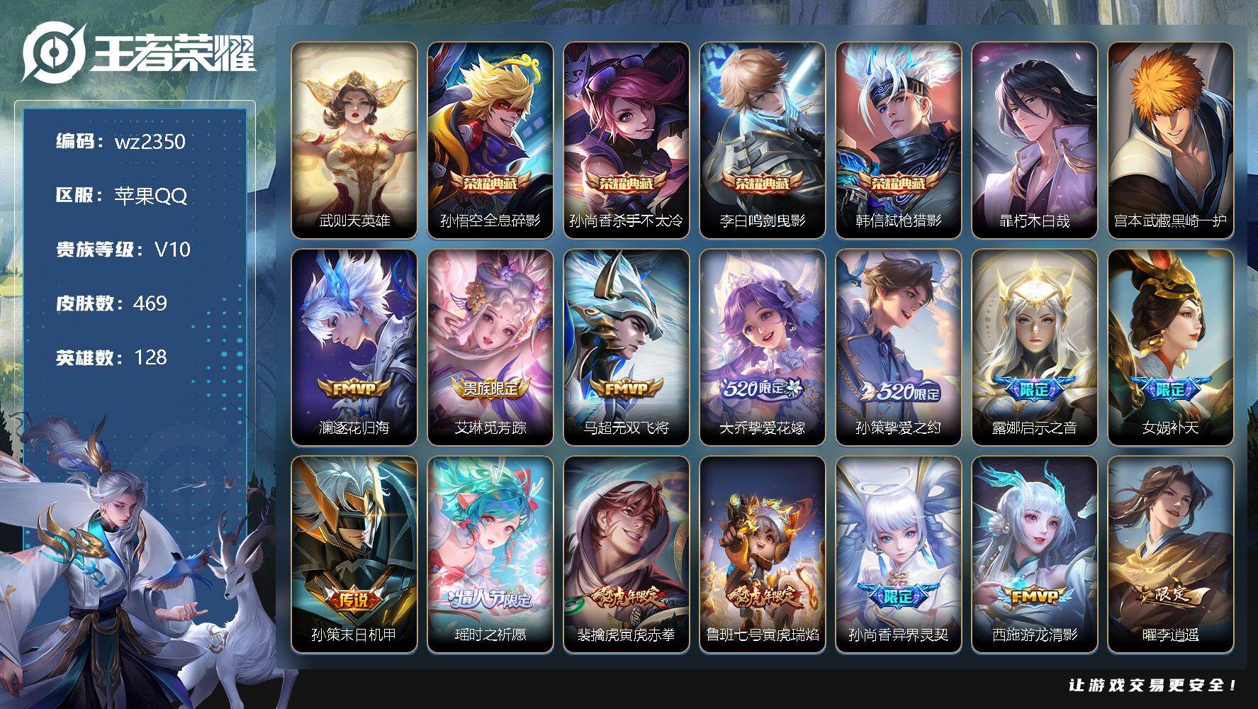 【游戏多多】 【可二次实名】【wz2350】苹果Q-V10-最强王者段位-128英雄-469皮肤-4典藏-0珍品无双-0无双-2珍品传说-43传说-166史诗 【英雄全皮】:刘邦全皮,孙权全皮,钟馗全皮,雅典娜全皮,苏烈全皮,狂铁全皮,猪八戒全皮,蒙恬全皮,空空儿全皮 【荣耀典藏】:武则天英雄,孙悟空全息碎影,孙尚香杀手不太冷,李白鸣剑曳影,韩信弑枪猎影 【珍品传说】:暃朽木白哉,宫本武藏黑崎一护 【传说皮肤】:澜逐花归海,艾琳觅芳踪,马超无双飞将,大乔挚爱花嫁,孙策挚爱之约,露娜启示之音,女娲补天,孙策末日机甲,瑶时之祈愿,裴擒虎寅虎赤拳,鲁班七号寅虎瑞焰,孙尚香异界灵契,西施游龙清影,曜李逍遥 ,周瑜音你心动,小乔音你心动,兰陵王默契交锋,公孙离祈雪灵祝,诸葛亮时雨天司,镜炽阳神光,虞姬启明星使,孙悟空零号赤焰,关羽武圣,曜云鹰飞将,李信一念神魔,刘备时之恋人,伽罗太华,张良黄金白羊座,干将莫邪久胜战神,虞姬云霓雀翎,达摩黄金狮子座,百里玄策白虎志,花木兰冠军飞将,梦奇胖达荣荣,后羿黄金射手座,杨戬永曜之星,诸葛亮武陵仙君,貂蝉仲夏夜之梦,李白凤求凰,宫本武藏地狱之眼,孙悟空地狱火,吕布天魔缭乱,武则天海洋之心 【限定皮肤】:白起狰,狄仁杰阴阳师,小乔纯白花嫁,虞姬凯尔特女王,廉颇寅虎御盾,赵云皇家上将,赵云引擎之心,赵云龙胆,赵云百木心枪,墨子神迹守卫,妲己热情桑巴,妲己时之彼端,嬴政白昼王子,孙尚香异界灵契,鲁班七号狮舞东方,鲁班七号寅虎瑞焰,庄周云端筑梦师,庄周玄嵩,庄周高山流水,高渐离玩趣恶龙,阿轲迷踪丽影,钟无艳超时空战士,孙膑天狼运算者,孙膑寅虎展翼,扁鹊奇幻香踪,白起夜都怪侠,芈月重明,芈月白晶晶,芈月幻夜卜梦,吕布天魔缭乱,吕布猎兽之王,吕布御风骁将,周瑜真爱至上,周瑜赤莲之焰,元歌云间偶戏,夏侯惇朔风刀,夏侯惇匿光决锋者,甄姬幽恒,甄姬女儿国国王,甄姬游园惊梦,甄姬落雪兰心,曹操烛龙,曹操天狼征服者,典韦穷奇,典韦蓝屏警告,典韦岱宗,马可波罗逐梦之星,马可波罗暗影游猎,狄仁杰魔术师,狄仁杰万华元夜,达摩星际陆战队,达摩沙漠行僧,项羽海滩派对,项羽霸王别姬,老夫子醍醐杖,老夫子航海奇遇记,关羽冰锋战神,关羽武圣,貂蝉逐梦之音,安琪拉魔法小厨娘,程咬金演武夺筹,露娜一生所爱,露娜启示之音,刘邦夺宝奇兵,韩信逐梦之影,韩信飞衡,韩信傲雪梅枪,王昭君凤凰于飞,王昭君午后时光,兰陵王默契交锋,兰陵王驯魔猎人,兰陵王金庭之子,花木兰青春决赛季,花木兰瑞麟志,花木兰默契交锋,亚瑟潮玩骑士王,孙悟空美猴王,孙悟空至尊宝,孙悟空大圣娶亲,孙悟空零号赤焰,孙悟空孙行者,牛魔御旌,牛魔奔雷神使,后羿辉光之辰,后羿如梦令,后羿圣弓游侠,张飞虎魄,李元芳银河之约,李元芳云中旅人,虞姬霸王别姬,虞姬启明星使,钟馗神迹守卫,钟馗驱傩正仪,杨玉环遇见飞天,杨玉环寅虎心曲,杨戬永曜之星,杨戬潮玩骑兵,女娲朔望之晖,女娲补天,哪吒逐梦之翼,干将莫邪冰霜恋舞曲,干将莫邪胡桃夹子,干将莫邪真爱魔法,雅典娜单词大作战,雅典娜黎明之约,蔡文姬奇迹圣诞,蔡文姬繁星吟游,太乙真人饕餮,东皇太一逐梦之光,鬼谷子原初探秘者,鬼谷子五谷丰年,诸葛亮武陵仙君,诸葛亮时雨天司,大乔白鹤梁神女,大乔挚爱花嫁,黄忠烈魂,黄忠火炮绅士,铠青龙志,苏烈玄武志,苏烈千军破阵,百里玄策白虎志,百里玄策原初追逐者,百里守约朱雀志,弈星混沌棋,梦奇顽趣,公孙离蜜橘之夏,公孙离祈雪灵祝,公孙离玉兔公主,沈梦溪星空之诺,沈梦溪大漠名商,明世隐疑决卦,明世隐吟游魔法,裴擒虎天狼狩猎者,裴擒虎李小龙,裴擒虎寅虎赤拳,裴擒虎擒涛扼浪,狂铁御狮,狂铁电玩高手,米莱狄御霄,米莱狄胡桃异想国,瑶时之祈愿,云中君纤云弄巧,云中君时之祈愿,伽罗太华,伽罗天狼溯光者,盾山御銮,孙策挚爱之约,猪八戒西部大镖客,猪八戒猪悟能,上官婉儿梁祝,上官婉儿天狼绘梦者,嫦娥如梦令,嫦娥暖冬兔眠,曜李逍遥 ,蒙犽狂想玩偶喵,鲁班大师探海日志,镜匿光追影者,桑启海盐诗旅,暃星界游侠,张良古海寻踪,裴擒虎梅西,蒙犽百解令,艾琳觅芳踪,蒙恬荣光圣徽,高渐离燃音魔法,鬼谷子天穹祈灯,刘邦剑破天穹 【年限皮肤】:百里玄策白虎志,百里守约朱雀志,花木兰瑞麟志,铠青龙志,苏烈玄武志,孙悟空美猴王,裴擒虎寅虎赤拳,孙膑寅虎展翼,鲁班七号寅虎瑞焰,杨玉环寅虎心曲,廉颇寅虎御盾,王昭君凤凰于飞,李白凤求凰,杨戬永曜之星,后羿辉光之辰,公孙离祈雪灵祝,吕布御风骁将,牛魔奔雷神使,诸葛亮时雨天司,伽罗太华,甄姬幽恒,韩信飞衡,典韦岱宗,庄周玄嵩,马超神威,关羽武圣,黄忠烈魂,张飞虎魄,赵云龙胆 【赛季限定】:白起狰,芈月重明,夏侯惇朔风刀,曹操烛龙,典韦穷奇,狄仁杰万华元夜,达摩沙漠行僧,老夫子醍醐杖,程咬金演武夺筹,兰陵王金庭之子,张良古海寻踪,牛魔御旌,李元