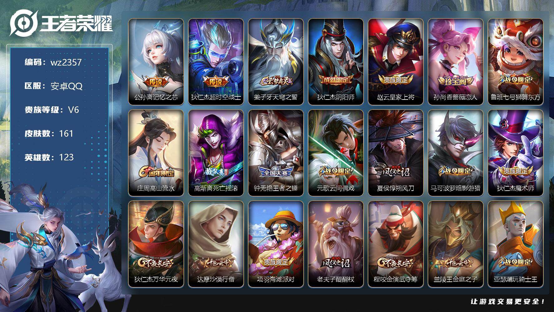 【游戏多多】 【可二次实名】【wz2357】安卓Q-V6-至尊星耀IV段位-123英雄-161皮肤-0典藏-0珍品无双-0无双-0珍品传说-2传说-38史诗 【传说皮肤】:公孙离记忆之芯,狄仁杰超时空战士 【限定皮肤】:姜子牙天穹之誓,狄仁杰阴阳师,赵云皇家上将,孙尚香蔷薇恋人,鲁班七号狮舞东方,庄周高山流水,高渐离死亡摇滚,钟无艳王者之锤,元歌云间偶戏,夏侯惇朔风刀,马可波罗暗影游猎,狄仁杰魔术师,狄仁杰万华元夜,达摩沙漠行僧,项羽海滩派对,老夫子醍醐杖,程咬金演武夺筹,兰陵王金庭之子,亚瑟潮玩骑士王,孙悟空大圣娶亲,牛魔御旌,后羿如梦令,李元芳银河之约,李元芳云中旅人,钟馗神迹守卫,钟馗驱傩正仪,干将莫邪冰霜恋舞曲,雅典娜黎明之约,蔡文姬繁星吟游,鬼谷子原初探秘者,苏烈千军破阵,百里玄策原初追逐者,弈星混沌棋,梦奇顽趣,沈梦溪星空之诺,沈梦溪大漠名商,明世隐疑决卦,裴擒虎李小龙,裴擒虎擒涛扼浪,盾山御銮,猪八戒西部大镖客,鲁班大师探海日志,桑启海盐诗旅,艾琳女武神,张良古海寻踪,蒙恬荣光圣徽,鬼谷子天穹祈灯,周瑜熔金海岸 【赛季限定】:夏侯惇朔风刀,狄仁杰万华元夜,达摩沙漠行僧,老夫子醍醐杖,程咬金演武夺筹,兰陵王金庭之子,张良古海寻踪,牛魔御旌,李元芳云中旅人,钟馗驱傩正仪,雅典娜黎明之约,鬼谷子原初探秘者,苏烈千军破阵,百里玄策原初追逐者,弈星混沌棋,梦奇顽趣,沈梦溪大漠名商,明世隐疑决卦,裴擒虎擒涛扼浪,盾山御銮,鲁班大师探海日志,桑启海盐诗旅,鬼谷子天穹祈灯,蒙恬荣光圣徽,姜子牙天穹之誓 【战令限定】:鲁班七号狮舞东方,元歌云间偶戏,马可波罗暗影游猎,亚瑟潮玩骑士王,李元芳银河之约,钟馗神迹守卫,沈梦溪星空之诺,猪八戒西部大镖客 【史诗皮肤】:钟无艳王者之锤,赵云皇家上将,王昭君偶像歌手,狄仁杰魔术师,廉颇地狱岩魂,宫本武藏鬼剑武藏,孙尚香蔷薇恋人,孙尚香水果甜心,妲己魅力维加斯,墨子金属风暴,吕布末日机甲,花木兰水晶猎龙者,刘邦德古拉伯爵,夏侯惇乘风破浪,小乔缤纷独角兽,兰陵王暗隐猎兽者,诸葛亮黄金分割率,安琪拉心灵骇客,白起星夜王子,阿轲节奏热浪,孙策猫狗日记,干将莫邪冰霜恋舞曲,孙悟空大圣娶亲,鲁班七号狮舞东方,狄仁杰鹰眼统帅,蔡文姬繁星吟游,李元芳银河之约,后羿如梦令,孙尚香时之恋人,马可波罗暗影游猎,百里玄策原初追逐者,裴擒虎李小龙,元歌云间偶戏,庄周高山流水,雅典娜黎明之约,梦奇顽趣,刘禅电玩爆裂旋风,蒙恬荣光圣徽 【其他皮肤】:项羽海滩派对,韩信教廷特使,韩信街头霸王,达摩大发明家,赵云忍炎影,艾琳女武神,牛魔西部大镖客,扁鹊救世之瞳,宫本武藏未来纪元,妲己少女阿狸,典韦黄金武士,亚瑟死亡骑士,达摩拳王,花木兰兔女郎,刘备万事如意,宫本武藏万象初新,后羿阿尔法小队,狄仁杰阴阳师,刘备纽约教父,高渐离死亡摇滚,钟无艳海滩丽影,王昭君幻想奇妙夜,狂铁命运角斗场,老夫子功夫老勺,孙尚香沉稳之力,李白敏锐之力,鬼谷子幻乐之宴,苏烈坚韧之力,明世隐虹云星官,牛魔御旌,吕布野性能量,钟馗神迹守卫,盾山御銮,沈梦溪鲨炮海盗猫,姜子牙炽热元素使,夏侯惇朔风刀,沈梦溪星空之诺,弈星混沌棋,哪吒次元突破,明世隐疑决卦,老夫子醍醐杖,猪八戒西部大镖客,狂铁特工战影,鬼谷子原初探秘者,狄仁杰万华元夜,亚瑟潮玩骑士王,刘禅秘密基地,杨戬次元傲视,程咬金演武夺筹,张良缤纷绘卷,钟馗驱傩正仪,鲁班大师乓乓大师,苏烈千军破阵,典韦铁甲之心,马可波罗潮玩牛仔,达摩沙漠行僧,程咬金无双福将,刘邦虎啸剑宗,兰陵王金庭之子,沈梦溪大漠名商,蒙恬蔚蓝守将,李元芳云中旅人,桑启海盐诗旅,海月幻泉雾影,猪八戒潮玩探月行,裴擒虎擒涛扼浪,鲁班大师探海日志,李元芳妄想特派,张良古海寻踪,后羿完美运算,鬼谷子天穹祈灯,姜子牙天穹之誓,周瑜熔金海岸,苍苍林狼骑,太乙真人谧流熔炉,姜子牙星梦巡礼,钟馗虚灵犬护,苏烈春野闲踪,张良灵野札记,阿古朵布丁狗之约,甄姬逆浪荇歌,鲁班七号福禄兄弟,鲁班七号木偶奇遇记,露娜绯红之刃,貂蝉异域舞娘,花木兰剑舞者,老夫子潮流仙人,王昭君精灵公主,曹操超能战警,张良一千零一夜,孙悟空西部大镖客,李元芳特种部队,虞姬加勒比小姐,马可波罗激情绿茵,苍维京掠夺者,太乙真人圆桌骑士,哪吒三太子,诸葛亮星航指挥官,黄忠芝加哥教父,干将莫邪第七人偶,铠龙域领主,百里守约绝影神枪,百里玄策威尼斯狂欢,公孙离花间舞,杨玉环霓裳曲,裴擒虎街头旋风,元歌午夜歌剧院,司马懿魇语军师,伽罗花见巫女,李信灼热之刃,上官婉儿修竹墨客,猪八戒年年有余,盘古创世神祝,瑶森,云中君荷鲁斯之眼,曜归虚梦演,阿古朵熊喵少女,澜孤猎,司空震启蛰,云缨赤焰之缨,暃碧珀绯影 【内测皮肤】:孙尚香蔷薇恋人,艾琳女武神,狂铁特工战影 【营地ID】:96643042