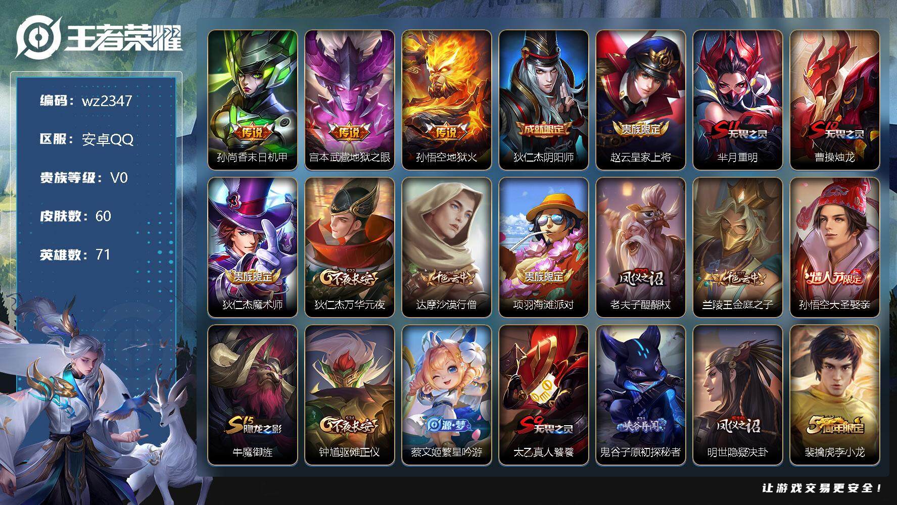【游戏多多】 【可二次实名】【wz2347】安卓Q-V0-荣耀黄金IV段位-71英雄-60皮肤-0典藏-0珍品无双-0无双-0珍品传说-3传说-15史诗 【传说皮肤】:孙尚香末日机甲,宫本武藏地狱之眼,孙悟空地狱火 【限定皮肤】:狄仁杰阴阳师,赵云皇家上将,芈月重明,曹操烛龙,狄仁杰魔术师,狄仁杰万华元夜,达摩沙漠行僧,项羽海滩派对,老夫子醍醐杖,兰陵王金庭之子,孙悟空大圣娶亲,牛魔御旌,钟馗驱傩正仪,蔡文姬繁星吟游,太乙真人饕餮,鬼谷子原初探秘者,明世隐疑决卦,裴擒虎李小龙,狂铁御狮 【赛季限定】:芈月重明,曹操烛龙,狄仁杰万华元夜,达摩沙漠行僧,老夫子醍醐杖,兰陵王金庭之子,牛魔御旌,钟馗驱傩正仪,太乙真人饕餮,鬼谷子原初探秘者,明世隐疑决卦,狂铁御狮 【史诗皮肤】:鲁班七号电玩小子,赵云皇家上将,赵云未来纪元,甄姬冰雪圆舞曲,狄仁杰魔术师,孙尚香水果甜心,妲己魅力维加斯,吕布末日机甲,花木兰水晶猎龙者,兰陵王暗隐猎兽者,程咬金功夫厨神,孙悟空大圣娶亲,狄仁杰鹰眼统帅,蔡文姬繁星吟游,裴擒虎李小龙 【其他皮肤】:项羽海滩派对,韩信教廷特使,扁鹊化身博士,妲己少女阿狸,典韦黄金武士,亚瑟死亡骑士,宫本武藏万象初新,狄仁杰阴阳师,钟无艳海滩丽影,太乙真人饕餮,宫本武藏霸王丸,曹操烛龙,芈月重明,狂铁御狮,项羽科学大爆炸,明世隐虹云星官,牛魔御旌,吕布野性能量,明世隐疑决卦,盾山圆桌骑士,老夫子醍醐杖,鬼谷子原初探秘者,狄仁杰万华元夜,露娜瓷语鉴心,钟馗驱傩正仪,达摩沙漠行僧,兰陵王金庭之子,鲁班七号木偶奇遇记,曹操死神来了,小乔万圣前夜,孙悟空西部大镖客,后羿精灵王,刘禅英喵野望,钟馗地府判官,李元芳特种部队,虞姬加勒比小姐,蔡文姬蔷薇王座,夏侯惇战争骑士,百里守约绝影神枪,百里玄策威尼斯狂欢,苏烈爱与和平,米莱狄精准探案法 【营地ID】:528339854