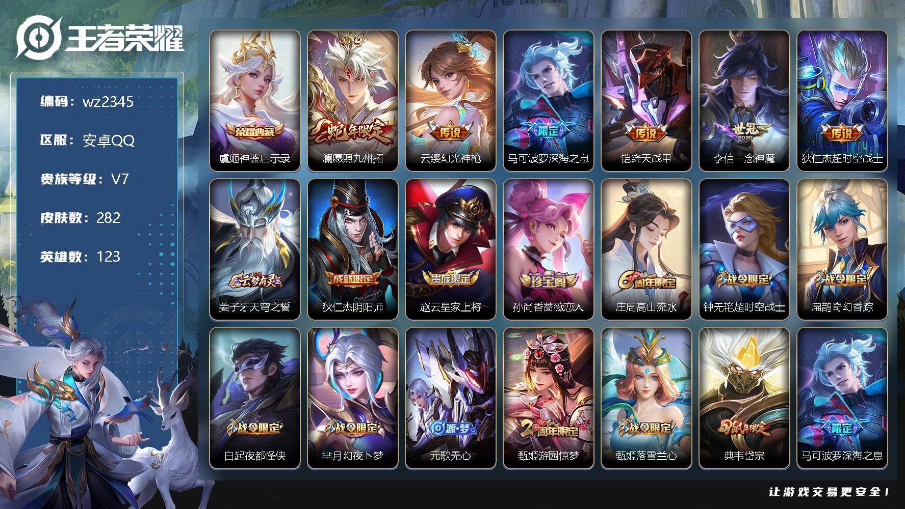 【游戏多多】 【可二次实名】【wz2345】安卓Q-V7-至尊星耀IV段位-123英雄-282皮肤-1典藏-0珍品无双-0无双-0珍品传说-6传说-82史诗 【英雄全皮】:蒙恬全皮,戈娅全皮 【荣耀典藏】:虞姬神鉴启示录 【传说皮肤】:澜愿照九州拓,云缨幻光神枪,马可波罗深海之息,铠绛天战甲,李信一念神魔,狄仁杰超时空战士 【限定皮肤】:姜子牙天穹之誓,狄仁杰阴阳师,赵云皇家上将,孙尚香蔷薇恋人,庄周高山流水,钟无艳超时空战士,扁鹊奇幻香踪,白起夜都怪侠,芈月幻夜卜梦,元歌无心,甄姬游园惊梦,甄姬落雪兰心,典韦岱宗,马可波罗深海之息,狄仁杰魔术师,狄仁杰万华元夜,达摩沙漠行僧,项羽海滩派对,老夫子醍醐杖,程咬金演武夺筹,王昭君午后时光,兰陵王金庭之子,孙悟空至尊宝,孙悟空孙行者,后羿圣弓游侠,李元芳云中旅人,钟馗驱傩正仪,杨戬潮玩骑兵,干将莫邪真爱魔法,雅典娜黎明之约,鬼谷子原初探秘者,鬼谷子五谷丰年,黄忠火炮绅士,铠青龙志,苏烈千军破阵,百里玄策原初追逐者,百里守约朱雀志,弈星混沌棋,沈梦溪大漠名商,明世隐疑决卦,明世隐吟游魔法,裴擒虎李小龙,裴擒虎擒涛扼浪,狂铁电玩高手,云中君纤云弄巧,上官婉儿梁祝,嫦娥拒霜思,嫦娥暖冬兔眠,西施玲珑珍味,鲁班大师探海日志,桑启海盐诗旅,暃星界游侠,戈娅驭风魔法,艾琳流音漫舞,司空震地狱燃心,阿古朵江河有灵,张良古海寻踪,蒙犽百解令,蒙恬荣光圣徽,高渐离燃音魔法,妲己灵卜魔法,鬼谷子天穹祈灯,姬小满妄想食味,沈梦溪龙舞盛年,鲁班七号蔬乡物语,李元芳蔬乡物语,刘邦剑破天穹,程咬金群星魔术团,镜青焰无极,项羽苍威无极,周瑜熔金海岸 【年限皮肤】:百里守约朱雀志,铠青龙志,典韦岱宗 【赛季限定】:狄仁杰万华元夜,达摩沙漠行僧,老夫子醍醐杖,程咬金演武夺筹,兰陵王金庭之子,张良古海寻踪,李元芳云中旅人,钟馗驱傩正仪,雅典娜黎明之约,鬼谷子原初探秘者,苏烈千军破阵,百里玄策原初追逐者,弈星混沌棋,沈梦溪大漠名商,明世隐疑决卦,裴擒虎擒涛扼浪,鲁班大师探海日志,桑启海盐诗旅,鬼谷子天穹祈灯,蒙恬荣光圣徽,刘邦剑破天穹,姜子牙天穹之誓 【战令限定】:钟无艳超时空战士,扁鹊奇幻香踪,白起夜都怪侠,芈月幻夜卜梦,甄姬落雪兰心,王昭君午后时光,艾琳流音漫舞,后羿圣弓游侠,杨戬潮玩骑兵,干将莫邪真爱魔法,黄忠火炮绅士,明世隐吟游魔法,狂铁电玩高手,嫦娥暖冬兔眠,西施玲珑珍味,司空震地狱燃心,暃星界游侠,戈娅驭风魔法,高渐离燃音魔法,妲己灵卜魔法,鲁班七号蔬乡物语,李元芳蔬乡物语,镜青焰无极,项羽苍威无极 【史诗皮肤】:阿轲暗夜猫娘,赵云皇家上将,貂蝉圣诞恋歌,甄姬冰雪圆舞曲,王昭君偶像歌手,狄仁杰魔术师,廉颇地狱岩魂,宫本武藏鬼剑武藏,孙尚香蔷薇恋人,孙尚香水果甜心,妲己魅力维加斯,妲己女仆咖啡,墨子龙骑士,墨子金属风暴,吕布圣诞狂欢,曹操幽灵船长,吕布末日机甲,张飞乱世虎臣,韩信白龙吟,孙悟空至尊宝,花木兰水晶猎龙者,刘邦德古拉伯爵,夏侯惇乘风破浪,小乔缤纷独角兽,兰陵王暗隐猎兽者,诸葛亮黄金分割率,甄姬游园惊梦,亚瑟心灵战警,安琪拉心灵骇客,百里守约特工魅影,铠曙光守护者,蔡文姬舞动绿茵,刘禅天才门将,李元芳逐浪之夏,程咬金功夫厨神,白起星夜王子,阿轲节奏热浪,孙策猫狗日记,大乔猫狗日记,铠青龙志,百里守约朱雀志,伽罗箭羽风息,狄仁杰鹰眼统帅,上官婉儿梁祝,典韦岱宗,大乔白蛇,橘右京修罗,孙尚香时之恋人,百里玄策原初追逐者,裴擒虎李小龙,云中君纤云弄巧,干将莫邪真爱魔法,沈梦溪月团寄思,孙悟空孙行者,庄周高山流水,嫦娥拒霜思,黄忠火炮绅士,雅典娜黎明之约,明世隐吟游魔法,狂铁电玩高手,钟无艳超时空战士,鬼谷子五谷丰年,元歌无心,暃星界游侠,扁鹊奇幻香踪,刘禅电玩爆裂旋风,戈娅驭风魔法,司空震地狱燃心,阿古朵江河有灵,蒙犽百解令,妲己灵卜魔法,高渐离燃音魔法,蒙恬荣光圣徽,姬小满妄想食味,鲁班七号蔬乡物语,镜青焰无极,牛魔星界战将,阿轲化蝶舞,刘禅鸭鸭历险记,狂铁龙之律动,后羿石田雨龙,黄忠百相守梦,公孙离涂山容容 【其他皮肤】:项羽海滩派对,韩信教廷特使,韩信街头霸王,露娜哥特玫瑰,阿轲爱心护理,达摩大发明家,赵云白执事,赵云忍炎影,芈月红桃皇后,白起白色死神,牛魔西部大镖客,武则天东方不败,扁鹊化身博士,扁鹊救世之瞳,宫本武藏未来纪元,安琪拉玩偶对对碰,孙膑天使之翼,姜子牙时尚教父,妲己少女阿狸,典韦黄金武士,亚瑟死亡骑士,达摩拳王,花木兰兔女郎,张飞五福同心,甄姬花好人间,刘备万事如意,后羿阿尔法小队,狄仁杰阴阳师,刘备纽约教父,关羽龙腾万里,墨子进击墨子号,钟无艳海滩丽影,宫本武藏霸王丸,王昭君幻想奇妙夜,狂铁命运角斗场,老夫子功夫老勺,孙尚香沉稳之力,诸葛亮掌控之力,鬼谷子幻乐之宴,苏烈坚韧之力,大乔守护之力,项羽科学大爆