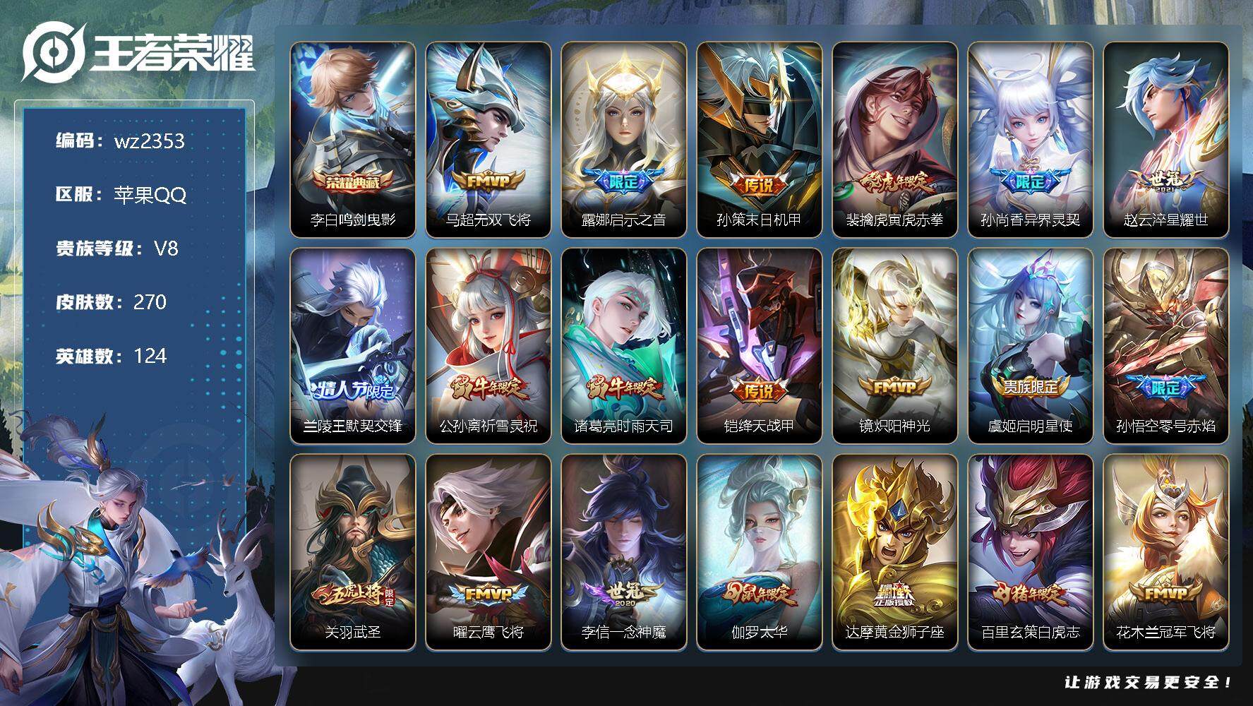 【游戏多多】 【可二次实名】【wz2353】苹果Q-V8-永恒钻石II段位-124英雄-270皮肤-1典藏-0珍品无双-0无双-0珍品传说-26传说-77史诗 【荣耀典藏】:李白鸣剑曳影 【传说皮肤】:马超无双飞将,露娜启示之音,孙策末日机甲,裴擒虎寅虎赤拳,孙尚香异界灵契,赵云淬星耀世,兰陵王默契交锋,公孙离祈雪灵祝,诸葛亮时雨天司,铠绛天战甲,镜炽阳神光,虞姬启明星使,孙悟空零号赤焰,关羽武圣,曜云鹰飞将,李信一念神魔,伽罗太华,达摩黄金狮子座,百里玄策白虎志,花木兰冠军飞将,后羿黄金射手座,貂蝉仲夏夜之梦,孙尚香末日机甲,宫本武藏地狱之眼,孙悟空地狱火,吕布天魔缭乱 【限定皮肤】:白起狰,狄仁杰阴阳师,虞姬凯尔特女王,廉颇寅虎御盾,赵云皇家上将,嬴政白昼王子,孙尚香异界灵契,鲁班七号狮舞东方,庄周蜃楼王,庄周高山流水,高渐离死亡摇滚,孙膑妖精王,扁鹊炼金王,白起夜都怪侠,芈月重明,芈月白晶晶,芈月幻夜卜梦,吕布天魔缭乱,吕布猎兽之王,吕布御风骁将,元歌云间偶戏,元歌无心,夏侯惇朔风刀,甄姬女儿国国王,甄姬游园惊梦,曹操烛龙,典韦穷奇,马可波罗逐梦之星,狄仁杰魔术师,狄仁杰万华元夜,达摩沙漠行僧,项羽海滩派对,项羽霸王别姬,老夫子醍醐杖,关羽冰锋战神,关羽武圣,露娜启示之音,韩信傲雪梅枪,兰陵王默契交锋,兰陵王金庭之子,花木兰青春决赛季,花木兰默契交锋,亚瑟潮玩骑士王,孙悟空美猴王,孙悟空至尊宝,孙悟空零号赤焰,孙悟空孙行者,牛魔御旌,牛魔奔雷神使,后羿圣弓游侠,李元芳云中旅人,虞姬霸王别姬,虞姬启明星使,钟馗神迹守卫,钟馗驱傩正仪,杨玉环遇见飞天,干将莫邪冰霜恋舞曲,干将莫邪真爱魔法,雅典娜单词大作战,雅典娜黎明之约,蔡文姬繁星吟游,太乙真人饕餮,东皇太一逐梦之光,鬼谷子原初探秘者,鬼谷子五谷丰年,诸葛亮时雨天司,黄忠火炮绅士,铠青龙志,苏烈千军破阵,百里玄策白虎志,百里玄策原初追逐者,百里守约朱雀志,弈星混沌棋,梦奇顽趣,公孙离祈雪灵祝,沈梦溪大漠名商,明世隐疑决卦,明世隐吟游魔法,裴擒虎李小龙,裴擒虎寅虎赤拳,裴擒虎擒涛扼浪,狂铁御狮,米莱狄御霄,云中君纤云弄巧,伽罗太华,盾山御銮,猪八戒猪悟能,上官婉儿梁祝,嫦娥拒霜思,蒙犽狂想玩偶喵,镜匿光追影者,桑启海盐诗旅,艾琳女武神,张良古海寻踪,鬼谷子天穹祈灯 【年限皮肤】:百里玄策白虎志,百里守约朱雀志,铠青龙志,孙悟空美猴王,裴擒虎寅虎赤拳,廉颇寅虎御盾,公孙离祈雪灵祝,吕布御风骁将,牛魔奔雷神使,诸葛亮时雨天司,伽罗太华,马超神威,关羽武圣 【赛季限定】:庄周蜃楼王,孙膑妖精王,扁鹊炼金王,白起狰,芈月重明,夏侯惇朔风刀,曹操烛龙,典韦穷奇,狄仁杰万华元夜,达摩沙漠行僧,老夫子醍醐杖,兰陵王金庭之子,张良古海寻踪,牛魔御旌,李元芳云中旅人,虞姬凯尔特女王,钟馗驱傩正仪,雅典娜黎明之约,太乙真人饕餮,鬼谷子原初探秘者,苏烈千军破阵,百里玄策原初追逐者,弈星混沌棋,梦奇顽趣,沈梦溪大漠名商,明世隐疑决卦,裴擒虎擒涛扼浪,狂铁御狮,米莱狄御霄,盾山御銮,桑启海盐诗旅,鬼谷子天穹祈灯 【战令限定】:嬴政白昼王子,鲁班七号狮舞东方,白起夜都怪侠,芈月幻夜卜梦,吕布猎兽之王,元歌云间偶戏,亚瑟潮玩骑士王,后羿圣弓游侠,钟馗神迹守卫,干将莫邪真爱魔法,雅典娜单词大作战,黄忠火炮绅士,明世隐吟游魔法,蒙犽狂想玩偶喵 【史诗皮肤】:鲁班七号电玩小子,露娜紫霞仙子,赵云皇家上将,赵云未来纪元,貂蝉圣诞恋歌,甄姬冰雪圆舞曲,王昭君偶像歌手,狄仁杰魔术师,宫本武藏鬼剑武藏,孙尚香水果甜心,妲己魅力维加斯,墨子金属风暴,吕布圣诞狂欢,曹操幽灵船长,李白千年之狐,韩信白龙吟,项羽霸王别姬,虞姬霸王别姬,关羽冰锋战神,孙悟空至尊宝,花木兰水晶猎龙者,刘邦德古拉伯爵,夏侯惇乘风破浪,小乔缤纷独角兽,诸葛亮黄金分割率,甄姬游园惊梦,马可波罗逐梦之星,安琪拉心灵骇客,花木兰青春决赛季,百里守约特工魅影,李元芳逐浪之夏,程咬金功夫厨神,白起星夜王子,阿轲节奏热浪,杨玉环遇见飞天,东皇太一逐梦之光,嬴政白昼王子,铠青龙志,百里守约朱雀志,干将莫邪冰霜恋舞曲,鲁班七号狮舞东方,狄仁杰鹰眼统帅,上官婉儿梁祝,蔡文姬繁星吟游,娜可露露晚萤,不知火舞魅语,橘右京修罗,马超神威,蒙犽狂想玩偶喵,百里玄策原初追逐者,裴擒虎李小龙,云中君纤云弄巧,元歌云间偶戏,芈月白晶晶,牛魔奔雷神使,吕布御风骁将,花木兰默契交锋,干将莫邪真爱魔法,安琪拉时之奇旅,孙悟空孙行者,猪八戒猪悟能,庄周高山流水,司马懿暗渊魔法,嫦娥拒霜思,镜匿光追影者,黄忠火炮绅士,雅典娜黎明之约,甄姬女儿国国王,韩信傲雪梅枪,廉颇寅虎御盾,夏洛特永昼,澜赏金猎手,明世隐吟游魔法,鬼谷子五谷丰年,元歌无心,梦奇顽趣,公孙离涂山容容 【其他皮肤】:项羽海滩派对,韩信教廷特使,韩信街