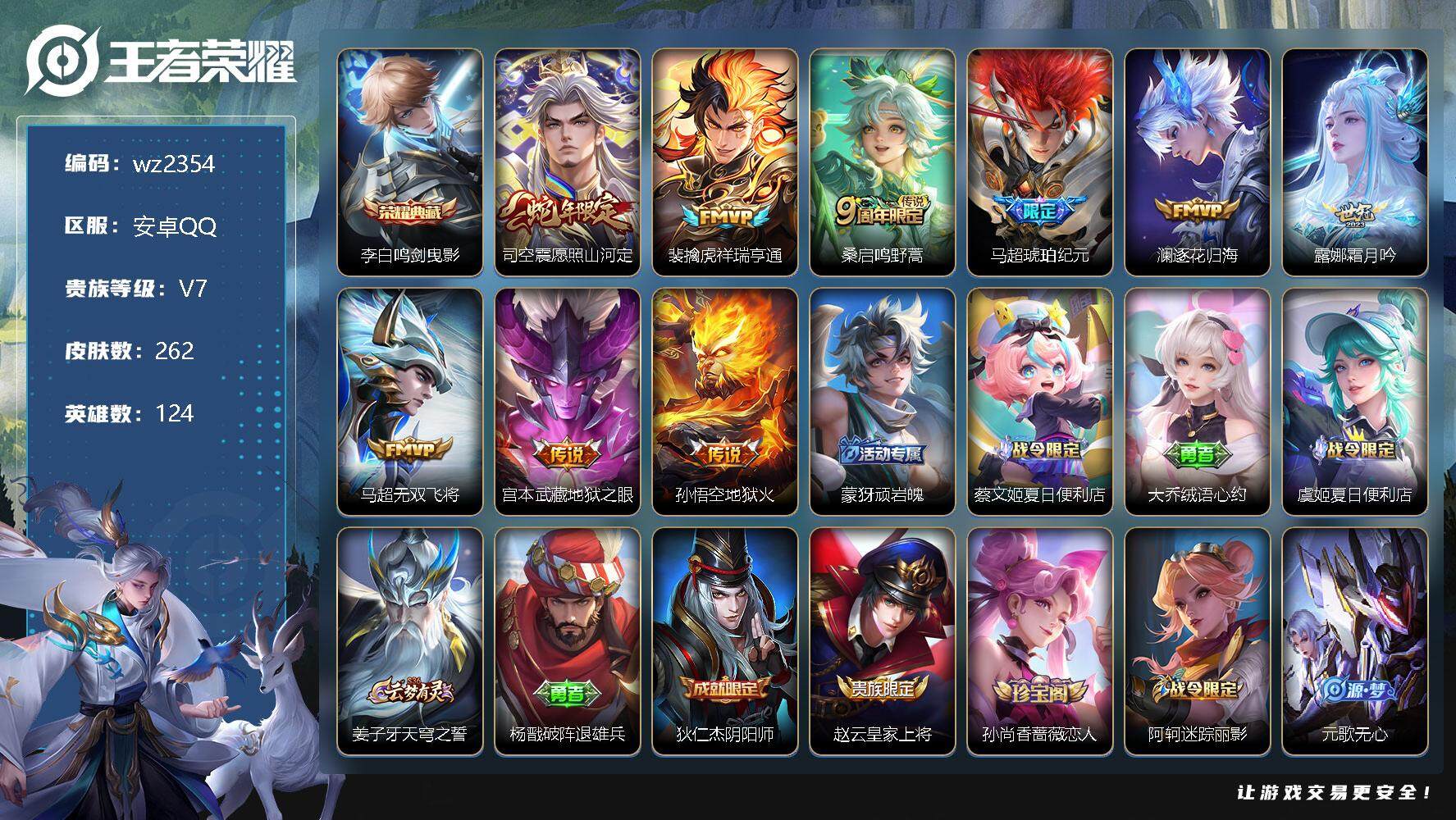 【游戏多多】 【可二次实名】【wz2354】安卓Q-V7-最强王者段位-124英雄-262皮肤-1典藏-0珍品无双-0无双-0珍品传说-9传说-69史诗 【英雄全皮】:蒙恬全皮,司空震全皮,戈娅全皮,影全皮 【荣耀典藏】:李白鸣剑曳影 【传说皮肤】:司空震愿照山河定,裴擒虎祥瑞亨通,桑启鸣野蒿,马超琥珀纪元,澜逐花归海,露娜霜月吟,马超无双飞将,宫本武藏地狱之眼,孙悟空地狱火 【限定皮肤】:蒙犽顽岩魄,蔡文姬夏日便利店,大乔绒语心约,虞姬夏日便利店,姜子牙天穹之誓,杨戬破阵退雄兵,狄仁杰阴阳师,赵云皇家上将,孙尚香蔷薇恋人,阿轲迷踪丽影,元歌无心,典韦蓝屏警告,狄仁杰魔术师,达摩沙漠行僧,项羽海滩派对,老夫子醍醐杖,兰陵王金庭之子,李元芳匿光侦查者,李元芳云中旅人,干将莫邪胡桃夹子,鬼谷子五谷丰年,沈梦溪大漠名商,裴擒虎李小龙,裴擒虎擒涛扼浪,云中君纤云弄巧,嫦娥拒霜思,嫦娥暖冬兔眠,西施玲珑珍味,鲁班大师探海日志,桑启海盐诗旅,暃星界游侠,戈娅驭风魔法,艾琳流音漫舞,司空震地狱燃心,阿古朵江河有灵,张良古海寻踪,蒙犽百解令,蒙恬荣光圣徽,高渐离燃音魔法,妲己灵卜魔法,鬼谷子天穹祈灯,伽罗琥珀纪元,马超琥珀纪元,沈梦溪龙舞盛年,鲁班七号蔬乡物语,李元芳蔬乡物语,刘邦剑破天穹,上官婉儿群星魔术团,程咬金群星魔术团,镜青焰无极,项羽苍威无极,刘备异域游侠,周瑜熔金海岸 【赛季限定】:达摩沙漠行僧,老夫子醍醐杖,兰陵王金庭之子,张良古海寻踪,李元芳云中旅人,沈梦溪大漠名商,裴擒虎擒涛扼浪,鲁班大师探海日志,桑启海盐诗旅,鬼谷子天穹祈灯,蒙恬荣光圣徽,刘邦剑破天穹,姜子牙天穹之誓 【战令限定】:蔡文姬夏日便利店,虞姬夏日便利店,阿轲迷踪丽影,典韦蓝屏警告,艾琳流音漫舞,嫦娥暖冬兔眠,西施玲珑珍味,司空震地狱燃心,暃星界游侠,戈娅驭风魔法,高渐离燃音魔法,妲己灵卜魔法,鲁班七号蔬乡物语,李元芳蔬乡物语,镜青焰无极,项羽苍威无极 【史诗皮肤】:露娜紫霞仙子,赵云皇家上将,赵云未来纪元,貂蝉圣诞恋歌,甄姬冰雪圆舞曲,狄仁杰魔术师,廉颇地狱岩魂,宫本武藏鬼剑武藏,孙尚香蔷薇恋人,孙尚香水果甜心,嬴政暗夜贵公子,妲己魅力维加斯,妲己女仆咖啡,墨子金属风暴,吕布圣诞狂欢,刘禅绅士熊喵,曹操幽灵船长,李白千年之狐,吕布末日机甲,张飞乱世虎臣,花木兰水晶猎龙者,夏侯惇乘风破浪,小乔缤纷独角兽,兰陵王暗隐猎兽者,亚瑟心灵战警,安琪拉心灵骇客,百里守约特工魅影,刘禅天才门将,白起星夜王子,阿轲节奏热浪,孙策猫狗日记,大乔猫狗日记,典韦蓝屏警告,狄仁杰鹰眼统帅,阿轲迷踪丽影,橘右京修罗,裴擒虎李小龙,云中君纤云弄巧,杨戬天秀启明,司马懿暗渊魔法,嫦娥拒霜思,澜赏金猎手,鬼谷子五谷丰年,元歌无心,暃星界游侠,戈娅驭风魔法,百里守约真我赫兹,李元芳匿光侦查者,司空震地狱燃心,阿古朵江河有灵,蒙犽百解令,妲己灵卜魔法,高渐离燃音魔法,蒙恬荣光圣徽,伽罗琥珀纪元,鲁班七号蔬乡物语,上官婉儿群星魔术团,镜青焰无极,黄忠怒海争锋,蔡文姬夏日便利店,蒙犽顽岩魄,姬小满战舞者,亚连破空之剑,百里守约百相守梦,牛魔星界战将,弈星万物之道,阿轲化蝶舞,狂铁龙之律动,黄忠百相守梦,西施织梦人 【其他皮肤】:项羽海滩派对,韩信教廷特使,韩信街头霸王,露娜哥特玫瑰,阿轲爱心护理,赵云忍炎影,芈月红桃皇后,程咬金星际陆战队,白起白色死神,牛魔西部大镖客,宫本武藏未来纪元,安琪拉玩偶对对碰,孙膑天使之翼,姜子牙时尚教父,妲己少女阿狸,典韦黄金武士,亚瑟死亡骑士,达摩拳王,花木兰兔女郎,张飞五福同心,甄姬花好人间,刘备万事如意,宫本武藏万象初新,后羿阿尔法小队,狄仁杰阴阳师,刘备纽约教父,关羽龙腾万里,钟无艳海滩丽影,王昭君幻想奇妙夜,狂铁命运角斗场,老夫子功夫老勺,孙尚香沉稳之力,诸葛亮掌控之力,李白敏锐之力,鬼谷子幻乐之宴,大乔守护之力,明世隐虹云星官,张良幽兰居士,小乔丁香结,吕布野性能量,孙膑归虚梦演,沈梦溪鲨炮海盗猫,姜子牙炽热元素使,哪吒次元突破,老夫子醍醐杖,狂铁特工战影,刘禅秘密基地,露娜瓷语鉴心,鲁班大师乓乓大师,干将莫邪胡桃夹子,马可波罗潮玩牛仔,达摩沙漠行僧,程咬金无双福将,刘邦虎啸剑宗,兰陵王金庭之子,米莱狄契约魔法,沈梦溪大漠名商,蒙恬蔚蓝守将,李元芳云中旅人,戈娅危途狂花,刘备潮玩造梦师,桑启海盐诗旅,嫦娥暖冬兔眠,海月幻泉雾影,猪八戒潮玩探月行,牛魔牛运亨通,白起乐园追猎者,赵怀真太极少年,裴擒虎擒涛扼浪,太乙真人劲辣红锅,莱西奥西部游侠,鲁班大师探海日志,西施玲珑珍味,姬小满零食大作战,李元芳妄想特派,哪吒热血海滩,艾琳流音漫舞,张良古海寻踪,钟无艳聚星闪耀,海月王牌新星,亚连破局者,兰陵王幻夜行动,曹操决胜大满贯,后羿完美运算,程咬金暖冬絮语,鬼谷子天穹祈灯,妲己灵卜魔法,海诺