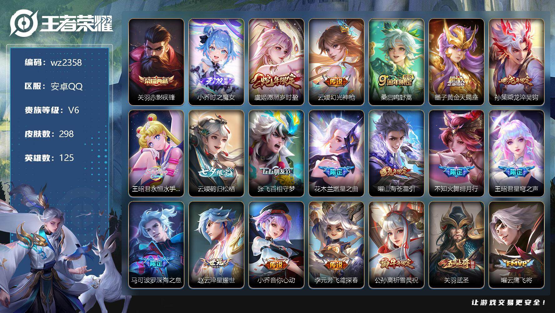 【游戏多多】 【可二次实名】【wz2358】安卓Q-V6-尊贵铂金I段位-125英雄-298皮肤-1典藏-0珍品无双-1无双-0珍品传说-24传说-86史诗 【英雄全皮】:关羽全皮,蒙恬全皮,赵怀真全皮,空空儿全皮,影全皮 【荣耀典藏】:关羽赤影疾锋 【无双皮肤】:小乔时之魔女 【传说皮肤】:虞姬愿照岁时盈,云缨幻光神枪,桑启鸣野蒿,墨子黄金天蝎座,孙策乘龙淬吴钩,王昭君永恒水手月亮,云缨鹤归松栖,张飞百相守梦,花木兰燃星之曲,曜山海苍雷引,不知火舞绯月行,王昭君星穹之声,马可波罗深海之息,赵云淬星耀世,小乔音你心动,李元芳飞鸢探春,公孙离祈雪灵祝,关羽武圣,曜云鹰飞将,李信一念神魔,刘备时之恋人,干将莫邪久胜战神,孙尚香末日机甲,狄仁杰超时空战士 【限定皮肤】:白起狰,大乔绒语心约,狄仁杰阴阳师,赵云皇家上将,嬴政白昼王子,庄周云端筑梦师,庄周高山流水,高渐离玩趣恶龙,钟无艳王者之锤,扁鹊奇幻香踪,芈月重明,吕布猎兽之王,吕布御风骁将,元歌无心,夏侯惇朔风刀,曹操烛龙,典韦穷奇,典韦蓝屏警告,马可波罗深海之息,狄仁杰魔术师,狄仁杰万华元夜,达摩沙漠行僧,项羽海滩派对,老夫子醍醐杖,关羽冰锋战神,关羽武圣,关羽百相守梦,程咬金演武夺筹,露娜一生所爱,王昭君星穹之声,兰陵王金庭之子,花木兰燃星之曲,不知火舞绯月行,孙悟空孙行者,牛魔御旌,后羿如梦令,张飞百相守梦,李元芳云中旅人,杨玉环寅虎心曲,杨戬潮玩骑兵,太乙真人饕餮,鬼谷子原初探秘者,鬼谷子五谷丰年,苏烈千军破阵,百里玄策原初追逐者,弈星混沌棋,公孙离祈雪灵祝,沈梦溪大漠名商,明世隐疑决卦,裴擒虎李小龙,裴擒虎擒涛扼浪,狂铁御狮,米莱狄御霄,瑶山海碧波行,云中君纤云弄巧,盾山御銮,上官婉儿梁祝,嫦娥拒霜思,曜山海苍雷引,鲁班大师探海日志,桑启海盐诗旅,艾琳流音漫舞,赵怀真鹤归松栖,云缨鹤归松栖,司空震地狱燃心,阿古朵江河有灵,张良古海寻踪,王昭君永恒水手月亮,蒙犽百解令,蒙恬荣光圣徽,鬼谷子天穹祈灯,姬小满妄想食味,小乔时之魔女,孙策乘龙淬吴钩,沈梦溪龙舞盛年,鲁班七号蔬乡物语,李元芳蔬乡物语,刘邦剑破天穹,程咬金群星魔术团,关羽决胜骁骑,周瑜熔金海岸 【年限皮肤】:杨玉环寅虎心曲,公孙离祈雪灵祝,吕布御风骁将,关羽武圣,瑶山海碧波行,曜山海苍雷引,孙策乘龙淬吴钩 【赛季限定】:白起狰,芈月重明,夏侯惇朔风刀,曹操烛龙,典韦穷奇,狄仁杰万华元夜,达摩沙漠行僧,老夫子醍醐杖,程咬金演武夺筹,兰陵王金庭之子,张良古海寻踪,牛魔御旌,李元芳云中旅人,太乙真人饕餮,鬼谷子原初探秘者,苏烈千军破阵,百里玄策原初追逐者,弈星混沌棋,沈梦溪大漠名商,明世隐疑决卦,裴擒虎擒涛扼浪,狂铁御狮,米莱狄御霄,盾山御銮,鲁班大师探海日志,桑启海盐诗旅,鬼谷子天穹祈灯,蒙恬荣光圣徽,刘邦剑破天穹 【战令限定】:嬴政白昼王子,扁鹊奇幻香踪,吕布猎兽之王,典韦蓝屏警告,艾琳流音漫舞,杨戬潮玩骑兵,司空震地狱燃心,鲁班七号蔬乡物语,李元芳蔬乡物语 【史诗皮肤】:鲁班七号电玩小子,露娜紫霞仙子,钟无艳王者之锤,赵云皇家上将,赵云未来纪元,貂蝉圣诞恋歌,甄姬冰雪圆舞曲,王昭君偶像歌手,狄仁杰魔术师,廉颇地狱岩魂,宫本武藏鬼剑武藏,孙尚香水果甜心,嬴政暗夜贵公子,妲己魅力维加斯,妲己女仆咖啡,墨子龙骑士,墨子金属风暴,吕布圣诞狂欢,刘禅绅士熊喵,李白千年之狐,张飞乱世虎臣,韩信白龙吟,关羽冰锋战神,花木兰水晶猎龙者,刘邦德古拉伯爵,夏侯惇乘风破浪,小乔缤纷独角兽,兰陵王暗隐猎兽者,诸葛亮黄金分割率,亚瑟心灵战警,雅典娜冰冠公主,安琪拉心灵骇客,庄周云端筑梦师,百里守约特工魅影,铠曙光守护者,蔡文姬舞动绿茵,刘禅天才门将,李元芳逐浪之夏,程咬金功夫厨神,阿轲节奏热浪,嬴政白昼王子,孙策猫狗日记,露娜一生所爱,典韦蓝屏警告,伽罗箭羽风息,狄仁杰鹰眼统帅,公孙离无限星赏官,上官婉儿梁祝,娜可露露晚萤,后羿如梦令,大乔白蛇,不知火舞魅语,橘右京修罗,瑶遇见神鹿,百里玄策原初追逐者,裴擒虎李小龙,云中君纤云弄巧,吕布御风骁将,西施诗语江南,杨戬天秀启明,沈梦溪月团寄思,钟馗乐园奇幻夜,孙悟空孙行者,庄周高山流水,司马懿暗渊魔法,嫦娥拒霜思,杨玉环寅虎心曲,夏洛特永昼,澜赏金猎手,鬼谷子五谷丰年,元歌无心,瑶山海碧波行,扁鹊奇幻香踪,关羽百相守梦,赵怀真鹤归松栖,司空震地狱燃心,阿古朵江河有灵,蒙犽百解令,蒙恬荣光圣徽,姬小满妄想食味,鲁班七号蔬乡物语,关羽决胜骁骑,黄忠怒海争锋,赵怀真器灵浮梦炉,阿轲化蝶舞,狂铁龙之律动 【其他皮肤】:项羽海滩派对,韩信教廷特使,韩信街头霸王,露娜哥特玫瑰,阿轲爱心护理,达摩大发明家,赵云忍炎影,芈月红桃皇后,程咬金爱与正义,白起白色死神,牛魔西部大镖客,扁鹊化身博士,扁鹊救世之瞳,宫本武藏未来纪元,安琪拉玩偶