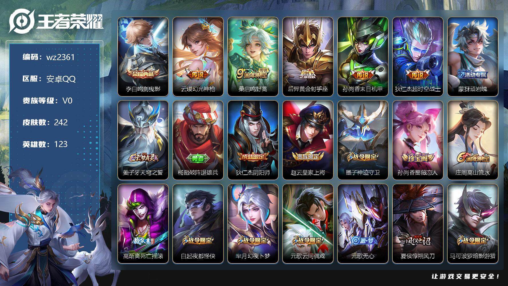 【游戏多多】 【可二次实名】【wz2361】安卓Q-V0-尊贵铂金II段位-123英雄-242皮肤-1典藏-0珍品无双-0无双-0珍品传说-5传说-74史诗 【荣耀典藏】:李白鸣剑曳影 【传说皮肤】:云缨幻光神枪,桑启鸣野蒿,后羿黄金射手座,孙尚香末日机甲,狄仁杰超时空战士 【限定皮肤】:蒙犽顽岩魄,姜子牙天穹之誓,杨戬破阵退雄兵,狄仁杰阴阳师,赵云皇家上将,墨子神迹守卫,孙尚香蔷薇恋人,庄周高山流水,高渐离死亡摇滚,白起夜都怪侠,芈月幻夜卜梦,元歌云间偶戏,元歌无心,夏侯惇朔风刀,马可波罗暗影游猎,狄仁杰魔术师,狄仁杰万华元夜,达摩星际陆战队,达摩沙漠行僧,项羽海滩派对,老夫子醍醐杖,老夫子航海奇遇记,程咬金演武夺筹,兰陵王金庭之子,亚瑟潮玩骑士王,孙悟空孙行者,牛魔御旌,后羿圣弓游侠,李元芳云中旅人,虞姬霸王别姬,钟馗驱傩正仪,杨玉环遇见飞天,干将莫邪真爱魔法,雅典娜单词大作战,雅典娜黎明之约,蔡文姬繁星吟游,鬼谷子原初探秘者,鬼谷子五谷丰年,黄忠火炮绅士,苏烈千军破阵,百里玄策原初追逐者,百里守约朱雀志,弈星混沌棋,梦奇顽趣,沈梦溪大漠名商,明世隐疑决卦,明世隐吟游魔法,裴擒虎李小龙,裴擒虎擒涛扼浪,米莱狄胡桃异想国,云中君纤云弄巧,盾山御銮,猪八戒西部大镖客,上官婉儿梁祝,嫦娥拒霜思,蒙犽狂想玩偶喵,鲁班大师探海日志,镜匿光追影者,桑启海盐诗旅,艾琳女武神,阿古朵江河有灵,张良古海寻踪,蒙恬荣光圣徽,鬼谷子天穹祈灯,姬小满妄想食味,沈梦溪龙舞盛年,刘邦剑破天穹,周瑜熔金海岸 【年限皮肤】:百里守约朱雀志 【赛季限定】:夏侯惇朔风刀,狄仁杰万华元夜,达摩沙漠行僧,老夫子醍醐杖,程咬金演武夺筹,兰陵王金庭之子,张良古海寻踪,牛魔御旌,李元芳云中旅人,钟馗驱傩正仪,雅典娜黎明之约,鬼谷子原初探秘者,苏烈千军破阵,百里玄策原初追逐者,弈星混沌棋,梦奇顽趣,沈梦溪大漠名商,明世隐疑决卦,裴擒虎擒涛扼浪,盾山御銮,鲁班大师探海日志,桑启海盐诗旅,鬼谷子天穹祈灯,蒙恬荣光圣徽,刘邦剑破天穹,姜子牙天穹之誓 【战令限定】:墨子神迹守卫,白起夜都怪侠,芈月幻夜卜梦,元歌云间偶戏,马可波罗暗影游猎,达摩星际陆战队,老夫子航海奇遇记,亚瑟潮玩骑士王,后羿圣弓游侠,干将莫邪真爱魔法,雅典娜单词大作战,黄忠火炮绅士,明世隐吟游魔法,米莱狄胡桃异想国,猪八戒西部大镖客,蒙犽狂想玩偶喵 【史诗皮肤】:鲁班七号电玩小子,项羽苍穹之光,露娜紫霞仙子,阿轲暗夜猫娘,赵云皇家上将,貂蝉圣诞恋歌,甄姬冰雪圆舞曲,王昭君偶像歌手,狄仁杰魔术师,廉颇地狱岩魂,宫本武藏鬼剑武藏,孙尚香蔷薇恋人,孙尚香水果甜心,嬴政暗夜贵公子,嬴政摇滚巨星,妲己魅力维加斯,妲己女仆咖啡,墨子金属风暴,吕布圣诞狂欢,刘禅绅士熊喵,曹操幽灵船长,韩信白龙吟,虞姬霸王别姬,花木兰水晶猎龙者,刘邦德古拉伯爵,夏侯惇乘风破浪,小乔缤纷独角兽,兰陵王暗隐猎兽者,雅典娜冰冠公主,安琪拉心灵骇客,百里守约特工魅影,铠曙光守护者,蔡文姬舞动绿茵,刘禅天才门将,李元芳逐浪之夏,程咬金功夫厨神,白起星夜王子,阿轲节奏热浪,杨玉环遇见飞天,孙策猫狗日记,百里守约朱雀志,伽罗箭羽风息,狄仁杰鹰眼统帅,上官婉儿梁祝,蔡文姬繁星吟游,不知火舞魅语,橘右京修罗,孙尚香时之恋人,马可波罗暗影游猎,蒙犽狂想玩偶喵,百里玄策原初追逐者,裴擒虎李小龙,云中君纤云弄巧,元歌云间偶戏,米莱狄胡桃异想国,老夫子航海奇遇记,干将莫邪真爱魔法,孙悟空孙行者,庄周高山流水,嫦娥拒霜思,镜匿光追影者,黄忠火炮绅士,雅典娜黎明之约,明世隐吟游魔法,鬼谷子五谷丰年,元歌无心,梦奇顽趣,刘禅电玩爆裂旋风,阿古朵江河有灵,周瑜雪夜绮愿,蒙恬荣光圣徽,姬小满妄想食味,蒙犽顽岩魄,牛魔星界战将 【其他皮肤】:项羽海滩派对,韩信教廷特使,韩信街头霸王,露娜哥特玫瑰,达摩大发明家,赵云白执事,赵云忍炎影,艾琳女武神,程咬金爱与正义,白起白色死神,武则天东方不败,扁鹊化身博士,扁鹊救世之瞳,宫本武藏未来纪元,安琪拉玩偶对对碰,孙膑天使之翼,妲己少女阿狸,典韦黄金武士,亚瑟死亡骑士,花木兰兔女郎,张飞五福同心,甄姬花好人间,刘备万事如意,后羿阿尔法小队,狄仁杰阴阳师,刘备纽约教父,高渐离死亡摇滚,关羽龙腾万里,墨子进击墨子号,钟无艳海滩丽影,宫本武藏霸王丸,王昭君幻想奇妙夜,老夫子功夫老勺,牛魔制霸全明星,孙尚香沉稳之力,诸葛亮掌控之力,李白敏锐之力,鬼谷子幻乐之宴,苏烈坚韧之力,大乔守护之力,项羽科学大爆炸,明世隐虹云星官,庄周奇妙博物学,牛魔御旌,小乔丁香结,吕布野性能量,盾山御銮,孙膑归虚梦演,沈梦溪鲨炮海盗猫,姜子牙炽热元素使,夏侯惇朔风刀,弈星混沌棋,哪吒次元突破,鲁班七号黑桃队长,明世隐疑决卦,盾山圆桌骑士,老夫子醍醐杖,猪八戒西部大镖客,狂铁特工战影,廉颇无尽征程