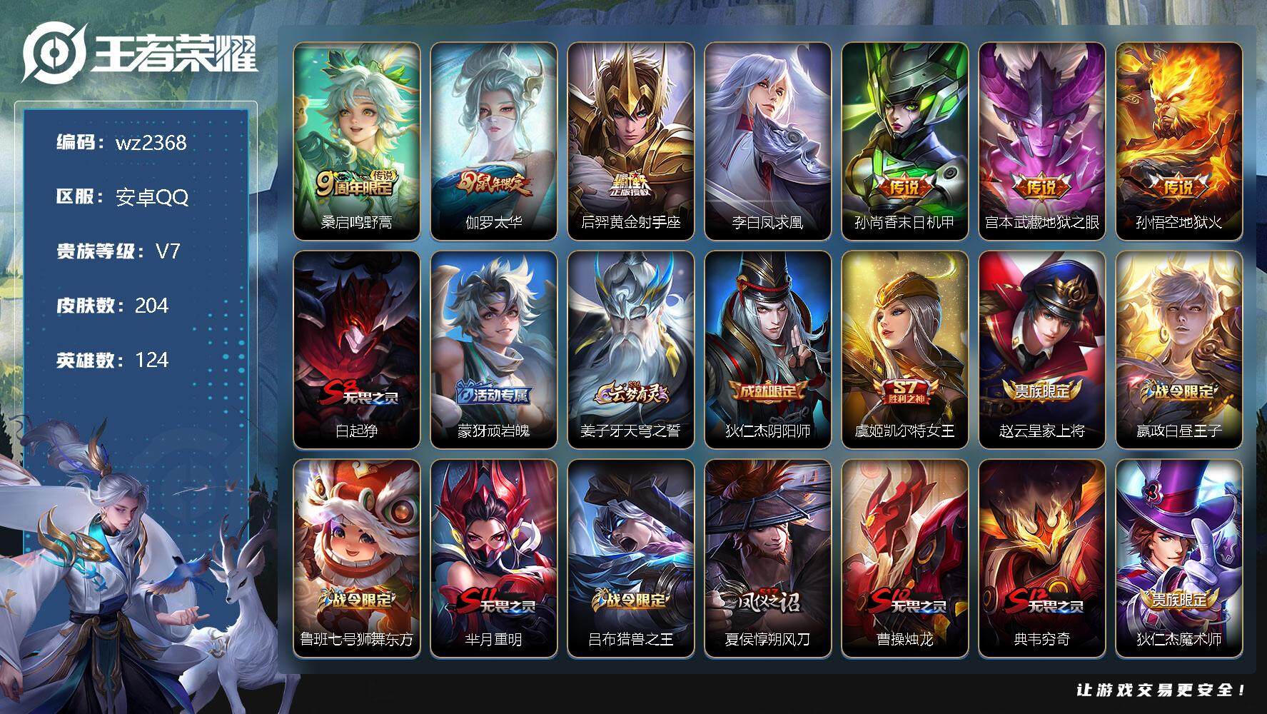 【游戏多多】 【可二次实名】【wz2368】安卓Q-V7-最强王者段位-124英雄-204皮肤-0典藏-0珍品无双-0无双-0珍品传说-7传说-47史诗 【英雄全皮】:空空儿全皮 【传说皮肤】:桑启鸣野蒿,伽罗太华,后羿黄金射手座,李白凤求凰,孙尚香末日机甲,宫本武藏地狱之眼,孙悟空地狱火 【限定皮肤】:白起狰,蒙犽顽岩魄,姜子牙天穹之誓,狄仁杰阴阳师,虞姬凯尔特女王,赵云皇家上将,嬴政白昼王子,鲁班七号狮舞东方,芈月重明,吕布猎兽之王,夏侯惇朔风刀,曹操烛龙,典韦穷奇,狄仁杰魔术师,狄仁杰万华元夜,项羽海滩派对,老夫子醍醐杖,关羽冰锋战神,韩信逐梦之影,兰陵王金庭之子,孙悟空至尊宝,牛魔御旌,李元芳银河之约,李元芳云中旅人,钟馗神迹守卫,钟馗驱傩正仪,杨玉环遇见飞天,蔡文姬繁星吟游,太乙真人饕餮,鬼谷子原初探秘者,苏烈千军破阵,百里玄策原初追逐者,弈星混沌棋,沈梦溪星空之诺,沈梦溪大漠名商,明世隐疑决卦,裴擒虎李小龙,裴擒虎擒涛扼浪,狂铁御狮,米莱狄御霄,云中君纤云弄巧,伽罗太华,盾山御銮,鲁班大师探海日志,艾琳女武神,张良古海寻踪,鬼谷子天穹祈灯,沈梦溪龙舞盛年,刘邦剑破天穹,程咬金群星魔术团,周瑜熔金海岸 【年限皮肤】:李白凤求凰,伽罗太华 【赛季限定】:白起狰,芈月重明,夏侯惇朔风刀,曹操烛龙,典韦穷奇,狄仁杰万华元夜,老夫子醍醐杖,兰陵王金庭之子,张良古海寻踪,牛魔御旌,李元芳云中旅人,虞姬凯尔特女王,钟馗驱傩正仪,太乙真人饕餮,鬼谷子原初探秘者,苏烈千军破阵,百里玄策原初追逐者,弈星混沌棋,沈梦溪大漠名商,明世隐疑决卦,裴擒虎擒涛扼浪,狂铁御狮,米莱狄御霄,盾山御銮,鲁班大师探海日志,鬼谷子天穹祈灯,刘邦剑破天穹,姜子牙天穹之誓 【战令限定】:嬴政白昼王子,鲁班七号狮舞东方,吕布猎兽之王,李元芳银河之约,钟馗神迹守卫,沈梦溪星空之诺 【史诗皮肤】:阿轲暗夜猫娘,赵云皇家上将,赵云未来纪元,貂蝉圣诞恋歌,甄姬冰雪圆舞曲,狄仁杰魔术师,宫本武藏鬼剑武藏,孙尚香水果甜心,嬴政暗夜贵公子,嬴政摇滚巨星,妲己魅力维加斯,妲己女仆咖啡,墨子龙骑士,李白千年之狐,吕布末日机甲,关羽冰锋战神,孙悟空至尊宝,花木兰水晶猎龙者,刘邦德古拉伯爵,韩信逐梦之影,夏侯惇乘风破浪,兰陵王暗隐猎兽者,诸葛亮黄金分割率,雅典娜冰冠公主,百里守约特工魅影,铠曙光守护者,蔡文姬舞动绿茵,李元芳逐浪之夏,程咬金功夫厨神,白起星夜王子,杨玉环遇见飞天,嬴政白昼王子,伽罗箭羽风息,鲁班七号狮舞东方,狄仁杰鹰眼统帅,蔡文姬繁星吟游,李元芳银河之约,百里玄策原初追逐者,裴擒虎李小龙,云中君纤云弄巧,杨戬天秀启明,蒙犽顽岩魄,刘禅鸭鸭历险记,狂铁龙之律动,周瑜百相守梦,黄忠百相守梦,公孙离涂山容容 【其他皮肤】:项羽海滩派对,韩信教廷特使,韩信街头霸王,露娜哥特玫瑰,阿轲爱心护理,达摩大发明家,赵云忍炎影,艾琳女武神,程咬金爱与正义,白起白色死神,牛魔西部大镖客,扁鹊化身博士,安琪拉玩偶对对碰,孙膑天使之翼,妲己少女阿狸,典韦黄金武士,亚瑟死亡骑士,达摩拳王,花木兰兔女郎,张飞五福同心,甄姬花好人间,宫本武藏万象初新,后羿阿尔法小队,狄仁杰阴阳师,刘备纽约教父,刘备汉昭烈帝,关羽龙腾万里,虞姬凯尔特女王,墨子进击墨子号,白起狰,钟无艳海滩丽影,太乙真人饕餮,宫本武藏霸王丸,曹操烛龙,王昭君幻想奇妙夜,芈月重明,狂铁命运角斗场,老夫子功夫老勺,孙尚香沉稳之力,典韦穷奇,诸葛亮掌控之力,李白敏锐之力,鬼谷子幻乐之宴,狂铁御狮,大乔守护之力,项羽科学大爆炸,米莱狄御霄,吕布猎兽之王,明世隐虹云星官,张良幽兰居士,庄周奇妙博物学,牛魔御旌,钟馗神迹守卫,盾山御銮,沈梦溪鲨炮海盗猫,夏侯惇朔风刀,沈梦溪星空之诺,弈星混沌棋,哪吒次元突破,鲁班七号黑桃队长,明世隐疑决卦,盾山圆桌骑士,老夫子醍醐杖,鬼谷子原初探秘者,狄仁杰万华元夜,刘禅秘密基地,杨戬次元傲视,钟馗驱傩正仪,鲁班大师乓乓大师,苏烈千军破阵,典韦铁甲之心,马可波罗潮玩牛仔,程咬金无双福将,兰陵王金庭之子,沈梦溪大漠名商,李元芳云中旅人,猪八戒潮玩探月行,裴擒虎擒涛扼浪,莱西奥西部游侠,鲁班大师探海日志,张良古海寻踪,后羿完美运算,鬼谷子天穹祈灯,海诺时空谍影,廉颇功夫炙烤,沈梦溪龙舞盛年,钟无艳春野之旅,刘邦剑破天穹,程咬金群星魔术团,姜子牙天穹之誓,周瑜熔金海岸,盘古敬我三分,东皇太一噬灭天穹,姜子牙星梦巡礼,钟馗虚灵犬护,沈梦溪鸭鸭历险记,露娜命运加冕,白起死霸装,甄姬逆浪荇歌,孙策百相守梦,庄周锦麟游梦,空空儿戏梦巡演,高渐离落日弦歌,莱西奥踏浪烽翎,鬼谷子克喵,哪吒罗小黑战记,鲁班七号福禄兄弟,高渐离金属狂潮,貂蝉异域舞娘,花木兰剑舞者,狄仁杰锦衣卫,小乔万圣前夜,孙悟空西部大镖客,兰陵王隐刃,李白范海辛,钟馗地府判官,李元芳