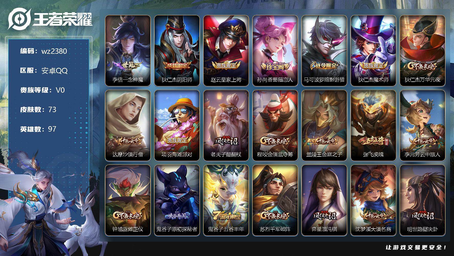 【游戏多多】 【可二次实名】【wz2380】安卓Q-V0-荣耀黄金IV段位-97英雄-73皮肤-0典藏-0珍品无双-0无双-0珍品传说-1传说-17史诗 【传说皮肤】:李信一念神魔 【限定皮肤】:狄仁杰阴阳师,赵云皇家上将,孙尚香蔷薇恋人,马可波罗暗影游猎,狄仁杰魔术师,狄仁杰万华元夜,达摩沙漠行僧,项羽海滩派对,老夫子醍醐杖,程咬金演武夺筹,兰陵王金庭之子,张飞虎魄,李元芳云中旅人,钟馗驱傩正仪,鬼谷子原初探秘者,鬼谷子五谷丰年,苏烈千军破阵,弈星混沌棋,沈梦溪大漠名商,明世隐疑决卦,猪八戒西部大镖客,桑启海盐诗旅 【年限皮肤】:张飞虎魄 【赛季限定】:狄仁杰万华元夜,达摩沙漠行僧,老夫子醍醐杖,程咬金演武夺筹,兰陵王金庭之子,李元芳云中旅人,钟馗驱傩正仪,鬼谷子原初探秘者,苏烈千军破阵,弈星混沌棋,沈梦溪大漠名商,明世隐疑决卦,桑启海盐诗旅 【战令限定】:马可波罗暗影游猎,猪八戒西部大镖客 【史诗皮肤】:赵云皇家上将,貂蝉圣诞恋歌,狄仁杰魔术师,宫本武藏鬼剑武藏,孙尚香蔷薇恋人,妲己魅力维加斯,曹操幽灵船长,张飞乱世虎臣,夏侯惇乘风破浪,百里守约特工魅影,蔡文姬舞动绿茵,狄仁杰鹰眼统帅,橘右京修罗,孙尚香时之恋人,马可波罗暗影游猎,张飞虎魄,鬼谷子五谷丰年 【其他皮肤】:项羽海滩派对,韩信教廷特使,赵云忍炎影,亚瑟死亡骑士,达摩拳王,花木兰兔女郎,甄姬花好人间,刘备万事如意,狄仁杰阴阳师,关羽龙腾万里,钟无艳海滩丽影,诸葛亮掌控之力,李白敏锐之力,吕布野性能量,弈星混沌棋,明世隐疑决卦,老夫子醍醐杖,猪八戒西部大镖客,狂铁特工战影,廉颇无尽征程,鬼谷子原初探秘者,狄仁杰万华元夜,程咬金演武夺筹,张良缤纷绘卷,钟馗驱傩正仪,苏烈千军破阵,达摩沙漠行僧,兰陵王金庭之子,刘禅唤灵魔甲,沈梦溪大漠名商,蒙恬蔚蓝守将,李元芳云中旅人,桑启海盐诗旅,老夫子潮流仙人,张良一千零一夜,后羿精灵王,刘禅英喵野望,李白范海辛,钟馗地府判官,关羽天启骑士,苍维京掠夺者,杨戬埃及法老,哪吒三太子,铠龙域领主,裴擒虎街头旋风,米莱狄精准探案法,伽罗花见巫女,李信灼热之刃,嫦娥露花倒影,曜归虚梦演,马超幸存者,蒙犽归虚梦演,蒙恬秩序猎龙将,澜孤猎,云缨赤焰之缨 【内测皮肤】:孙尚香蔷薇恋人,狂铁特工战影 【营地ID】:534245417