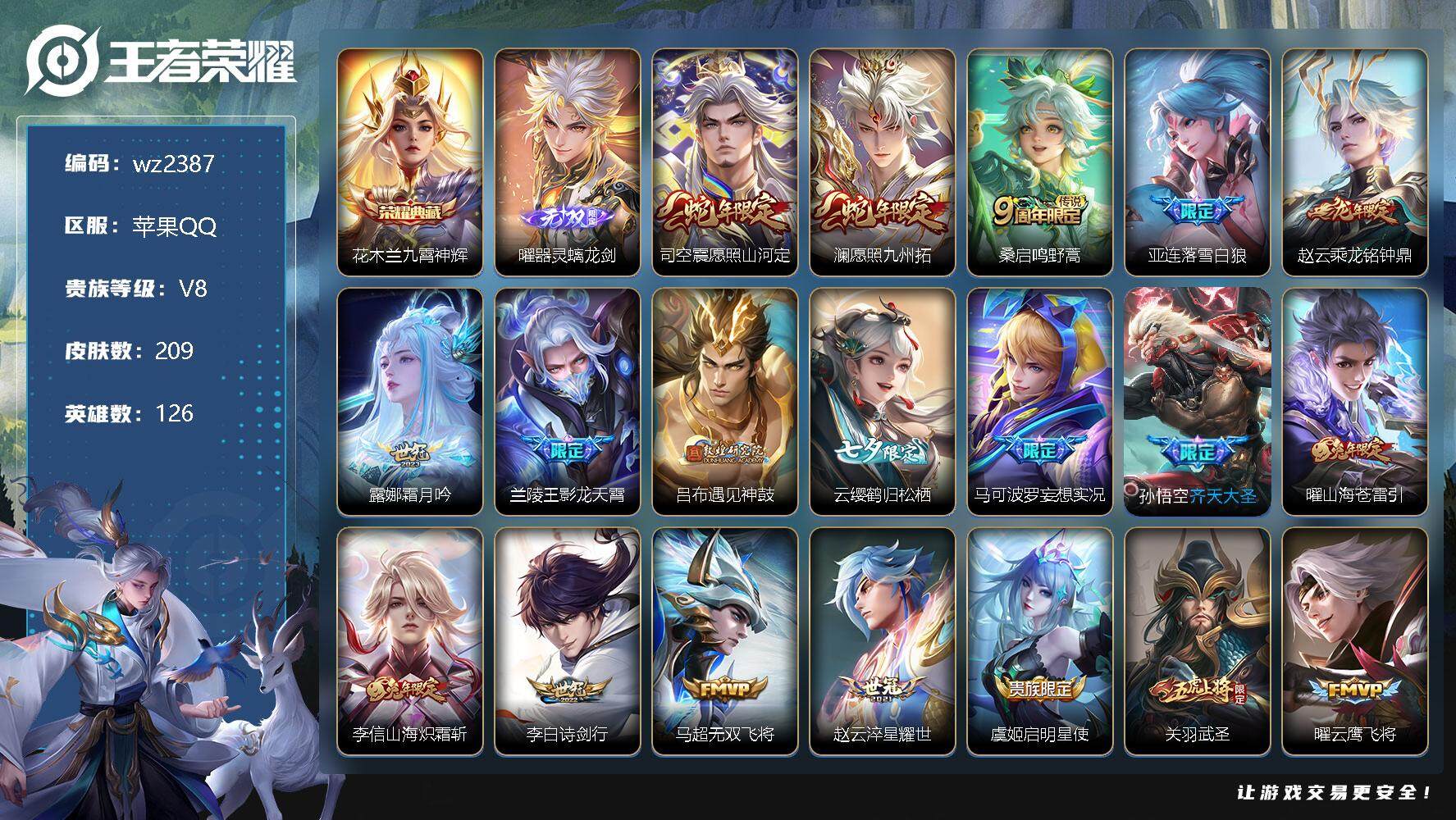 【游戏多多】 【可二次实名】【wz2387】苹果Q-V8-最强王者段位-126英雄-209皮肤-1典藏-0珍品无双-1无双-0珍品传说-24传说-59史诗 【英雄全皮】:李信全皮,蒙恬全皮,司空震全皮,影全皮 【荣耀典藏】:花木兰九霄神辉 【无双皮肤】:曜器灵螭龙剑 【传说皮肤】:司空震愿照山河定,澜愿照九州拓,桑启鸣野蒿,亚连落雪白狼,赵云乘龙铭钟鼎,露娜霜月吟,兰陵王影龙天霄,吕布遇见神鼓,云缨鹤归松栖,马可波罗妄想实况,孙悟空齐天大圣,曜山海苍雷引,李信山海炽霜斩,李白诗剑行,马超无双飞将,赵云淬星耀世,虞姬启明星使,关羽武圣,曜云鹰飞将,李信一念神魔,刘备时之恋人,达摩黄金狮子座,百里玄策白虎志,宫本武藏地狱之眼 【限定皮肤】:姜子牙天穹之誓,杨戬破阵退雄兵,狄仁杰阴阳师,赵云皇家上将,赵云龙胆,吕布御风骁将,吕布遇见神鼓,曹操天狼征服者,马可波罗山海玄木吟,马可波罗妄想实况,狄仁杰魔术师,达摩沙漠行僧,项羽海滩派对,关羽武圣,韩信傲雪梅枪,兰陵王影龙天霄,兰陵王金庭之子,花木兰瑞麟志,孙悟空齐天大圣,李元芳银河之约,李元芳匿光侦查者,李元芳云中旅人,虞姬启明星使,百里玄策白虎志,沈梦溪大漠名商,裴擒虎李小龙,云中君纤云弄巧,李信山海炽霜斩,嫦娥暖冬兔眠,曜山海苍雷引,西施玲珑珍味,鲁班大师探海日志,桑启海盐诗旅,暃星界游侠,戈娅驭风魔法,艾琳流音漫舞,赵怀真鹤归松栖,云缨鹤归松栖,司空震地狱燃心,阿古朵江河有灵,张良古海寻踪,蒙犽百解令,蒙恬荣光圣徽,高渐离燃音魔法,妲己灵卜魔法,鬼谷子天穹祈灯,姬小满妄想食味,赵云乘龙铭钟鼎,百里玄策超元猎域,亚连落雪白狼,沈梦溪龙舞盛年,刘邦剑破天穹,周瑜熔金海岸 【年限皮肤】:百里玄策白虎志,花木兰瑞麟志,吕布御风骁将,关羽武圣,赵云龙胆,马可波罗山海玄木吟,李信山海炽霜斩,曜山海苍雷引,赵云乘龙铭钟鼎 【赛季限定】:达摩沙漠行僧,兰陵王金庭之子,张良古海寻踪,李元芳云中旅人,沈梦溪大漠名商,鲁班大师探海日志,桑启海盐诗旅,鬼谷子天穹祈灯,蒙恬荣光圣徽,刘邦剑破天穹,姜子牙天穹之誓 【战令限定】:艾琳流音漫舞,李元芳银河之约,嫦娥暖冬兔眠,西施玲珑珍味,司空震地狱燃心,暃星界游侠,戈娅驭风魔法,高渐离燃音魔法,妲己灵卜魔法 【史诗皮肤】:露娜紫霞仙子,赵云皇家上将,赵云未来纪元,甄姬冰雪圆舞曲,狄仁杰魔术师,廉颇地狱岩魂,宫本武藏鬼剑武藏,孙尚香水果甜心,嬴政摇滚巨星,墨子金属风暴,吕布圣诞狂欢,吕布末日机甲,花木兰水晶猎龙者,夏侯惇乘风破浪,兰陵王暗隐猎兽者,亚瑟心灵战警,雅典娜冰冠公主,百里守约特工魅影,铠曙光守护者,蔡文姬舞动绿茵,李元芳逐浪之夏,阿轲节奏热浪,花木兰瑞麟志,伽罗箭羽风息,狄仁杰鹰眼统帅,曹操天狼征服者,李元芳银河之约,娜可露露晚萤,橘右京修罗,赵云龙胆,孙尚香时之恋人,裴擒虎李小龙,云中君纤云弄巧,吕布御风骁将,杨戬天秀启明,司马懿暗渊魔法,韩信傲雪梅枪,澜赏金猎手,暃星界游侠,马可波罗山海玄木吟,戈娅驭风魔法,镜真我赫兹,百里守约真我赫兹,赵怀真鹤归松栖,李元芳匿光侦查者,司空震地狱燃心,阿古朵江河有灵,蒙犽百解令,妲己灵卜魔法,高渐离燃音魔法,蒙恬荣光圣徽,姬小满妄想食味,百里玄策超元猎域,亚连破空之剑,牛魔星界战将,孙膑茶境仙,阿轲化蝶舞,刘禅鸭鸭历险记,狂铁龙之律动,后羿石田雨龙 【其他皮肤】:项羽海滩派对,韩信教廷特使,韩信街头霸王,露娜哥特玫瑰,赵云白执事,赵云忍炎影,芈月红桃皇后,白起白色死神,扁鹊化身博士,宫本武藏未来纪元,孙膑天使之翼,妲己少女阿狸,典韦黄金武士,达摩拳王,花木兰兔女郎,甄姬花好人间,宫本武藏万象初新,狄仁杰阴阳师,刘备纽约教父,关羽龙腾万里,钟无艳海滩丽影,王昭君幻想奇妙夜,狂铁命运角斗场,老夫子功夫老勺,孙尚香沉稳之力,大乔守护之力,明世隐虹云星官,小乔丁香结,沈梦溪鲨炮海盗猫,哪吒次元突破,盾山圆桌骑士,狂铁特工战影,刘禅秘密基地,鲁班大师乓乓大师,达摩沙漠行僧,兰陵王金庭之子,沈梦溪大漠名商,蒙犽胡桃狂想曲,蒙恬蔚蓝守将,李元芳云中旅人,桑启海盐诗旅,嫦娥暖冬兔眠,海月幻泉雾影,猪八戒潮玩探月行,牛魔牛运亨通,白起乐园追猎者,赵怀真太极少年,太乙真人劲辣红锅,莱西奥西部游侠,鲁班大师探海日志,西施玲珑珍味,李元芳妄想特派,哪吒热血海滩,艾琳流音漫舞,张良古海寻踪,钟无艳聚星闪耀,海月王牌新星,亚连破局者,兰陵王幻夜行动,曹操决胜大满贯,后羿完美运算,鬼谷子天穹祈灯,妲己灵卜魔法,嫦娥漠中幻影,朵莉亚金色潮汐,廉颇功夫炙烤,沈梦溪龙舞盛年,钟无艳春野之旅,刘邦剑破天穹,杨戬破阵退雄兵,姜子牙天穹之誓,周瑜熔金海岸,孙悟空神迹守卫,盘古敬我三分,东皇太一噬灭天穹,干将莫邪雾都夜雨,苍苍林狼骑,太乙真人谧流熔炉,典韦铁骨偃魂,马超访茗客,影魅