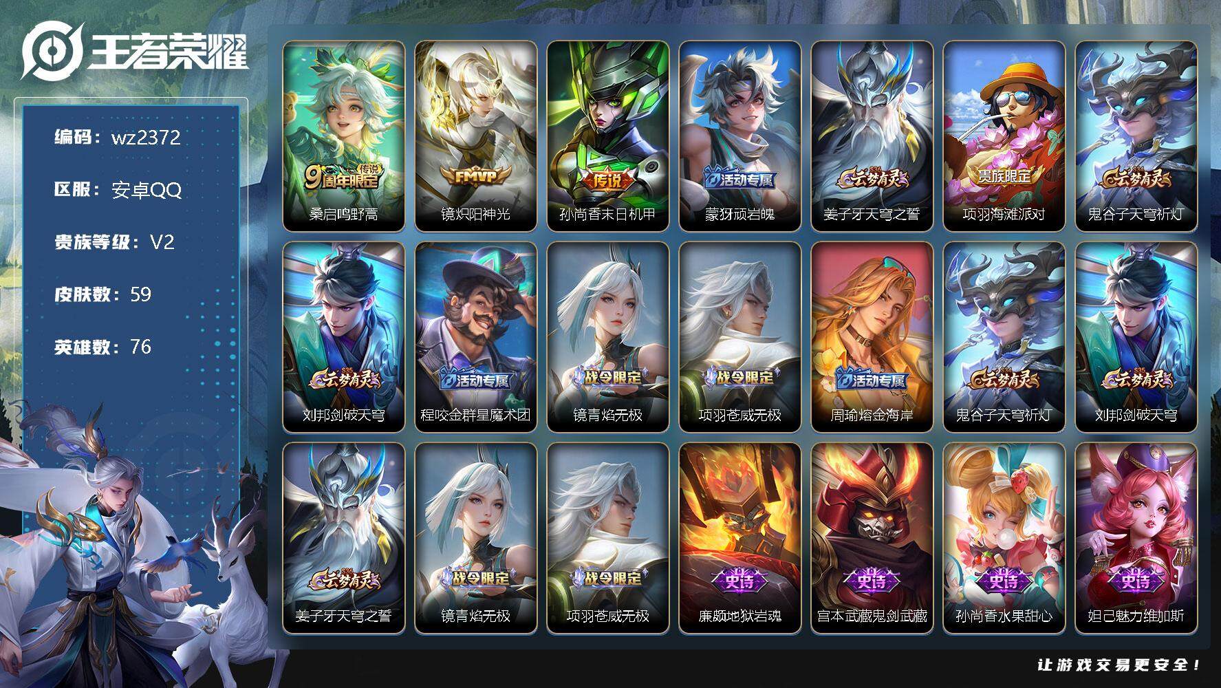 【游戏多多】 【可二次实名】【wz2372】安卓Q-V2-永恒钻石III段位-76英雄-59皮肤-0典藏-0珍品无双-0无双-0珍品传说-3传说-13史诗 【传说皮肤】:桑启鸣野蒿,镜炽阳神光,孙尚香末日机甲 【限定皮肤】:蒙犽顽岩魄,姜子牙天穹之誓,项羽海滩派对,鬼谷子天穹祈灯,刘邦剑破天穹,程咬金群星魔术团,镜青焰无极,项羽苍威无极,周瑜熔金海岸 【赛季限定】:鬼谷子天穹祈灯,刘邦剑破天穹,姜子牙天穹之誓 【战令限定】:镜青焰无极,项羽苍威无极 【史诗皮肤】:廉颇地狱岩魂,宫本武藏鬼剑武藏,孙尚香水果甜心,妲己魅力维加斯,妲己女仆咖啡,花木兰水晶猎龙者,小乔缤纷独角兽,李元芳逐浪之夏,狄仁杰鹰眼统帅,沈梦溪月团寄思,镜青焰无极,蒙犽顽岩魄,公孙离涂山容容 【其他皮肤】:项羽海滩派对,韩信教廷特使,韩信街头霸王,赵云忍炎影,白起白色死神,牛魔西部大镖客,扁鹊救世之瞳,亚瑟死亡骑士,花木兰兔女郎,张飞五福同心,后羿阿尔法小队,狂铁命运角斗场,老夫子功夫老勺,孙尚香沉稳之力,李白敏锐之力,明世隐虹云星官,小乔丁香结,孙膑归虚梦演,姜子牙炽热元素使,狂铁特工战影,刘禅秘密基地,露娜瓷语鉴心,鲁班大师乓乓大师,猪八戒潮玩探月行,鬼谷子天穹祈灯,刘邦剑破天穹,程咬金群星魔术团,项羽苍威无极,大司命暗都幽影,姜子牙天穹之誓,周瑜熔金海岸,东皇太一噬灭天穹,太乙真人谧流熔炉,钟馗虚灵犬护,张良灵野札记,阿古朵布丁狗之约,后羿精灵王,马可波罗激情绿茵,公孙离花间舞,弈星踏雪寻梅,李信灼热之刃,镜冰刃幻境,澜孤猎 【内测皮肤】:狂铁特工战影 【营地ID】:1698671406