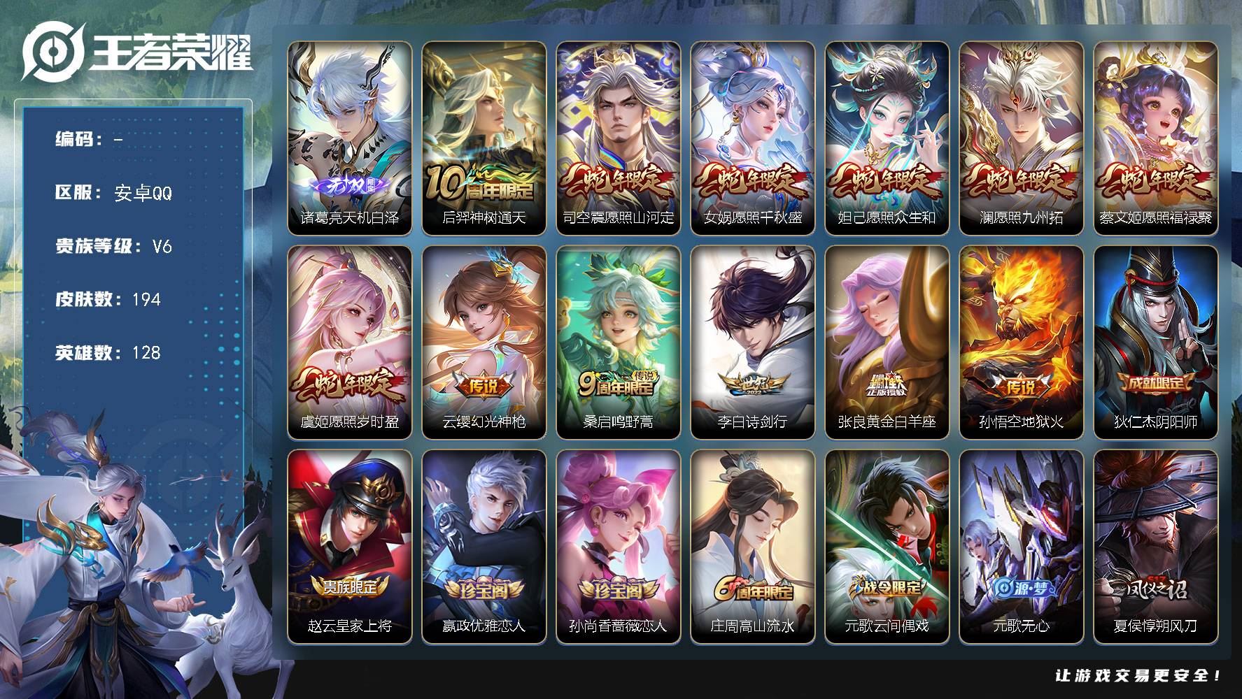 【游戏多多】 【可包人脸】安卓Q V6 永恒钻石I段位 128英雄 194皮肤 0典藏 0珍品无双 1无双 0珍品传说 12传说 46史诗大区:安卓Q,营地:2128809822,贵族等级:6,【热门皮肤】:,【限定皮肤】:虞姬溯影追猎,周瑜线条小狗,桑启线条小狗,项羽九幽镇关,雅典娜黎明之约,蚩奼极光幻客,大乔猫狗日记,后羿神树通天,艾琳鹤鸣心笺,女娲万灵启世,亚瑟荣光之誓,典韦铁甲之心,孙尚香沉稳之力,甄姬逆浪荇歌,达摩大发明家,张飞五福同心,艾琳女武神,白起死霸装,小乔丁香结,阿古朵布丁狗之约,牛魔西部大镖客,张良灵野札记,苏烈春野闲踪,狂铁龙之律动,钟馗虚灵犬护,刘备浪漫序章,阿轲化蝶舞,戈娅玫蓝誓约,明世隐景韶洛都,典韦黄金武士,姜子牙星梦巡礼,女娲愿照·千秋盛,狄仁杰魔术师,司空震愿照·山河定,虞姬愿照·岁时盈,蔡文姬愿照·福禄聚,妲己愿照·众生和,澜愿照·九州拓,西施雪境奇遇,鬼谷子幻乐之宴,太乙真人谧流熔炉,典韦铁骨偃魂,影魅影绮裳,苍苍林狼骑,庄周高山流水,亚瑟心灵战警,桑启鸣野蒿,武则天东方不败,东皇太一噬灭天穹,安琪拉玩偶对对碰,程咬金群星魔术团,刘邦剑破天穹,钟无艳春野之旅,沈梦溪龙舞盛年,廉颇功夫炙烤,甄姬花好人间,孙尚香蔷薇恋人,鬼谷子天穹祈灯,周瑜雪夜绮愿,刘禅秘密基地,程咬金暖冬絮语,后羿完美运算,嫦娥拒霜思,蒙恬蔚蓝守将,蒙犽百解令,赵云皇家上将,李白诗剑行,曹操决胜大满贯,老夫子功夫老勺,阿古朵江河有灵,盾山圆桌骑士,钟无艳聚星闪耀,张良古海寻踪,狂铁特工战影,韩信街头霸王,李元芳妄想特派,程咬金无双福将,嬴政优雅恋人,姬小满零食大作战,鲁班大师探海日志【荣耀典藏】:【截图或标题展示段位不代表实际段位,赛季更新等不可抗拒因素发生变化、时限道具不保证所剩时间,详情请看截图哦~】