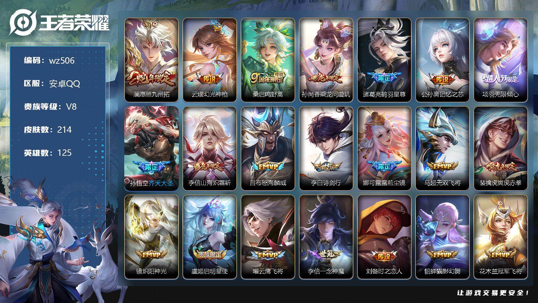 【游戏多多】 【可二次实名】【wz506】【商品标题】:安卓Q-V8-永恒钻石IV段位-125英雄-214皮肤-0典藏-0珍品无双-0无双-0珍品传说-23传说-64史诗 【传说皮肤】:澜愿照九州拓,云缨幻光神枪,桑启鸣野蒿,孙尚香乘龙问璇玑,诸葛亮鹤羽星尊,公孙离记忆之芯,项羽无限倾心,孙悟空齐天大圣,李信山海炽霜斩,吕布怒海麟威,李白诗剑行,娜可露露前尘镜,马超无双飞将,裴擒虎寅虎赤拳,镜炽阳神光,虞姬启明星使,曜云鹰飞将,李信一念神魔,刘备时之恋人,貂蝉猫影幻舞,花木兰冠军飞将,后羿黄金射手座,宫本武藏地狱之眼 【限定皮肤】:姜子牙天穹之誓,狄仁杰阴阳师,赵云皇家上将,钟无艳超时空战士,扁鹊奇幻香踪,芈月白晶晶,元歌云间偶戏,元歌无心,甄姬落雪兰心,典韦岱宗,马可波罗山海玄木吟,狄仁杰魔术师,项羽海滩派对,项羽无限倾心,韩信飞衡,王昭君午后时光,娜可露露前尘镜,孙悟空齐天大圣,刘备百相守梦,李元芳银河之约,李元芳云中旅人,虞姬启明星使,杨戬潮玩骑兵,哪吒逐梦之翼,鬼谷子五谷丰年,诸葛亮鹤羽星尊,沈梦溪大漠名商,裴擒虎寅虎赤拳,裴擒虎擒涛扼浪,李信山海炽霜斩,嫦娥暖冬兔眠,西施至美乘鲤谣,蒙犽狂想玩偶喵,鲁班大师探海日志,桑启海盐诗旅,暃星界游侠,张良古海寻踪,鬼谷子天穹祈灯,姬小满妄想食味,孙尚香乘龙问璇玑,沈梦溪龙舞盛年,鲁班七号蔬乡物语,李元芳蔬乡物语,刘邦剑破天穹,项羽苍威无极,刘备异域游侠,周瑜熔金海岸 【年限皮肤】:裴擒虎寅虎赤拳,韩信飞衡,典韦岱宗,马可波罗山海玄木吟,李信山海炽霜斩,孙尚香乘龙问璇玑 【赛季限定】:张良古海寻踪,李元芳云中旅人,沈梦溪大漠名商,裴擒虎擒涛扼浪,鲁班大师探海日志,桑启海盐诗旅,鬼谷子天穹祈灯,刘邦剑破天穹,姜子牙天穹之誓 【战令限定】:钟无艳超时空战士,扁鹊奇幻香踪,元歌云间偶戏,甄姬落雪兰心,王昭君午后时光,李元芳银河之约,杨戬潮玩骑兵,嫦娥暖冬兔眠,蒙犽狂想玩偶喵,暃星界游侠,鲁班七号蔬乡物语,李元芳蔬乡物语,项羽苍威无极 【史诗皮肤】:露娜紫霞仙子,阿轲暗夜猫娘,赵云皇家上将,赵云未来纪元,貂蝉圣诞恋歌,甄姬冰雪圆舞曲,王昭君偶像歌手,狄仁杰魔术师,宫本武藏鬼剑武藏,孙尚香水果甜心,嬴政摇滚巨星,墨子金属风暴,吕布圣诞狂欢,曹操幽灵船长,吕布末日机甲,张飞乱世虎臣,花木兰水晶猎龙者,刘邦德古拉伯爵,夏侯惇乘风破浪,小乔缤纷独角兽,兰陵王暗隐猎兽者,诸葛亮黄金分割率,雅典娜冰冠公主,铠曙光守护者,哪吒逐梦之翼,刘禅天才门将,李元芳逐浪之夏,白起星夜王子,阿轲节奏热浪,孙策猫狗日记,大乔猫狗日记,伽罗箭羽风息,狄仁杰鹰眼统帅,李元芳银河之约,韩信飞衡,典韦岱宗,橘右京修罗,孙尚香时之恋人,蒙犽狂想玩偶喵,元歌云间偶戏,芈月白晶晶,百里玄策热力回旋,司马懿暗渊魔法,夏洛特永昼,澜赏金猎手,貂蝉唤灵魅影,钟无艳超时空战士,鬼谷子五谷丰年,元歌无心,暃星界游侠,马可波罗山海玄木吟,扁鹊奇幻香踪,刘备百相守梦,西施至美乘鲤谣,姬小满妄想食味,鲁班七号蔬乡物语,亚连破空之剑,百里守约百相守梦,孙膑茶境仙,阿轲化蝶舞,刘禅鸭鸭历险记,狂铁龙之律动,周瑜百相守梦,黄忠百相守梦 【其他皮肤】:项羽海滩派对,韩信教廷特使,韩信街头霸王,阿轲致命风华,阿轲爱心护理,达摩大发明家,赵云白执事,赵云忍炎影,程咬金星际陆战队,白起白色死神,牛魔西部大镖客,扁鹊化身博士,孙膑天使之翼,姜子牙时尚教父,典韦黄金武士,亚瑟死亡骑士,达摩拳王,花木兰兔女郎,刘备万事如意,狄仁杰阴阳师,刘备汉昭烈帝,关羽龙腾万里,墨子进击墨子号,钟无艳海滩丽影,王昭君幻想奇妙夜,狂铁命运角斗场,老夫子功夫老勺,孙尚香沉稳之力,李白敏锐之力,明世隐虹云星官,小乔丁香结,吕布野性能量,沈梦溪鲨炮海盗猫,哪吒次元突破,狂铁特工战影,廉颇无尽征程,刘禅秘密基地,杨戬次元傲视,张良缤纷绘卷,盘古重装意志,鲁班大师乓乓大师,程咬金无双福将,王昭君午后时光,沈梦溪大漠名商,蒙恬蔚蓝守将,甄姬落雪兰心,李元芳云中旅人,戈娅危途狂花,刘备潮玩造梦师,桑启海盐诗旅,嫦娥暖冬兔眠,海月幻泉雾影,猪八戒潮玩探月行,牛魔牛运亨通,裴擒虎擒涛扼浪,杨戬潮玩骑兵,莱西奥西部游侠,鲁班大师探海日志,李元芳妄想特派,张良古海寻踪,后羿完美运算,鬼谷子天穹祈灯,海诺时空谍影,沈梦溪龙舞盛年,钟无艳春野之旅,李元芳蔬乡物语,扁鹊无尽旅途,刘邦剑破天穹,项羽苍威无极,刘备异域游侠,姜子牙天穹之誓,周瑜熔金海岸,孙悟空神迹守卫,盘古敬我三分,东皇太一噬灭天穹,老夫子百相守梦,干将莫邪雾都夜雨,苍苍林狼骑,太乙真人谧流熔炉,典韦铁骨偃魂,马超访茗客,西施雪境奇遇,姜子牙星梦巡礼,明世隐景韶洛都,戈娅玫蓝誓约,刘备浪漫序章,钟馗虚灵犬护,沈梦溪鸭鸭历险记,苏烈春野闲踪,阿古朵布丁狗之约,露娜命运