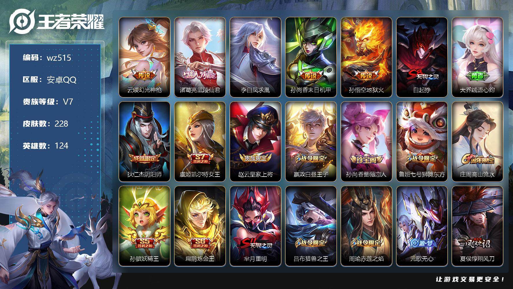 【游戏多多】 【可二次实名】【wz515】【商品标题】:安卓Q-V7-永恒钻石I段位-124英雄-228皮肤-0典藏-0珍品无双-0无双-0珍品传说-5传说-48史诗 【传说皮肤】:云缨幻光神枪,诸葛亮武陵仙君,李白凤求凰,孙尚香末日机甲,孙悟空地狱火 【限定皮肤】:白起狰,大乔绒语心约,狄仁杰阴阳师,虞姬凯尔特女王,赵云皇家上将,嬴政白昼王子,孙尚香蔷薇恋人,鲁班七号狮舞东方,庄周高山流水,孙膑妖精王,扁鹊炼金王,芈月重明,吕布猎兽之王,周瑜赤莲之焰,元歌无心,夏侯惇朔风刀,甄姬游园惊梦,曹操烛龙,典韦穷奇,狄仁杰魔术师,狄仁杰万华元夜,达摩沙漠行僧,项羽海滩派对,老夫子醍醐杖,程咬金演武夺筹,王昭君凤凰于飞,兰陵王驯魔猎人,兰陵王金庭之子,孙悟空至尊宝,孙悟空孙行者,牛魔御旌,李元芳云中旅人,钟馗神迹守卫,钟馗驱傩正仪,杨玉环遇见飞天,太乙真人饕餮,鬼谷子原初探秘者,鬼谷子五谷丰年,诸葛亮武陵仙君,苏烈千军破阵,弈星混沌棋,沈梦溪大漠名商,明世隐疑决卦,裴擒虎李小龙,裴擒虎擒涛扼浪,狂铁御狮,米莱狄御霄,盾山御銮,上官婉儿梁祝,鲁班大师探海日志,桑启海盐诗旅,阿古朵江河有灵,张良古海寻踪,鬼谷子天穹祈灯,刘邦剑破天穹,程咬金群星魔术团,刘备异域游侠,周瑜熔金海岸 【年限皮肤】:王昭君凤凰于飞,李白凤求凰 【赛季限定】:孙膑妖精王,扁鹊炼金王,白起狰,芈月重明,夏侯惇朔风刀,曹操烛龙,典韦穷奇,狄仁杰万华元夜,达摩沙漠行僧,老夫子醍醐杖,程咬金演武夺筹,兰陵王金庭之子,张良古海寻踪,牛魔御旌,李元芳云中旅人,虞姬凯尔特女王,钟馗驱傩正仪,太乙真人饕餮,鬼谷子原初探秘者,苏烈千军破阵,弈星混沌棋,沈梦溪大漠名商,明世隐疑决卦,裴擒虎擒涛扼浪,狂铁御狮,米莱狄御霄,盾山御銮,鲁班大师探海日志,桑启海盐诗旅,鬼谷子天穹祈灯,刘邦剑破天穹 【战令限定】:嬴政白昼王子,鲁班七号狮舞东方,吕布猎兽之王,周瑜赤莲之焰,兰陵王驯魔猎人,钟馗神迹守卫 【史诗皮肤】:露娜紫霞仙子,赵云皇家上将,赵云未来纪元,貂蝉圣诞恋歌,甄姬冰雪圆舞曲,王昭君偶像歌手,狄仁杰魔术师,宫本武藏鬼剑武藏,孙尚香蔷薇恋人,孙尚香水果甜心,嬴政摇滚巨星,妲己魅力维加斯,墨子金属风暴,吕布圣诞狂欢,刘禅绅士熊喵,李白千年之狐,吕布末日机甲,韩信白龙吟,王昭君凤凰于飞,孙悟空至尊宝,花木兰水晶猎龙者,刘邦德古拉伯爵,夏侯惇乘风破浪,兰陵王暗隐猎兽者,诸葛亮黄金分割率,甄姬游园惊梦,雅典娜冰冠公主,百里守约特工魅影,刘禅天才门将,李元芳逐浪之夏,白起星夜王子,杨玉环遇见飞天,嬴政白昼王子,鲁班七号狮舞东方,狄仁杰鹰眼统帅,公孙离无限星赏官,兰陵王驯魔猎人,上官婉儿梁祝,裴擒虎李小龙,孙悟空孙行者,庄周高山流水,鬼谷子五谷丰年,元歌无心,阿古朵江河有灵,弈星万物之道,赵怀真器灵浮梦炉,狂铁龙之律动,黄忠百相守梦 【其他皮肤】:项羽海滩派对,韩信教廷特使,韩信街头霸王,露娜哥特玫瑰,阿轲致命风华,阿轲爱心护理,达摩大发明家,赵云白执事,赵云忍炎影,芈月红桃皇后,白起白色死神,牛魔西部大镖客,扁鹊化身博士,宫本武藏未来纪元,安琪拉玩偶对对碰,孙膑天使之翼,姜子牙时尚教父,妲己少女阿狸,典韦黄金武士,亚瑟死亡骑士,达摩拳王,花木兰兔女郎,张飞五福同心,甄姬花好人间,刘备万事如意,宫本武藏万象初新,狄仁杰阴阳师,刘备纽约教父,孙膑妖精王,刘备汉昭烈帝,扁鹊炼金王,关羽龙腾万里,虞姬凯尔特女王,白起狰,钟无艳海滩丽影,太乙真人饕餮,宫本武藏霸王丸,曹操烛龙,芈月重明,老夫子功夫老勺,孙尚香沉稳之力,典韦穷奇,诸葛亮掌控之力,李白敏锐之力,鬼谷子幻乐之宴,狂铁御狮,安琪拉如懿,苏烈坚韧之力,大乔守护之力,米莱狄御霄,吕布猎兽之王,明世隐虹云星官,张良幽兰居士,牛魔御旌,吕布野性能量,钟馗神迹守卫,盾山御銮,沈梦溪鲨炮海盗猫,姜子牙炽热元素使,夏侯惇朔风刀,周瑜赤莲之焰,弈星混沌棋,哪吒次元突破,明世隐疑决卦,盾山圆桌骑士,老夫子醍醐杖,狂铁特工战影,鬼谷子原初探秘者,狄仁杰万华元夜,刘禅秘密基地,杨戬次元傲视,程咬金演武夺筹,钟馗驱傩正仪,鲁班大师乓乓大师,苏烈千军破阵,典韦铁甲之心,达摩沙漠行僧,程咬金无双福将,兰陵王金庭之子,沈梦溪大漠名商,李元芳云中旅人,刘备潮玩造梦师,桑启海盐诗旅,猪八戒潮玩探月行,裴擒虎擒涛扼浪,太乙真人劲辣红锅,莱西奥西部游侠,鲁班大师探海日志,李元芳妄想特派,张良古海寻踪,曹操决胜大满贯,鬼谷子天穹祈灯,廉颇功夫炙烤,刘邦剑破天穹,程咬金群星魔术团,刘备异域游侠,周瑜熔金海岸,大乔绒语心约,太乙真人谧流熔炉,姜子牙星梦巡礼,明世隐景韶洛都,钟馗虚灵犬护,苏烈春野闲踪,小乔秘证寻踪,露娜命运加冕,甄姬逆浪荇歌,莱西奥踏浪烽翎,鬼谷子克喵,鲁班七号福禄兄弟,鲁班七号木偶奇遇记,露娜绯
