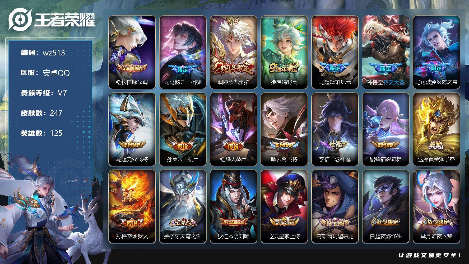 【游戏多多】 【可二次实名】【wz513】【商品标题】:安卓Q-V7-最强王者段位-125英雄-247皮肤-1典藏-0珍品无双-0无双-0珍品传说-14传说-55史诗 【荣耀典藏】:铠银白咏叹调 【传说皮肤】:司马懿九山相柳,澜愿照九州拓,桑启鸣野蒿,马超琥珀纪元,孙悟空齐天大圣,马可波罗深海之息,马超无双飞将,孙策末日机甲,铠绛天战甲,曜云鹰飞将,李信一念神魔,貂蝉猫影幻舞,达摩黄金狮子座,孙悟空地狱火 【限定皮肤】:姜子牙天穹之誓,狄仁杰阴阳师,赵云皇家上将,高渐离玩趣恶龙,白起夜都怪侠,芈月幻夜卜梦,元歌无心,马可波罗深海之息,狄仁杰魔术师,狄仁杰万华元夜,达摩沙漠行僧,项羽海滩派对,老夫子醍醐杖,韩信傲雪梅枪,王昭君午后时光,兰陵王金庭之子,亚瑟潮玩骑士王,孙悟空至尊宝,孙悟空齐天大圣,李元芳云中旅人,钟馗驱傩正仪,杨戬潮玩骑兵,鬼谷子原初探秘者,鬼谷子五谷丰年,苏烈千军破阵,百里守约朱雀志,沈梦溪大漠名商,明世隐疑决卦,裴擒虎擒涛扼浪,狂铁电玩高手,云中君纤云弄巧,上官婉儿梁祝,嫦娥拒霜思,西施玲珑珍味,鲁班大师探海日志,桑启海盐诗旅,戈娅驭风魔法,张良古海寻踪,蒙犽百解令,蒙恬荣光圣徽,鬼谷子天穹祈灯,马超琥珀纪元,姬小满妄想食味,沈梦溪龙舞盛年,刘邦剑破天穹,项羽苍威无极,刘备异域游侠,周瑜熔金海岸 【年限皮肤】:百里守约朱雀志 【赛季限定】:狄仁杰万华元夜,达摩沙漠行僧,老夫子醍醐杖,兰陵王金庭之子,张良古海寻踪,李元芳云中旅人,钟馗驱傩正仪,鬼谷子原初探秘者,苏烈千军破阵,沈梦溪大漠名商,明世隐疑决卦,裴擒虎擒涛扼浪,鲁班大师探海日志,桑启海盐诗旅,鬼谷子天穹祈灯,蒙恬荣光圣徽,刘邦剑破天穹,姜子牙天穹之誓 【战令限定】:白起夜都怪侠,芈月幻夜卜梦,王昭君午后时光,亚瑟潮玩骑士王,杨戬潮玩骑兵,狂铁电玩高手,西施玲珑珍味,戈娅驭风魔法,项羽苍威无极 【史诗皮肤】:露娜紫霞仙子,赵云皇家上将,貂蝉圣诞恋歌,甄姬冰雪圆舞曲,王昭君偶像歌手,狄仁杰魔术师,廉颇地狱岩魂,宫本武藏鬼剑武藏,孙尚香水果甜心,嬴政摇滚巨星,妲己魅力维加斯,墨子金属风暴,刘禅绅士熊喵,曹操幽灵船长,李白千年之狐,孙悟空至尊宝,花木兰水晶猎龙者,夏侯惇乘风破浪,小乔缤纷独角兽,兰陵王暗隐猎兽者,诸葛亮黄金分割率,百里守约特工魅影,铠曙光守护者,刘禅天才门将,李元芳逐浪之夏,程咬金功夫厨神,白起星夜王子,阿轲节奏热浪,百里守约朱雀志,伽罗箭羽风息,狄仁杰鹰眼统帅,上官婉儿梁祝,不知火舞魅语,橘右京修罗,云中君纤云弄巧,杨戬天秀启明,司马懿暗渊魔法,嫦娥拒霜思,韩信傲雪梅枪,夏洛特永昼,澜赏金猎手,狂铁电玩高手,鬼谷子五谷丰年,元歌无心,戈娅驭风魔法,蒙犽百解令,蒙恬荣光圣徽,姬小满妄想食味,牛魔星界战将,刘禅鸭鸭历险记,周瑜百相守梦,云缨赞萌露比,黄忠百相守梦,弈星守夜人,公孙离涂山容容 【其他皮肤】:项羽海滩派对,韩信教廷特使,韩信街头霸王,露娜哥特玫瑰,达摩大发明家,赵云白执事,赵云忍炎影,程咬金爱与正义,白起白色死神,牛魔西部大镖客,扁鹊救世之瞳,宫本武藏未来纪元,孙膑天使之翼,姜子牙时尚教父,妲己少女阿狸,典韦黄金武士,亚瑟死亡骑士,花木兰兔女郎,张飞五福同心,甄姬花好人间,刘备万事如意,宫本武藏万象初新,后羿阿尔法小队,狄仁杰阴阳师,刘备纽约教父,关羽龙腾万里,墨子进击墨子号,钟无艳海滩丽影,狂铁命运角斗场,老夫子功夫老勺,孙尚香沉稳之力,诸葛亮掌控之力,李白敏锐之力,鬼谷子幻乐之宴,苏烈坚韧之力,大乔守护之力,明世隐虹云星官,小乔丁香结,吕布野性能量,高渐离玩趣恶龙,沈梦溪鲨炮海盗猫,哪吒次元突破,明世隐疑决卦,盾山圆桌骑士,老夫子醍醐杖,狂铁特工战影,鬼谷子原初探秘者,狄仁杰万华元夜,亚瑟潮玩骑士王,刘禅秘密基地,杨戬次元傲视,露娜瓷语鉴心,盘古重装意志,钟馗驱傩正仪,鲁班大师乓乓大师,苏烈千军破阵,典韦铁甲之心,达摩沙漠行僧,芈月幻夜卜梦,程咬金无双福将,白起夜都怪侠,兰陵王金庭之子,米莱狄契约魔法,王昭君午后时光,沈梦溪大漠名商,蒙犽胡桃狂想曲,蒙恬蔚蓝守将,李元芳云中旅人,桑启海盐诗旅,海月幻泉雾影,猪八戒潮玩探月行,牛魔牛运亨通,裴擒虎擒涛扼浪,杨戬潮玩骑兵,太乙真人劲辣红锅,莱西奥西部游侠,鲁班大师探海日志,西施玲珑珍味,姬小满零食大作战,李元芳妄想特派,张良古海寻踪,钟无艳聚星闪耀,亚连破局者,兰陵王幻夜行动,曹操决胜大满贯,后羿完美运算,程咬金暖冬絮语,鬼谷子天穹祈灯,海诺时空谍影,朵莉亚金色潮汐,廉颇功夫炙烤,亚瑟鸿运当头,沈梦溪龙舞盛年,钟无艳春野之旅,刘邦剑破天穹,项羽苍威无极,大司命暗都幽影,刘备异域游侠,姜子牙天穹之誓,周瑜熔金海岸,东皇太一噬灭天穹,米莱狄怪诞之夜,干将莫邪雾都夜雨,吕布逐霄战戟,苍苍林狼骑,太乙真人谧流熔炉,典